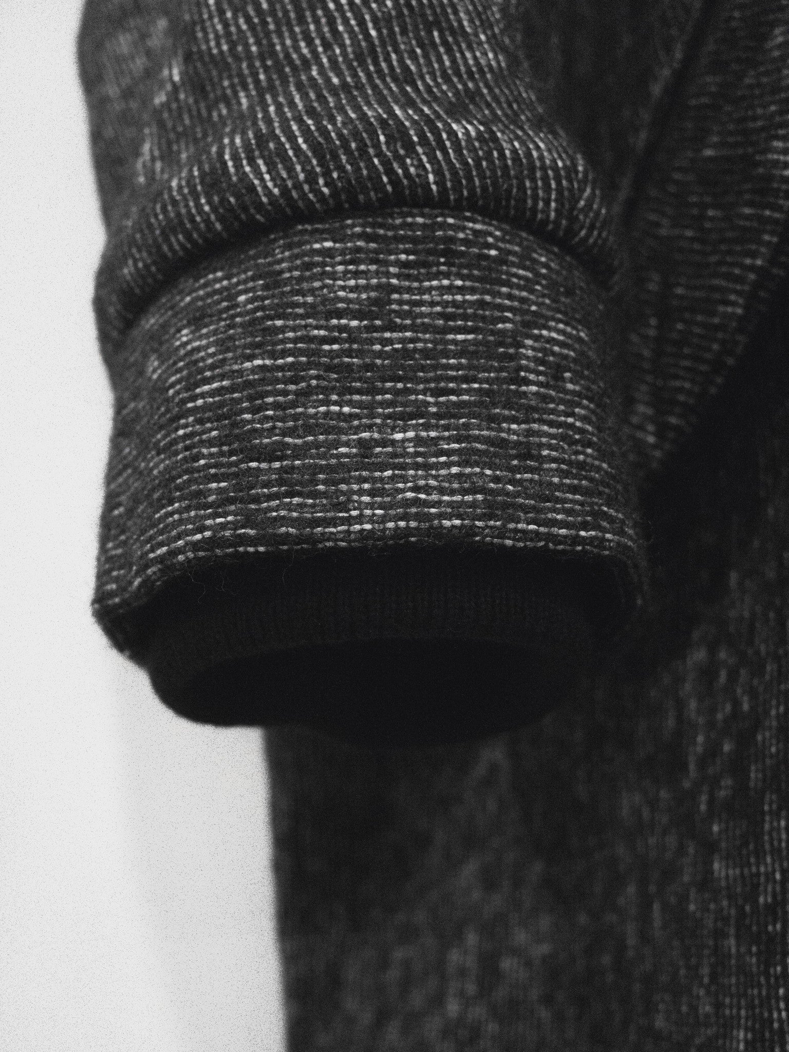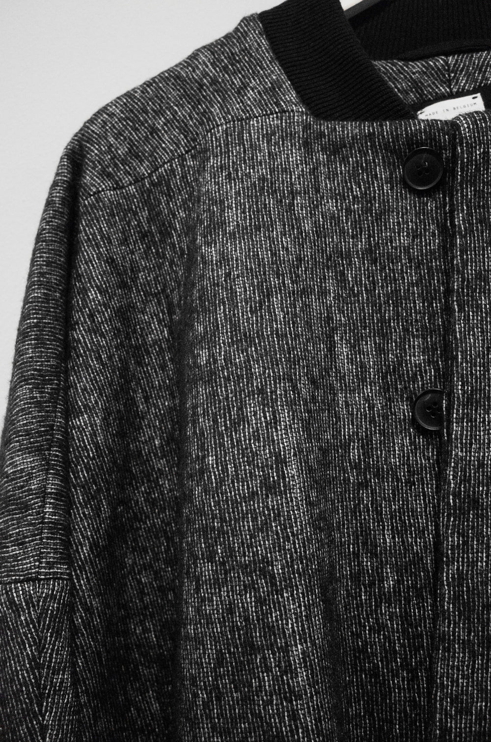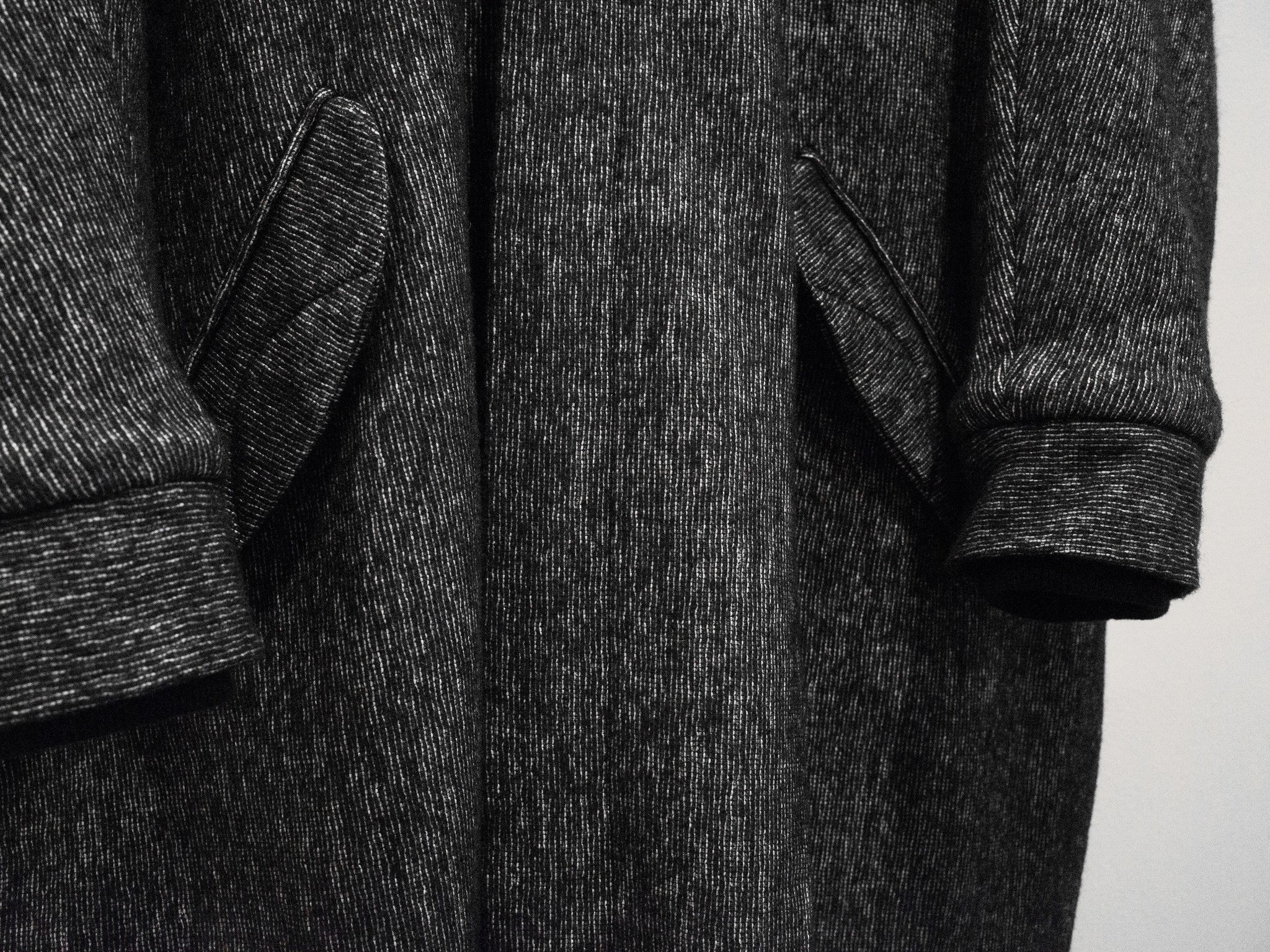 Mix A behemoth of a coat executed in a soft and lofty wool/cotton weave whose contrasting white and black threads give it an amazing visual dynamism. Geometric patterning give the front mantle a definition amidst the sea of striated woven texture. Dolman sleeve construction gives a relaxed dropped shoulder look and an extra wide body. Enjoy being swallowed up in this piece’s warm embrace. Finished with pit vents, inset ribbed cuffs, a ribbed bomber style collar, two round interior pockets, hidden placket, and fine black cotton lining.