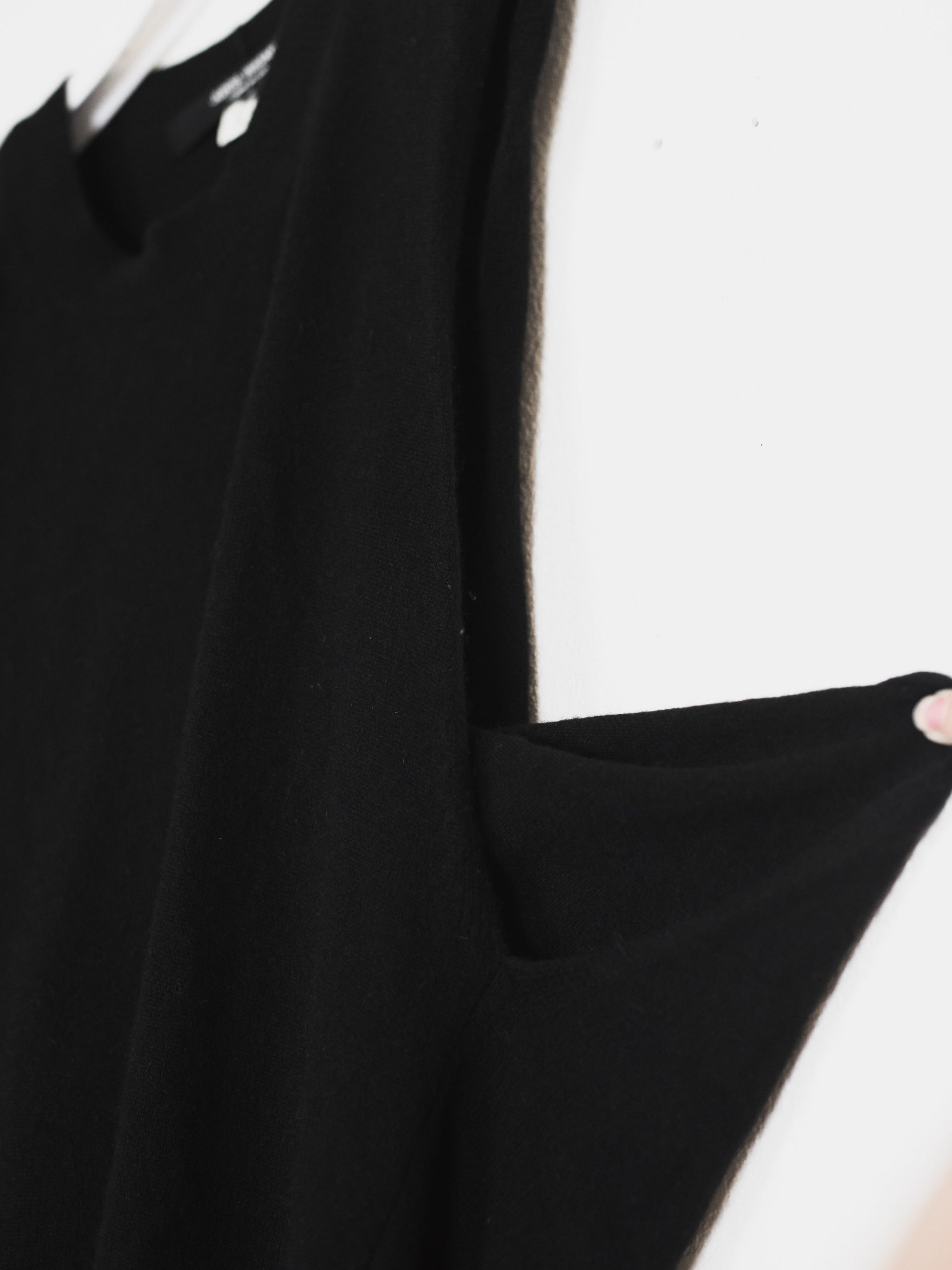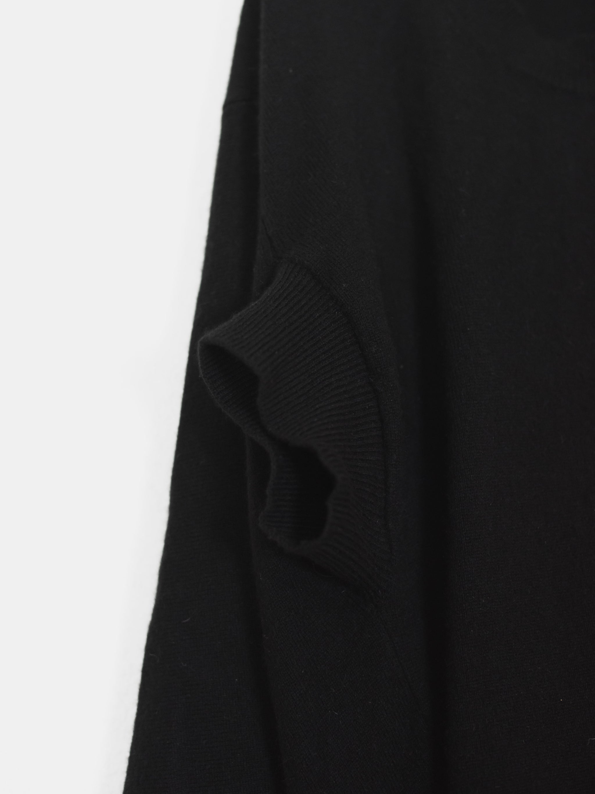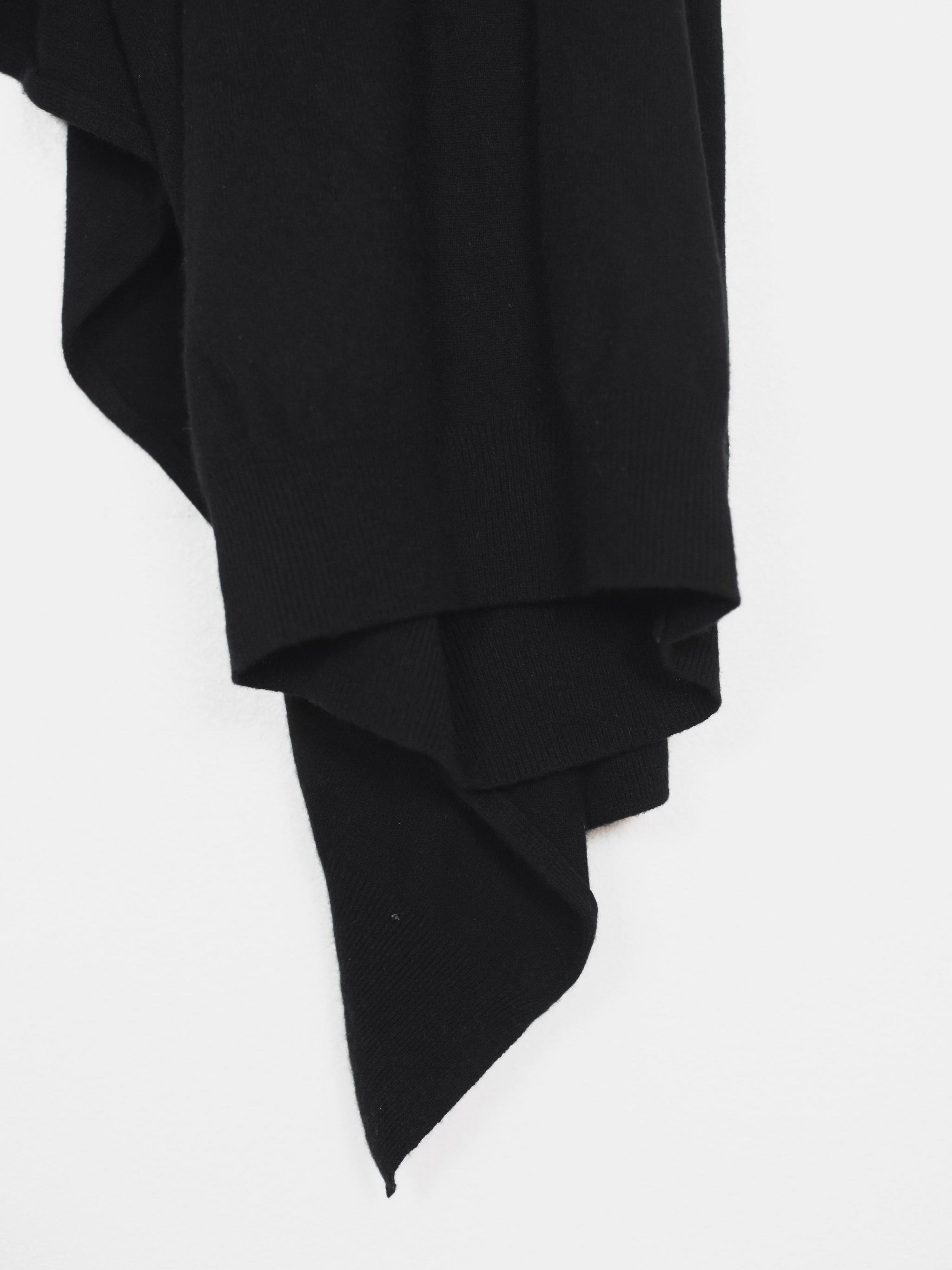 Asymmetric sweater or shawl from Junya Watanabe. The piece retains some identifiable characteristics of a sweater, like the round collar and the vestige of a ribbed sleeve opening, but the overall piece appears to have deformed into a Dali-esque liquid. The waist hem is still present, though there is an additional side opening so that the piece can be worn as a half shawl if not worn through the waist.
