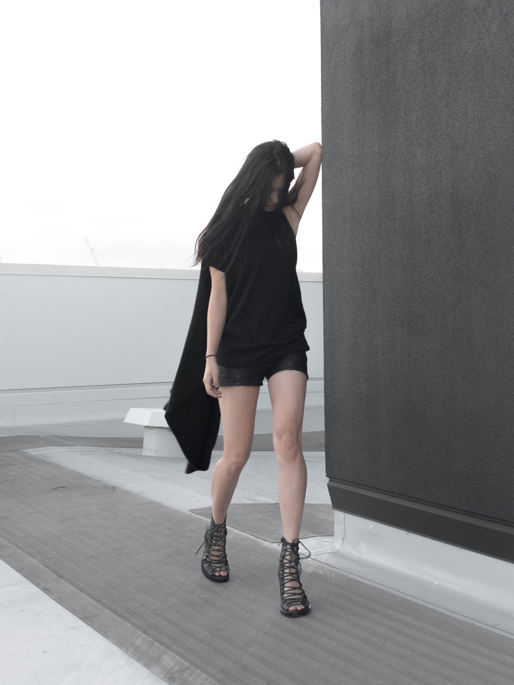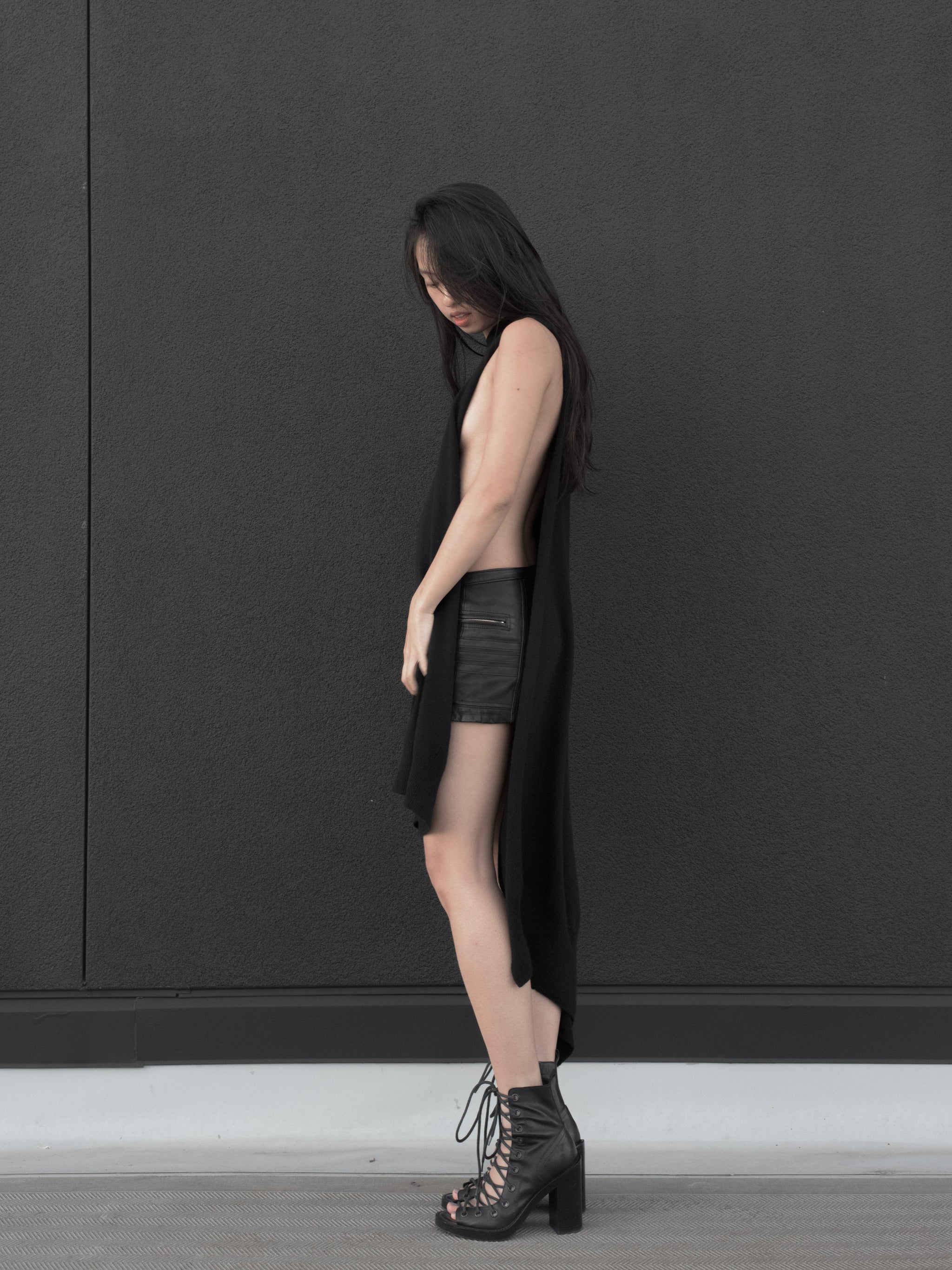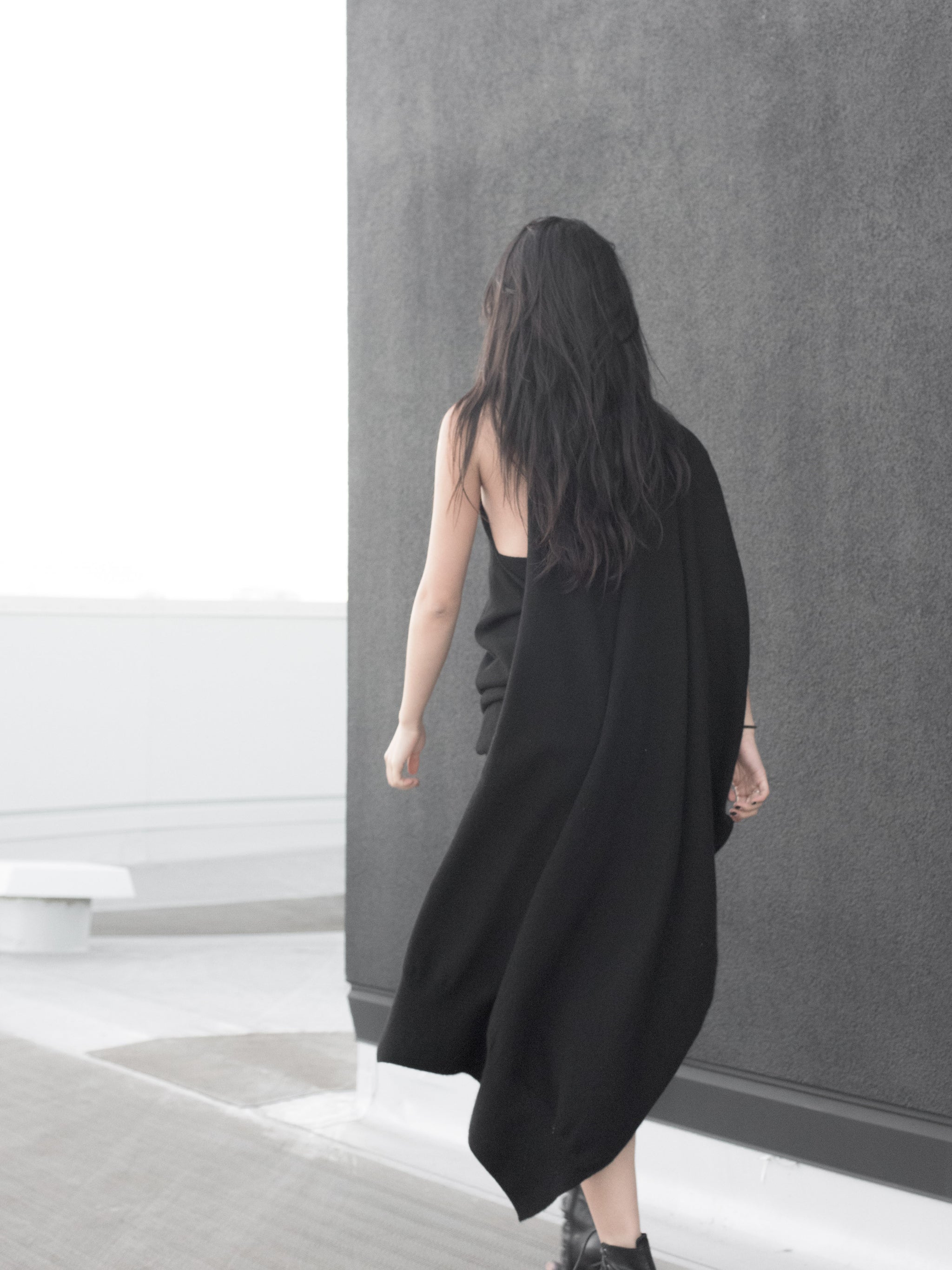 Asymmetric sweater or shawl from Junya Watanabe. The piece retains some identifiable characteristics of a sweater, like the round collar and the vestige of a ribbed sleeve opening, but the overall piece appears to have deformed into a Dali-esque liquid. The waist hem is still present, though there is an additional side opening so that the piece can be worn as a half shawl if not worn through the waist.
