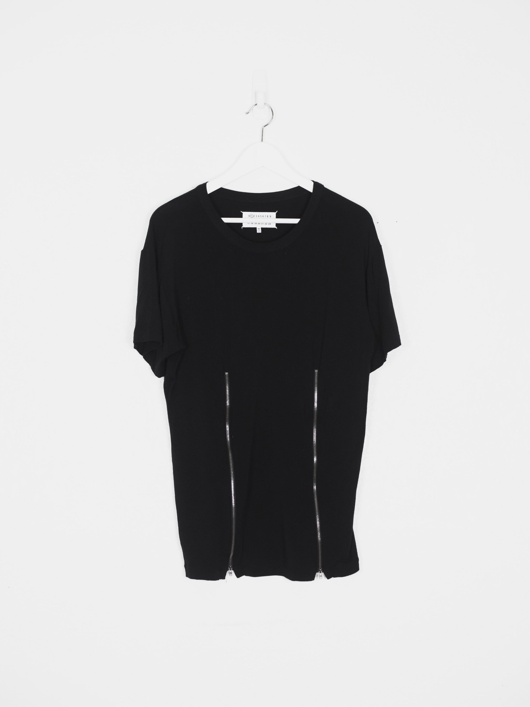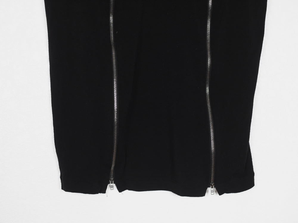 Simple tee with two parallel zips that enable adjustable slits on either side, perfect as a dress or layering piece.