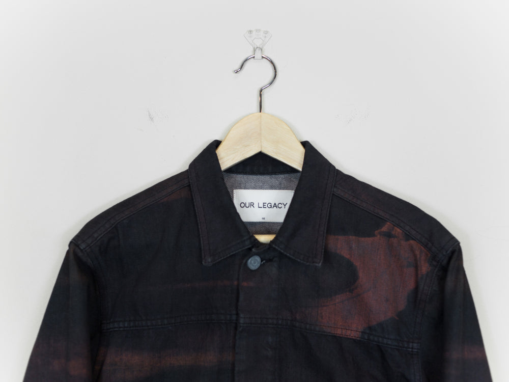 Made from Italian denim and hand-painted in Stockholm, this Our Legacy denim jacket offers a wonderfully clean canvas that lets the artisanal treatment speak for itself. It is cut with a modern, slim fit and features a hidden placket, chunky Our Legacy branded buttons, and a signature low-set single chest pocket--the perfect off-kilter height. The print itself seems to glow amidst the dark denim and upon closer inspection, sparkles with a truly 'rusty' sheen. Each one is unique given the hand-painted nature.