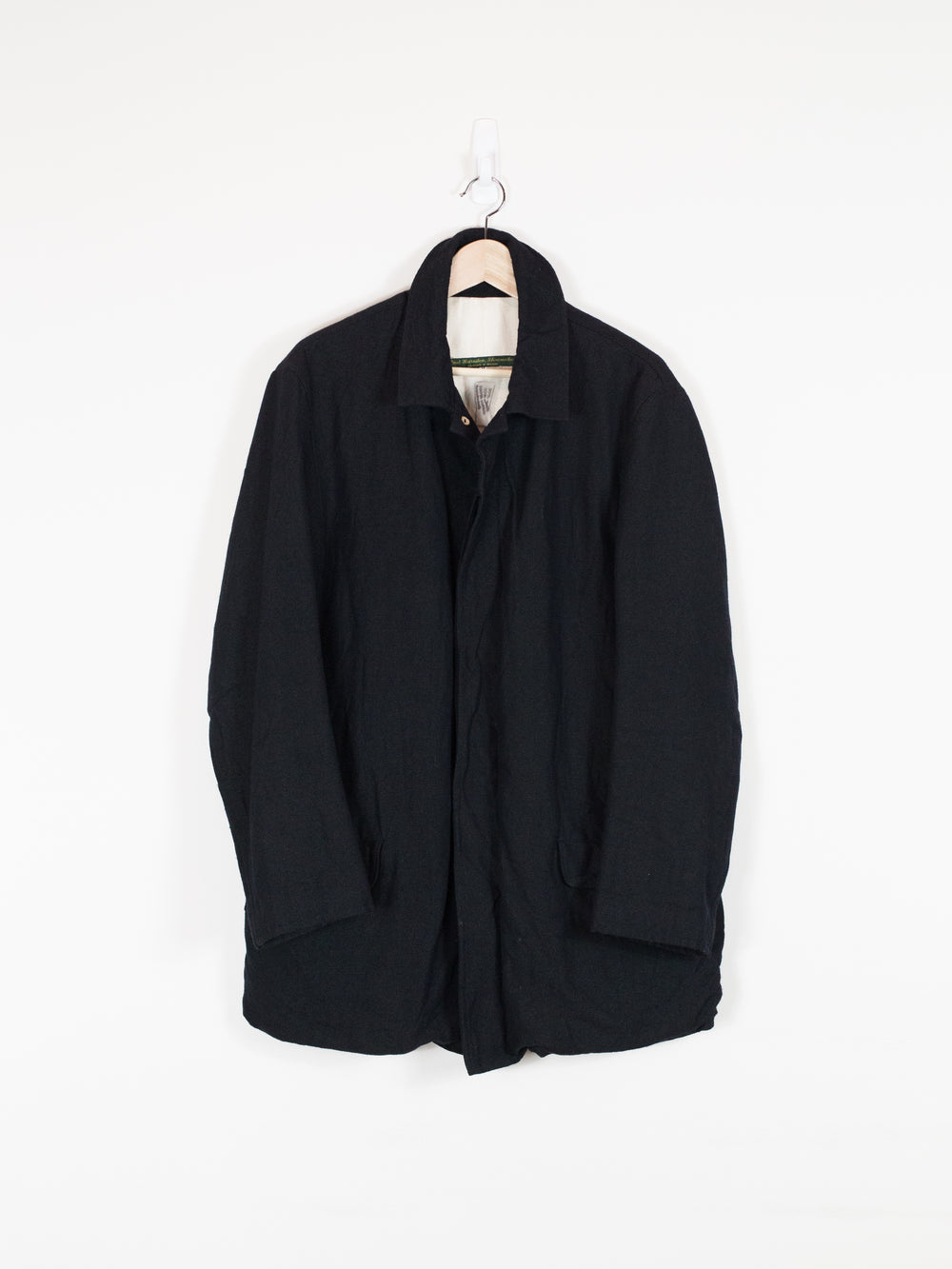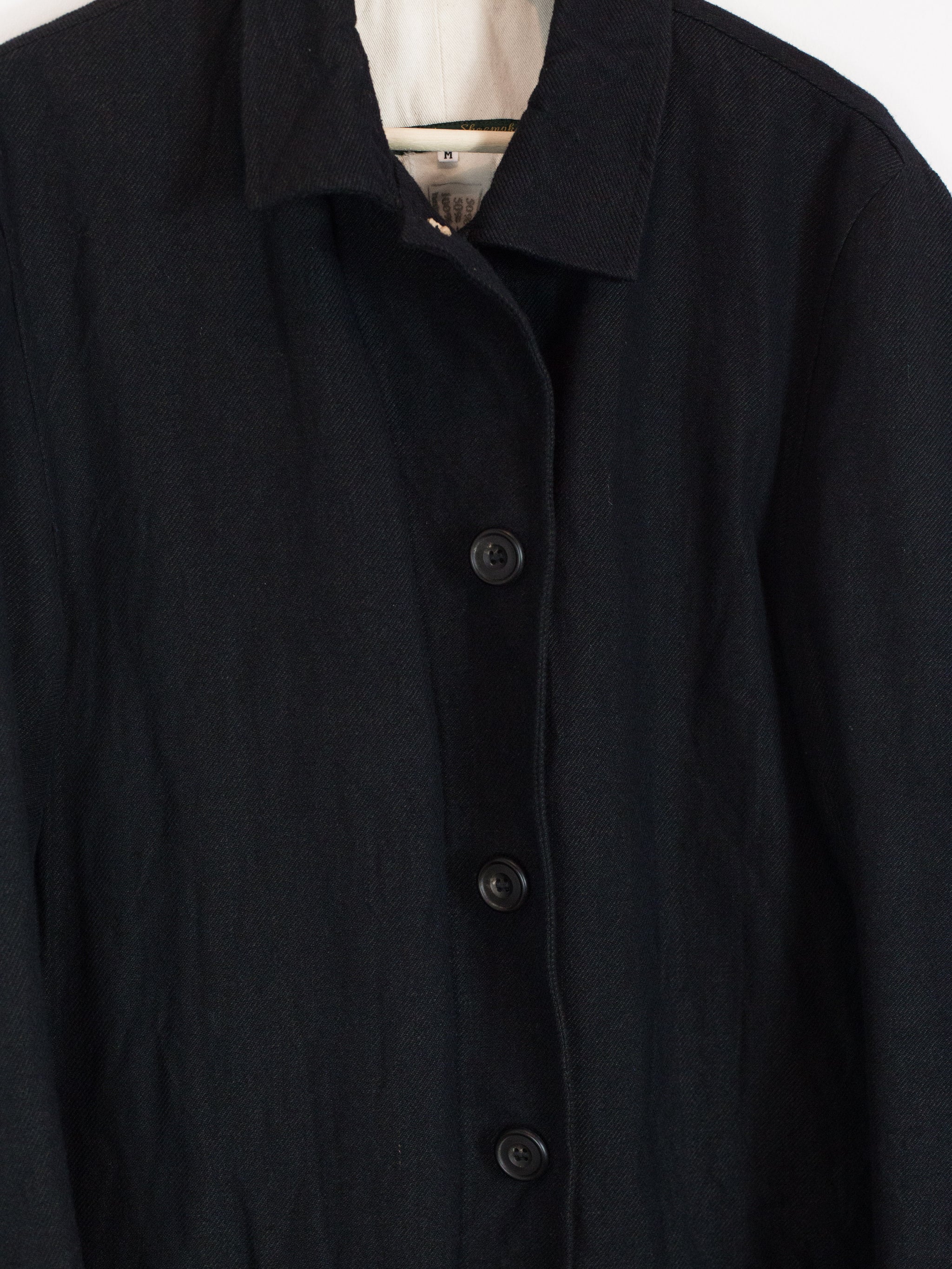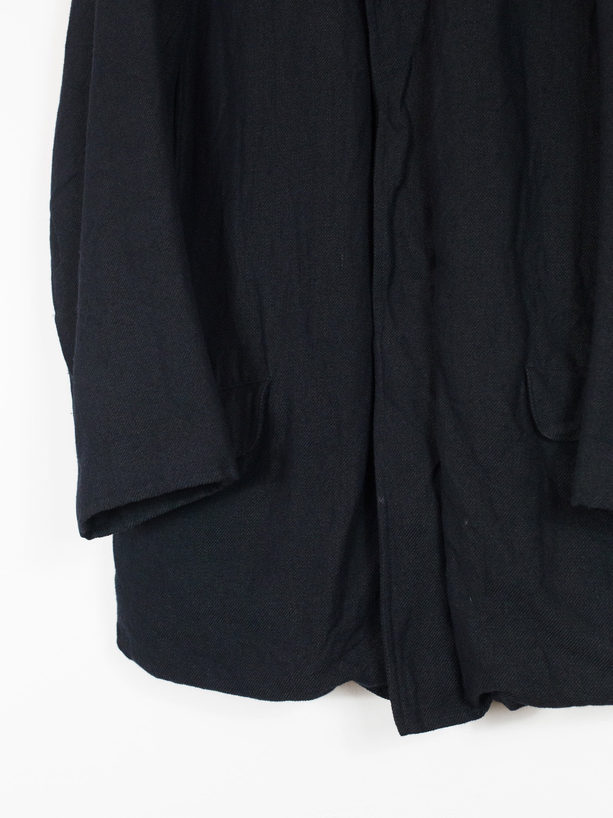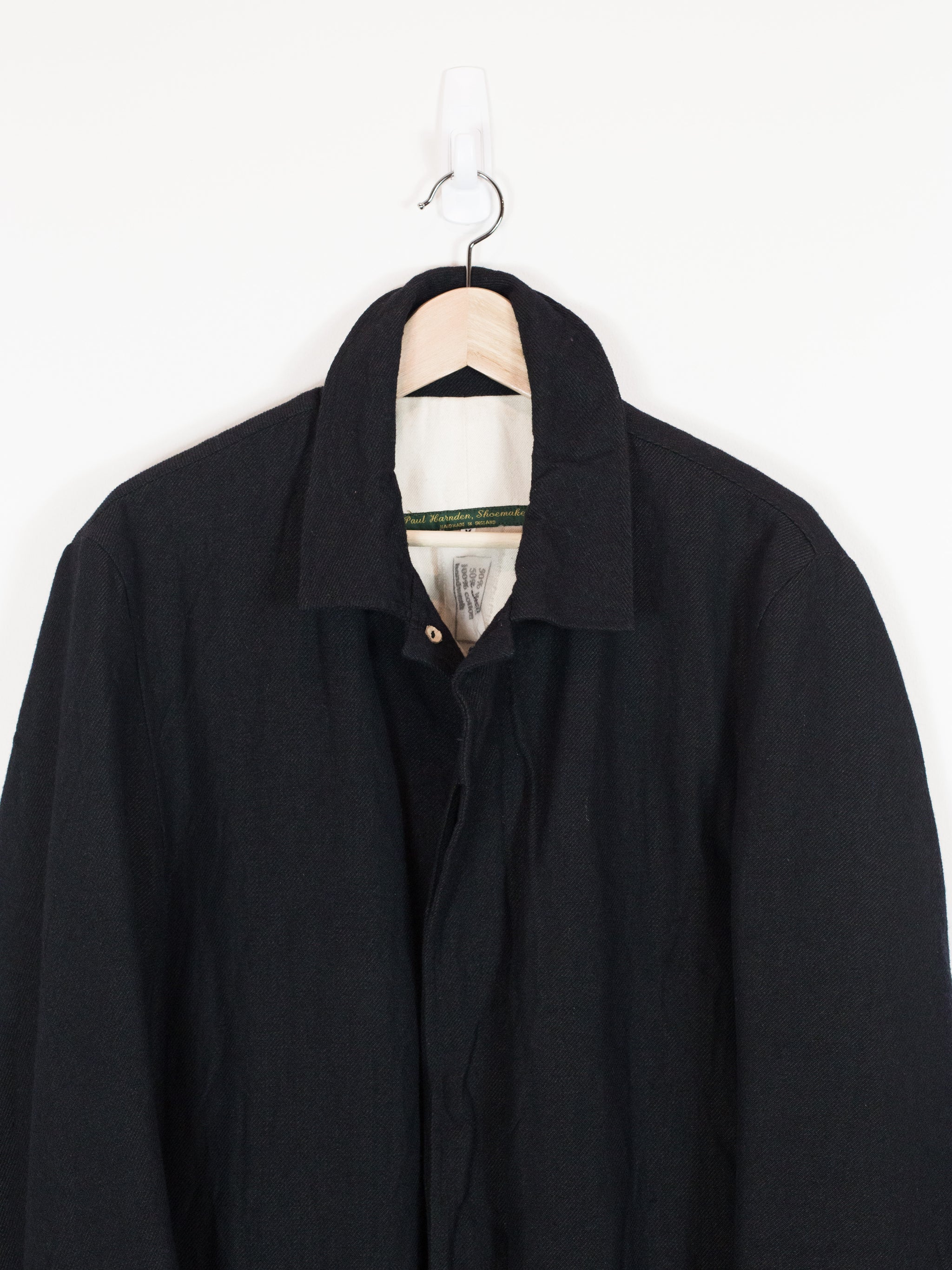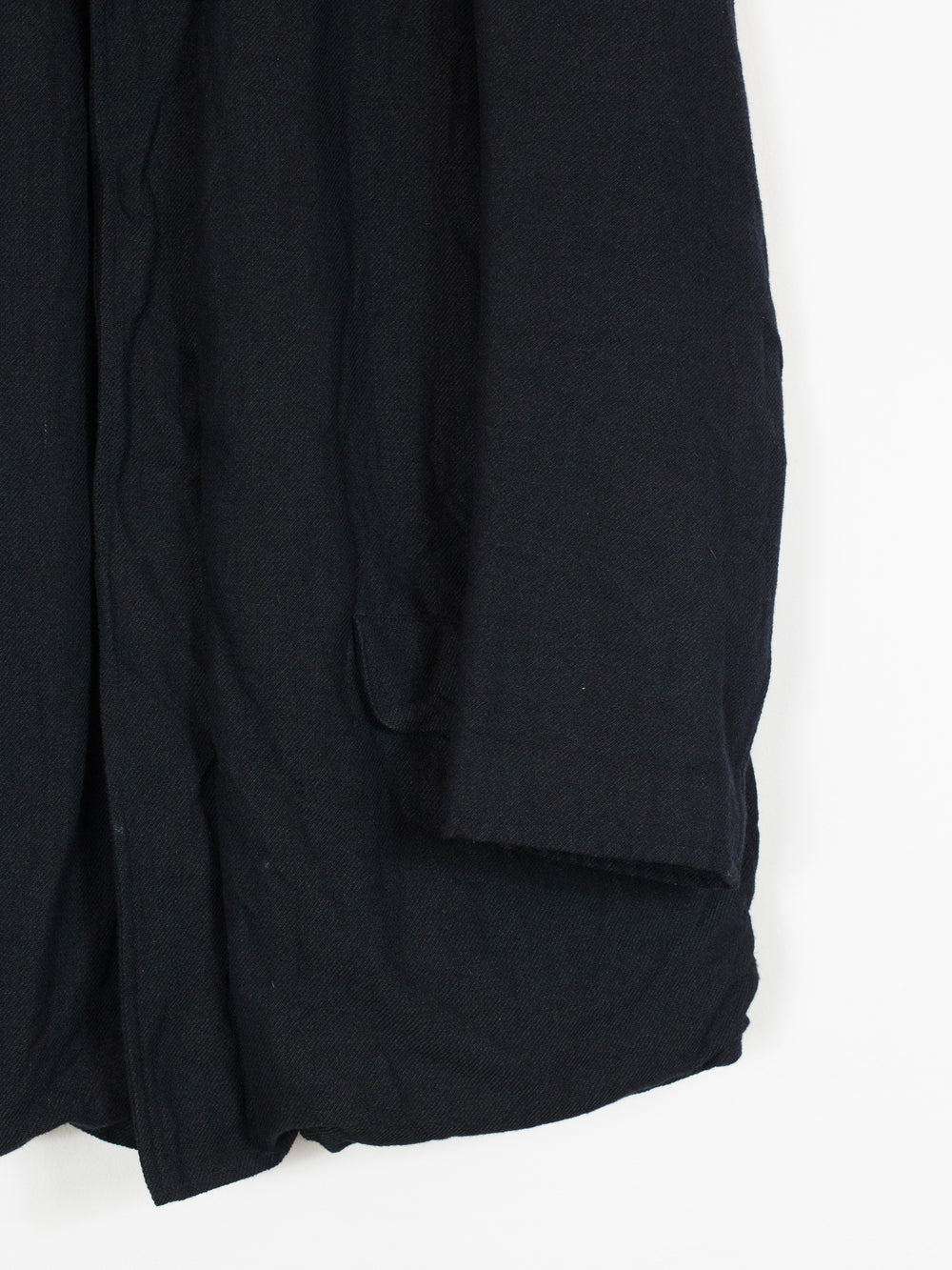 Here is a classic cropped mac in a robust wool/linen blend that has an amazingly cozy handfeel. Great color depth, black in all but direct sunlight, in which it shows some dark navy undertones. Oversized fit that is still sharp thanks to the soft structure of the face fabric material and lining. Overall, this piece feels amazing to wear. With its no-nonsense natural textiles throughout and a super refined, classic shape, it really grants a sense of physical and psychological security. This mac doesn’t have the usual restricting high shoulders of a Paul Harnden piece and the A-line silhouette is dialed-back and much more manageable, all of which makes for a more versatile piece that can feel at home in many different wardrobes.