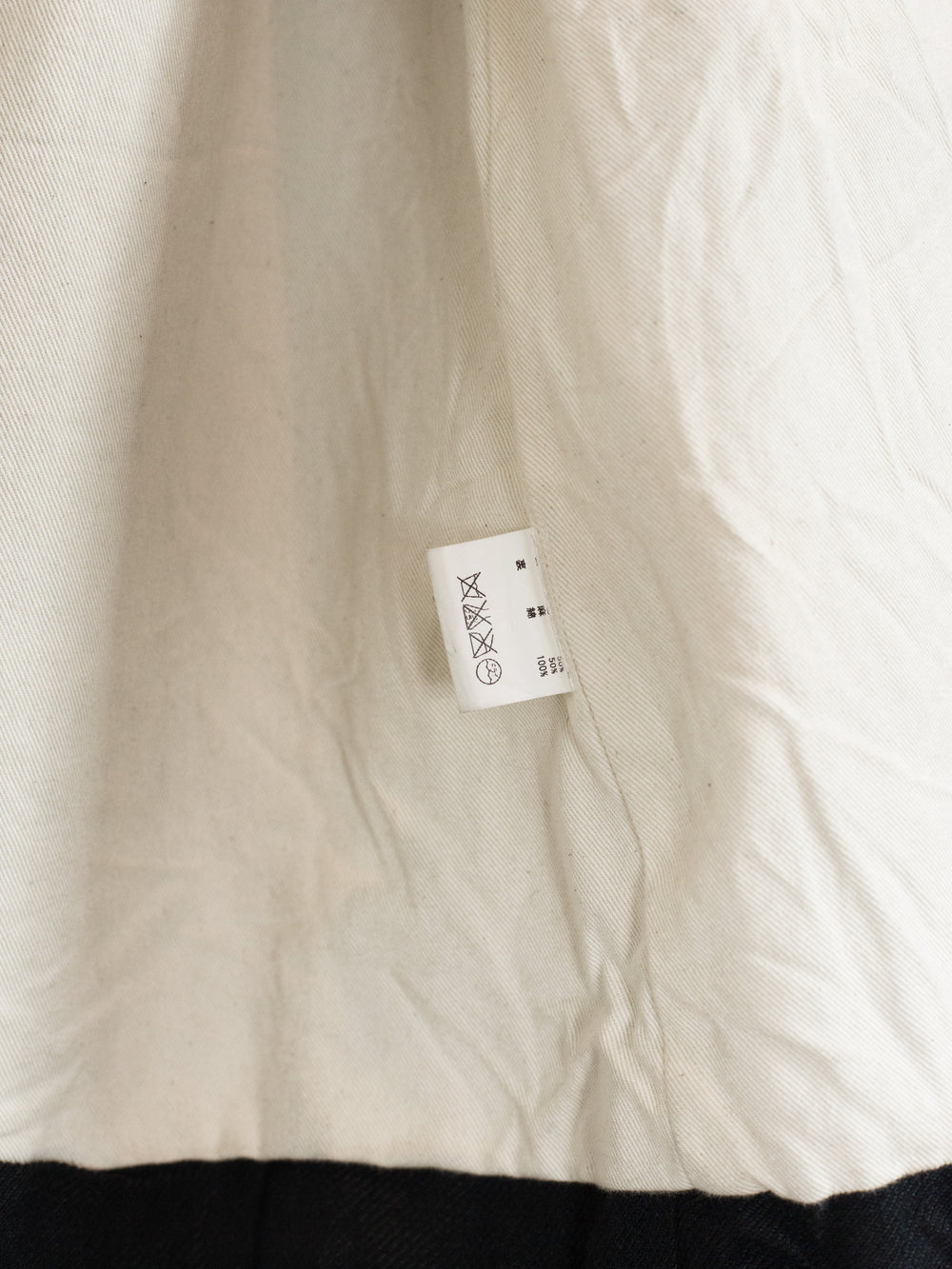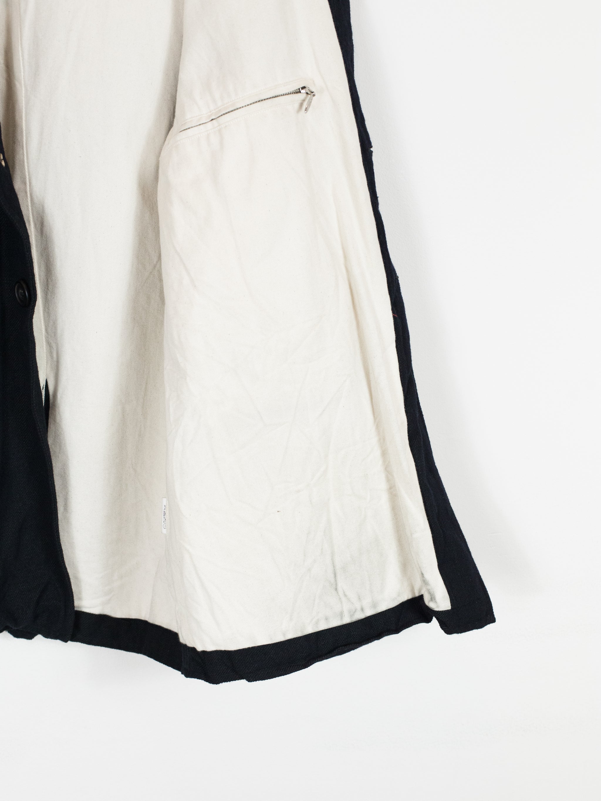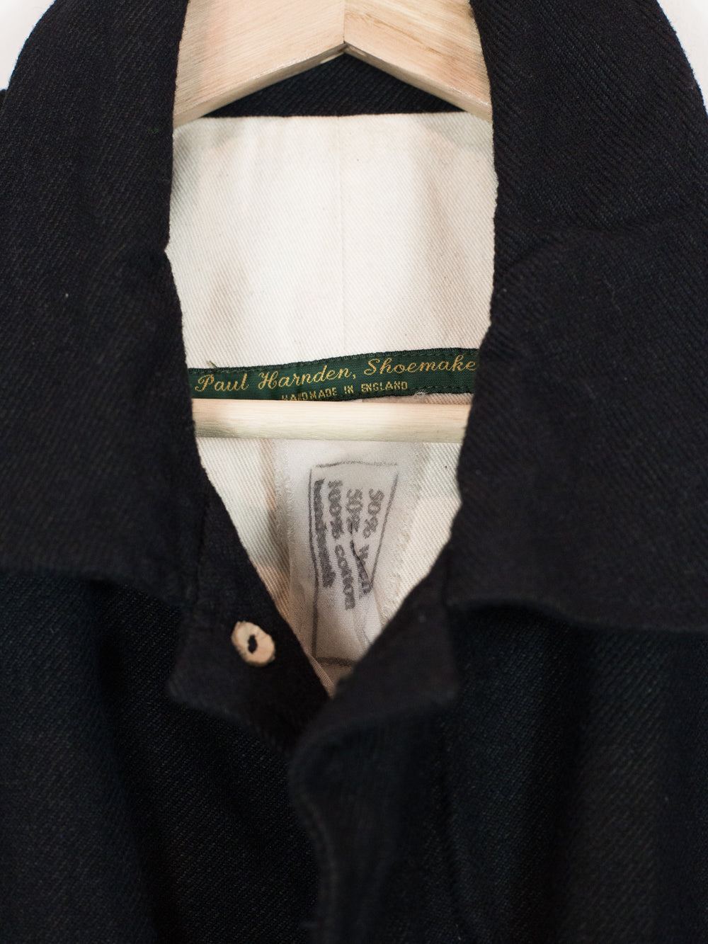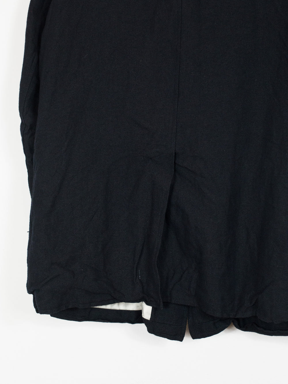 Here is a classic cropped mac in a robust wool/linen blend that has an amazingly cozy handfeel. Great color depth, black in all but direct sunlight, in which it shows some dark navy undertones. Oversized fit that is still sharp thanks to the soft structure of the face fabric material and lining. Overall, this piece feels amazing to wear. With its no-nonsense natural textiles throughout and a super refined, classic shape, it really grants a sense of physical and psychological security. This mac doesn’t have the usual restricting high shoulders of a Paul Harnden piece and the A-line silhouette is dialed-back and much more manageable, all of which makes for a more versatile piece that can feel at home in many different wardrobes.