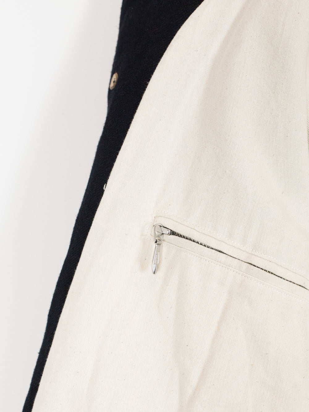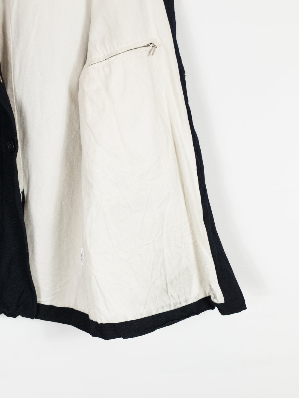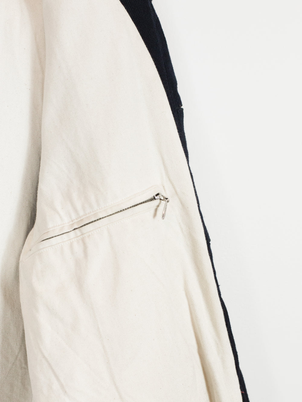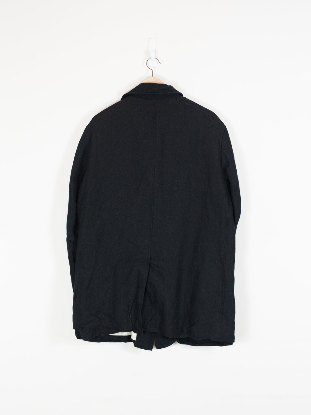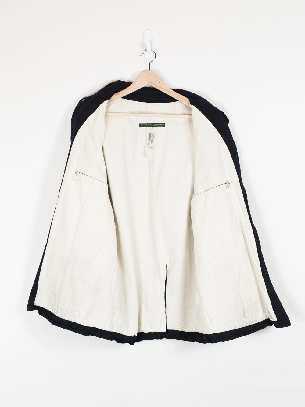 Here is a classic cropped mac in a robust wool/linen blend that has an amazingly cozy handfeel. Great color depth, black in all but direct sunlight, in which it shows some dark navy undertones. Oversized fit that is still sharp thanks to the soft structure of the face fabric material and lining. Overall, this piece feels amazing to wear. With its no-nonsense natural textiles throughout and a super refined, classic shape, it really grants a sense of physical and psychological security. This mac doesn’t have the usual restricting high shoulders of a Paul Harnden piece and the A-line silhouette is dialed-back and much more manageable, all of which makes for a more versatile piece that can feel at home in many different wardrobes.