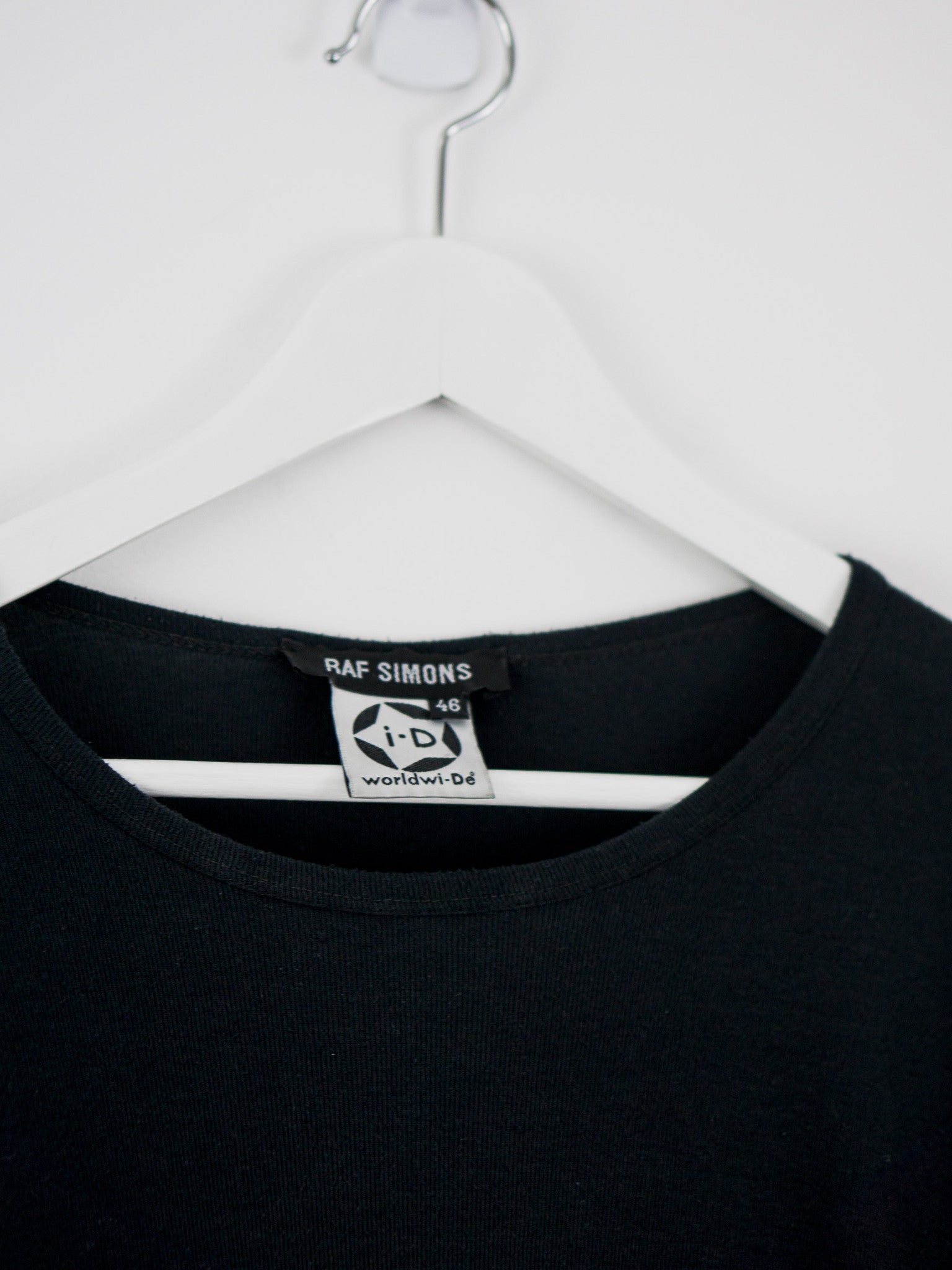 The rarest and most highly-desired Raf Simons item featured here on HUIBEN. This tee released in February of 2001 when Raf became guest editor for Issue #206. The first letter of each word are in i-D magazine's logotype and the rest in Borges Blanca. A soft, substantial cotton in a deep black colour. The print is a white screen print, cracking has been kept to a minimum although still slightly noticeable. The shape of the tee is in line with some of the looser Spring/Summer 1998 tees in the same dense cotton fabric, including dropped shoulders making the sleeves a near mid-arm length. The tee is most definitely oversized considering many of the other size 46 tee-shirts from this period fit more like a 44.