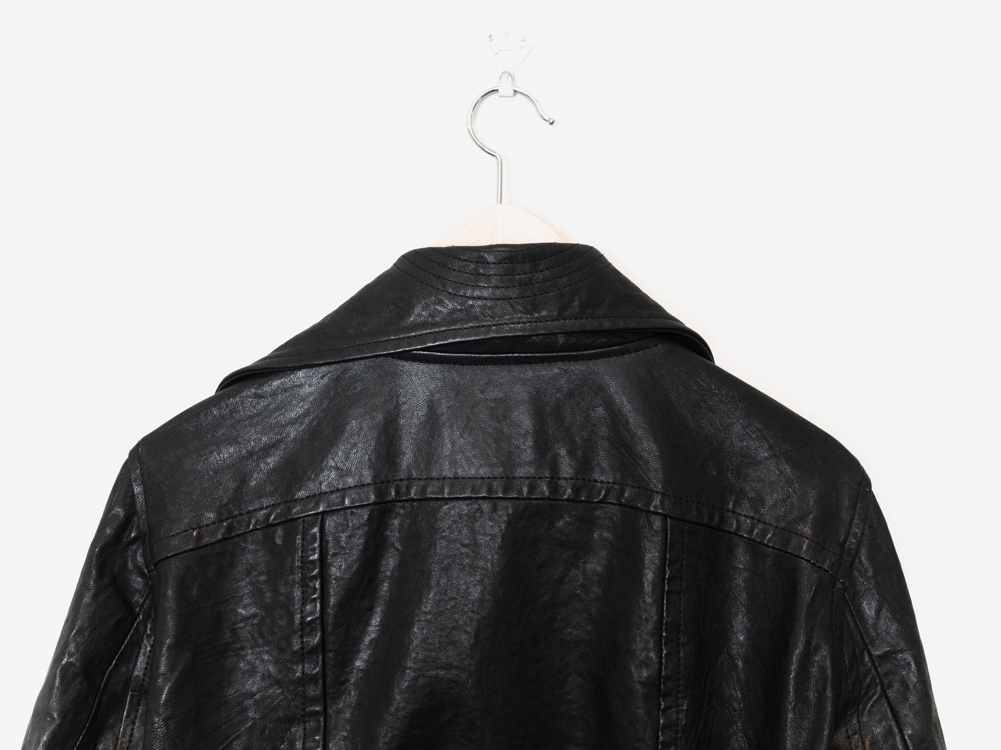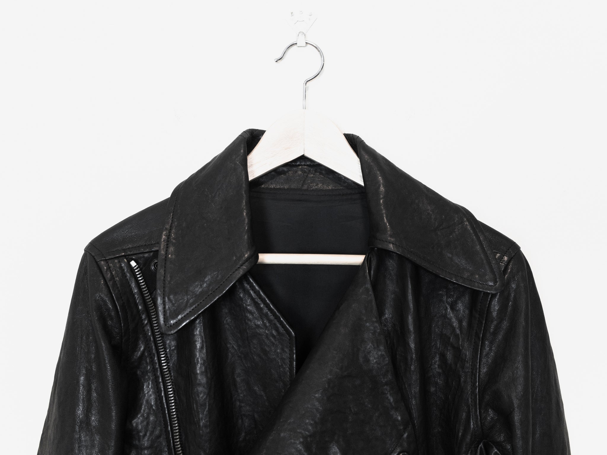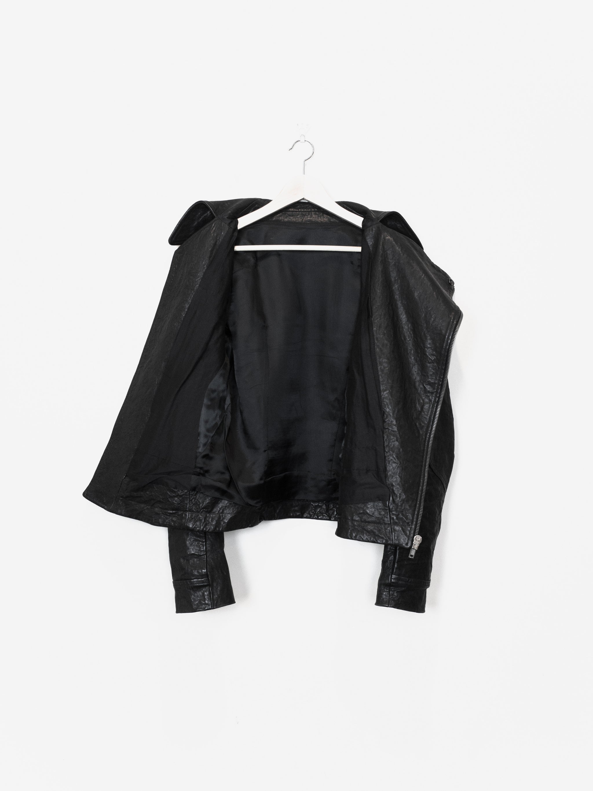 Here is the Berger, one of the leather jackets that best illustrates the aspirational relationship that Rick Owens' clothes have with architecture. Through it we can see an obsessive investigation with 'scale' and situating the human body within a set of objects that distorts, magnifies, and visually deconstructs the wearer's image in order to mediate the relationship between wearer and built environment in unique ways.