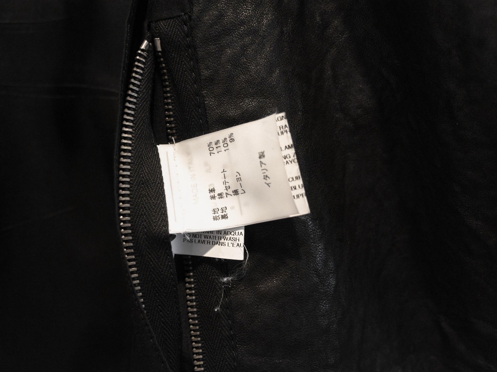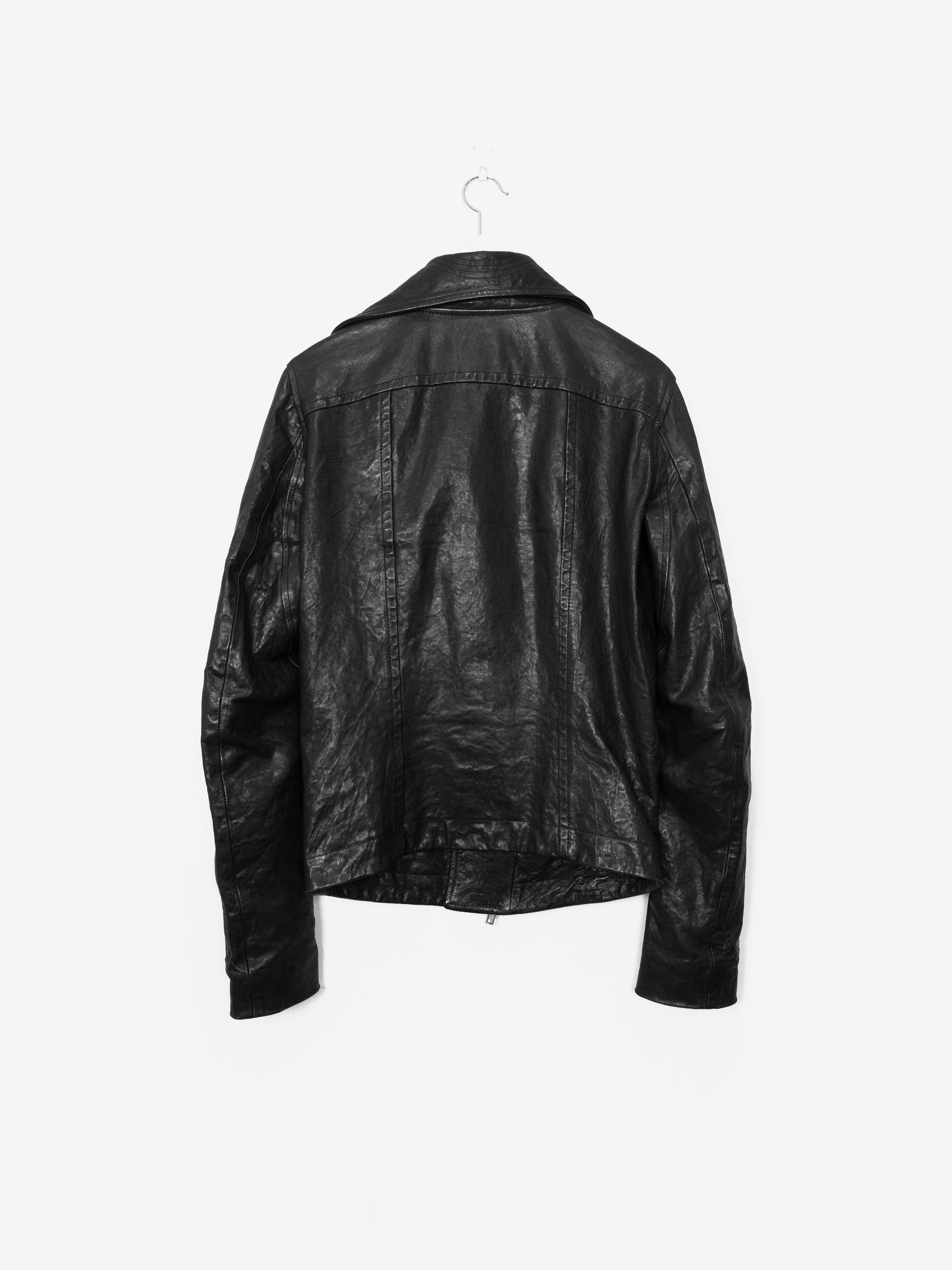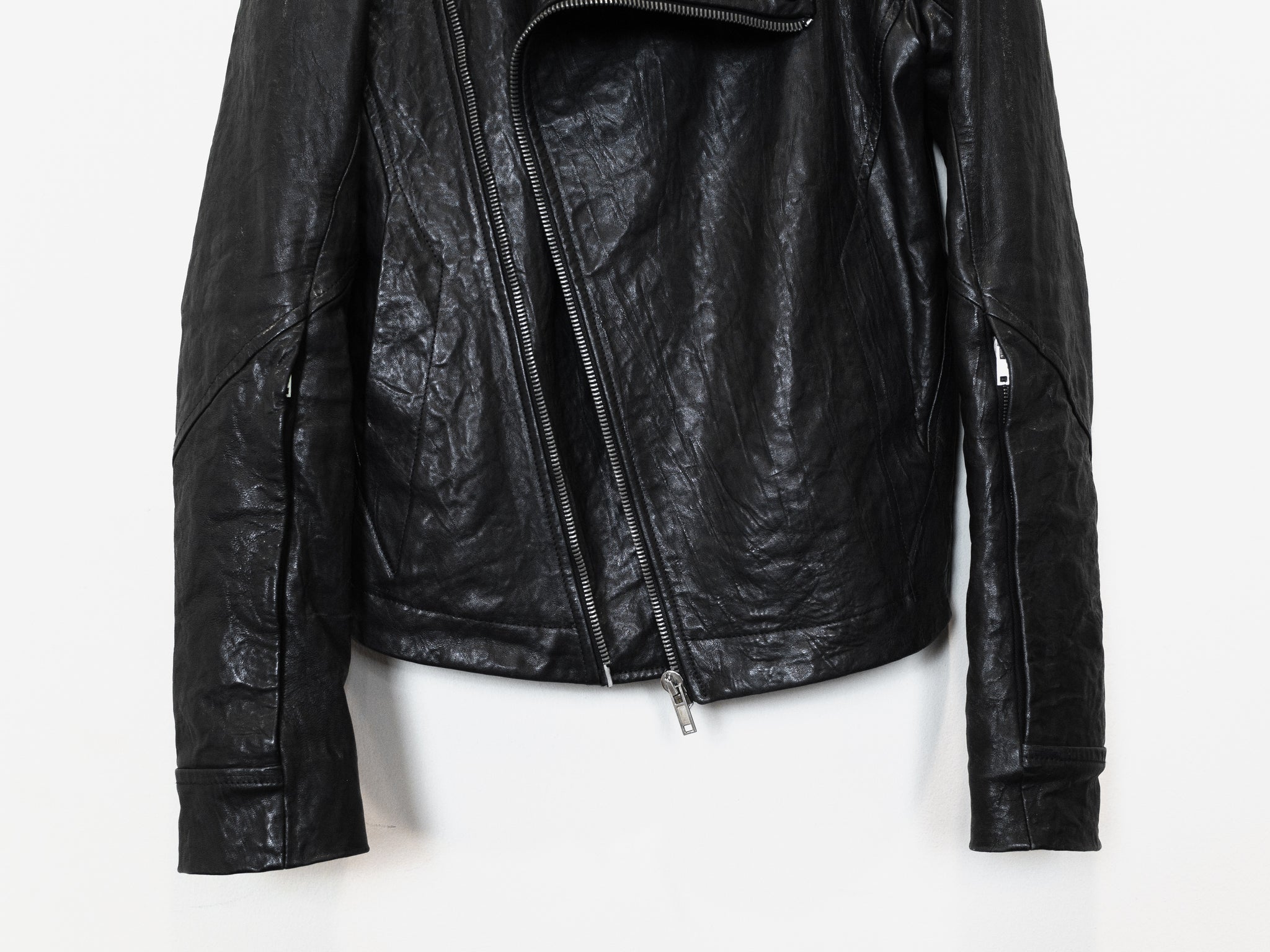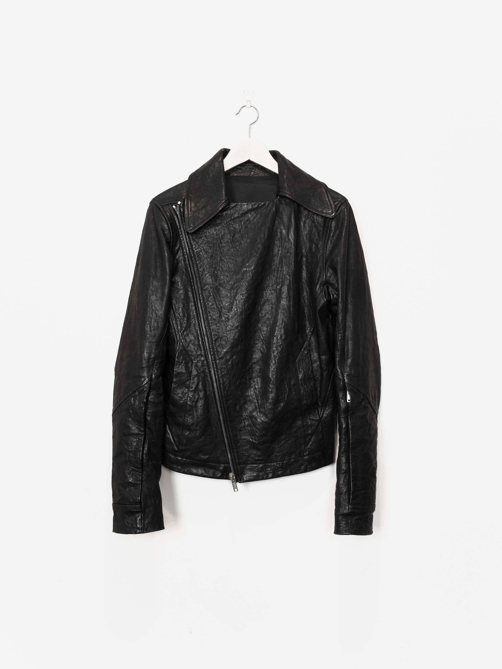 Here is the Berger, one of the leather jackets that best illustrates the aspirational relationship that Rick Owens' clothes have with architecture. Through it we can see an obsessive investigation with 'scale' and situating the human body within a set of objects that distorts, magnifies, and visually deconstructs the wearer's image in order to mediate the relationship between wearer and built environment in unique ways.
