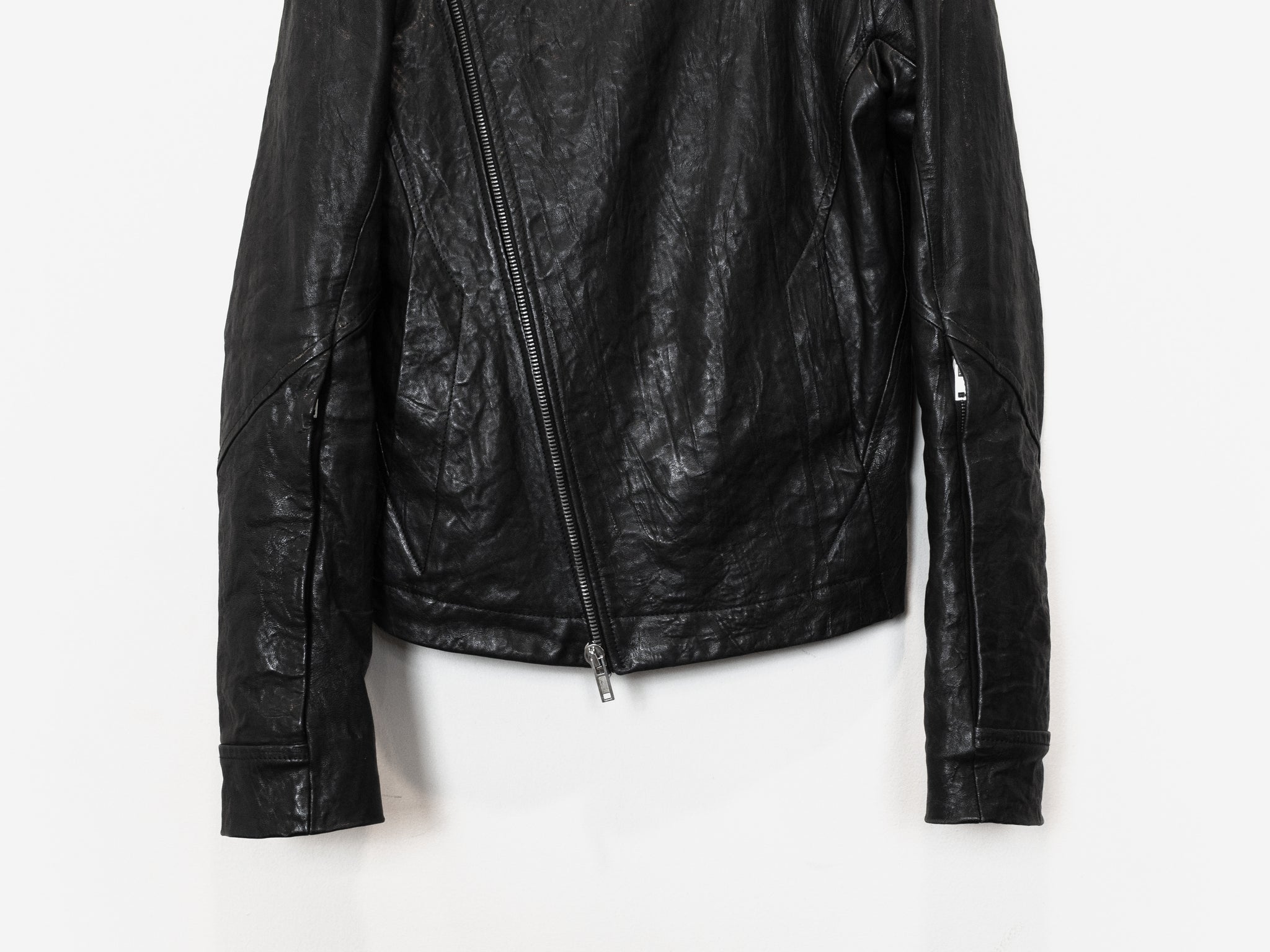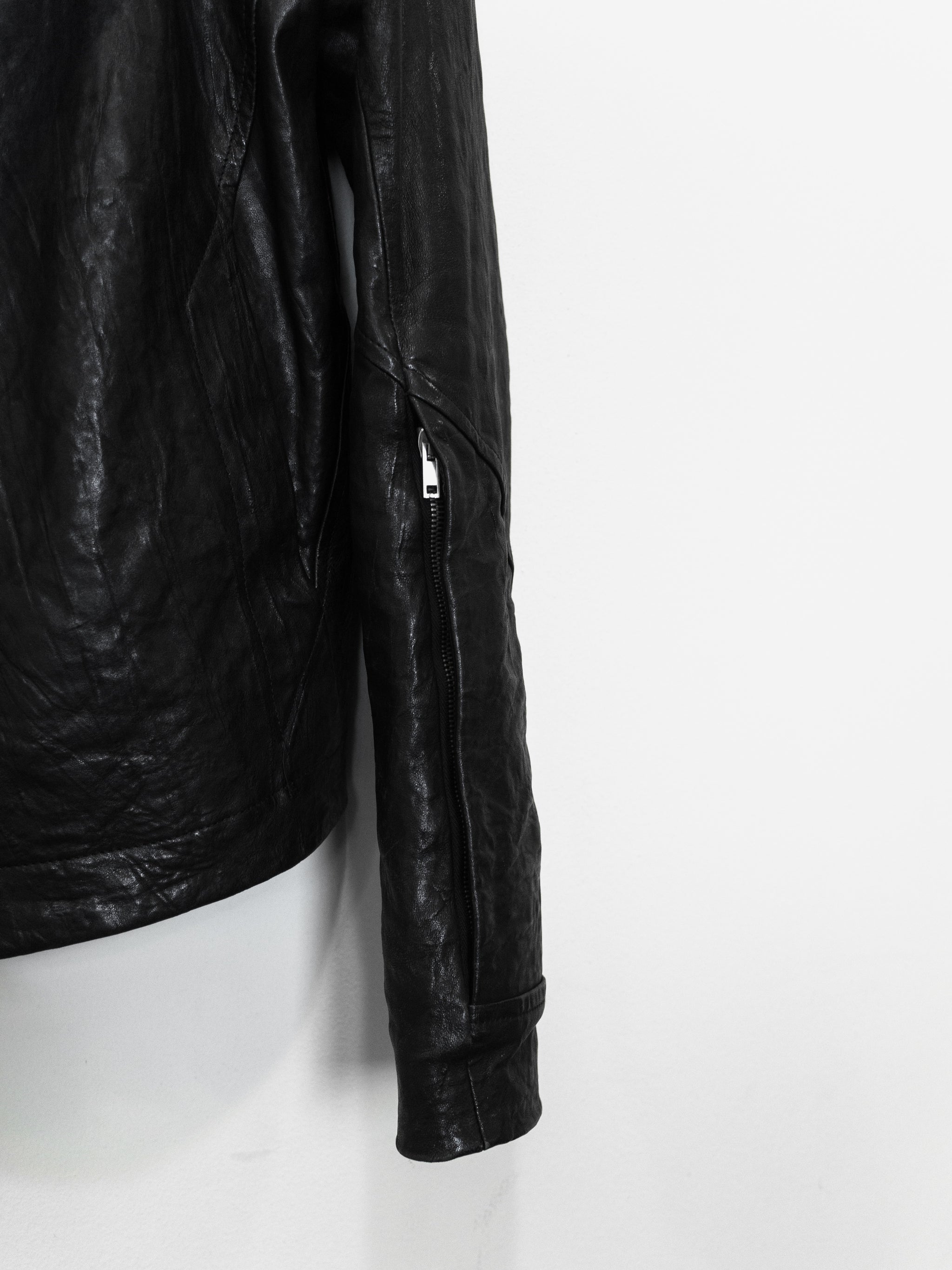 The Berger is crafted based on a traditional double rider shape, with its double breasted lapels, sculpted back, and collar. It utilizes the central lapel and collar as a design elements, magnifying them and converting the front into a monster front panel that stretches across nearly the entire width of the body. The effect is drastic when closed, the front of the piece essentially a single superimposed plane punctuated by one long diagonal zip and nothing else. The way the oversized collar layers over the panel yet the panel cuts so sharply and orthogonally across at the neckline is again indicative of its flatness and its monolithic nature. This central move, of scaling up just one element of an archetypical double rider transforms the entire nature of the jacket--a lapel becomes a plane, the relationship to the body more like an overlaid element of the built environment through its uncompromising shape and size (after all, the jacket and lapel have this form despite your body being there, not because your body is there). The Berger translates the architectural scale onto a wearable garment, creating also with the beautiful hammered lamb texture, the illusion of the built environment bleeding into your image.