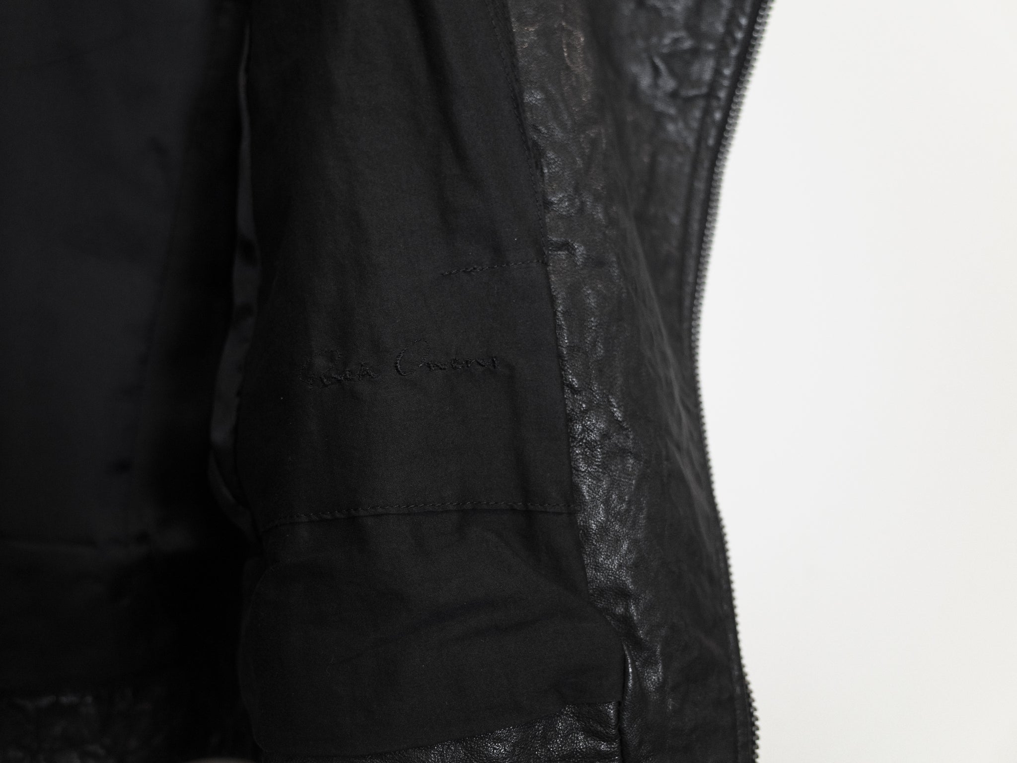 The piece is finished with a substantial Raccagni center zipper, zip-closed 'turbo' stash sleeve pockets, geometric patternwork, rayon/cupro lining, and two interior pockets. All cut in the most beautiful glistening hammered lamb, with an appearance like board formed concrete in its pressed striations.