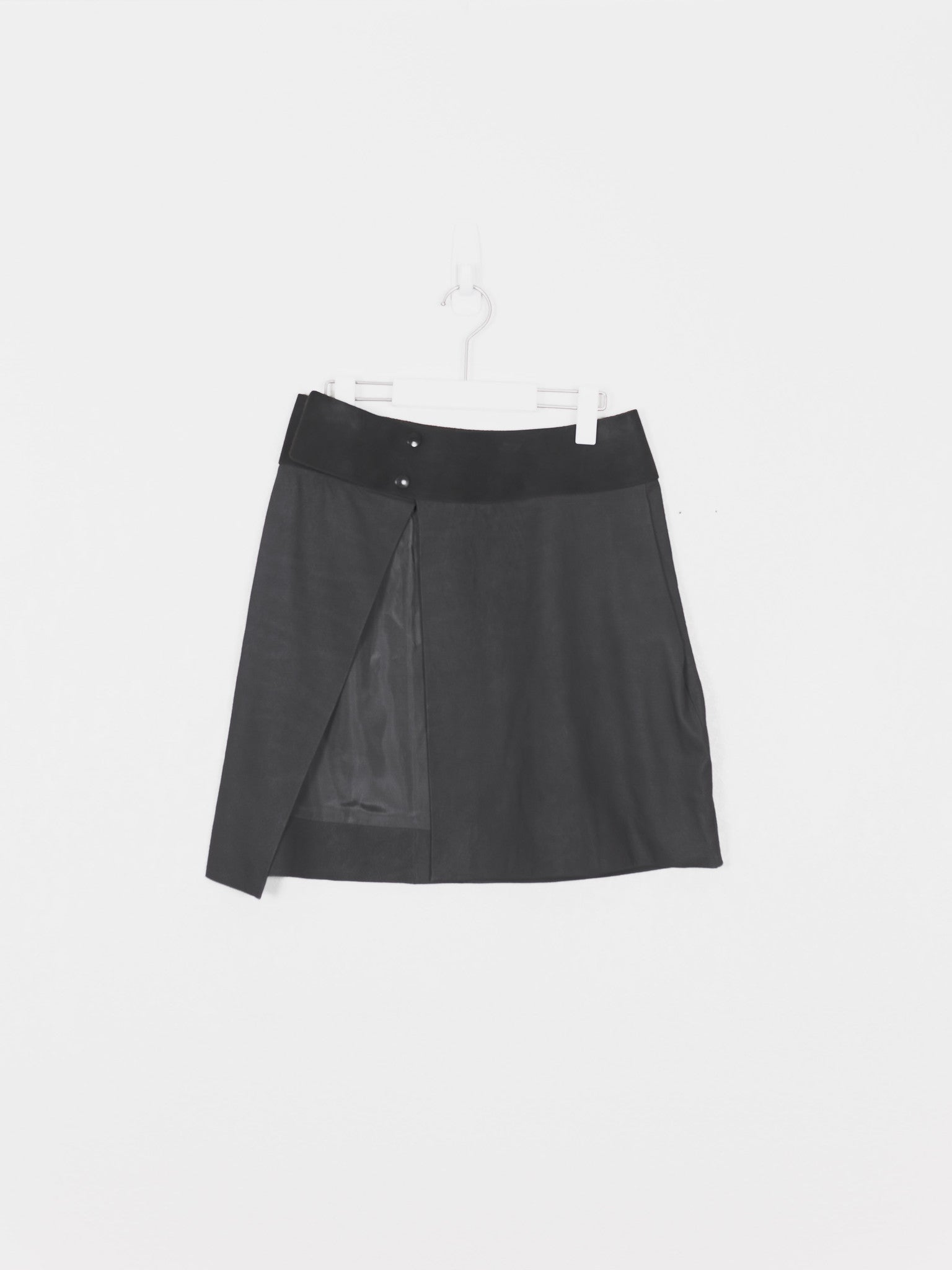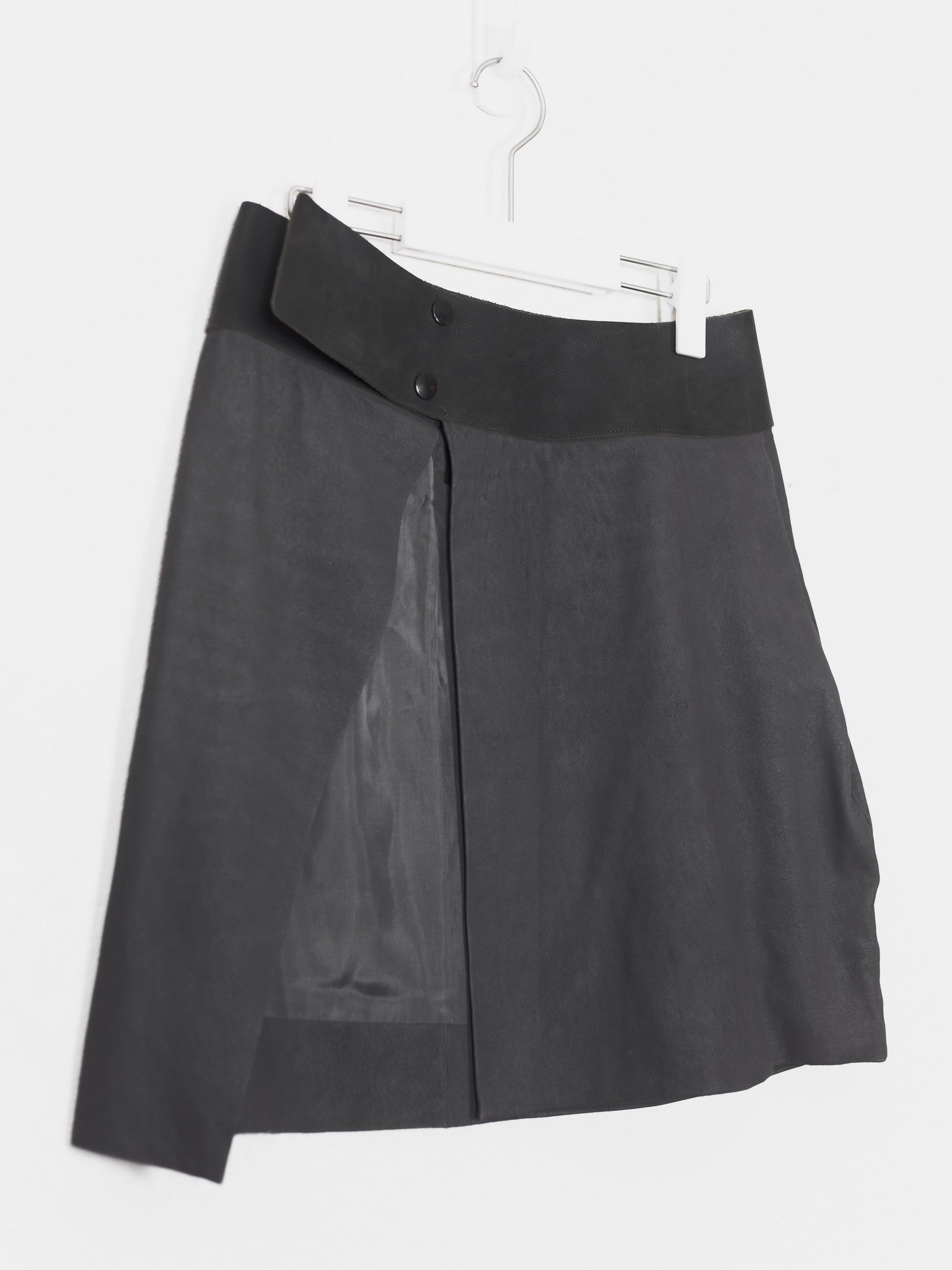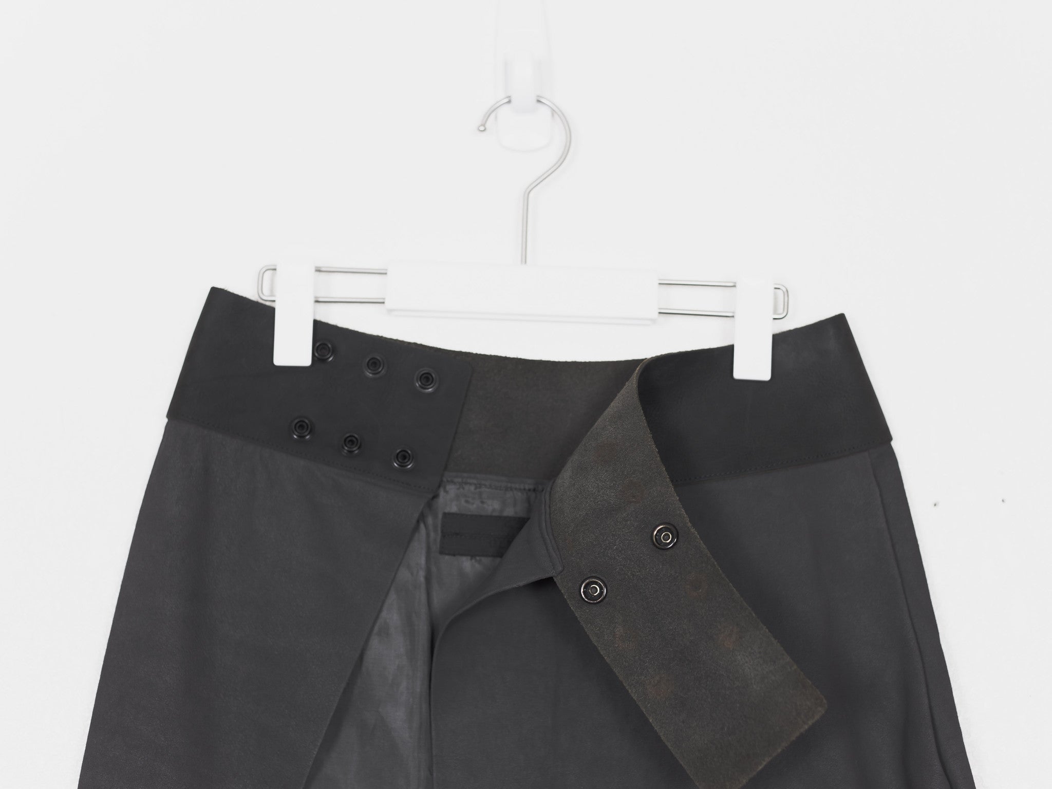 Minimal piece constructed of a hefty adjustable leather waistband and thinner leather body over a silky liner. As with all his leathers, Rick Owens showcases wonderful processing in materials here. Can be worn standalone or layered over other bottoms.