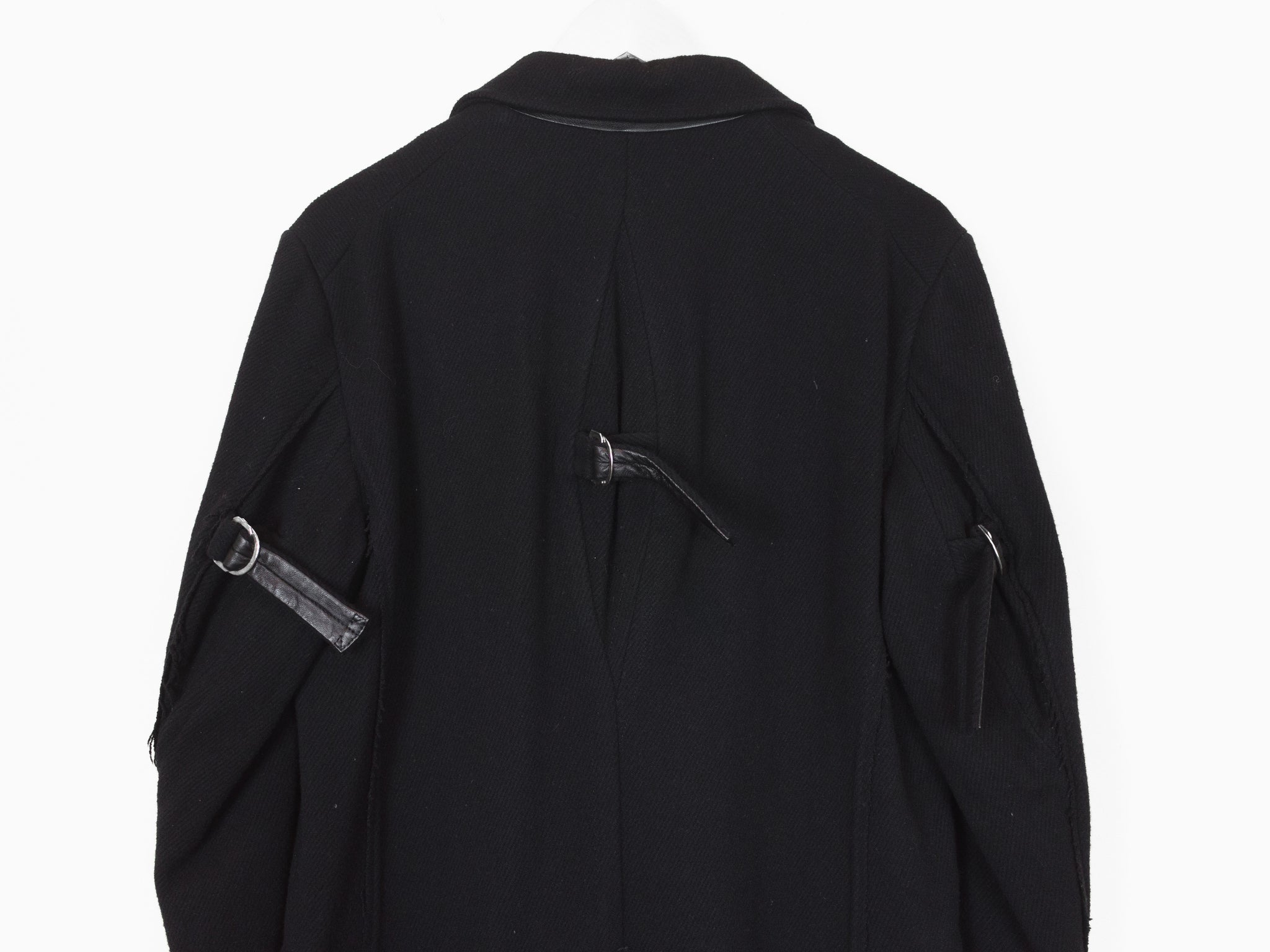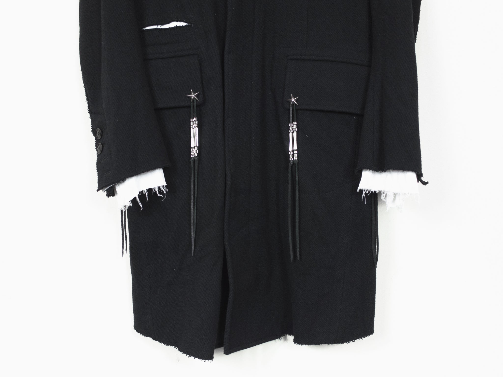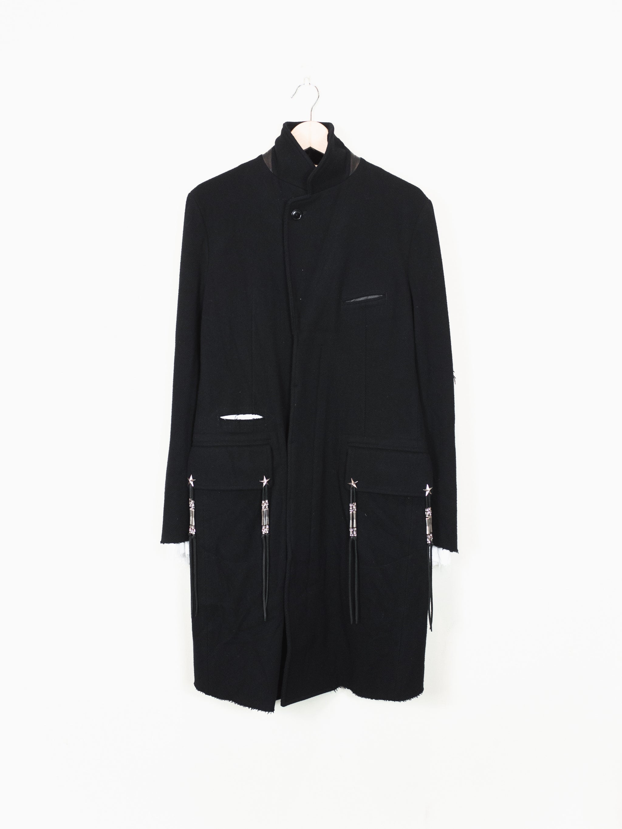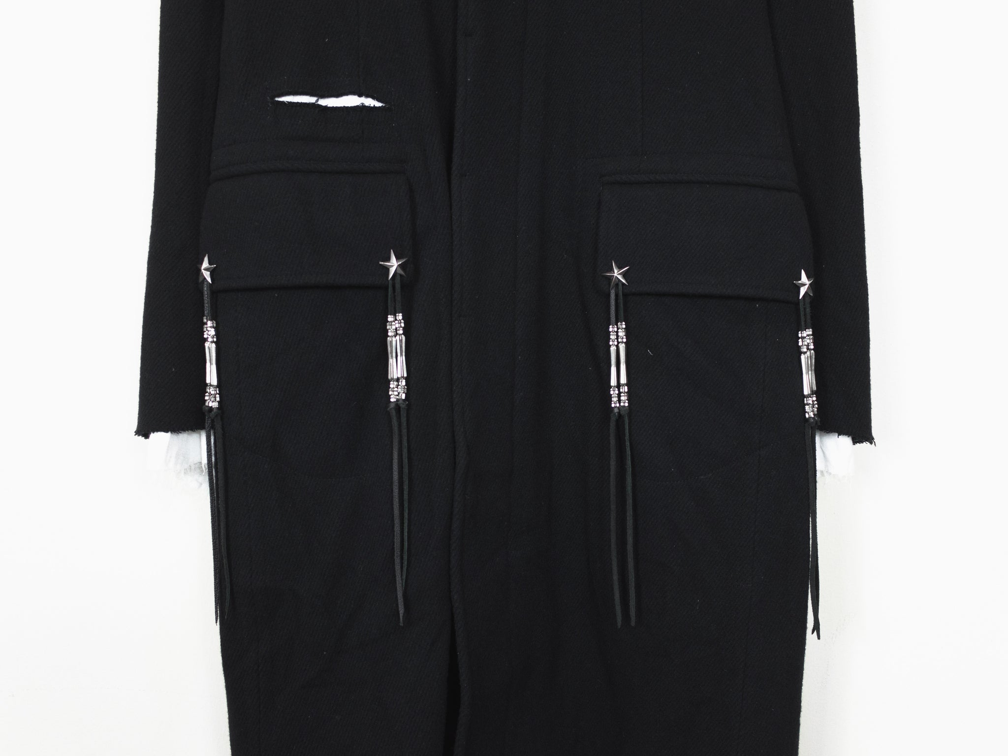This coat manifests as a formal chester with its usual accoutrements: bold lapels, sharp cut, chest and waist flap pockets. However, the way Takahiro Miyashita affects the traditional elements of a chester coat opens this piece up to being worn in different ways. Tattered and extended/exposed sleeve lining, an unbalanced double back vent, and a mixture of finished and raw seams all add an element of roughness that allows the wearer to style such a formal piece in a grungier look (Think mudwash denim from Takahiro's former project Number (N)ine or Greg Lauren's vintage patchwork). In addition, there are bondage straps on the triceps and back, a diagonal cross-body strap, and 4 star 'conches' adorning the flap waist pockets to add elements of visual noise. The silver leather-tasseled star badges and silver d-rings securing the straps bring a lightness that punctuates the heavy black coat and introduces yet another character within the piece. These details throw it in perfect alignment with the bondage detailing of Helmut Lang, the decadent rockstar textures of Saint Laurent and more.