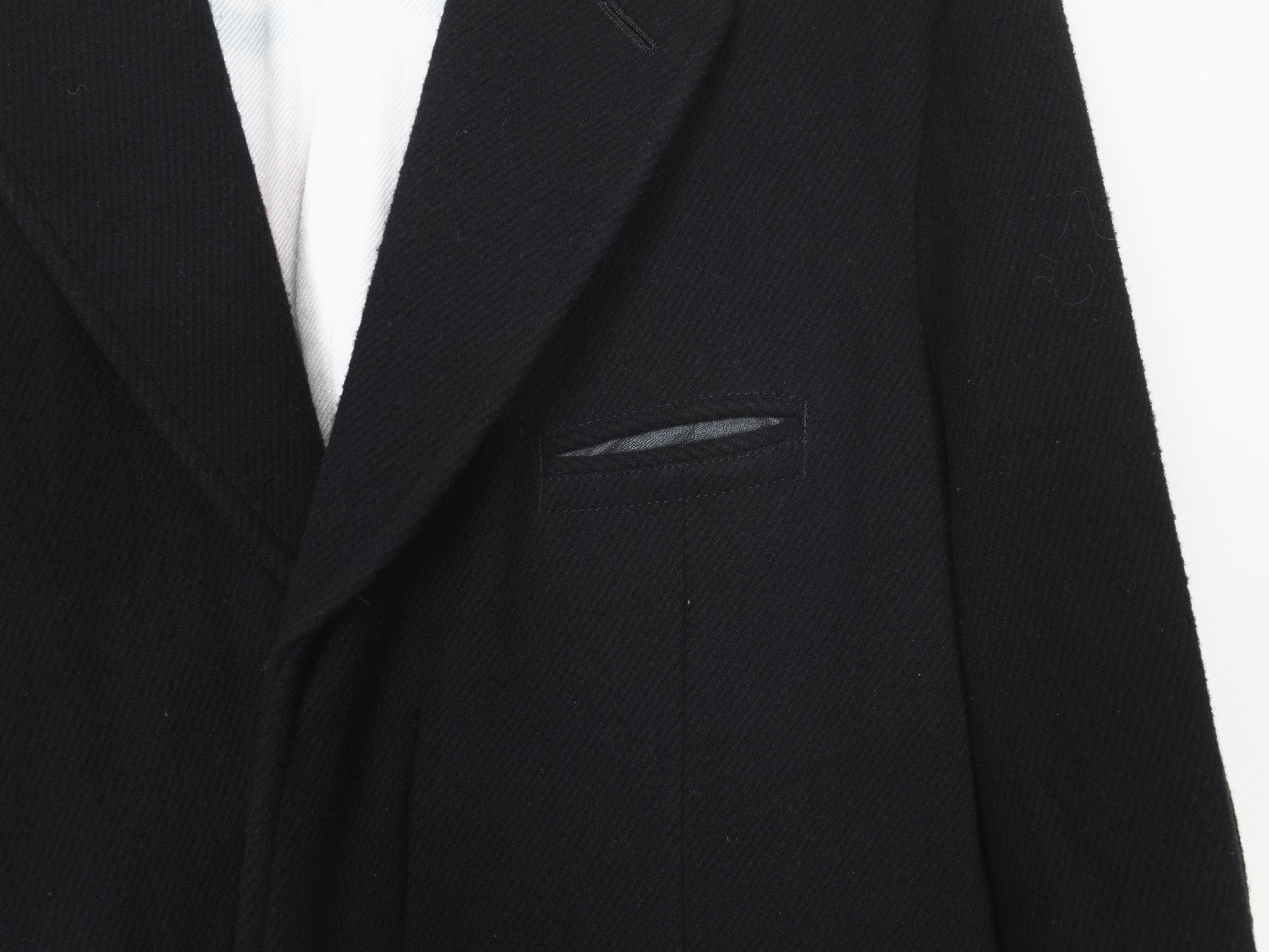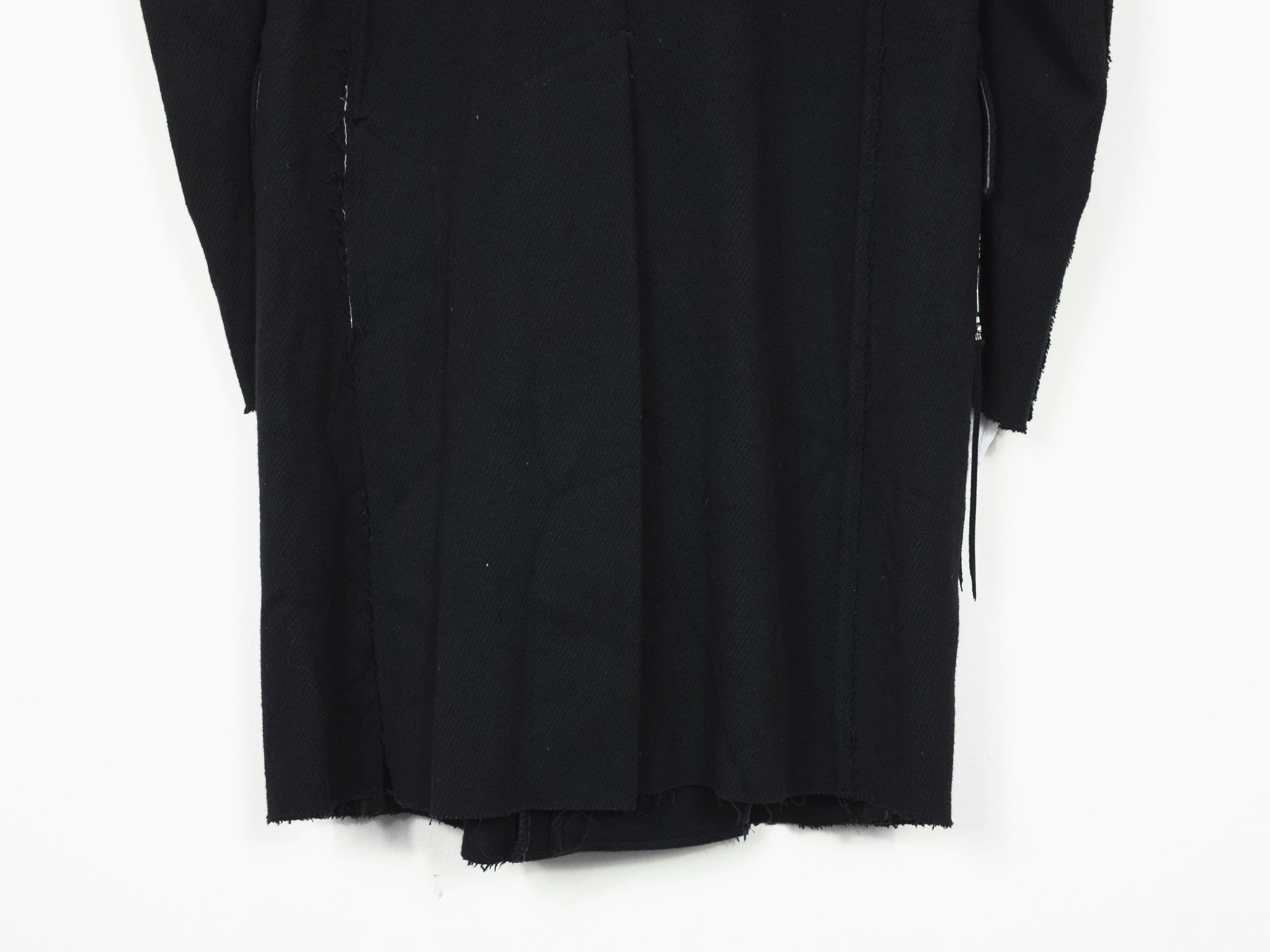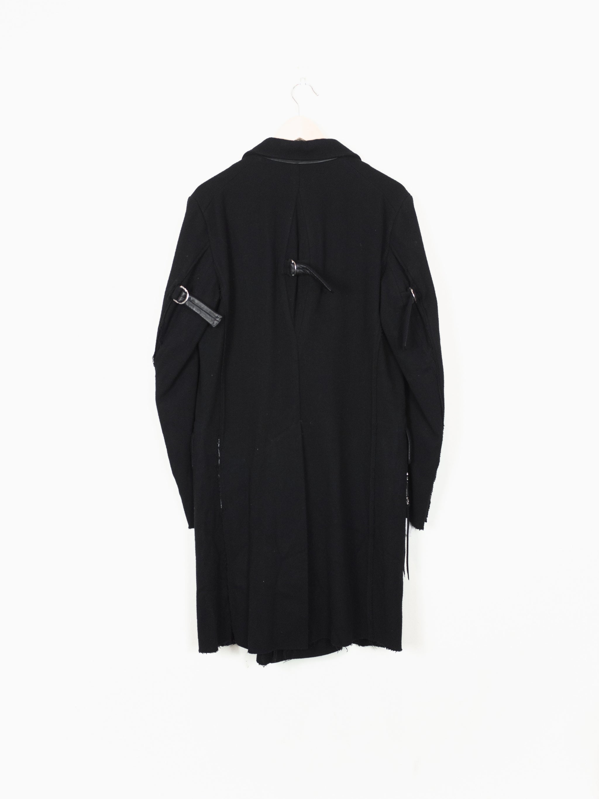 This coat manifests as a formal chester with its usual accoutrements: bold lapels, sharp cut, chest and waist flap pockets. However, the way Takahiro Miyashita affects the traditional elements of a chester coat opens this piece up to being worn in different ways. Tattered and extended/exposed sleeve lining, an unbalanced double back vent, and a mixture of finished and raw seams all add an element of roughness that allows the wearer to style such a formal piece in a grungier look (Think mudwash denim from Takahiro's former project Number (N)ine or Greg Lauren's vintage patchwork). In addition, there are bondage straps on the triceps and back, a diagonal cross-body strap, and 4 star 'conches' adorning the flap waist pockets to add elements of visual noise. The silver leather-tasseled star badges and silver d-rings securing the straps bring a lightness that punctuates the heavy black coat and introduces yet another character within the piece. These details throw it in perfect alignment with the bondage detailing of Helmut Lang, the decadent rockstar textures of Saint Laurent and more.