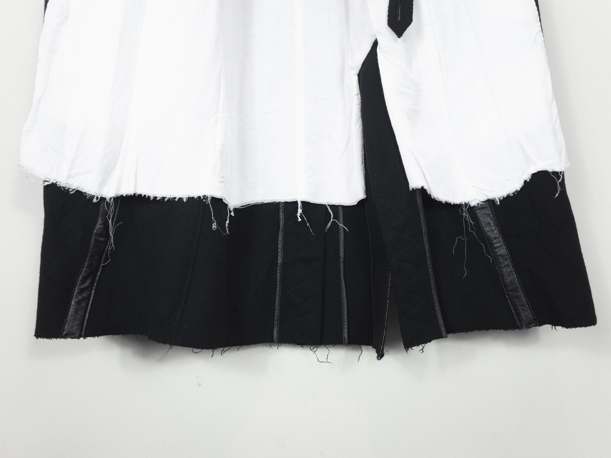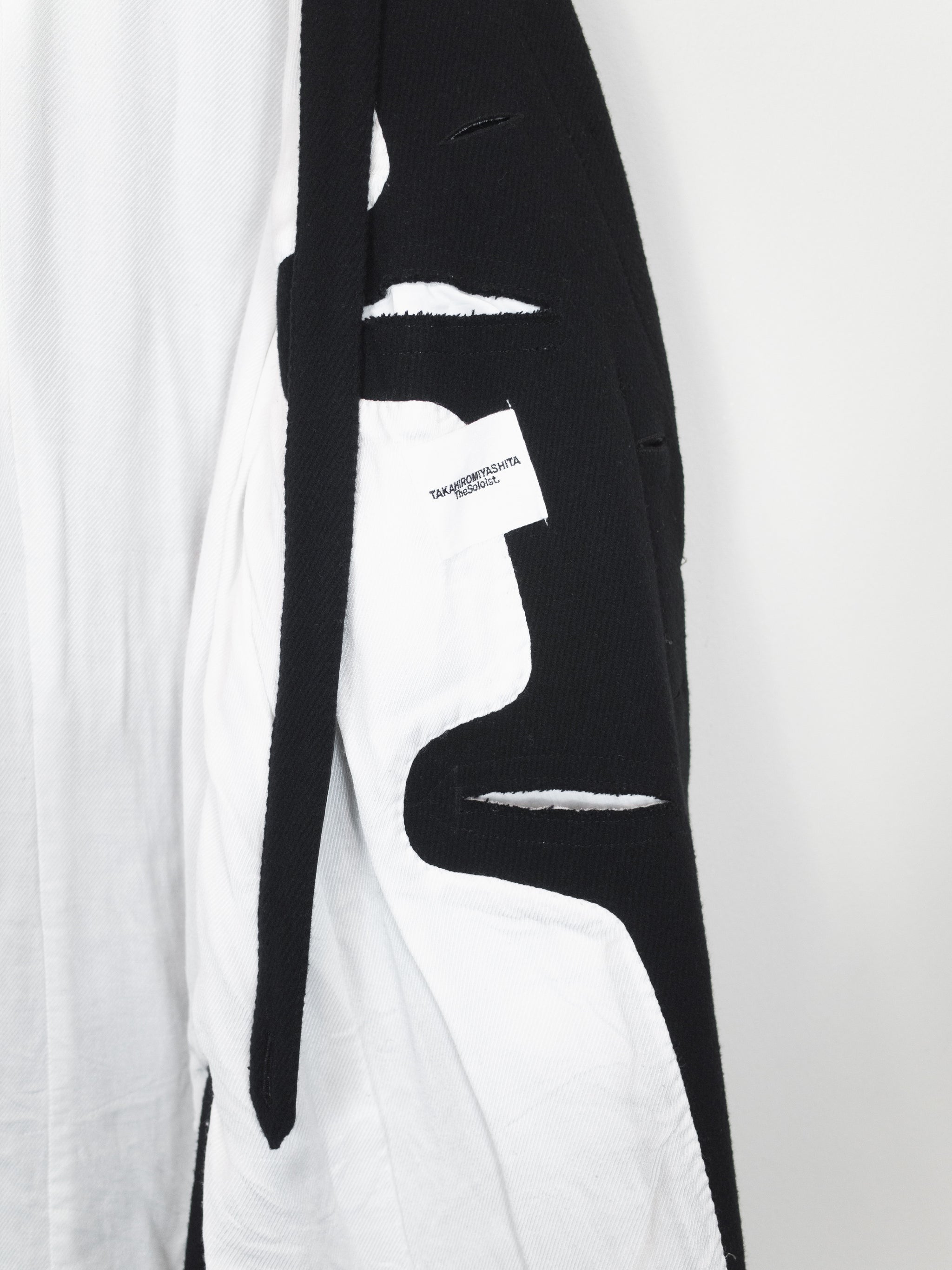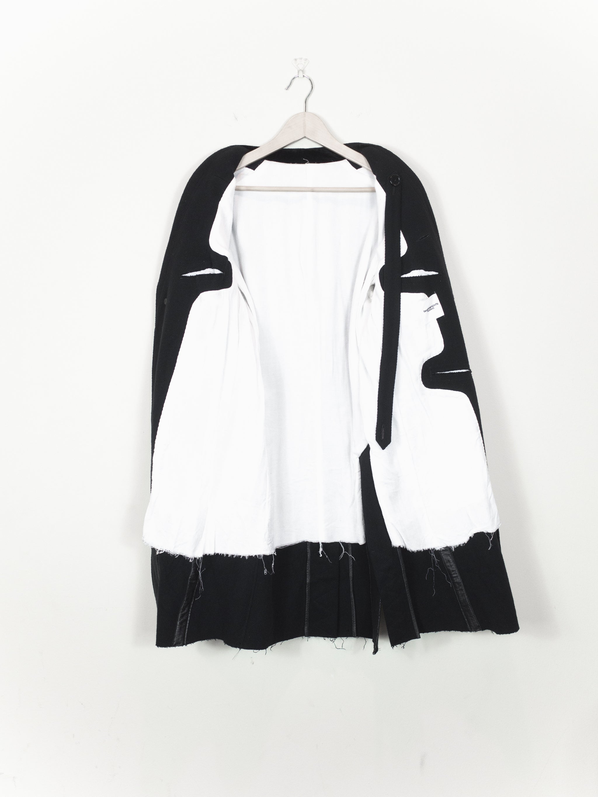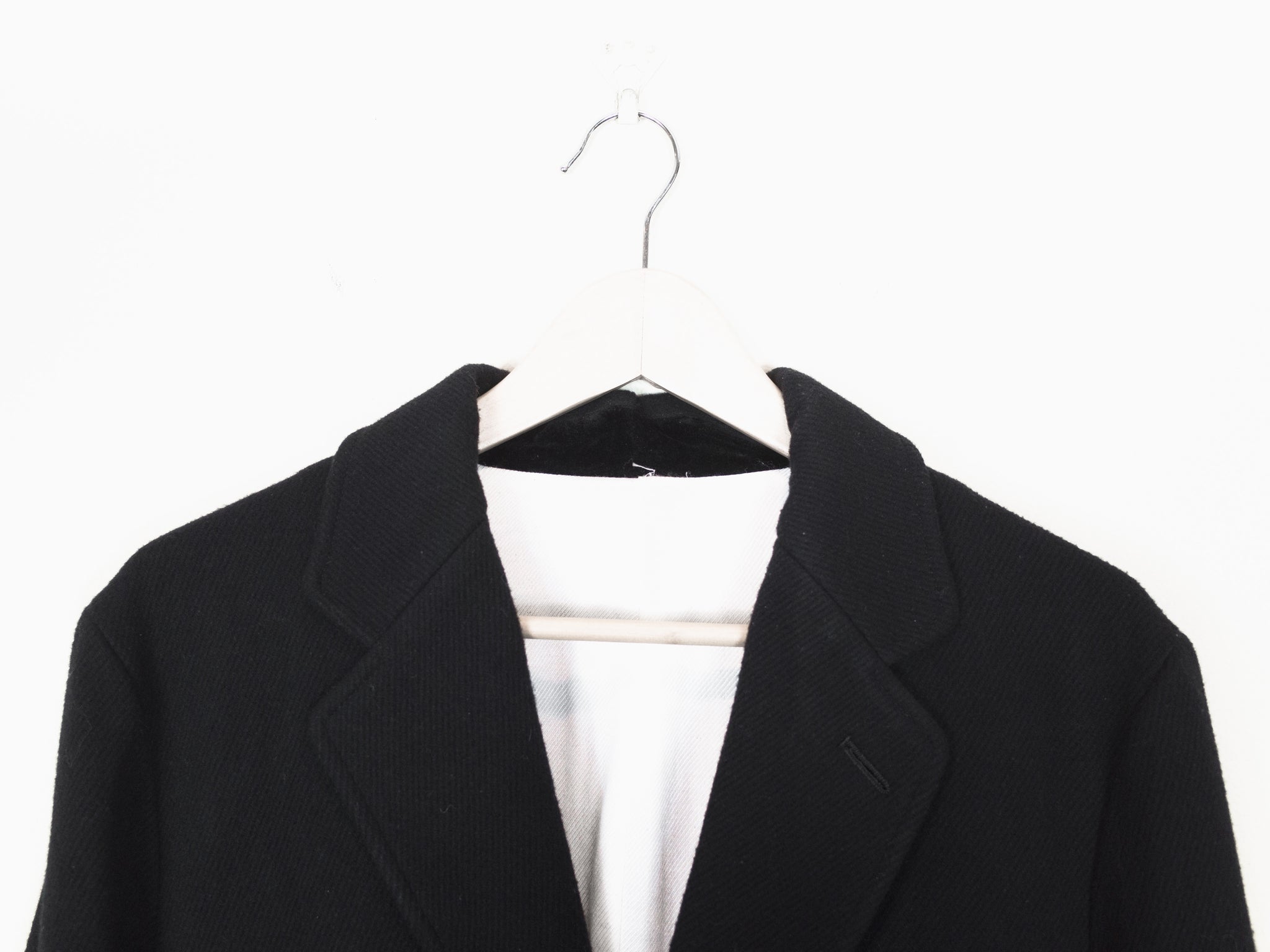 This coat manifests as a formal chester with its usual accoutrements: bold lapels, sharp cut, chest and waist flap pockets. However, the way Takahiro Miyashita affects the traditional elements of a chester coat opens this piece up to being worn in different ways. Tattered and extended/exposed sleeve lining, an unbalanced double back vent, and a mixture of finished and raw seams all add an element of roughness that allows the wearer to style such a formal piece in a grungier look (Think mudwash denim from Takahiro's former project Number (N)ine or Greg Lauren's vintage patchwork). In addition, there are bondage straps on the triceps and back, a diagonal cross-body strap, and 4 star 'conches' adorning the flap waist pockets to add elements of visual noise. The silver leather-tasseled star badges and silver d-rings securing the straps bring a lightness that punctuates the heavy black coat and introduces yet another character within the piece. These details throw it in perfect alignment with the bondage detailing of Helmut Lang, the decadent rockstar textures of Saint Laurent and more.