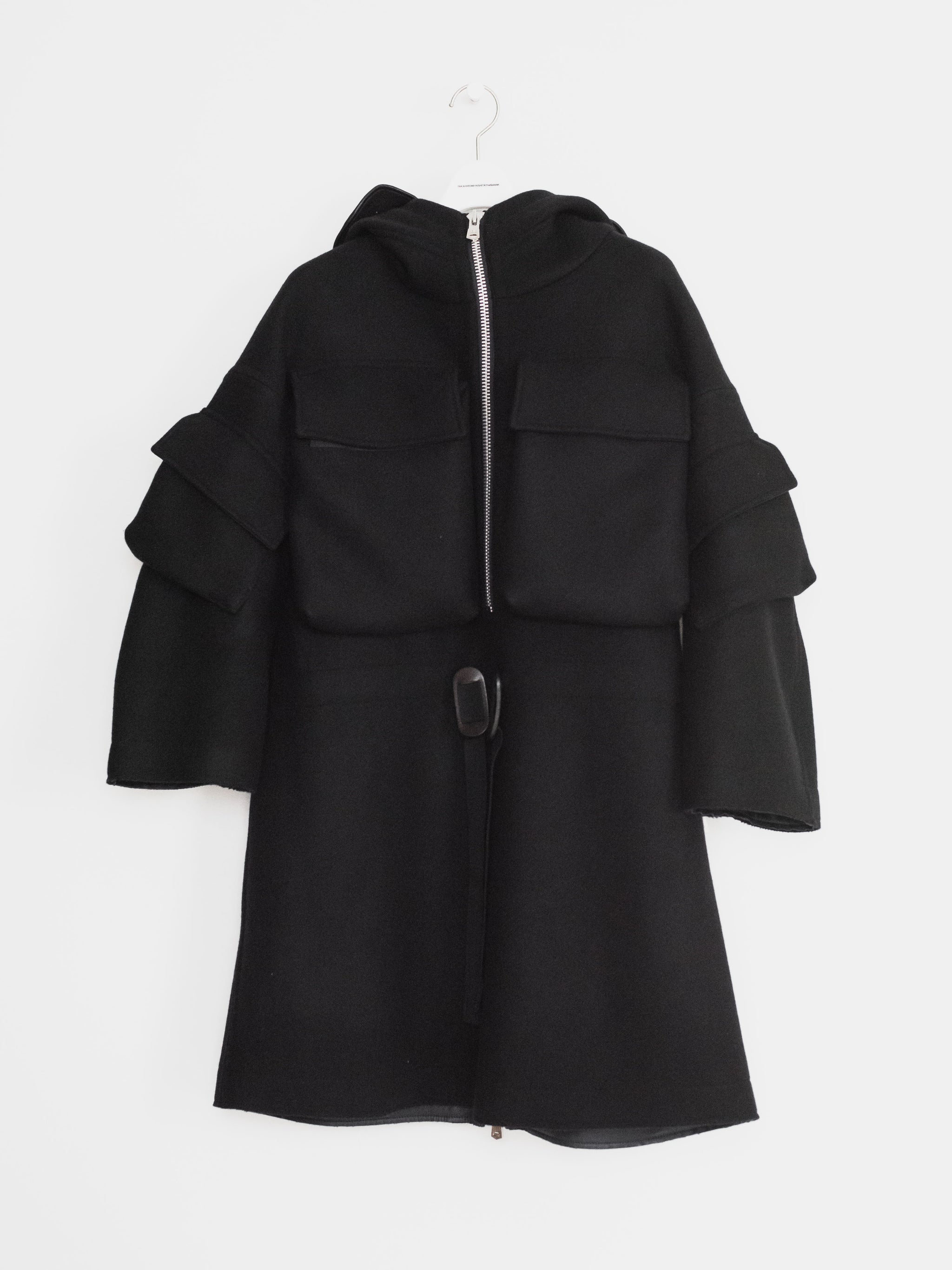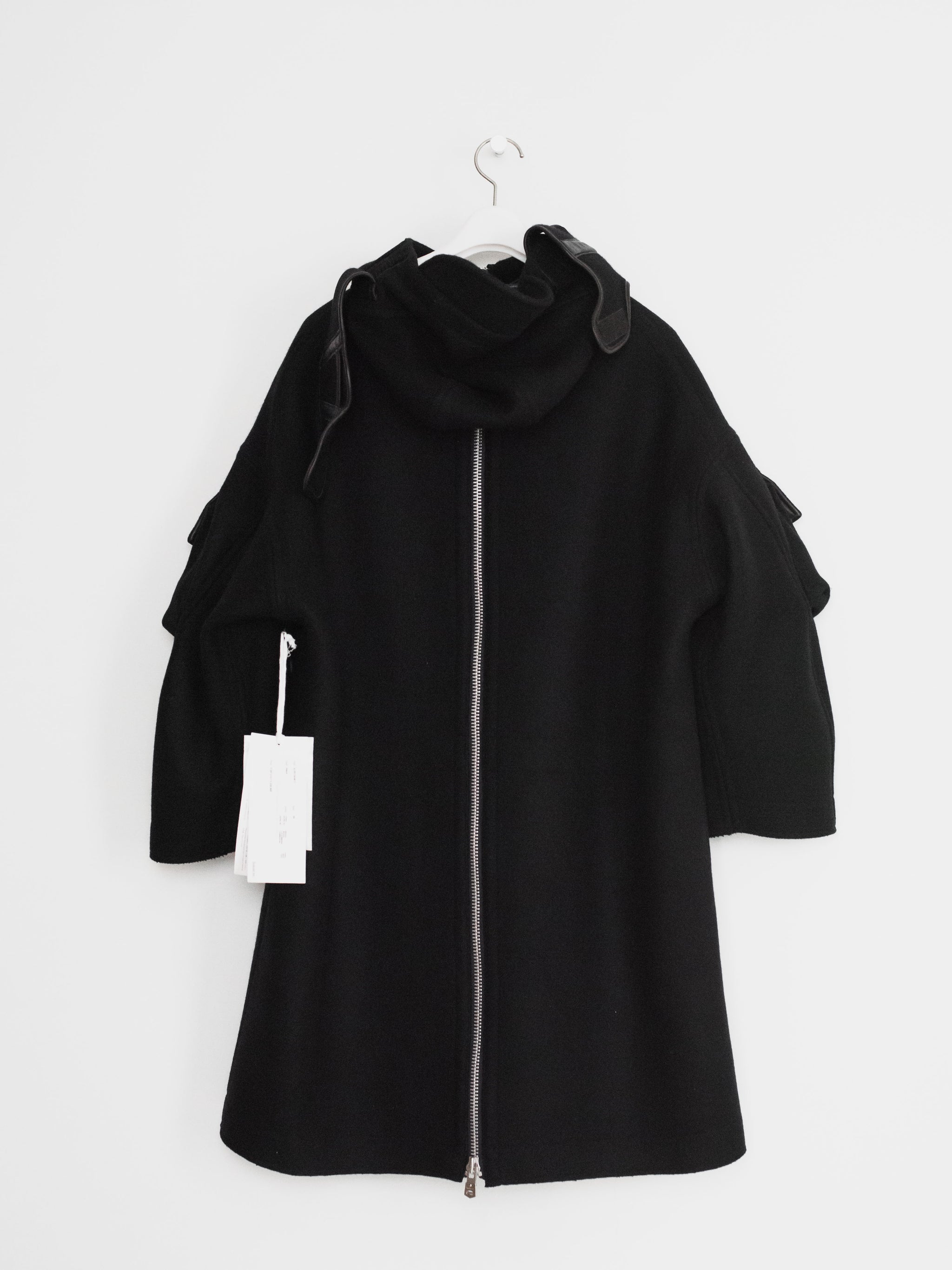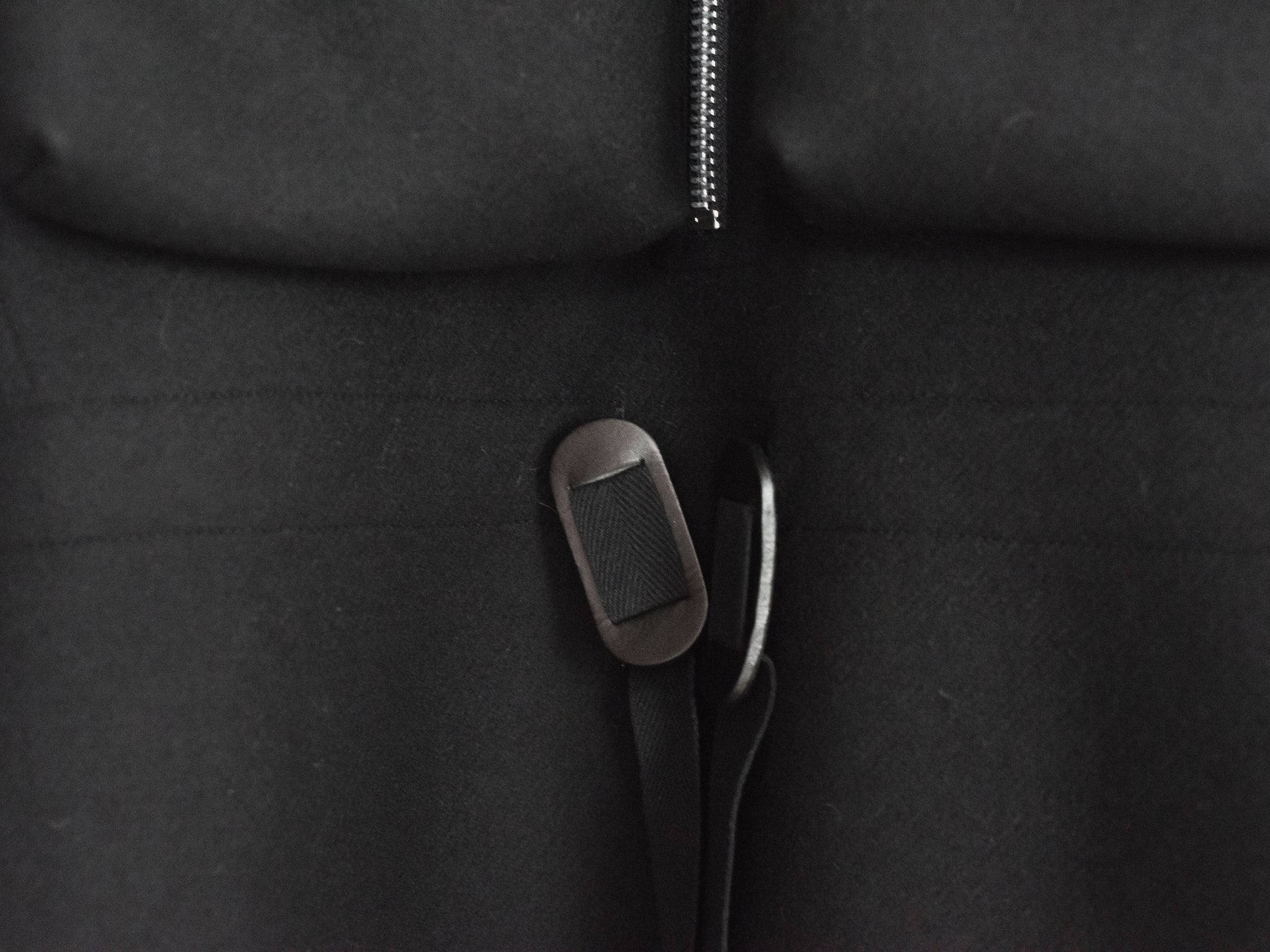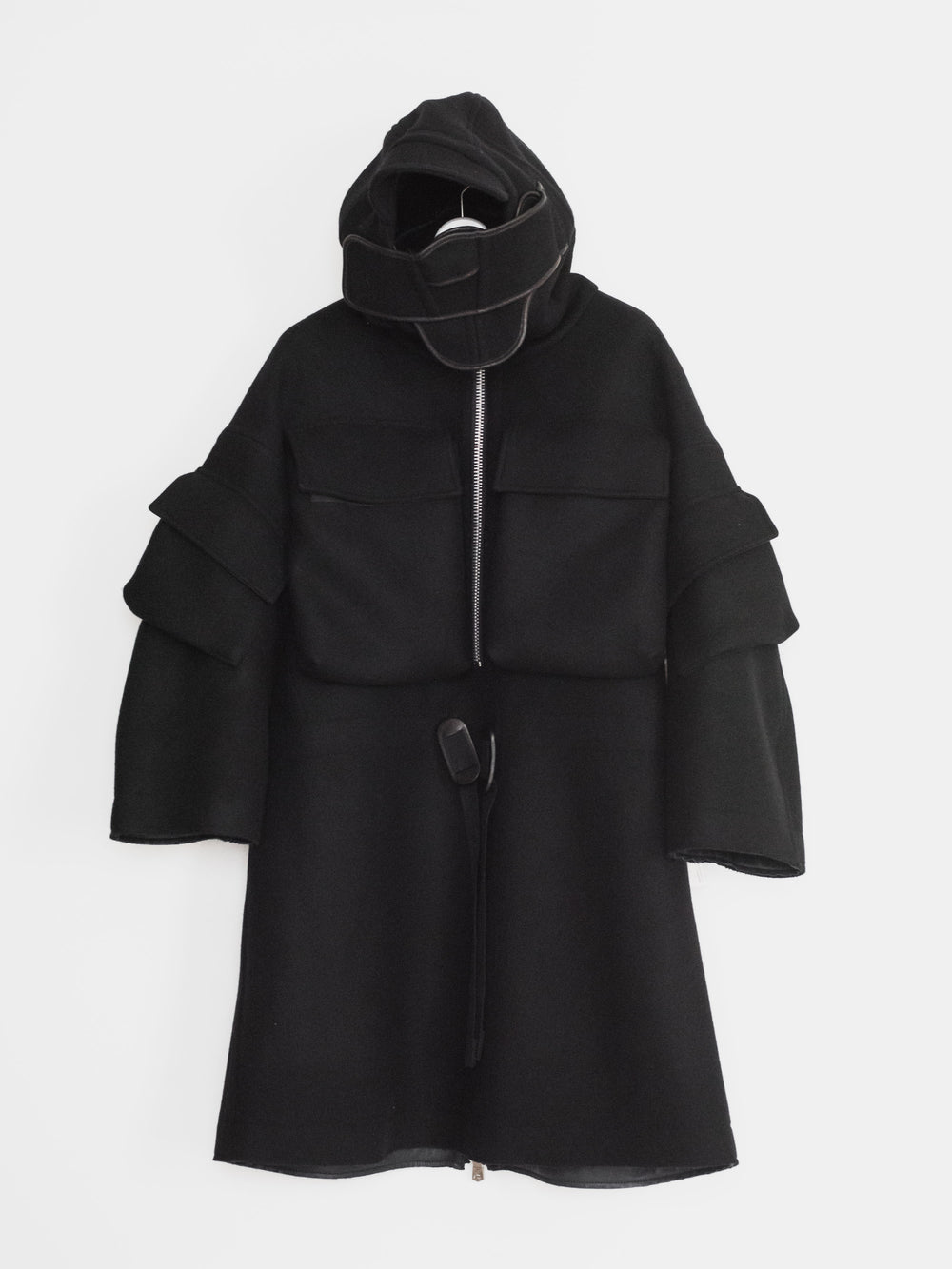 One of the coolest silhouettes the Soloist has released. Insane construction from a heavy, structured wool and finished throughout with lamb leather piping from the the prominent mask to the zipper lining. Large exaggerated pockets on the sleeves and bodies accentuate the aggressive silhouette further. Features adjustable waist cinch and prominent back zip. Quite versatile with its adjustability and oversized fit.