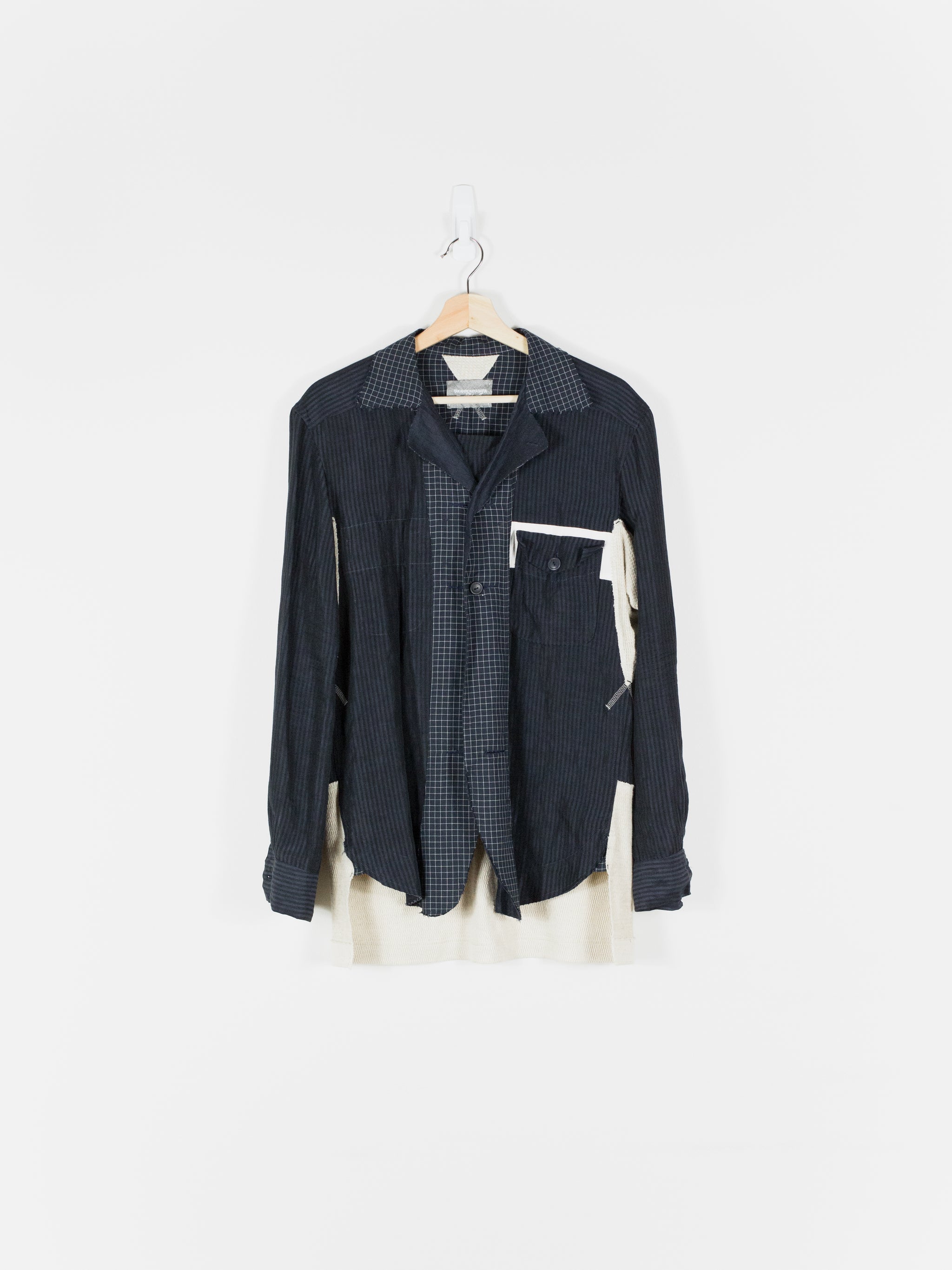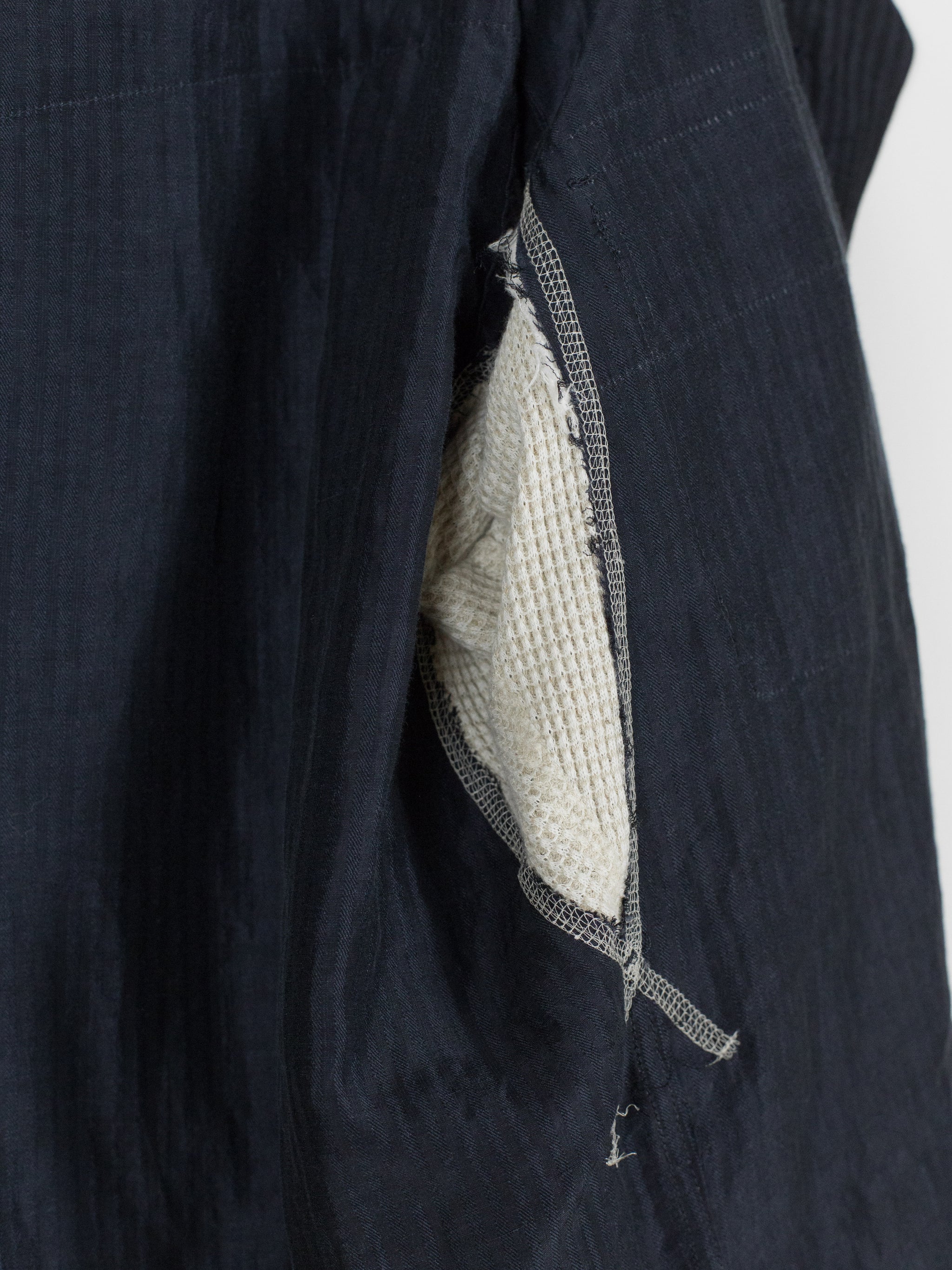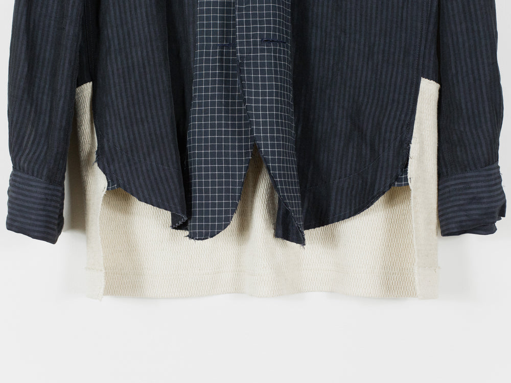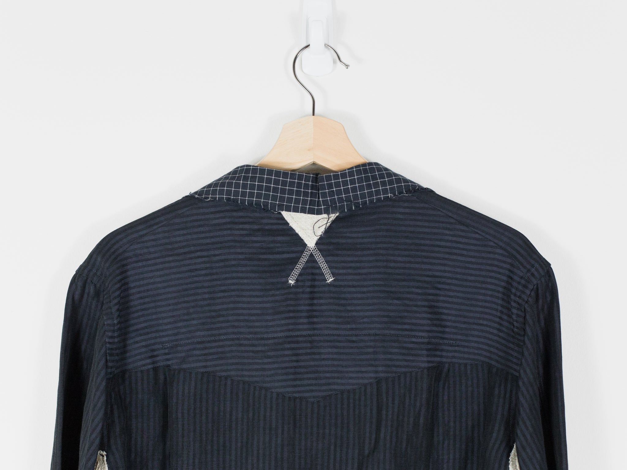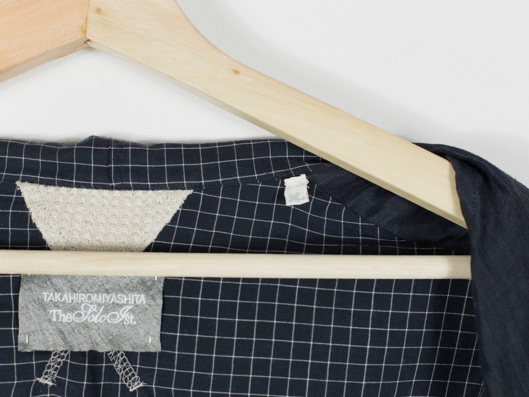 An early piece from Takahiro Miyashita's current project, the soloist. This is the renowned cowboy shirt, a piece that encapsulates a lot of the design ethos of this contemporary line--raw edges, intricate construction (with a double placket), contrast waffle paneling for comfort and mobility, mismatched buttons, and a well-travelled stylistic sensibility found in the color and pattern choice. This shirt is the perfect spring/summer toss on and go piece.