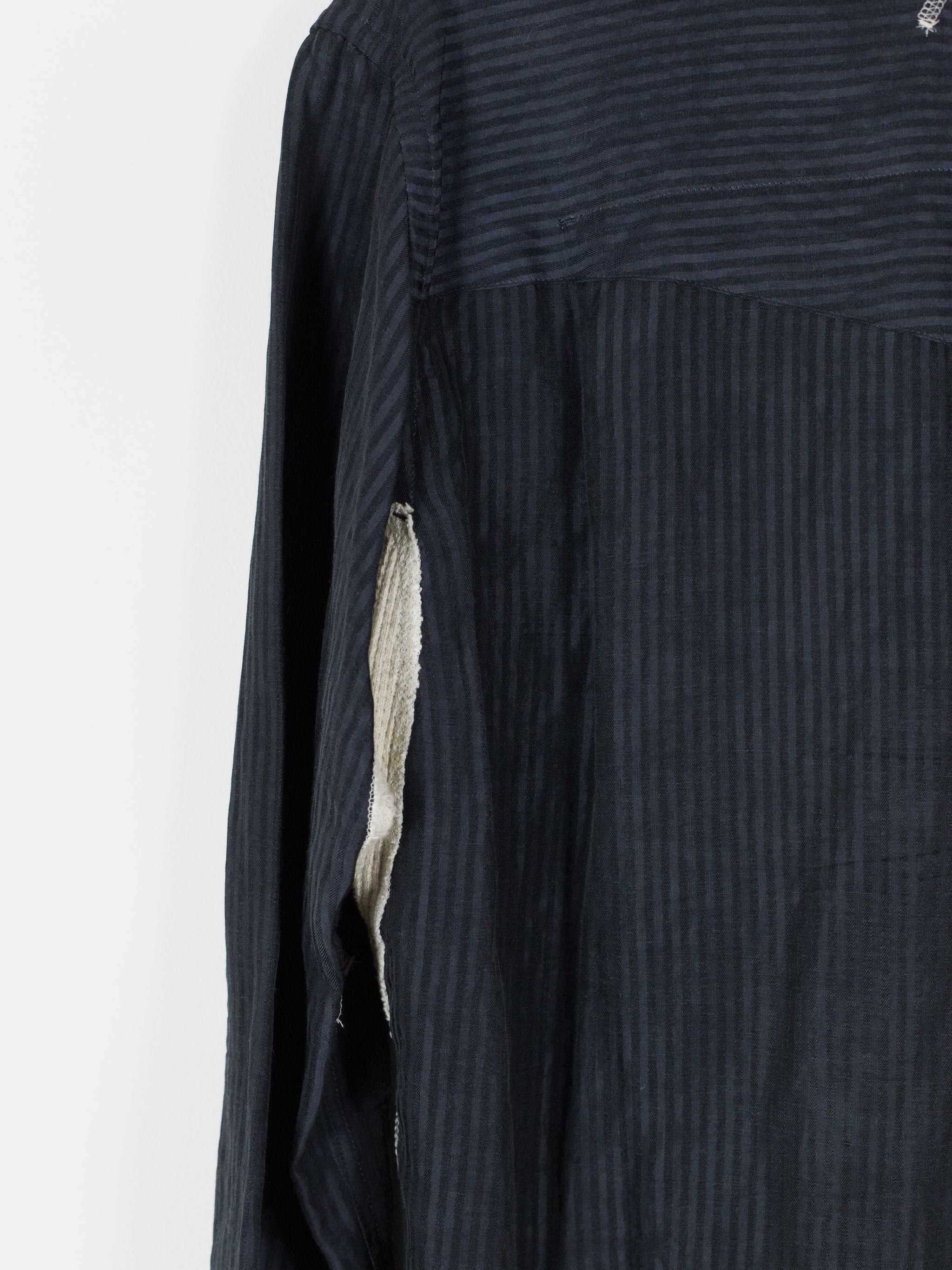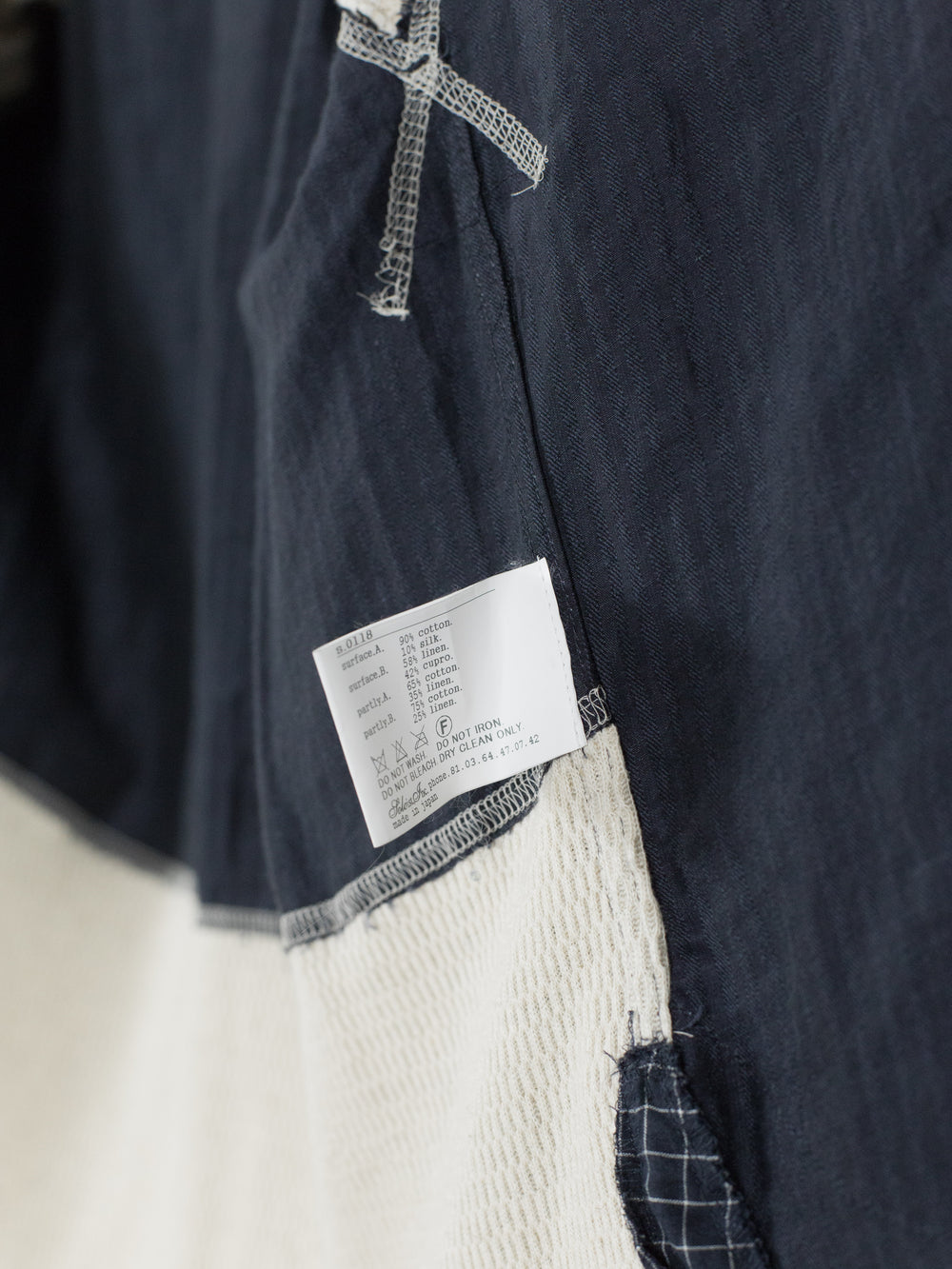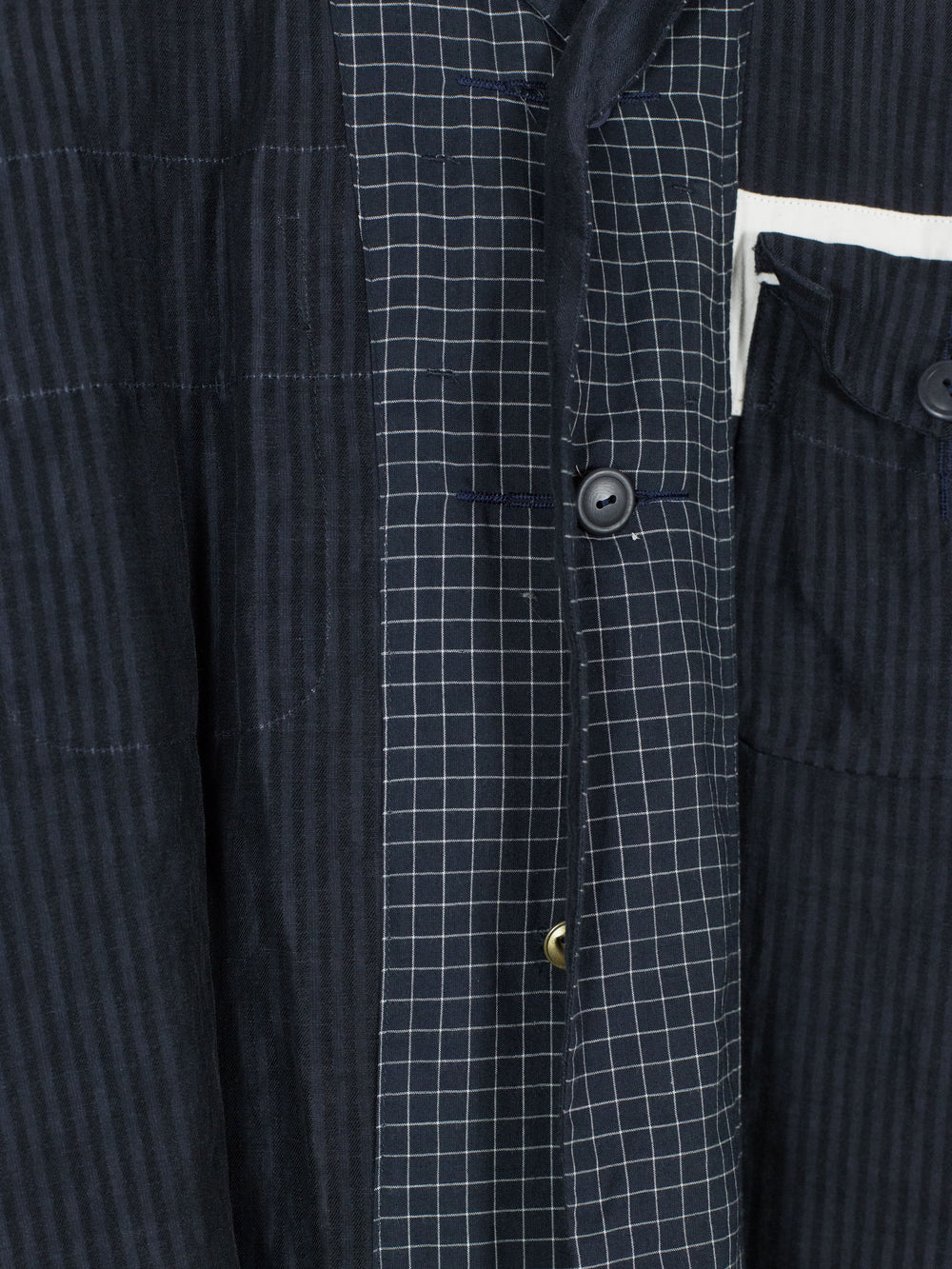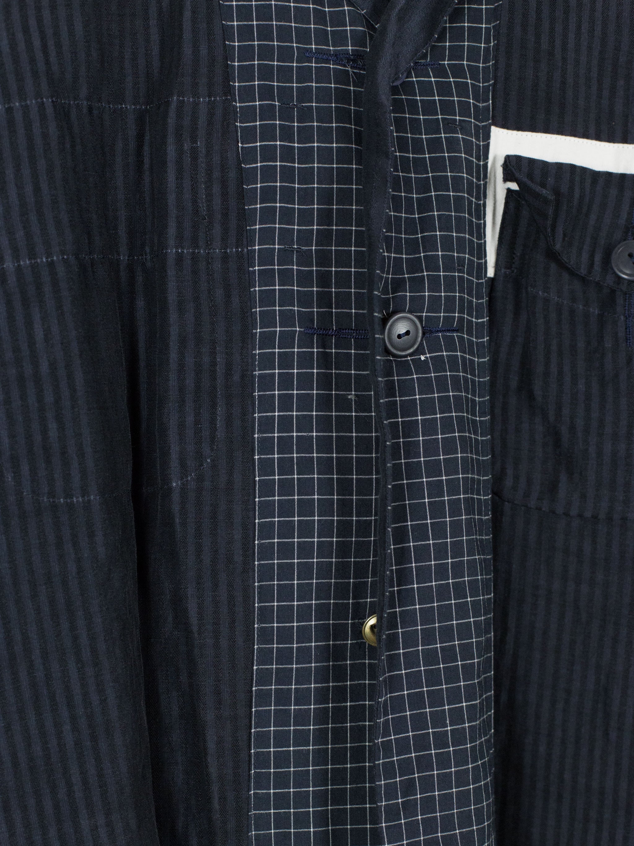 An early piece from Takahiro Miyashita's current project, the soloist. This is the renowned cowboy shirt, a piece that encapsulates a lot of the design ethos of this contemporary line--raw edges, intricate construction (with a double placket), contrast waffle paneling for comfort and mobility, mismatched buttons, and a well-travelled stylistic sensibility found in the color and pattern choice. This shirt is the perfect spring/summer toss on and go piece.