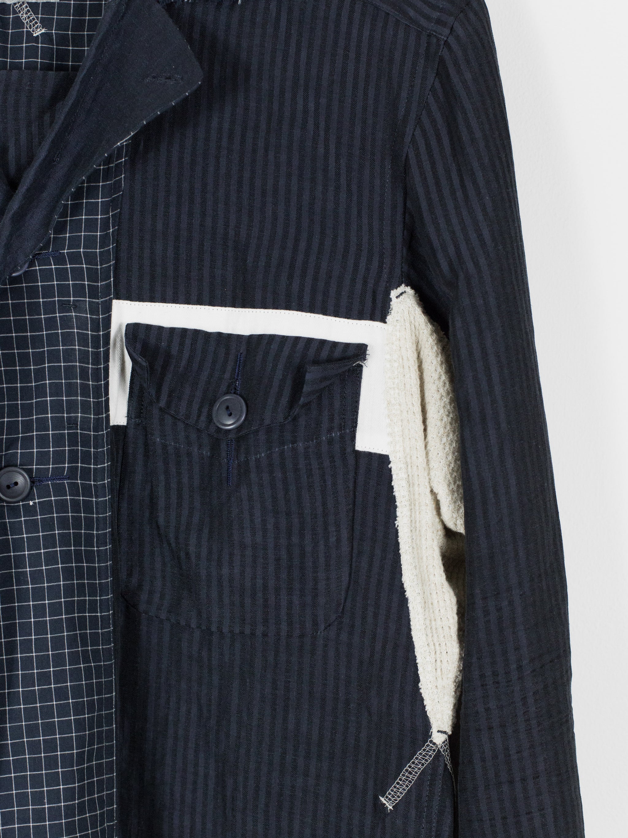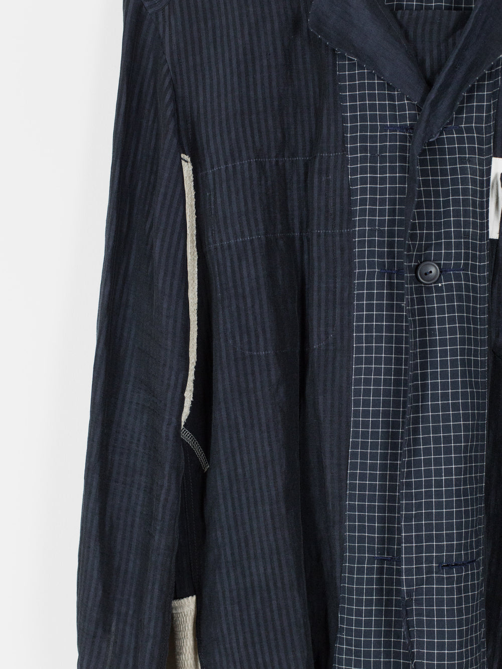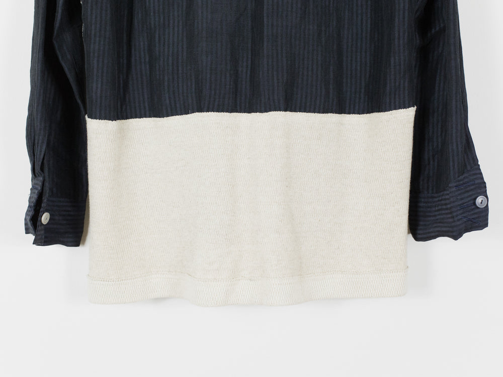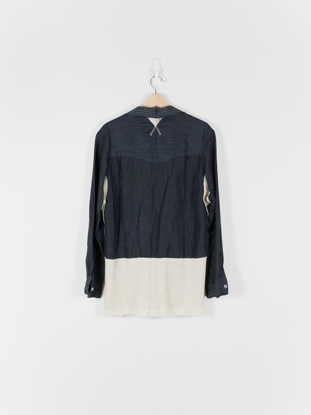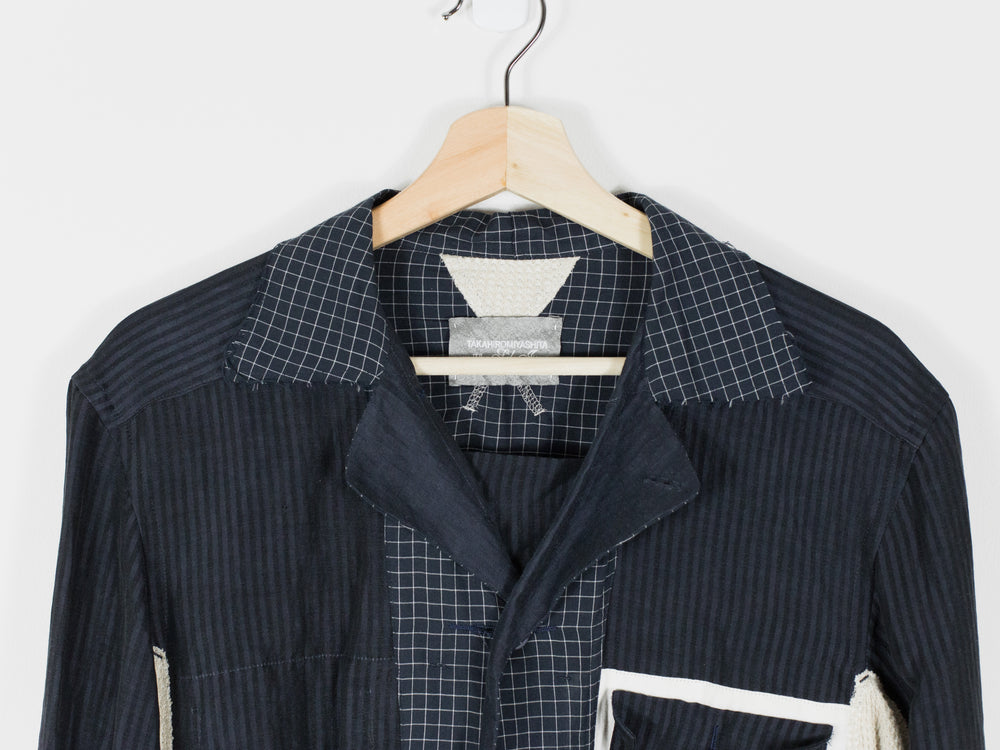 An early piece from Takahiro Miyashita's current project, the soloist. This is the renowned cowboy shirt, a piece that encapsulates a lot of the design ethos of this contemporary line--raw edges, intricate construction (with a double placket), contrast waffle paneling for comfort and mobility, mismatched buttons, and a well-travelled stylistic sensibility found in the color and pattern choice. This shirt is the perfect spring/summer toss on and go piece.