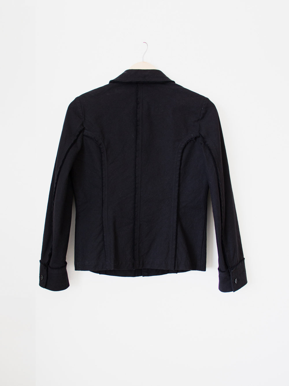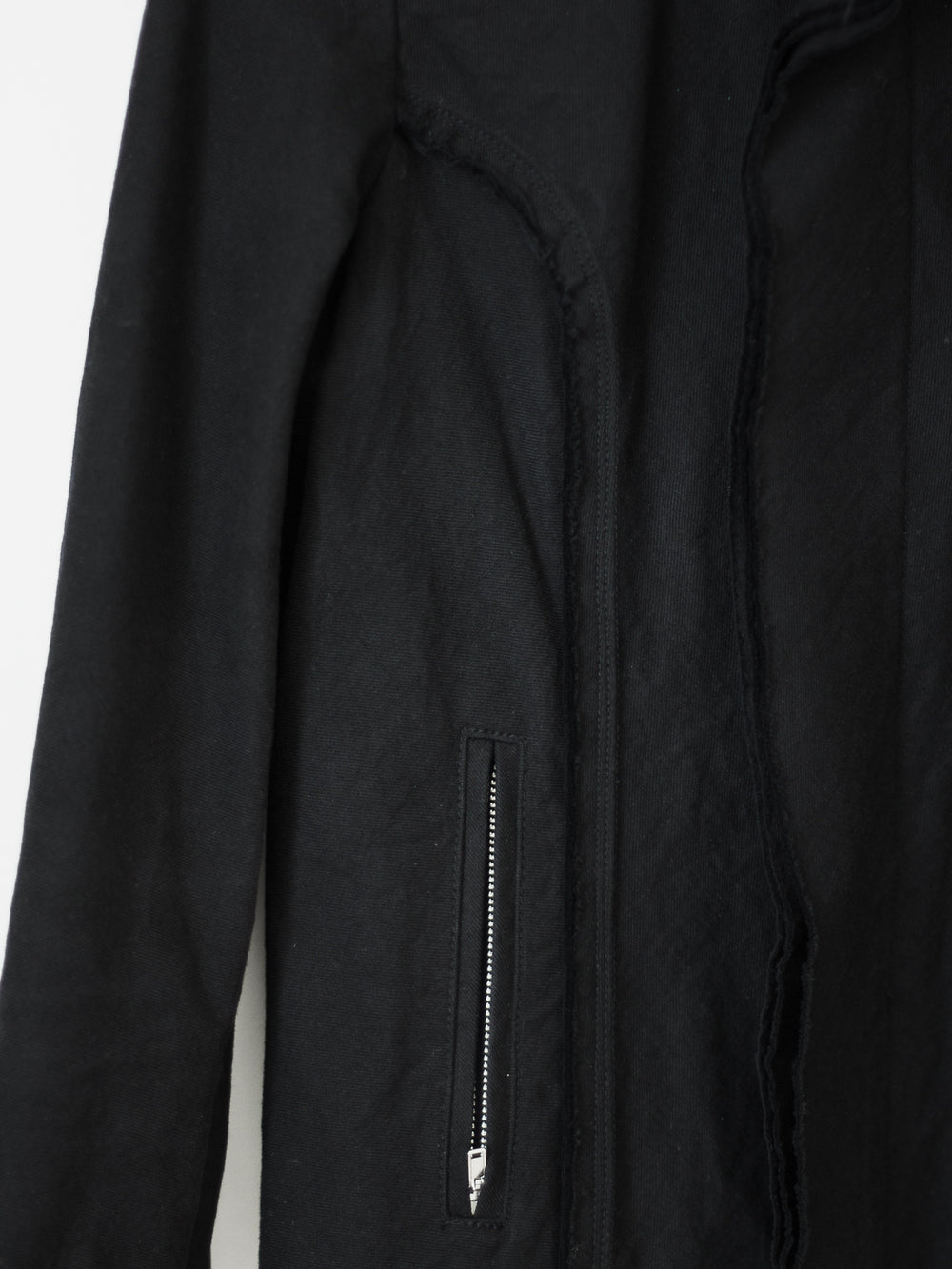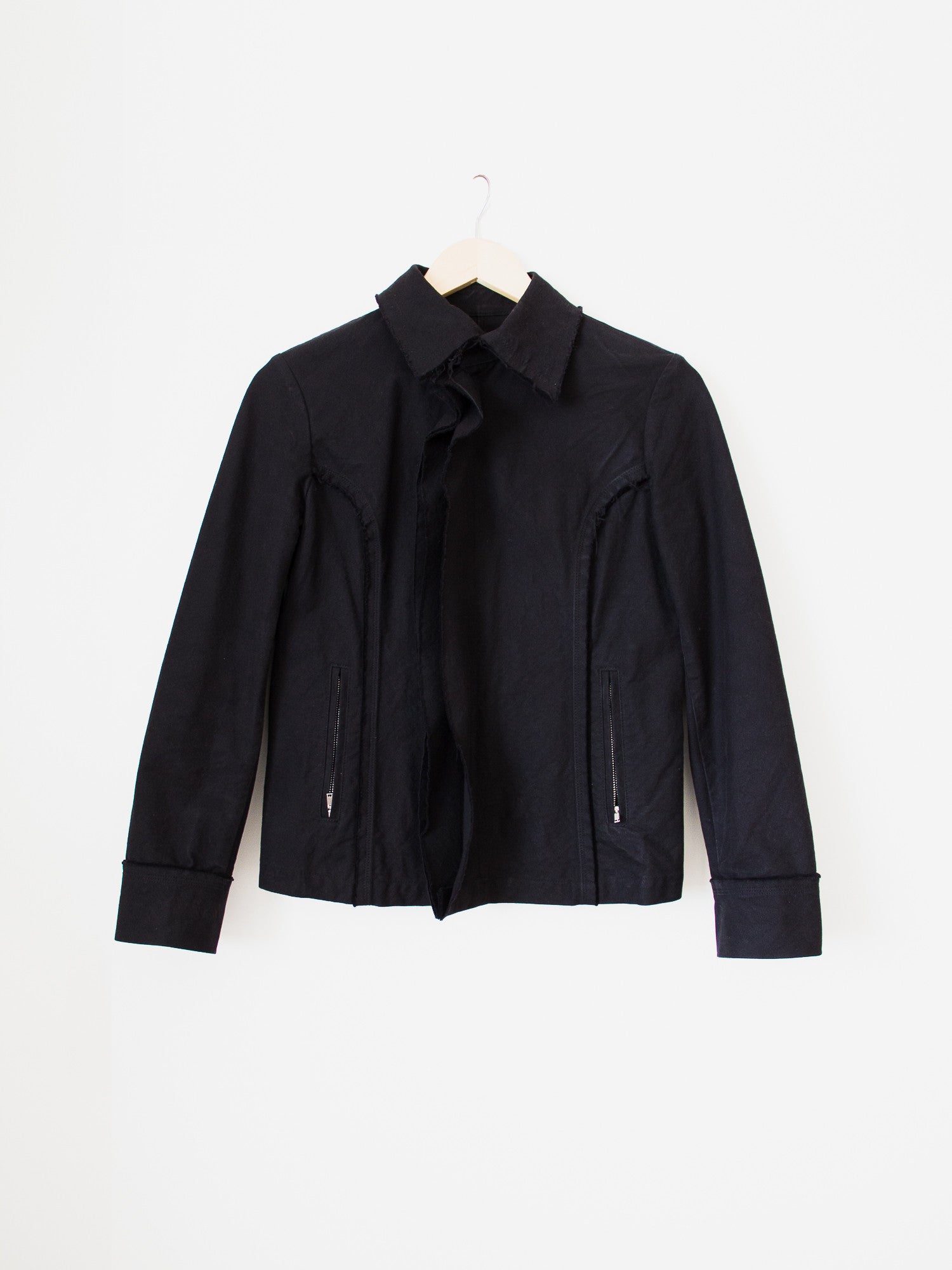 A structured canvas shield of a jacket, cut with raw curved panels that have the appearance of a futuristic chestplate. This piece fits sharp and elegant, and is a great one to throw on and go.