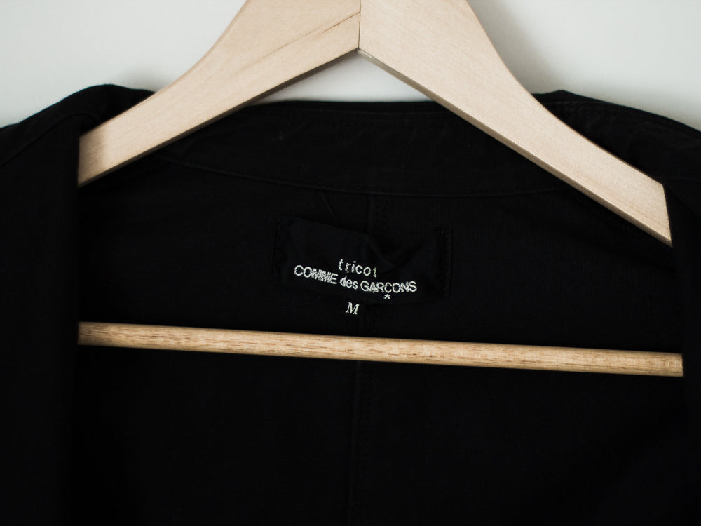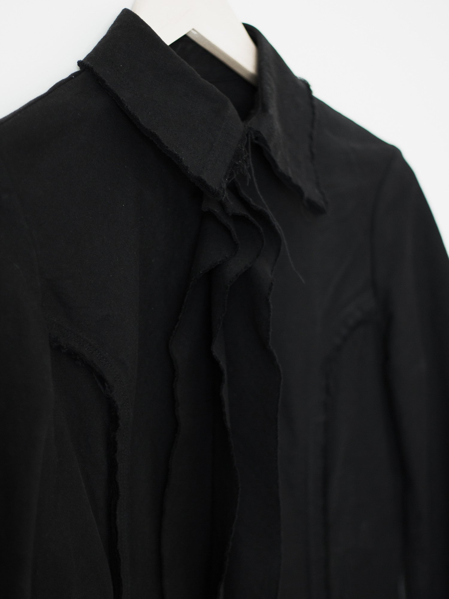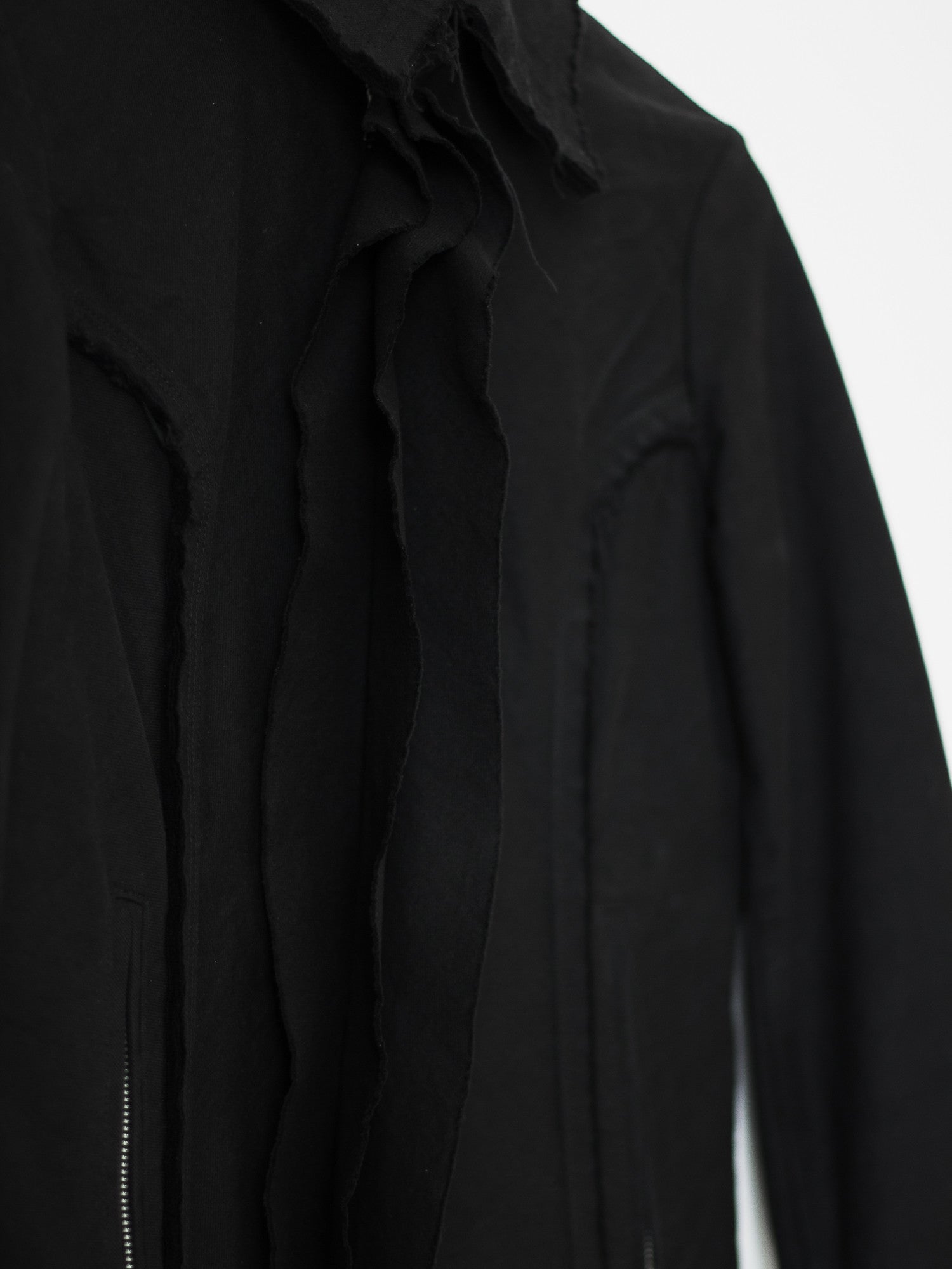 A structured canvas shield of a jacket, cut with raw curved panels that have the appearance of a futuristic chestplate. This piece fits sharp and elegant, and is a great one to throw on and go.