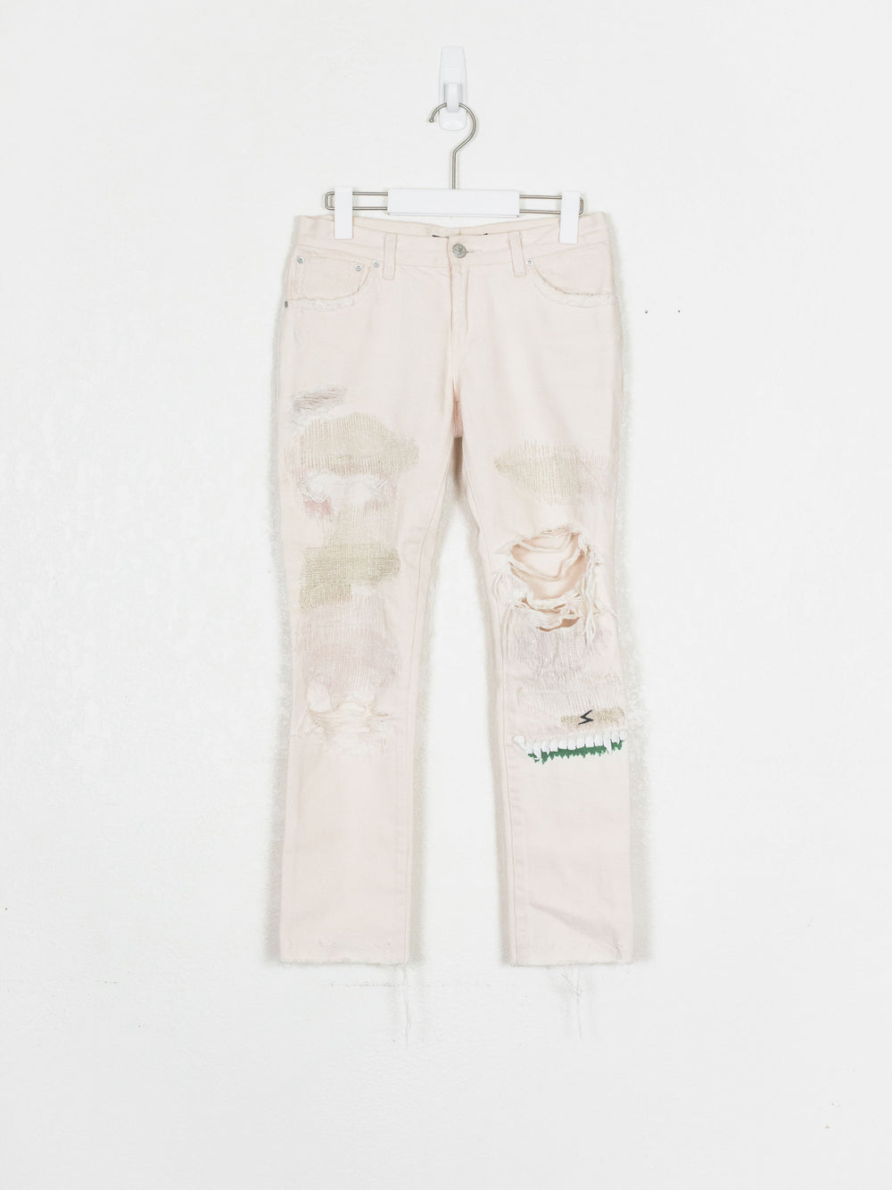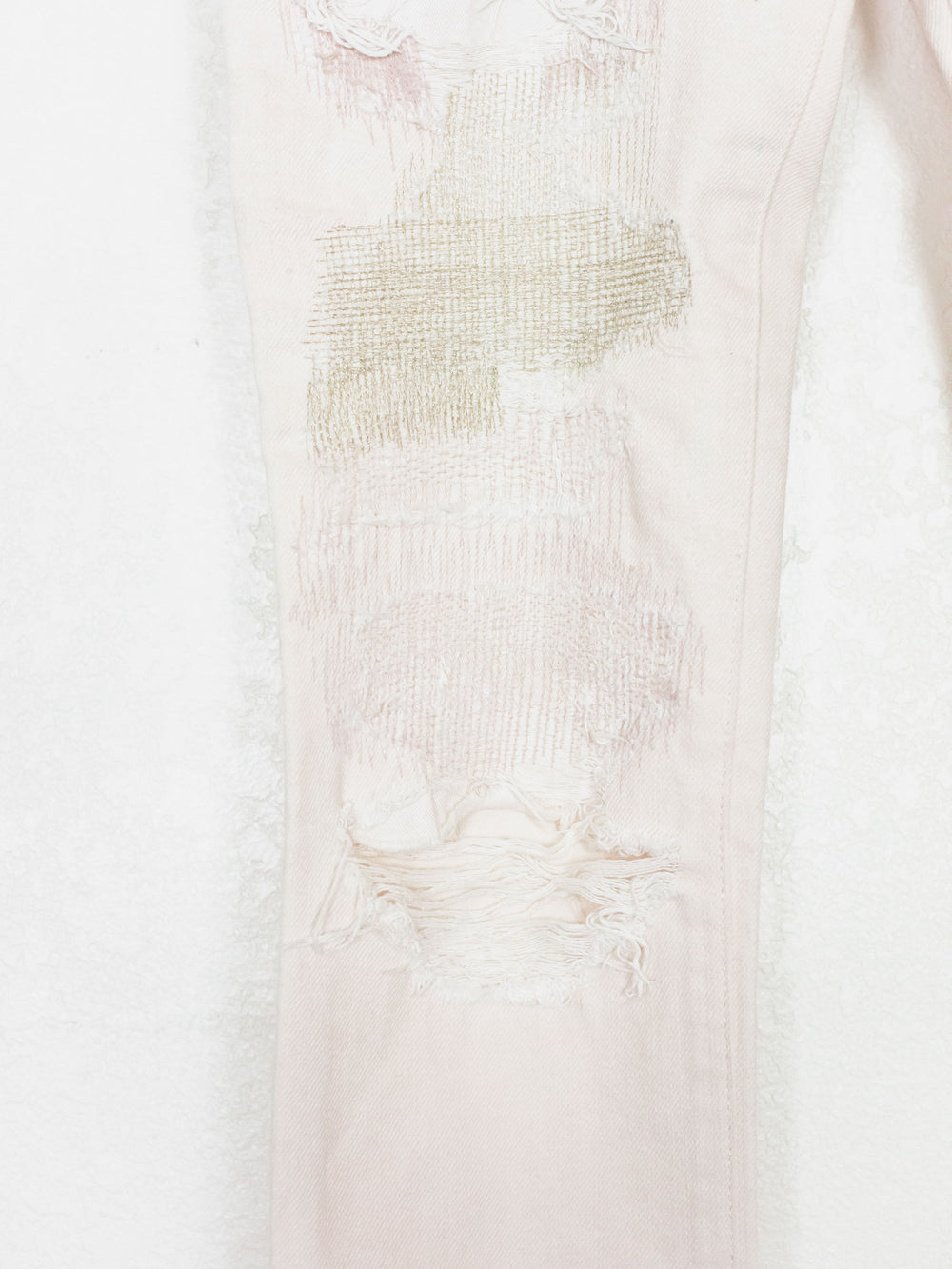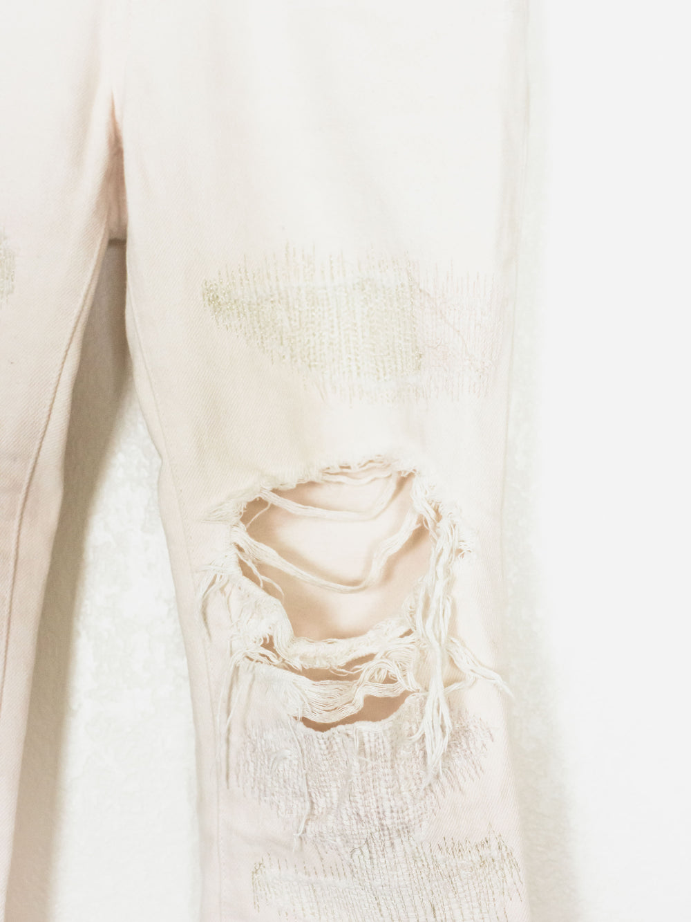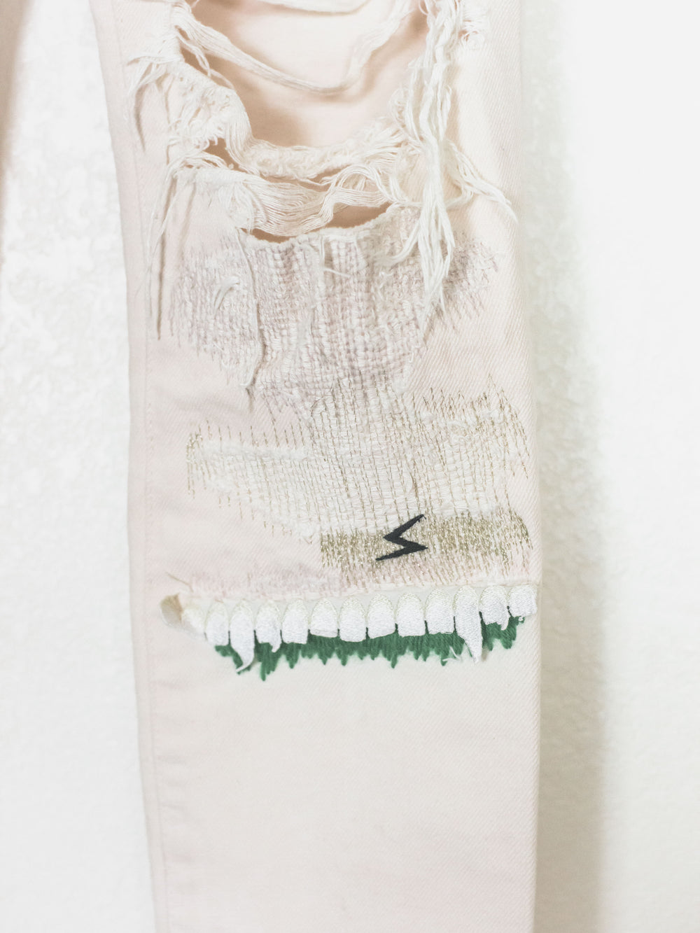 An incredible iteration of the famous 64 denim, loaded with details from the gold stitching over a beautiful cream denim highlighting the carefully considered distressing, to the monster teeth patch detail as part of the "But Beautiful" series of non traditional beauty.
