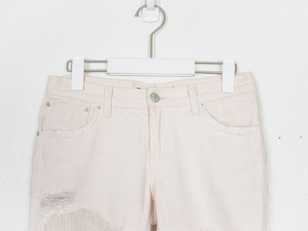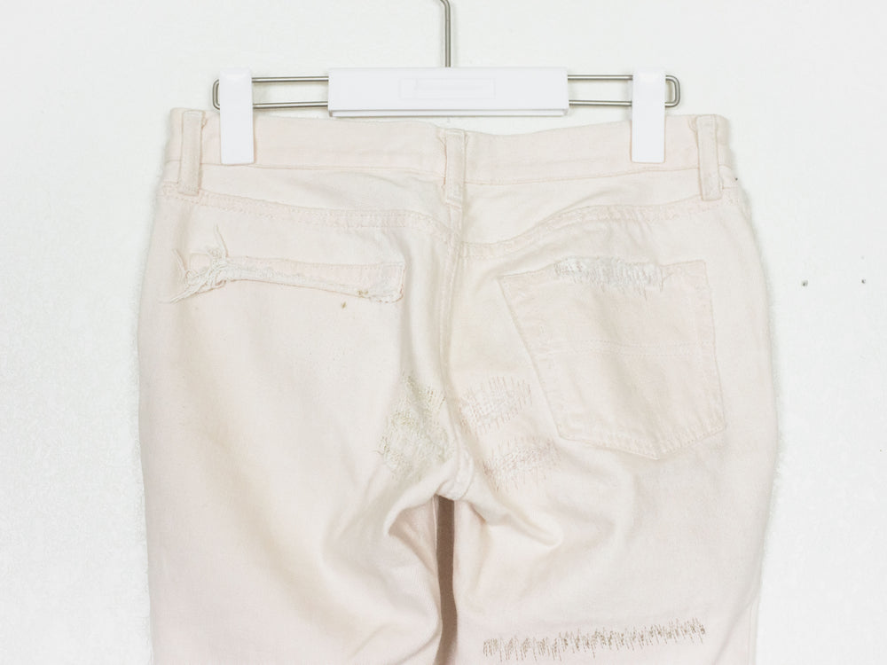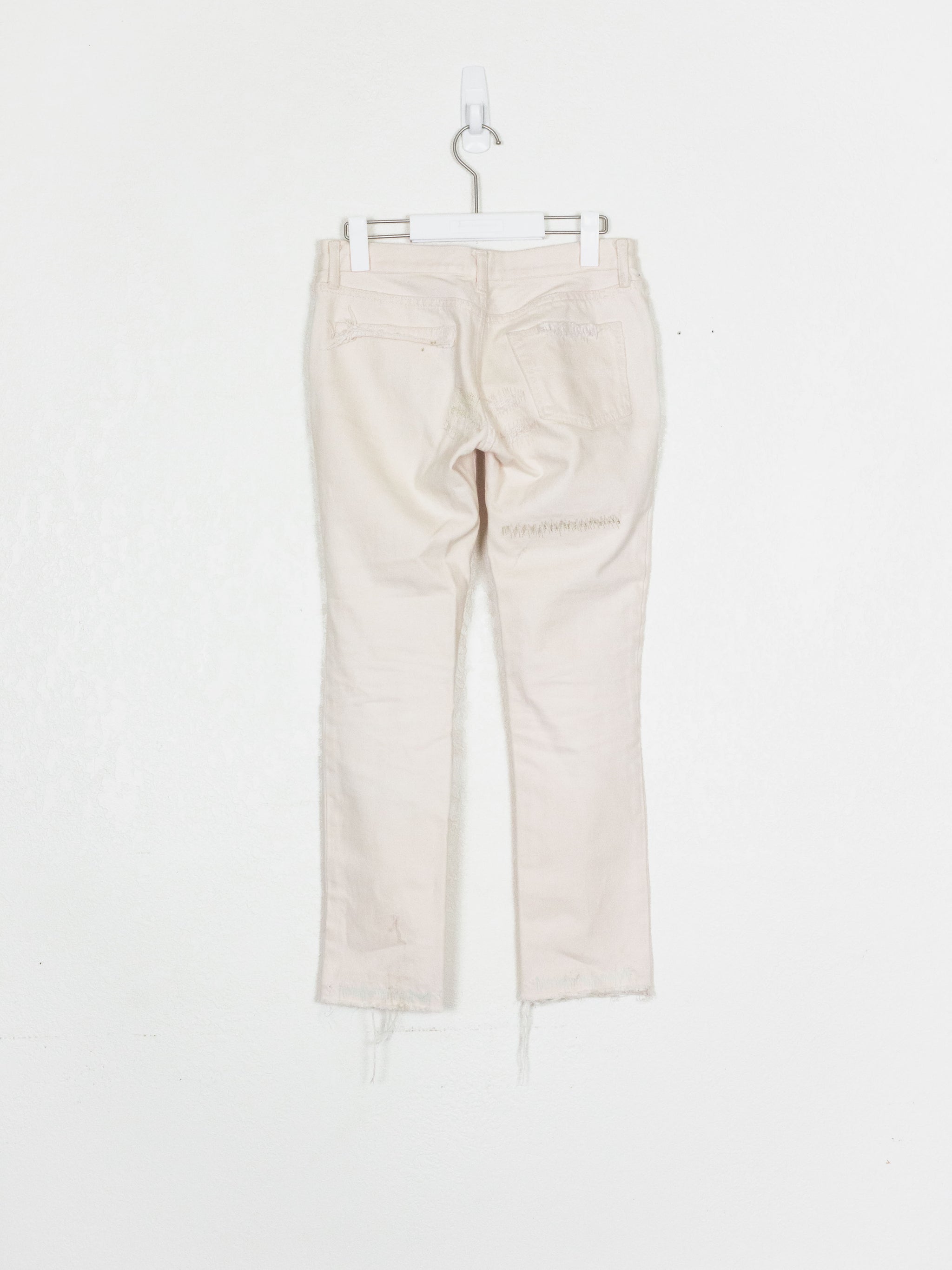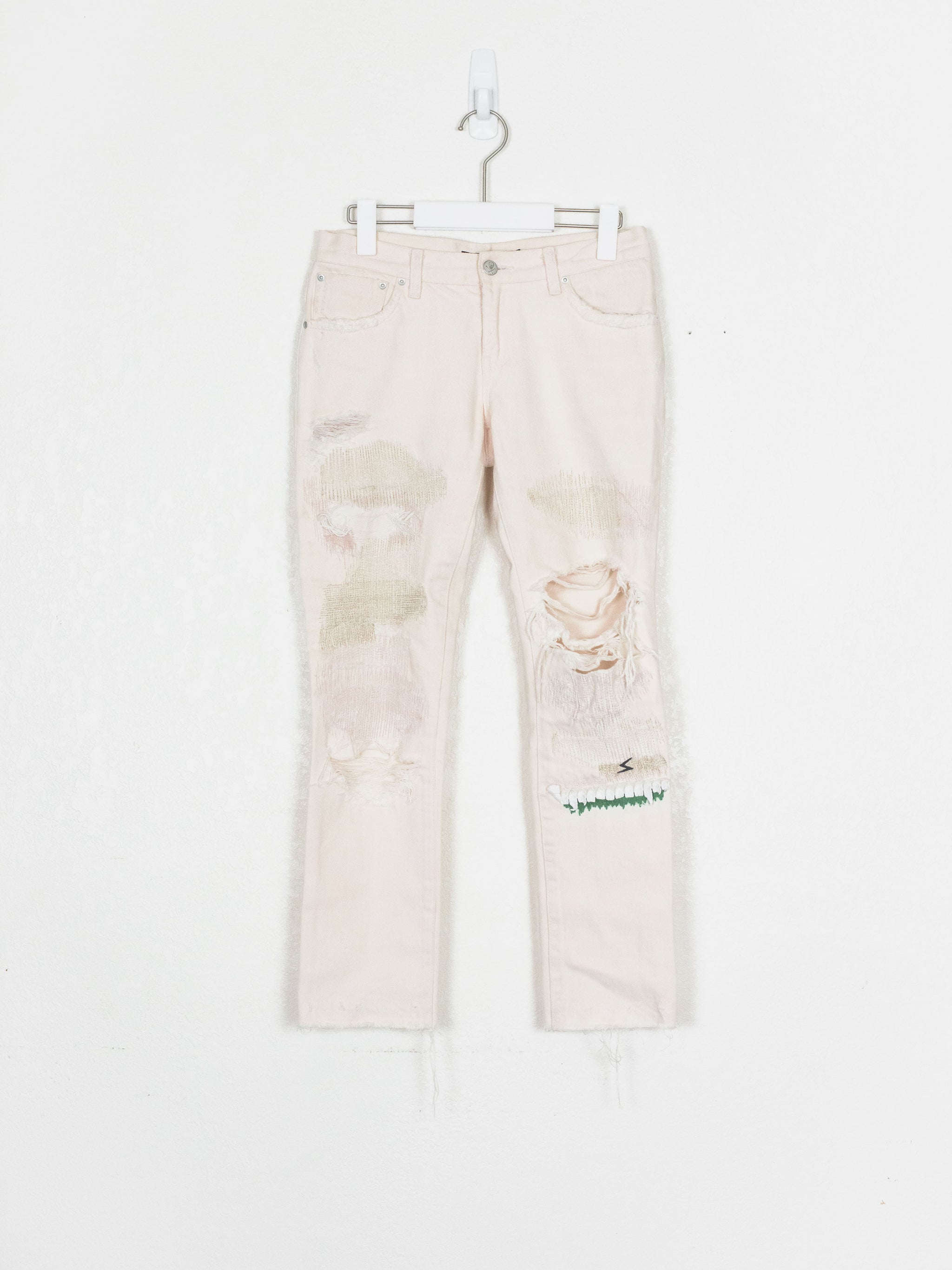 An incredible iteration of the famous 64 denim, loaded with details from the gold stitching over a beautiful cream denim highlighting the carefully considered distressing, to the monster teeth patch detail as part of the "But Beautiful" series of non traditional beauty.