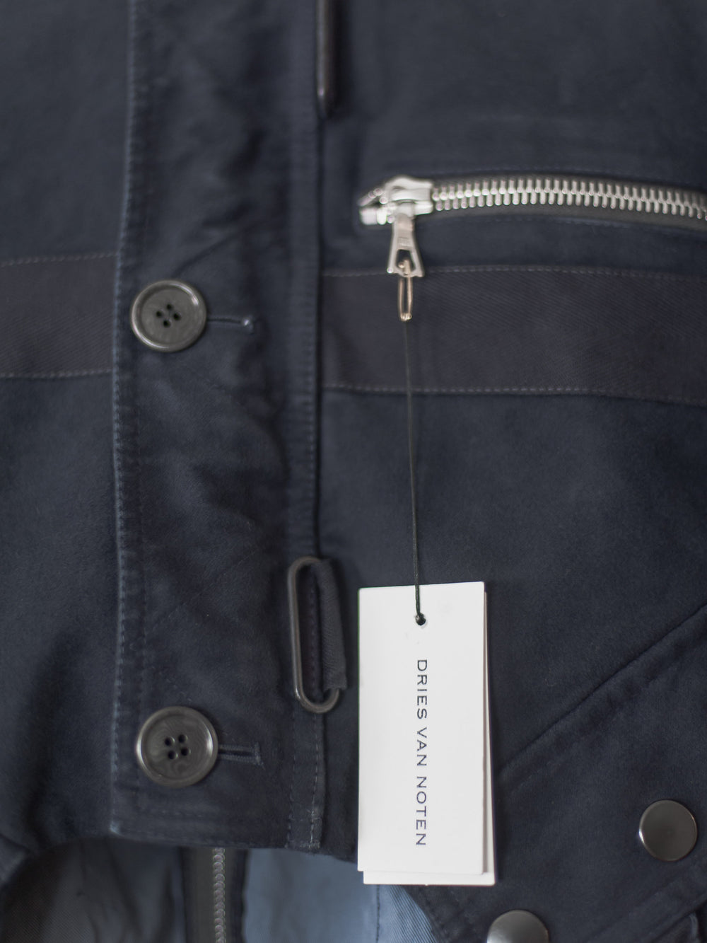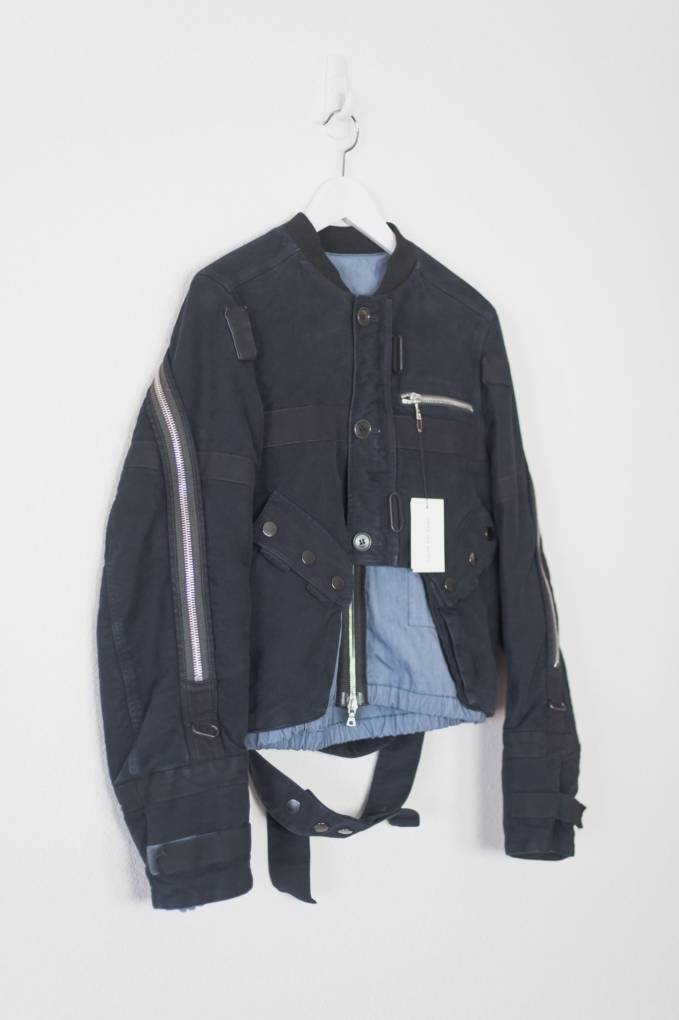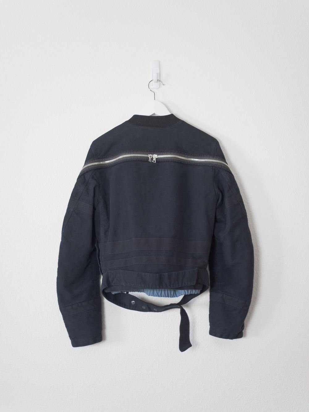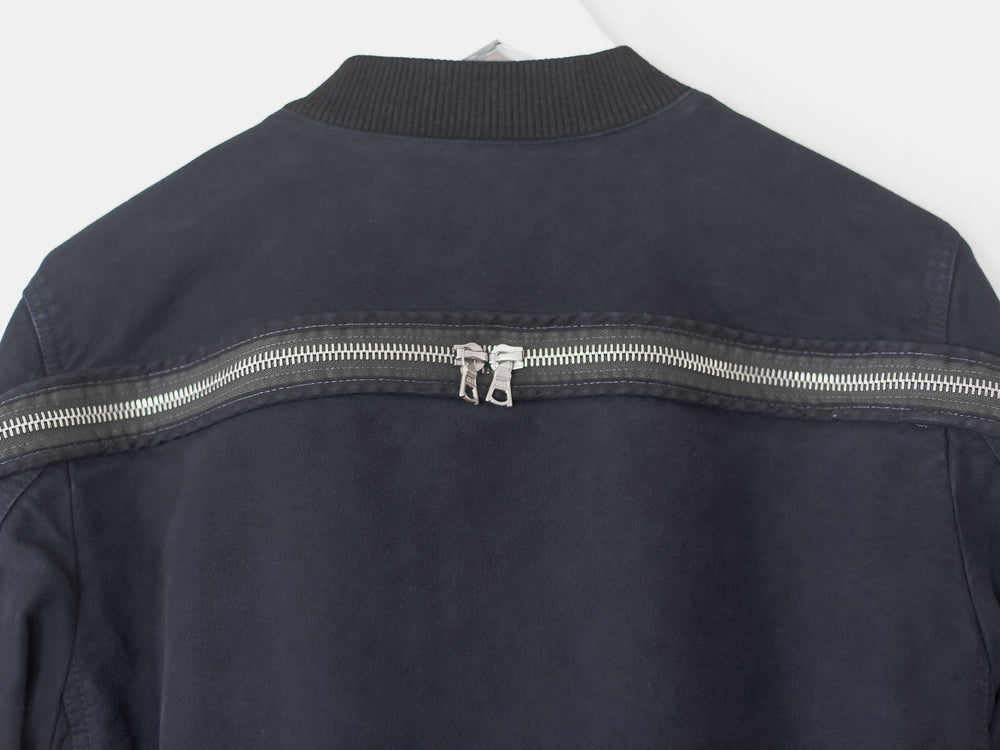 The coolest bomber you can buy and way more details than the one A$AP wore. Very hefty and intricate construction with a dark navy moleskin cotton outer and extremely smooth Riri zips all around. Other details include metal snaps and loops, canvas strap detailing, contrast lining, internal chest pocket, and double main & back zips. 10/10 condition new with tags. Retailed for $1600.