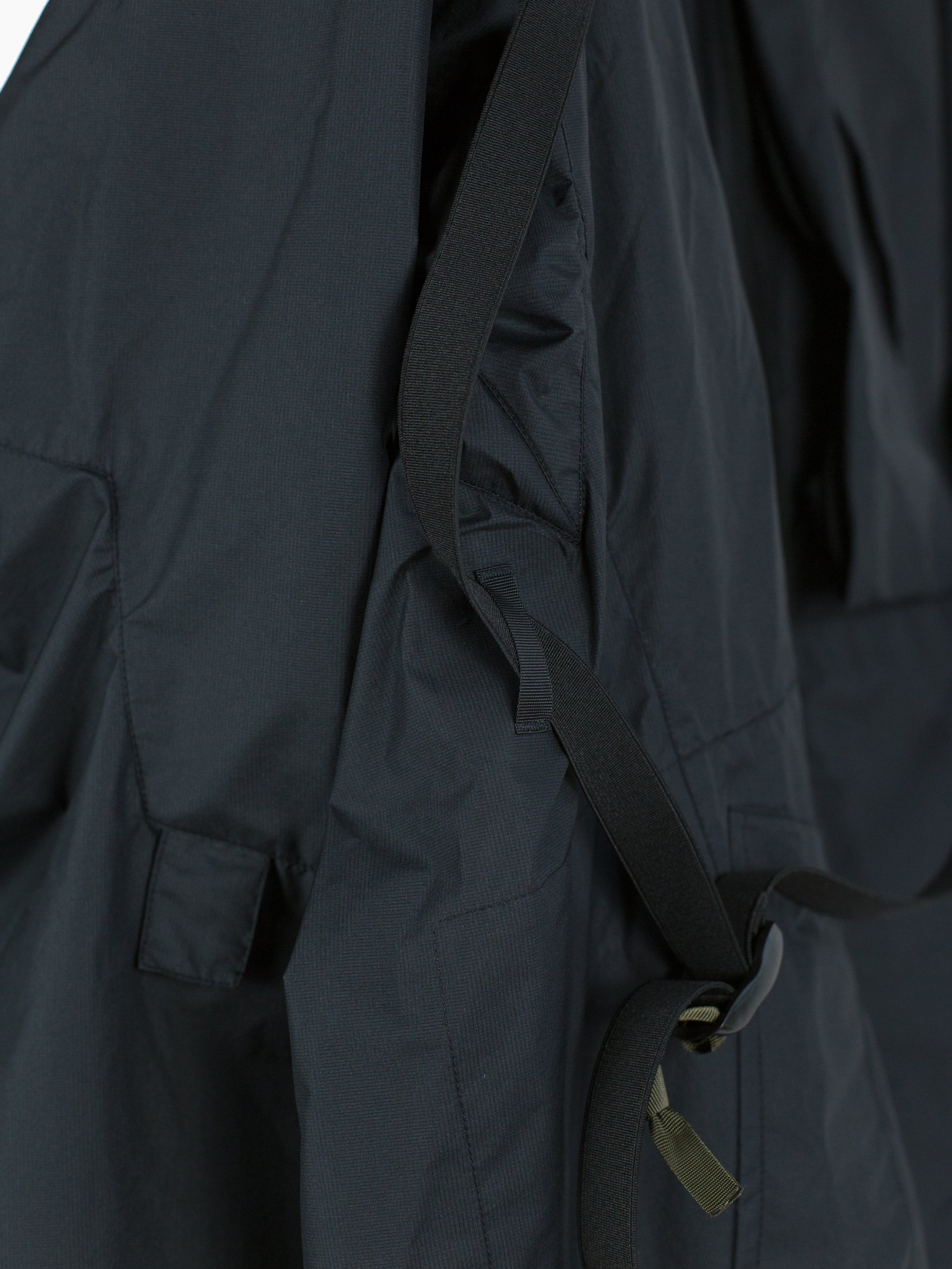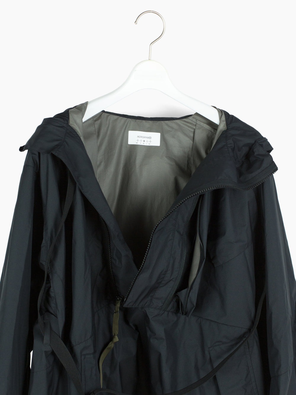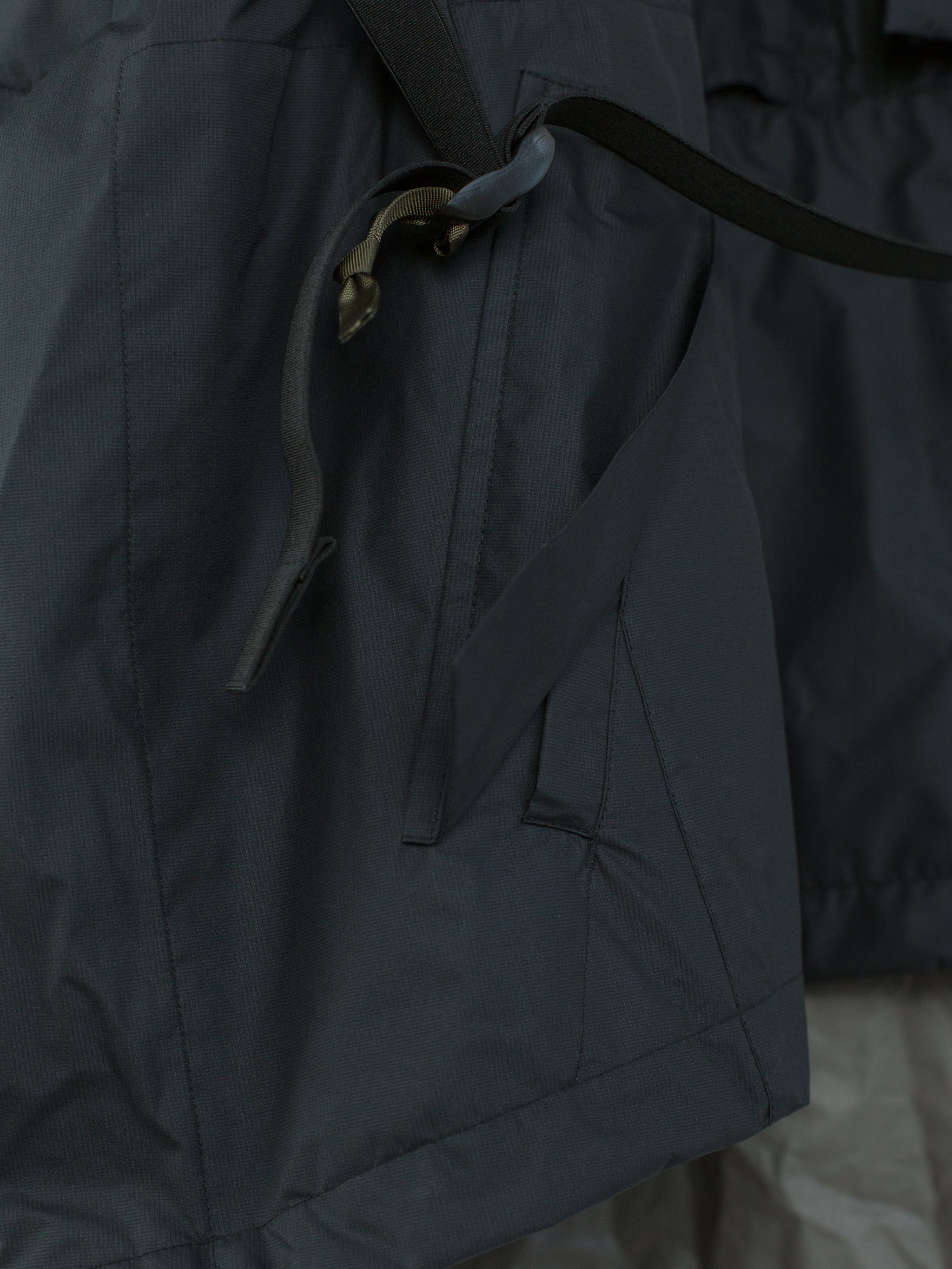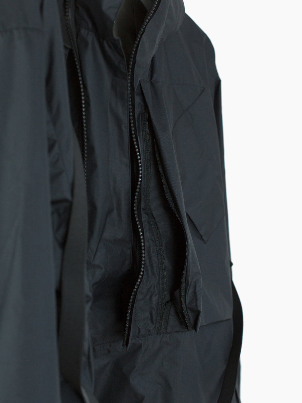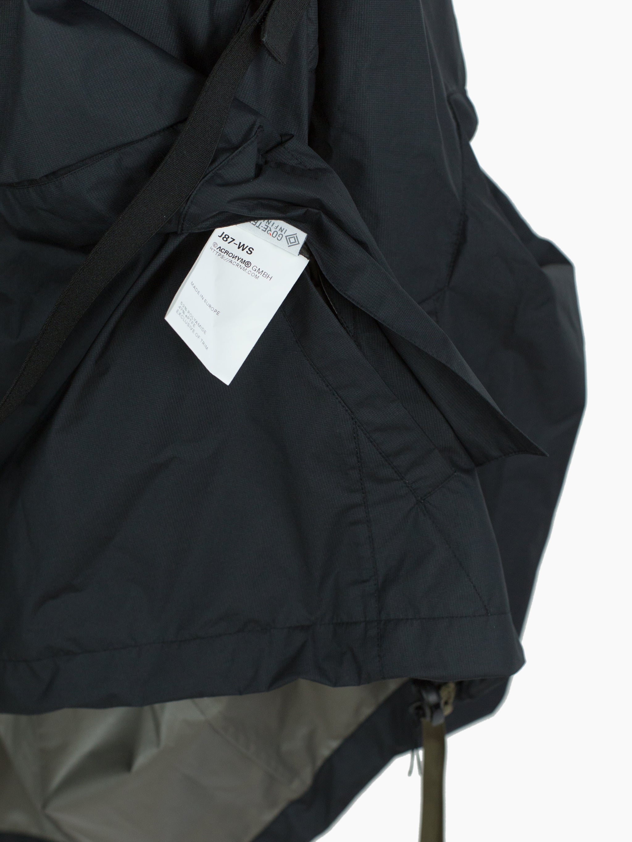 Balenciaga Cocoon back meets early Rick Owens sculpted 3D hem meets Acronym technicality. High fashion sculptural becomes urban functional as a quadruple-pleated back adopts the role of an expandable backpack cover. Cinched hem dials in coverage...or leave it loose to create a dynamic, fin-like silhouette. New Acronym use cases drive new Acronym feature evolution, with a separate set of grosgrain attachment loops allowing for frontal jacketsling mounting.