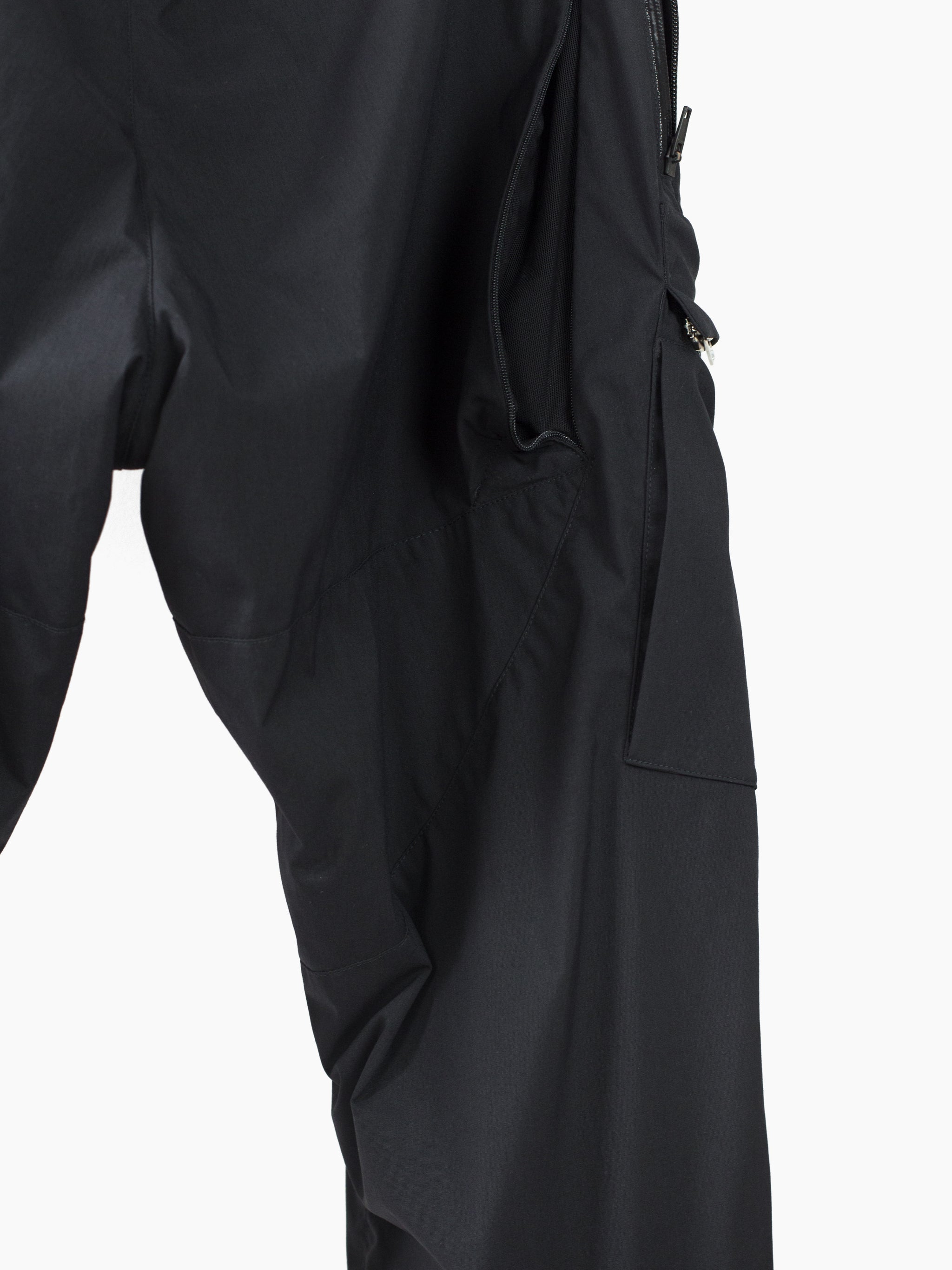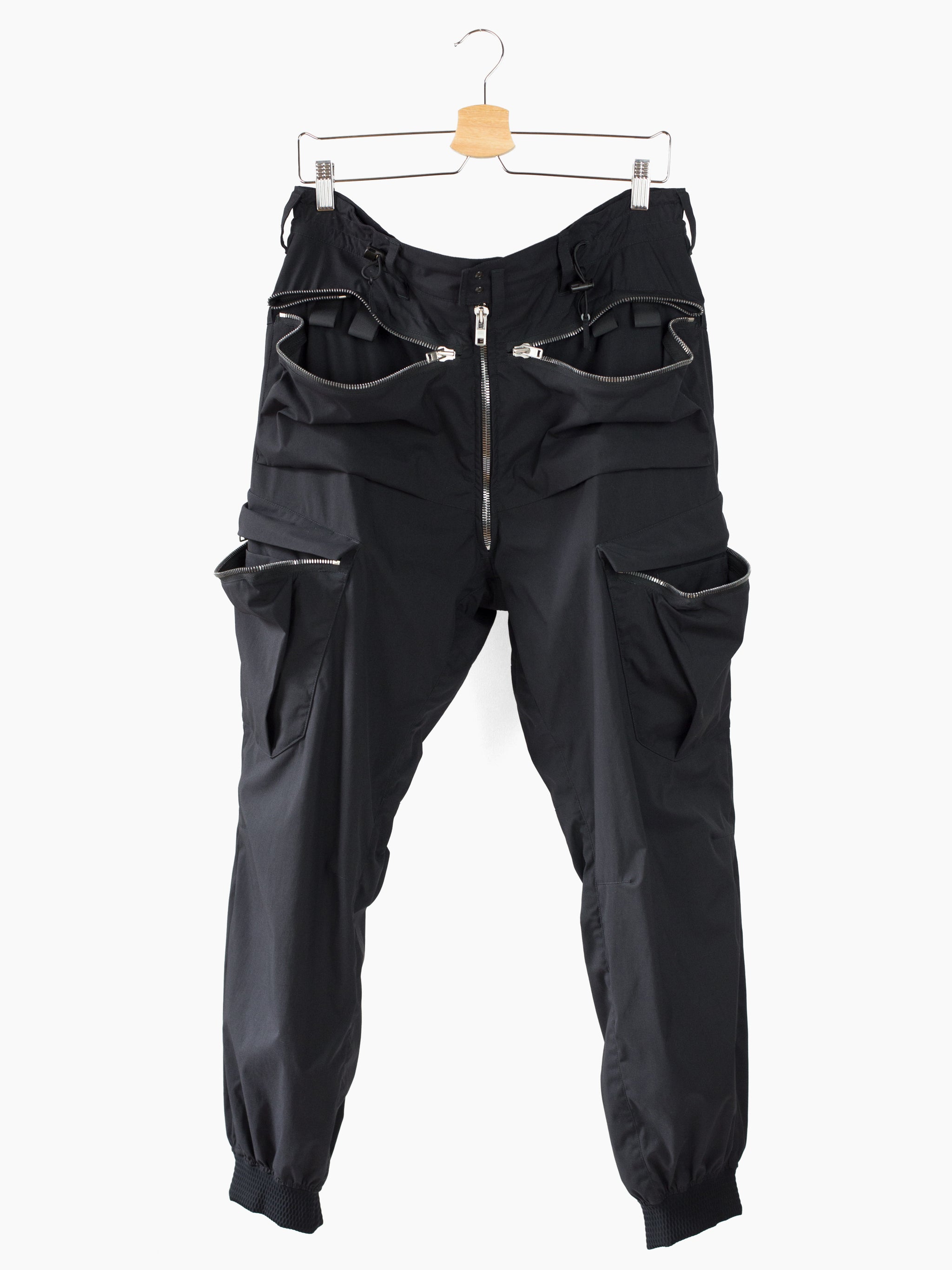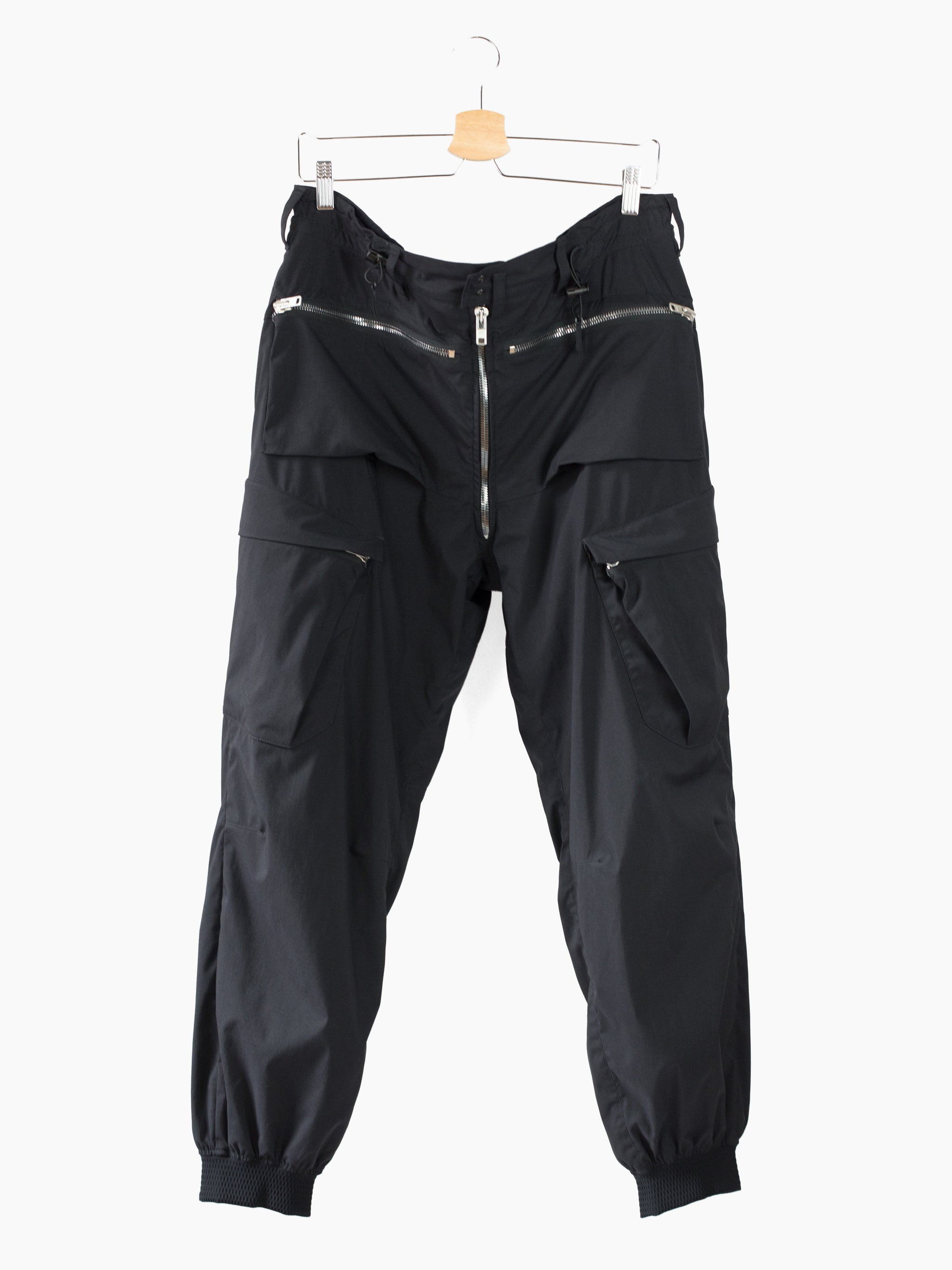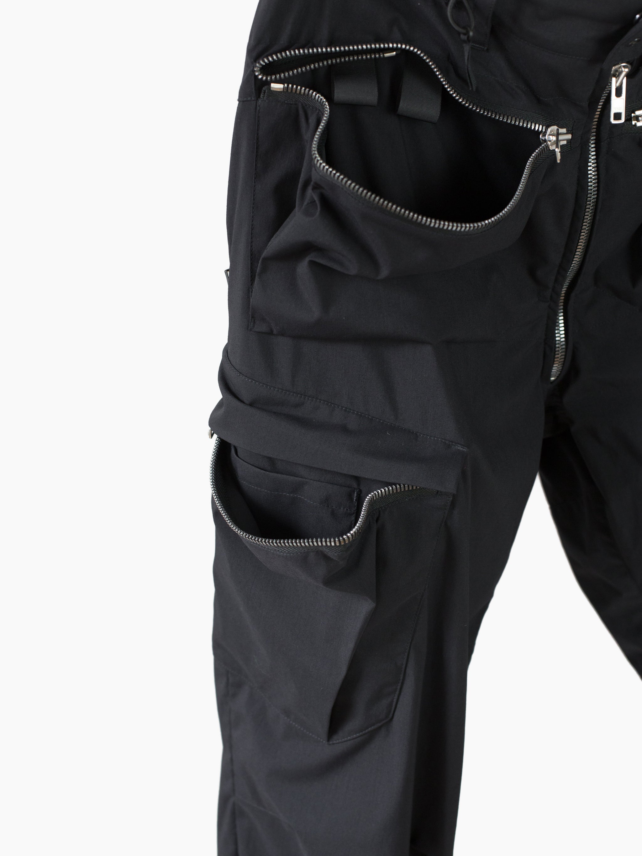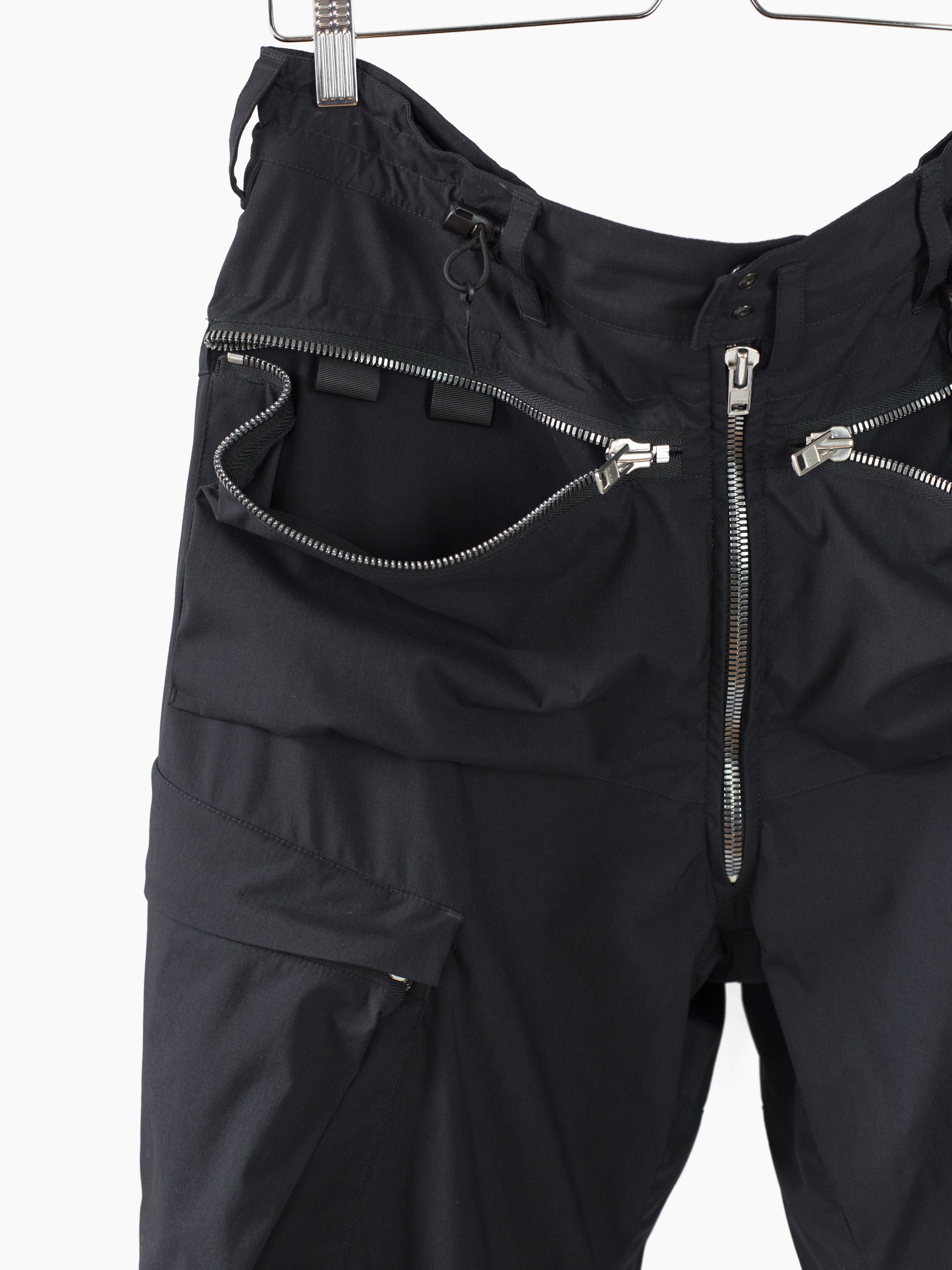 Finished with reverse double snapped waist closure and oversize exposed center front zip fly, shockcord cinch at the waist, canted thigh cargo pockets with phone sleeves, and locking coil zipper openable hem. Watertight side pockets with deep pockets side besides invisible zippered mesh vents at the lateral seat.
