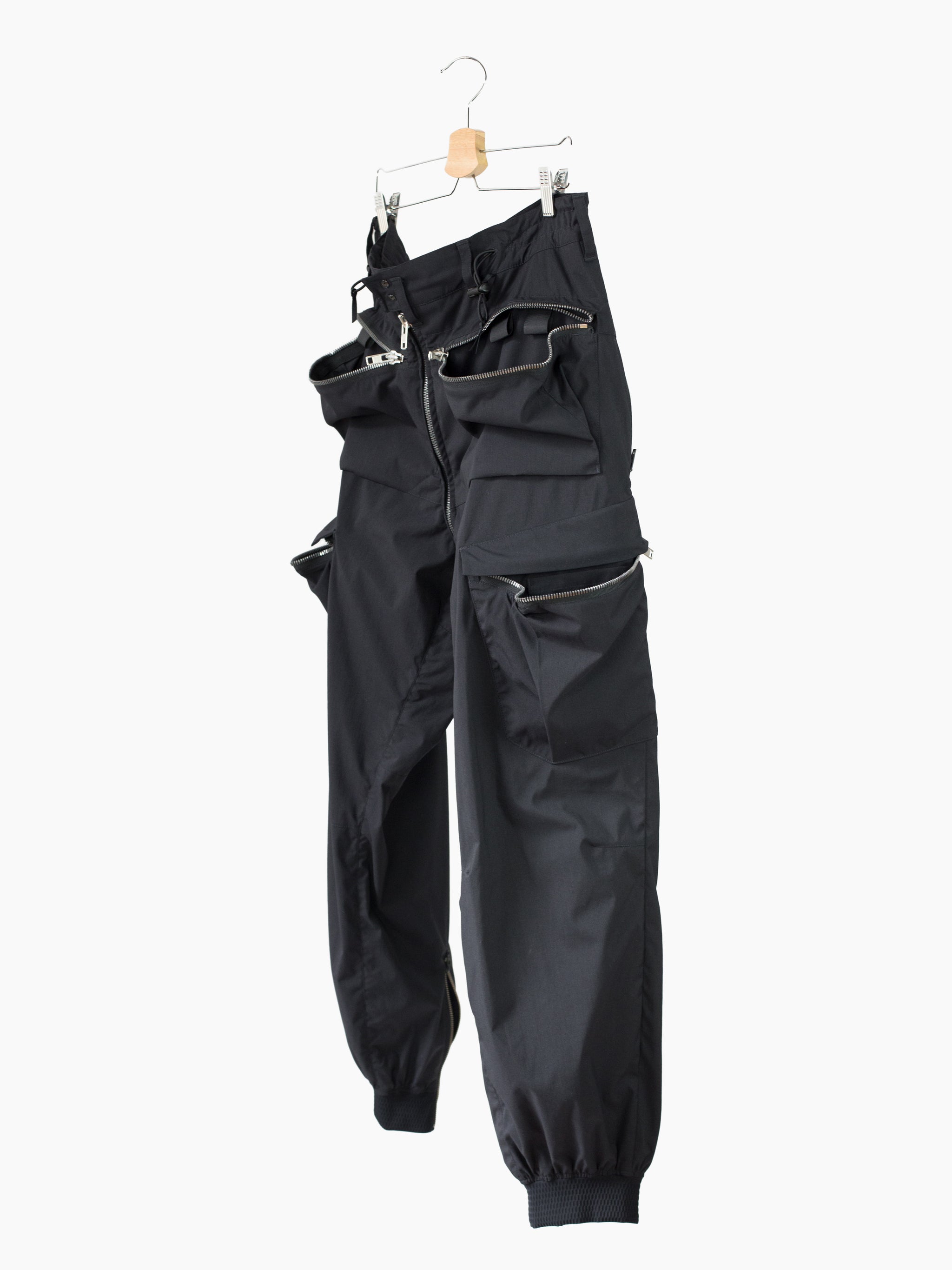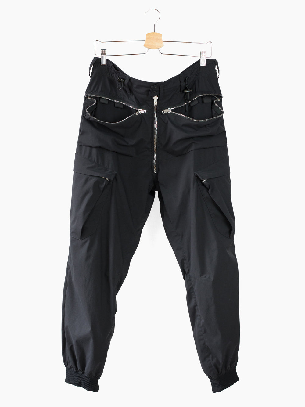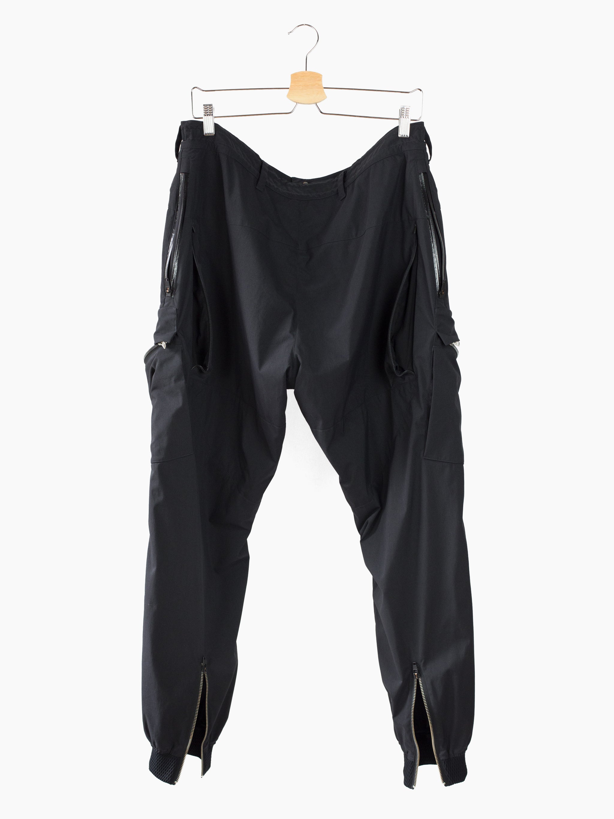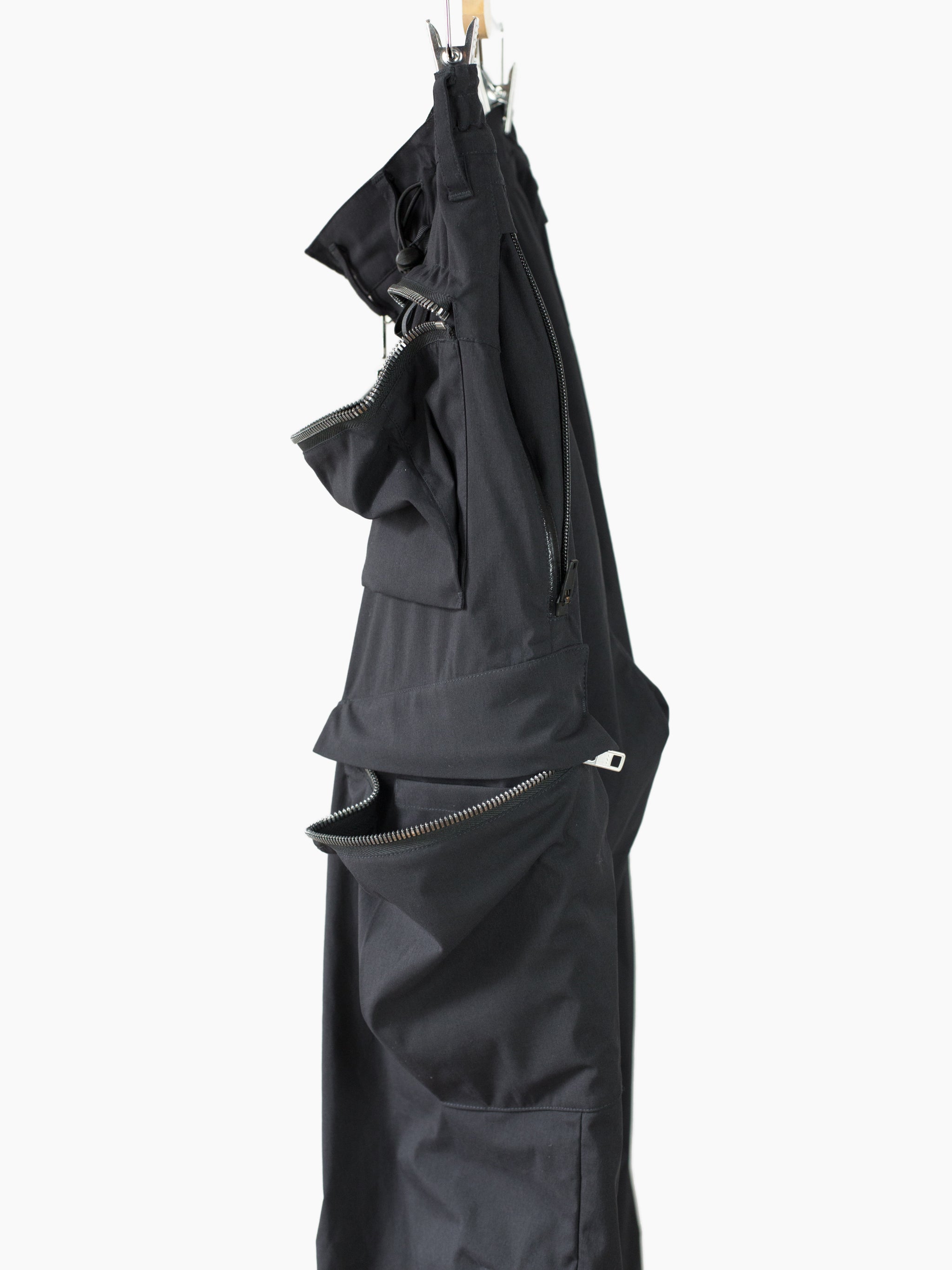 Finished with reverse double snapped waist closure and oversize exposed center front zip fly, shockcord cinch at the waist, canted thigh cargo pockets with phone sleeves, and locking coil zipper openable hem. Watertight side pockets with deep pockets side besides invisible zippered mesh vents at the lateral seat.