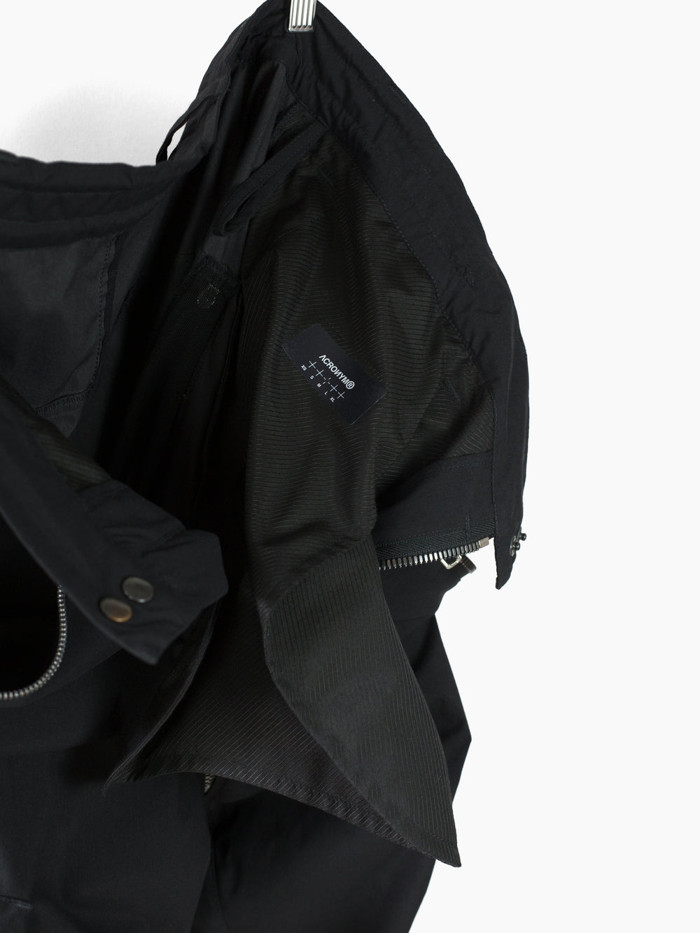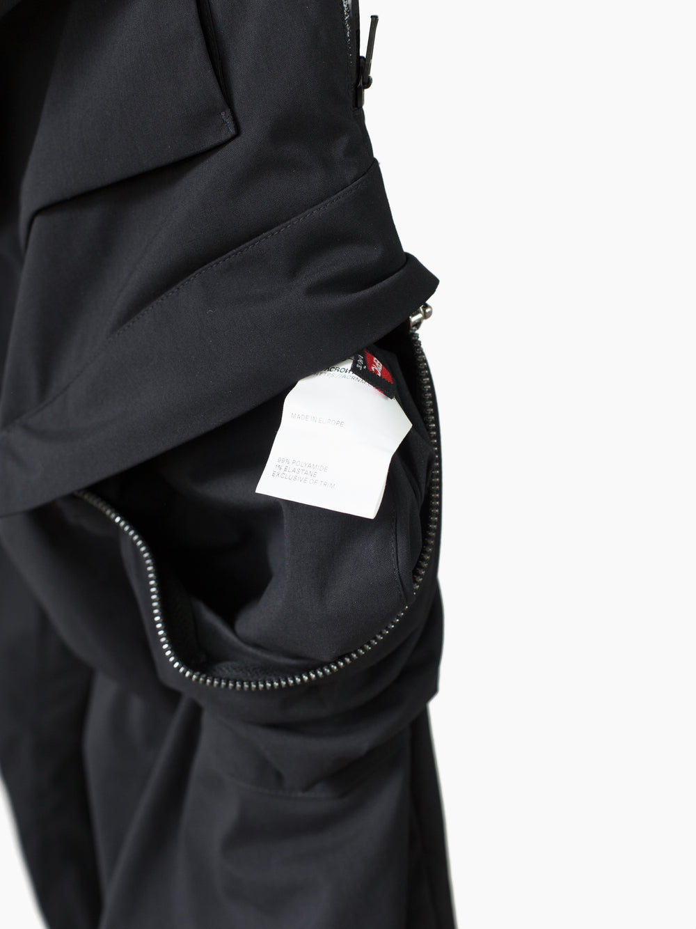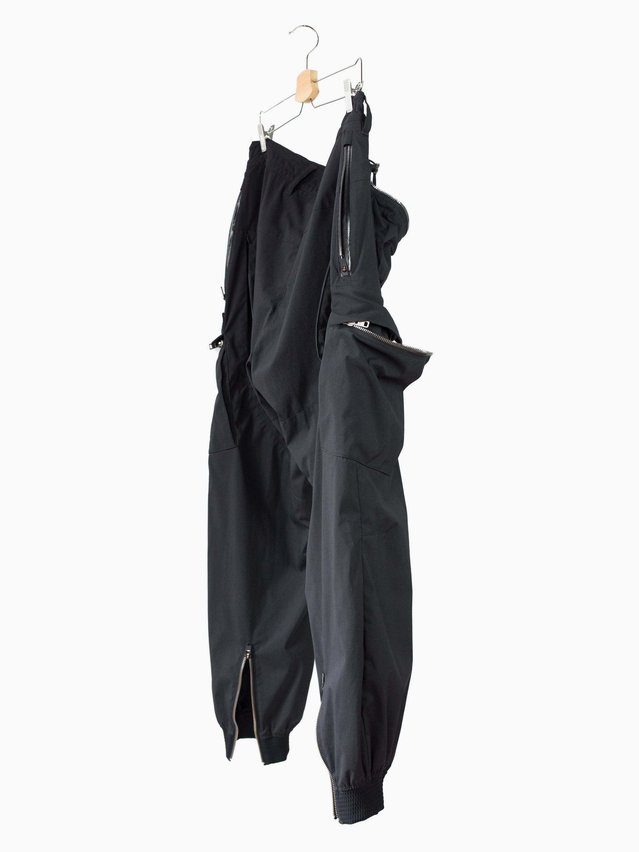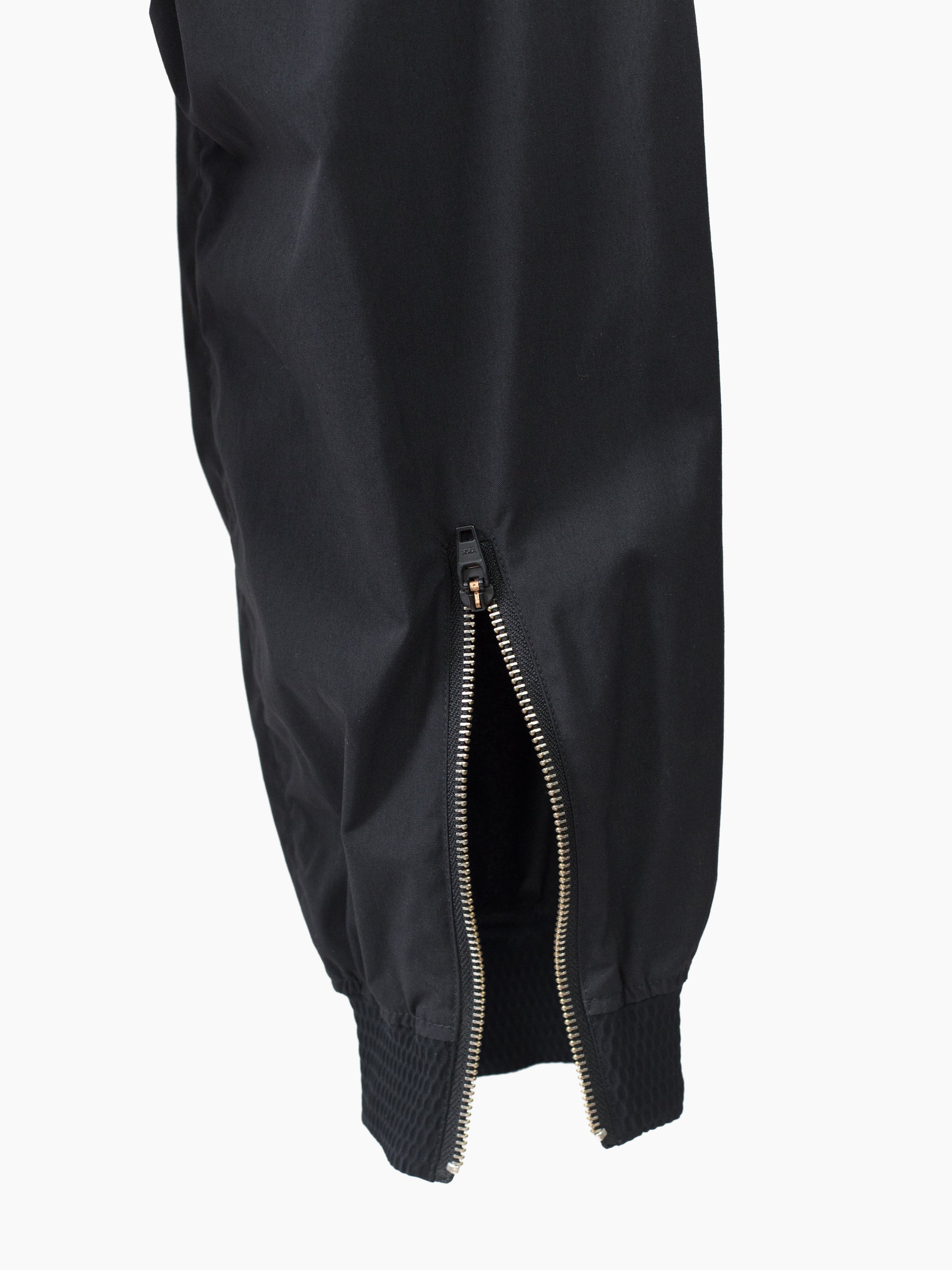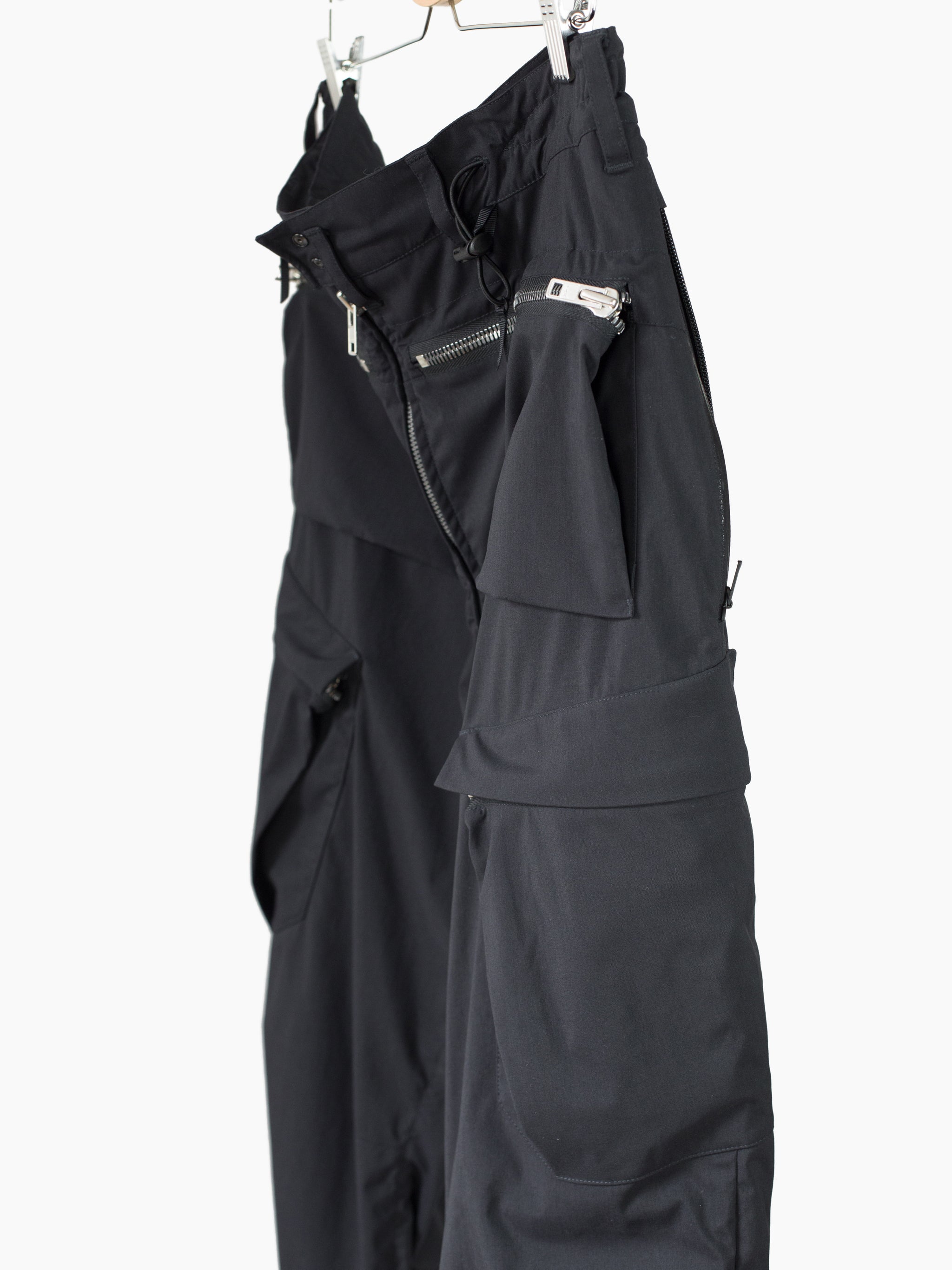 Finished with reverse double snapped waist closure and oversize exposed center front zip fly, shockcord cinch at the waist, canted thigh cargo pockets with phone sleeves, and locking coil zipper openable hem. Watertight side pockets with deep pockets side besides invisible zippered mesh vents at the lateral seat.