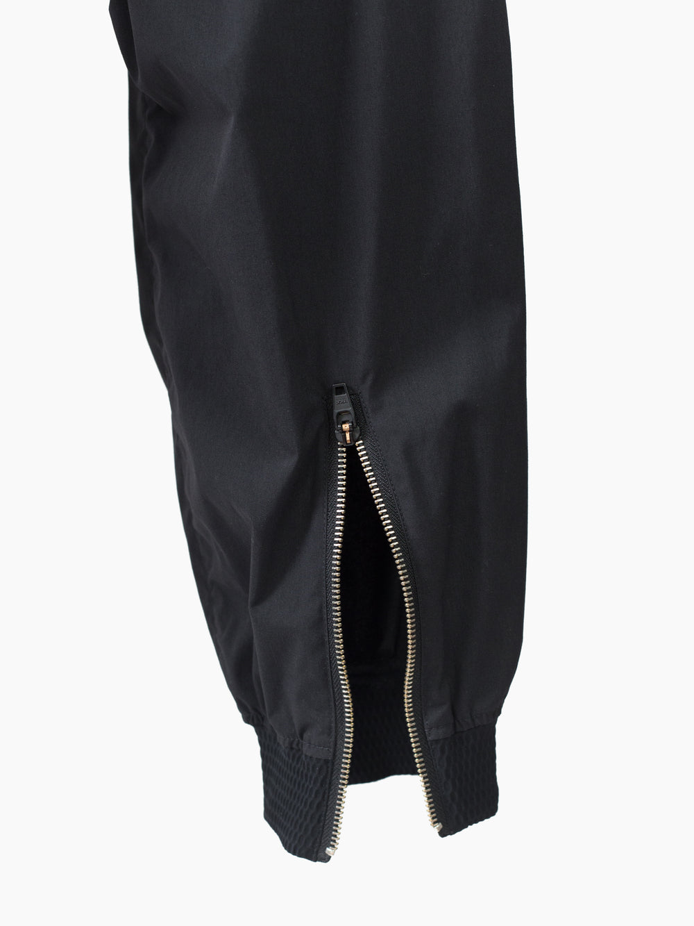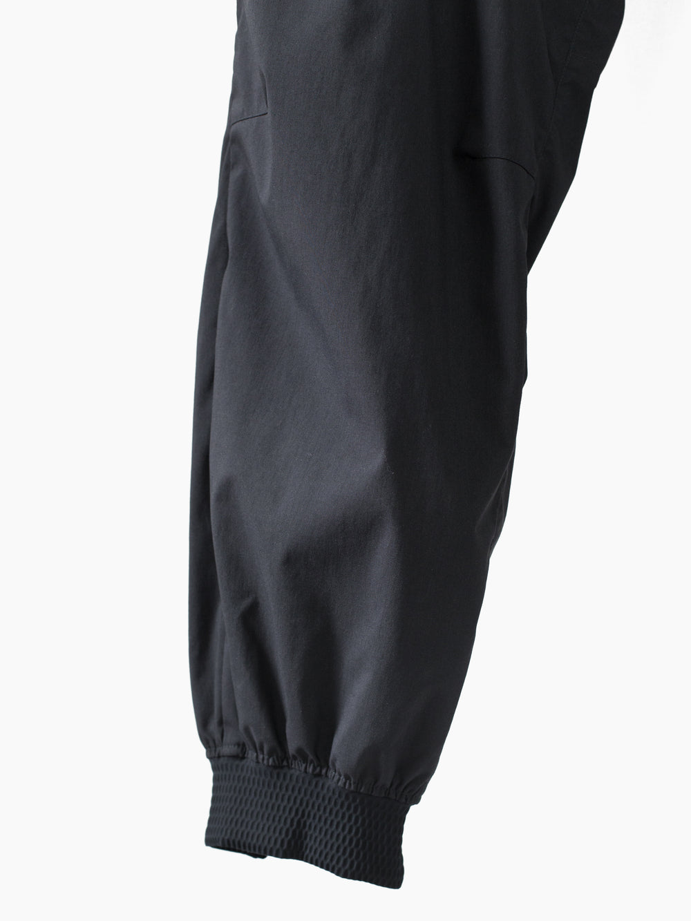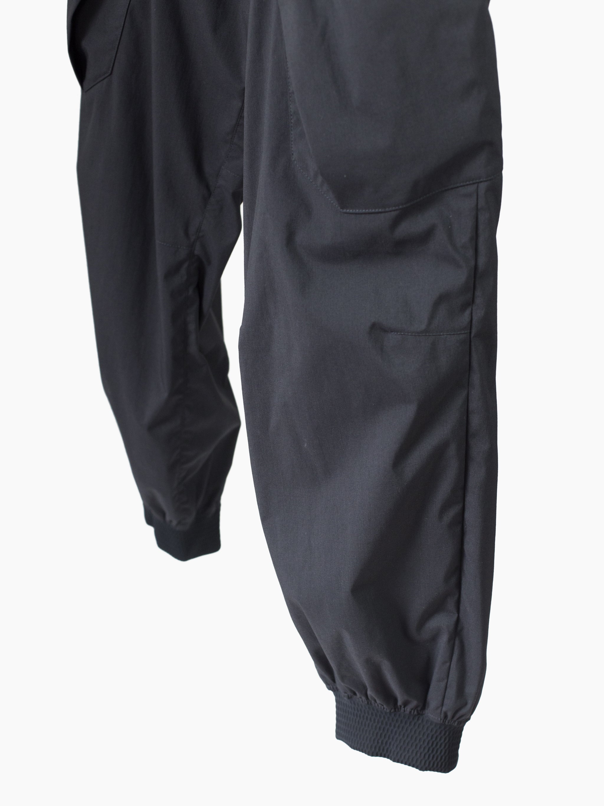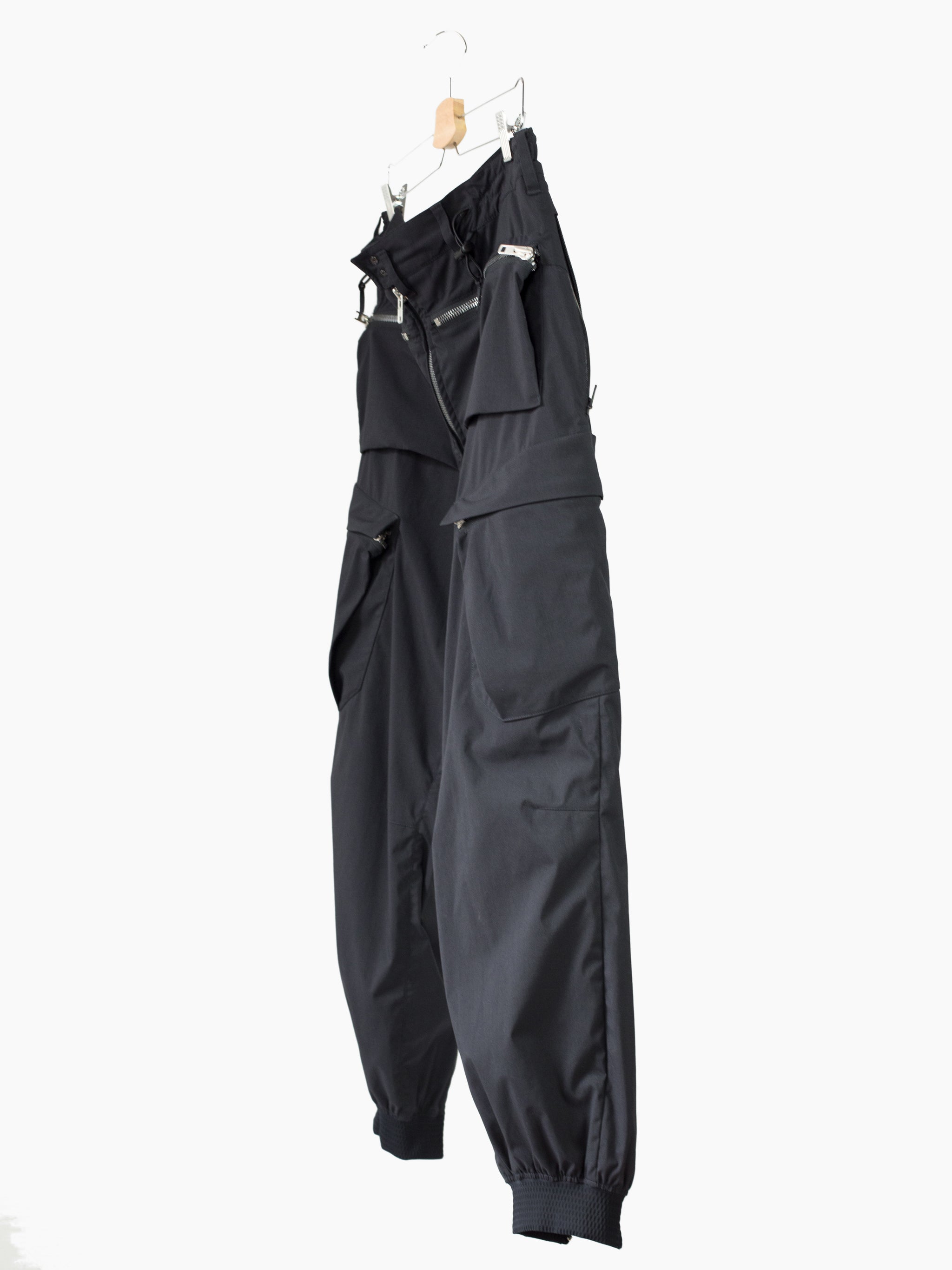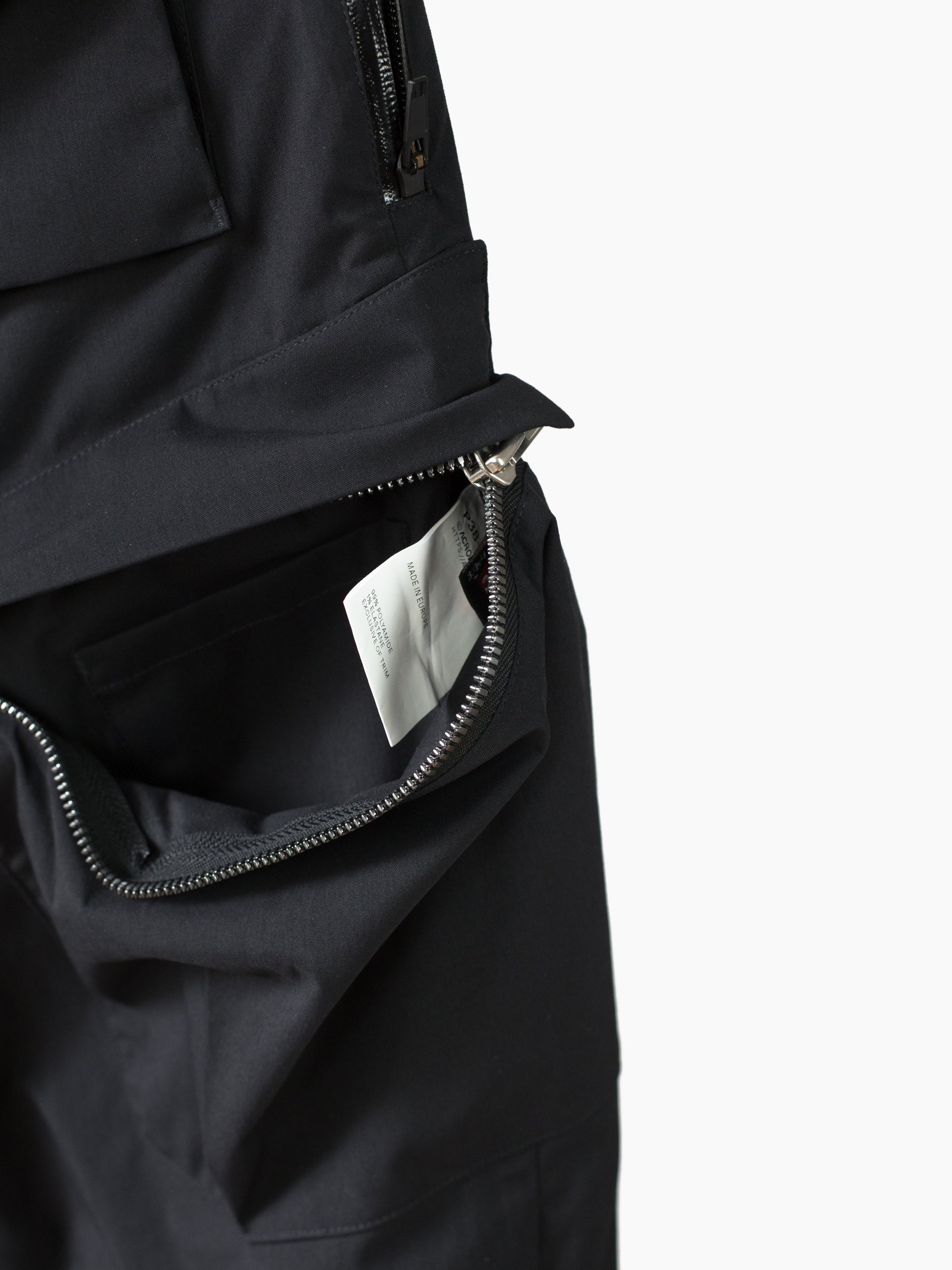 The P38-E features design lineage stemming from both elasticated jogger pants and vintage military overpants, bringing disparate garment archetypes together into a novel function-forward everyday pant. The main point of interest is highlighted in metallic silver--new innovative self-expanding tensionzip pockets that use the structure of the zipper teeth and track to pop open the entry, with an ingeniously built-in gusset for expanded capacity. Shelf-style at the hips, they provide the ability to instantly scan for contents just by glancing down.