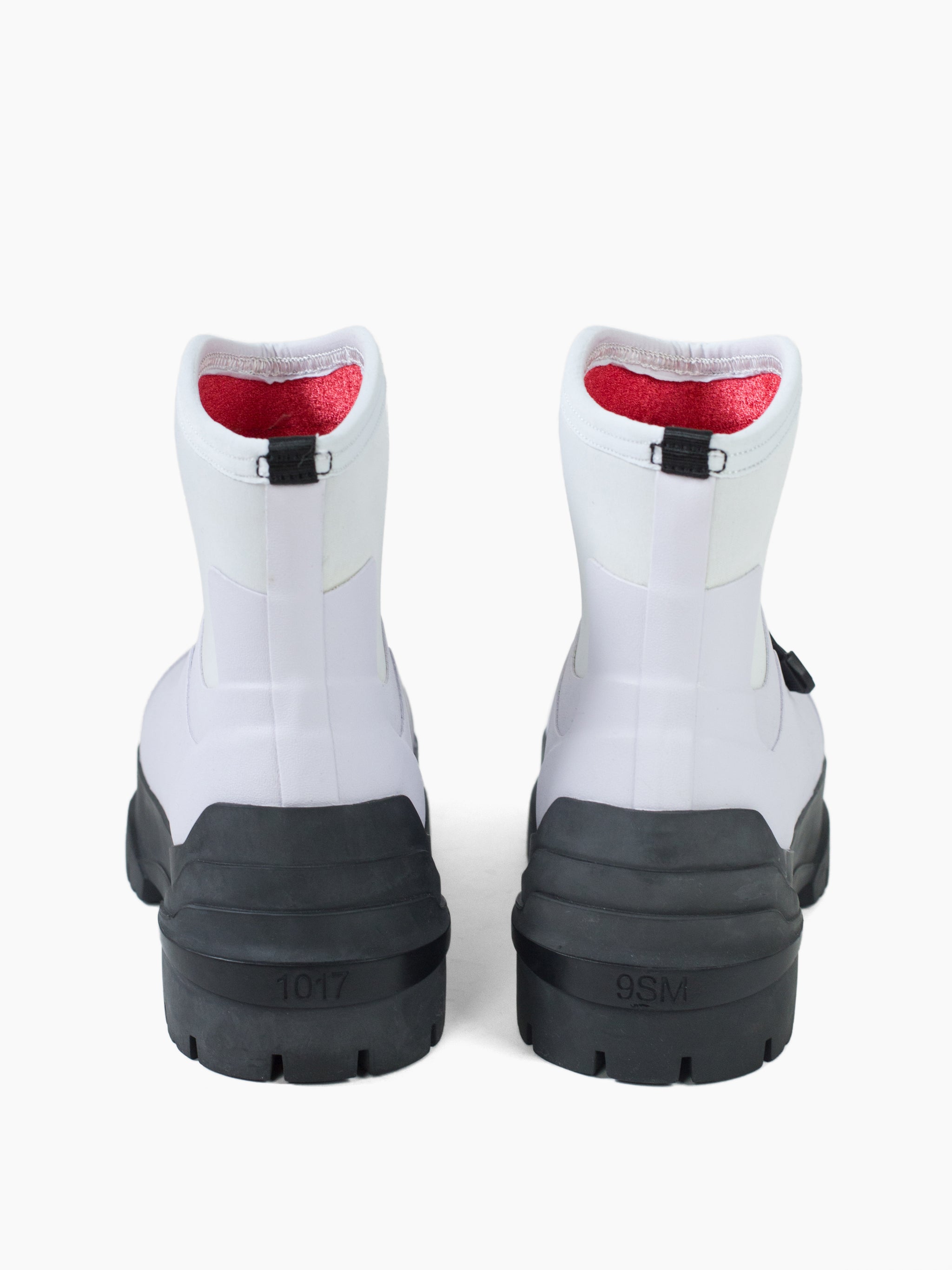 Iconic Alyx Moncler collaboration footwear, taking inspiration from industrial chemical protective/hazardous material footwear. These rubber and neoprene boots artfully remix the original reference with updated curved panel lining, chunky sole, and beautiful light lilac color palette to recontextualize a workwear staple as a sought-after high fashion object. Minimal mixed material upper features only shockcord ankle cinch as a form of closure, with contrast red spongy fleece lining for warmth.