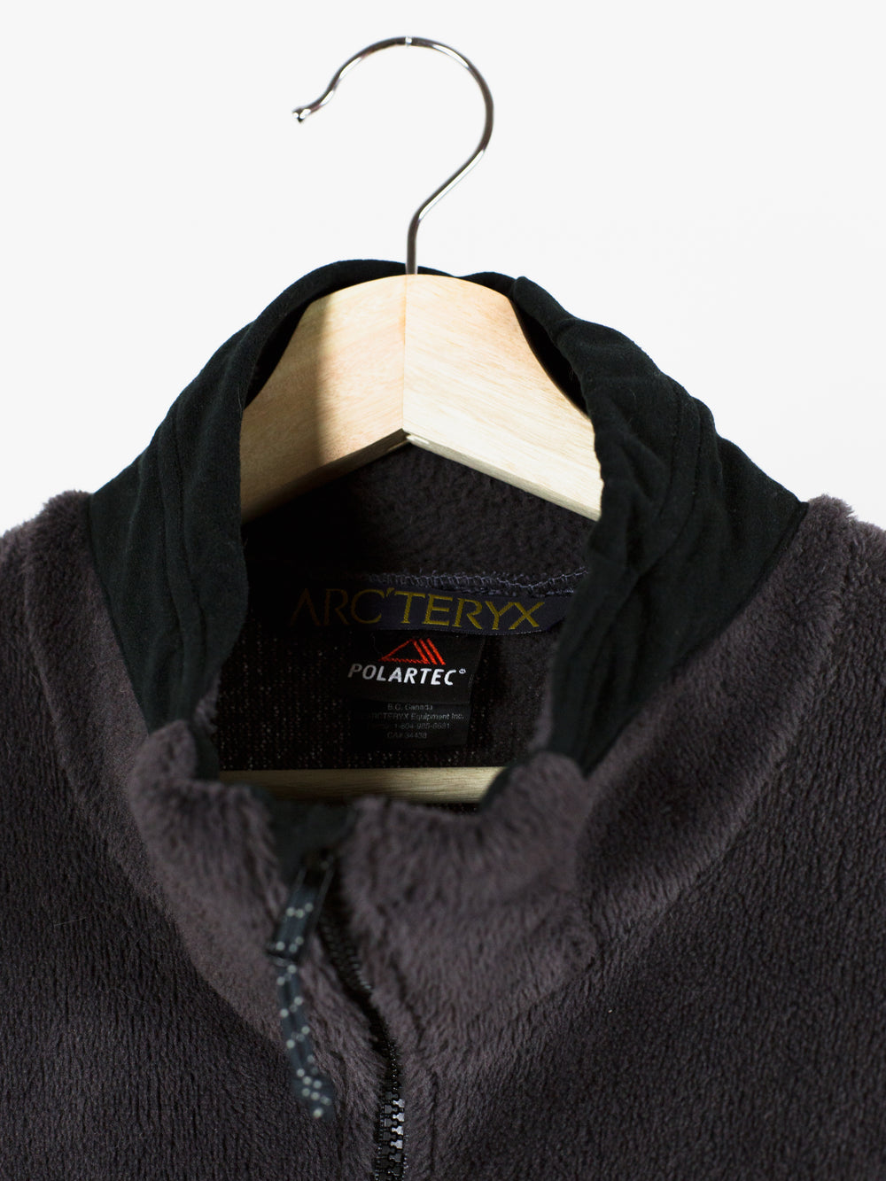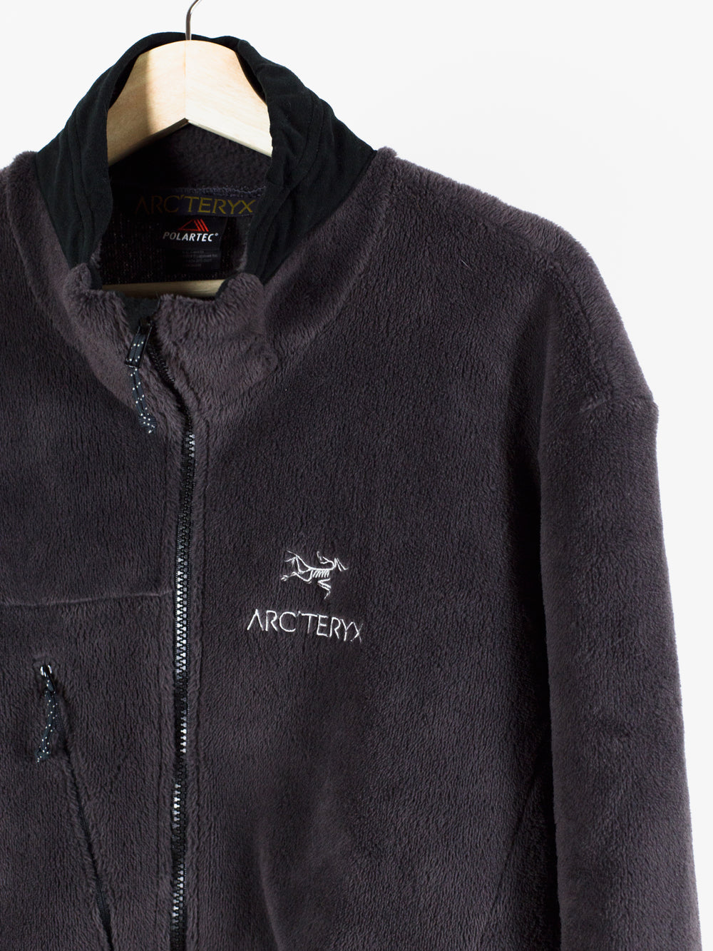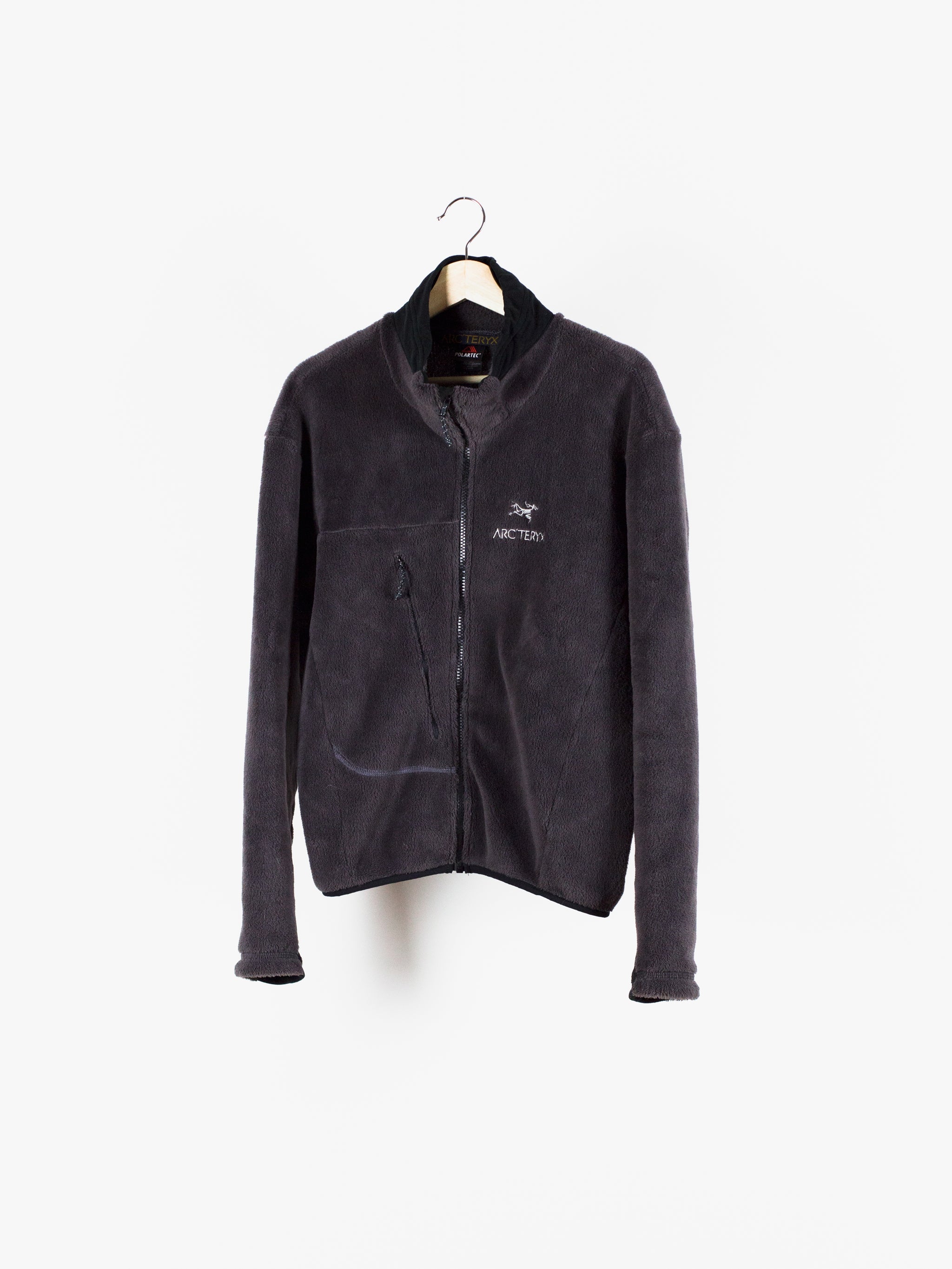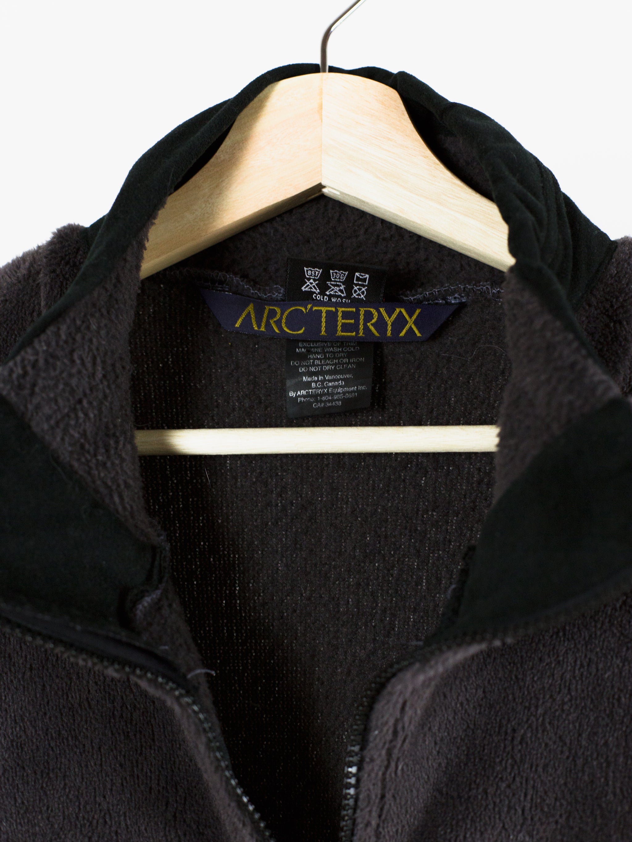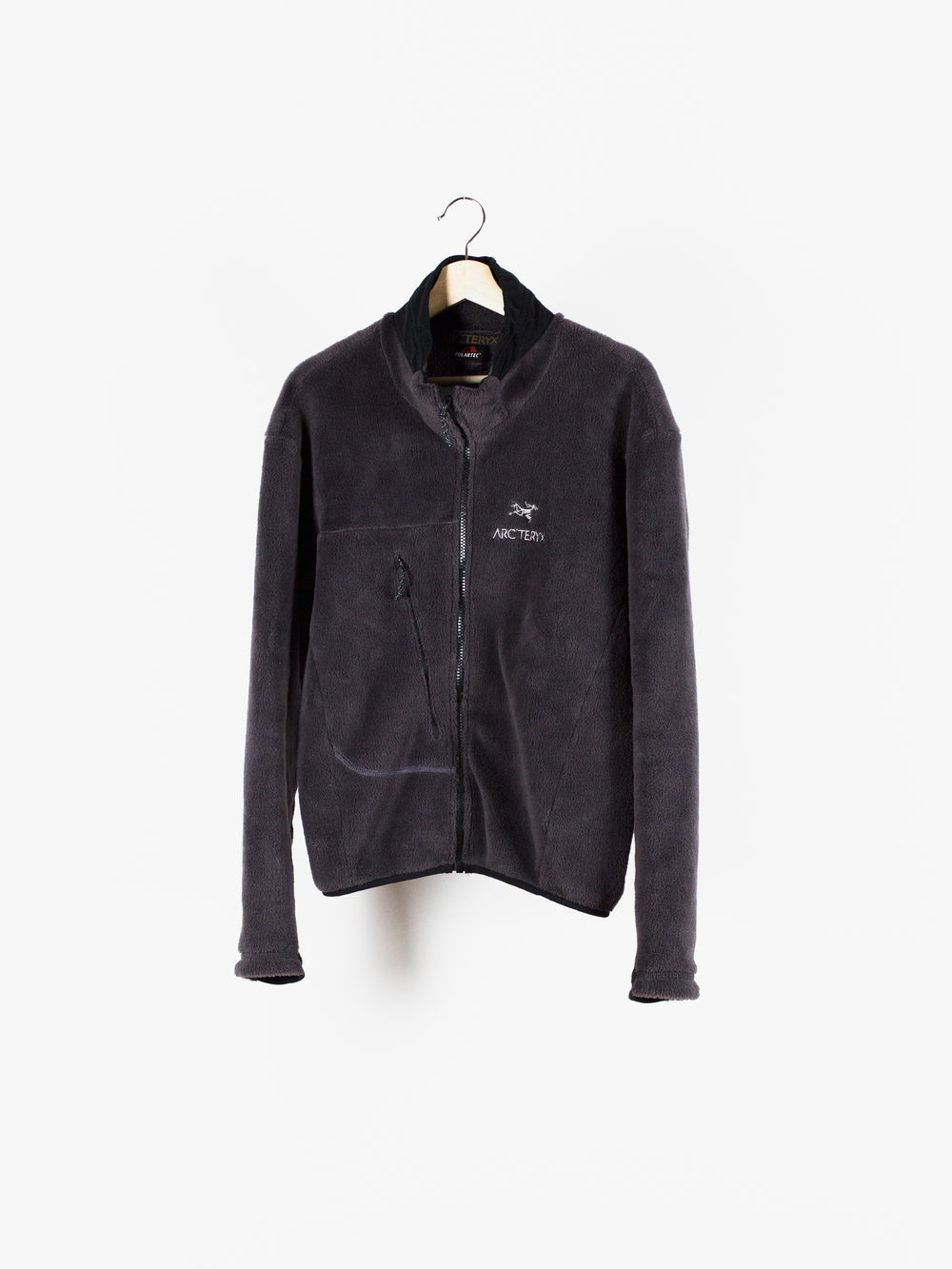 Vintage Made in Canada one-pocket fleece from Arc'teryx. Expert fabrication with fully overlocked or coverstitched seams along with elegant curved panelling. Highly air permeable Polartec fleece provides excellent loft/warmth under a shell yet vents heat nearly immediately to prevent overheating. Enormous asymmetrical Napoleon pocket is cut with a durable mesh interior. Neck and cuffs are cut with contrast softshell material for durability and reduced bulk/ergonomic comfort in mind. Finished with plain elastic band sewn at waist for an intensely minimal visual. Finished with gusseted underarms, CF zip, drawcord neck tightener, laminated faux-suede chinguard, and silver embroidered logo at wearer's left chest.