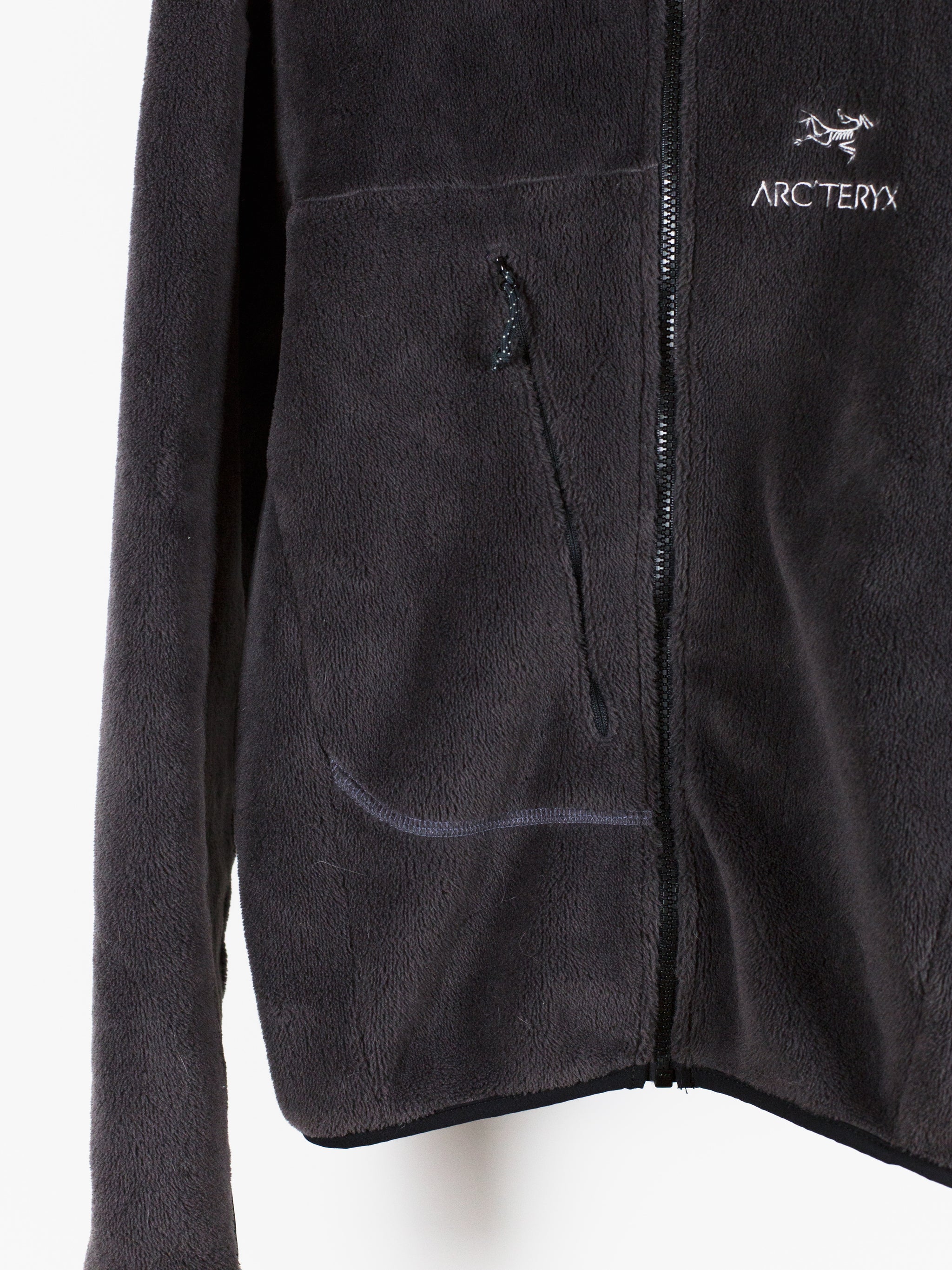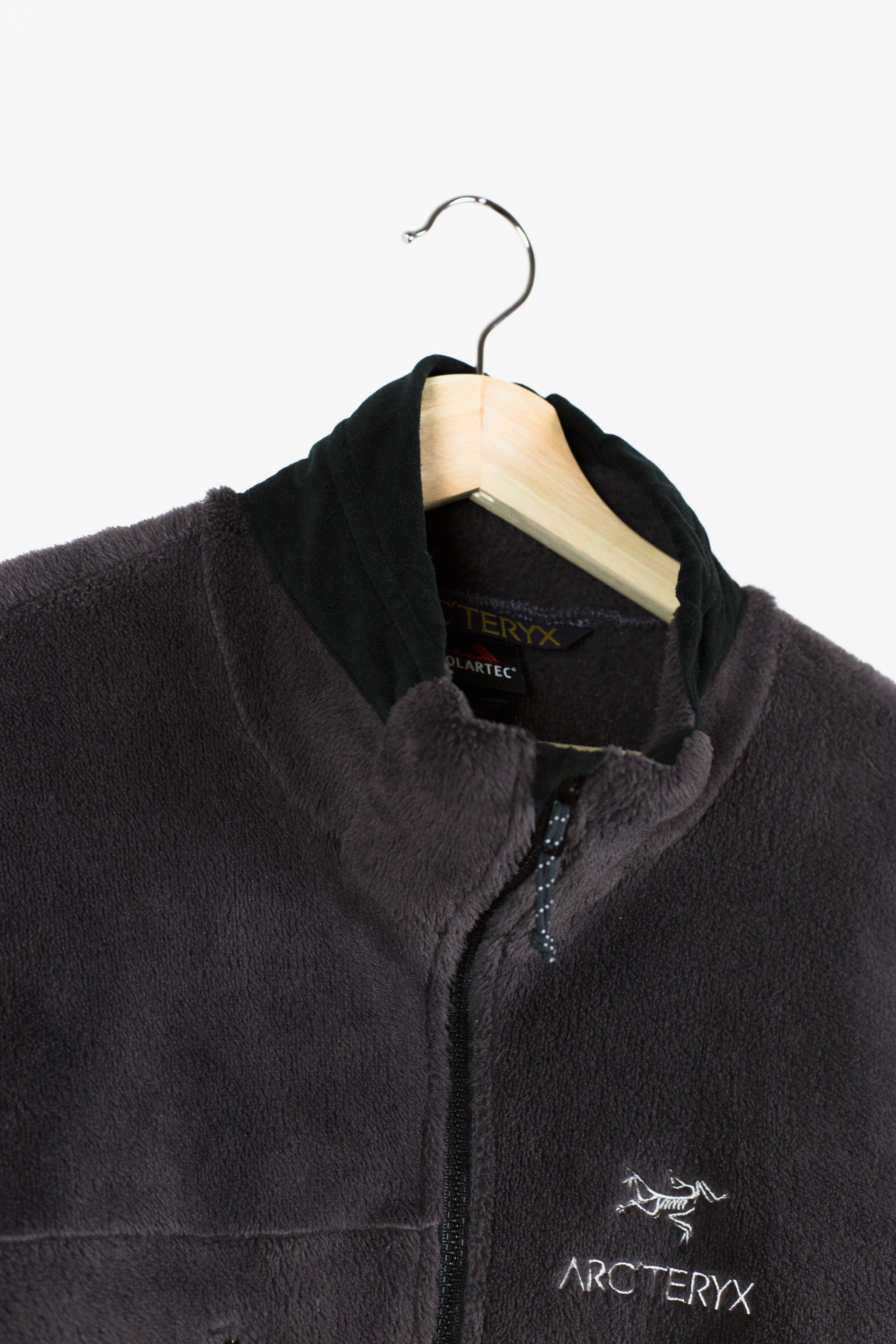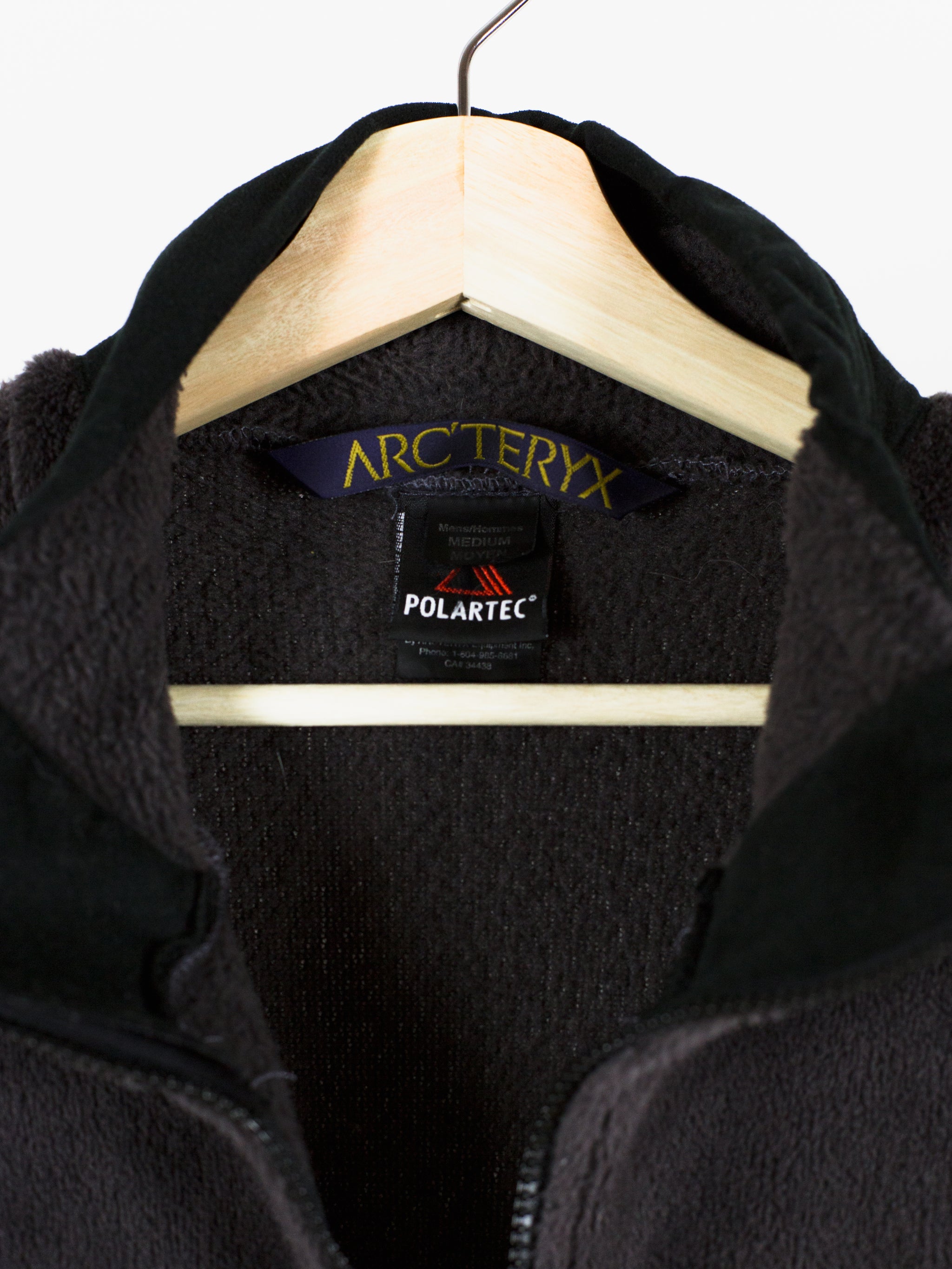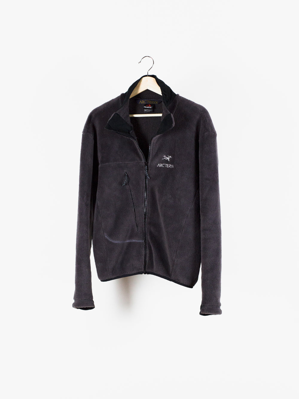 Vintage Made in Canada one-pocket fleece from Arc'teryx. Expert fabrication with fully overlocked or coverstitched seams along with elegant curved panelling. Highly air permeable Polartec fleece provides excellent loft/warmth under a shell yet vents heat nearly immediately to prevent overheating. Enormous asymmetrical Napoleon pocket is cut with a durable mesh interior. Neck and cuffs are cut with contrast softshell material for durability and reduced bulk/ergonomic comfort in mind. Finished with plain elastic band sewn at waist for an intensely minimal visual. Finished with gusseted underarms, CF zip, drawcord neck tightener, laminated faux-suede chinguard, and silver embroidered logo at wearer's left chest.