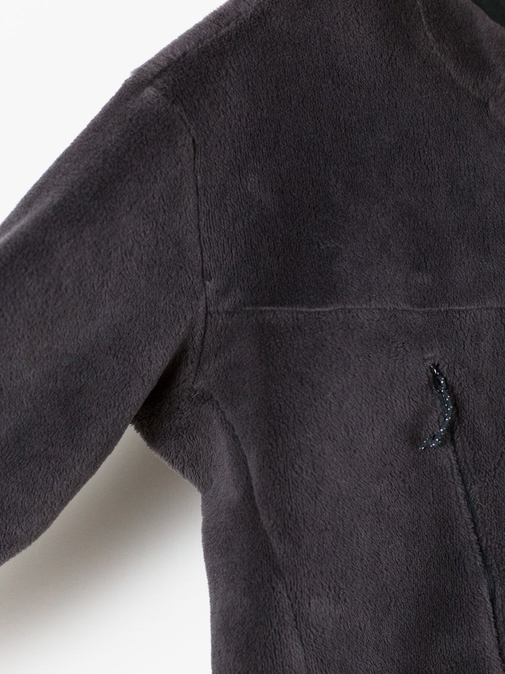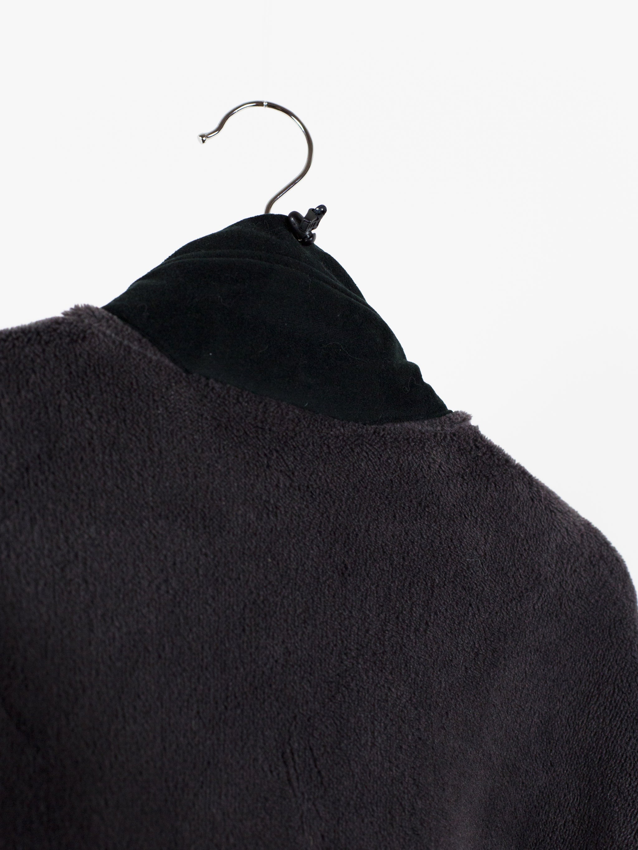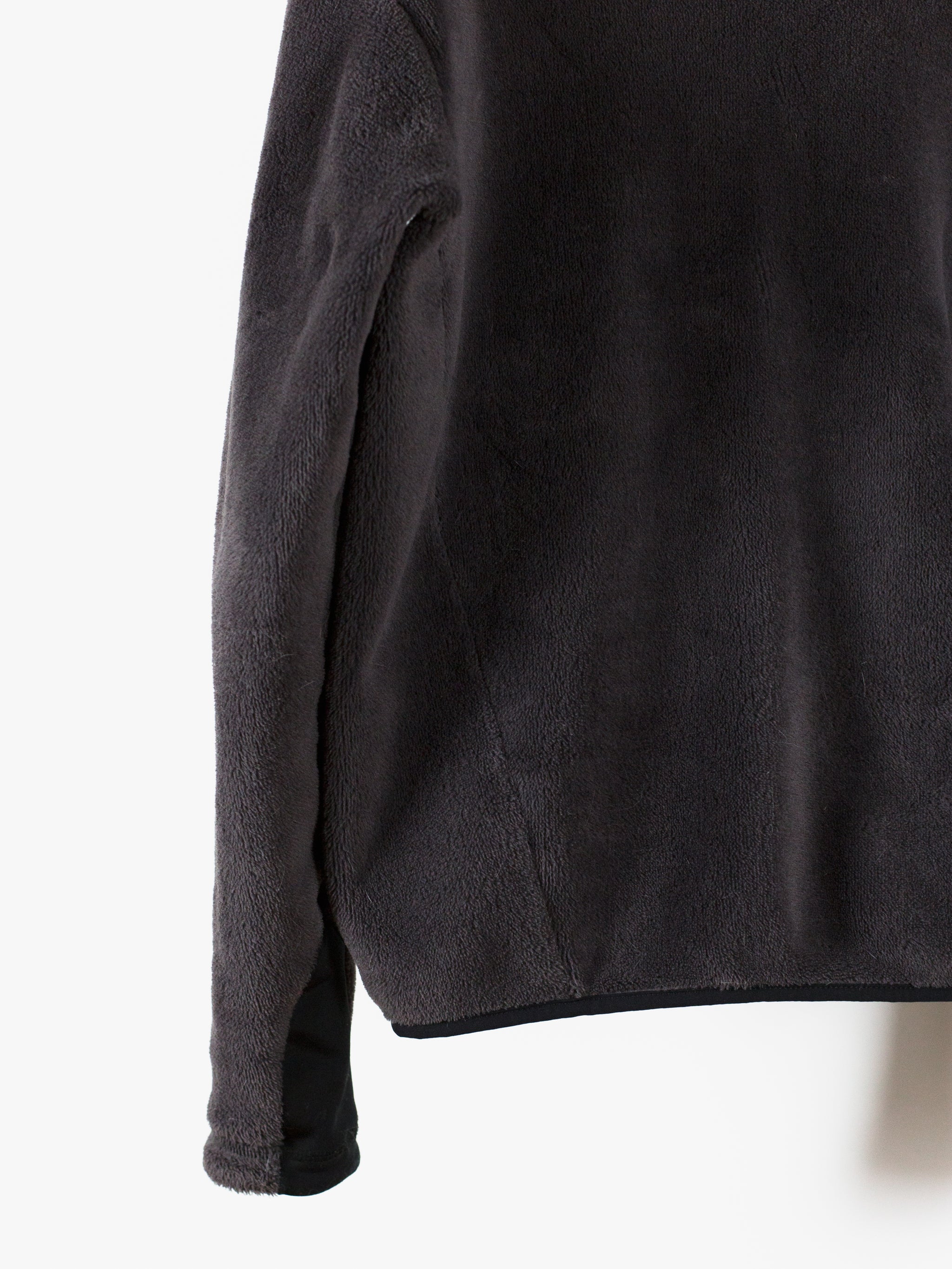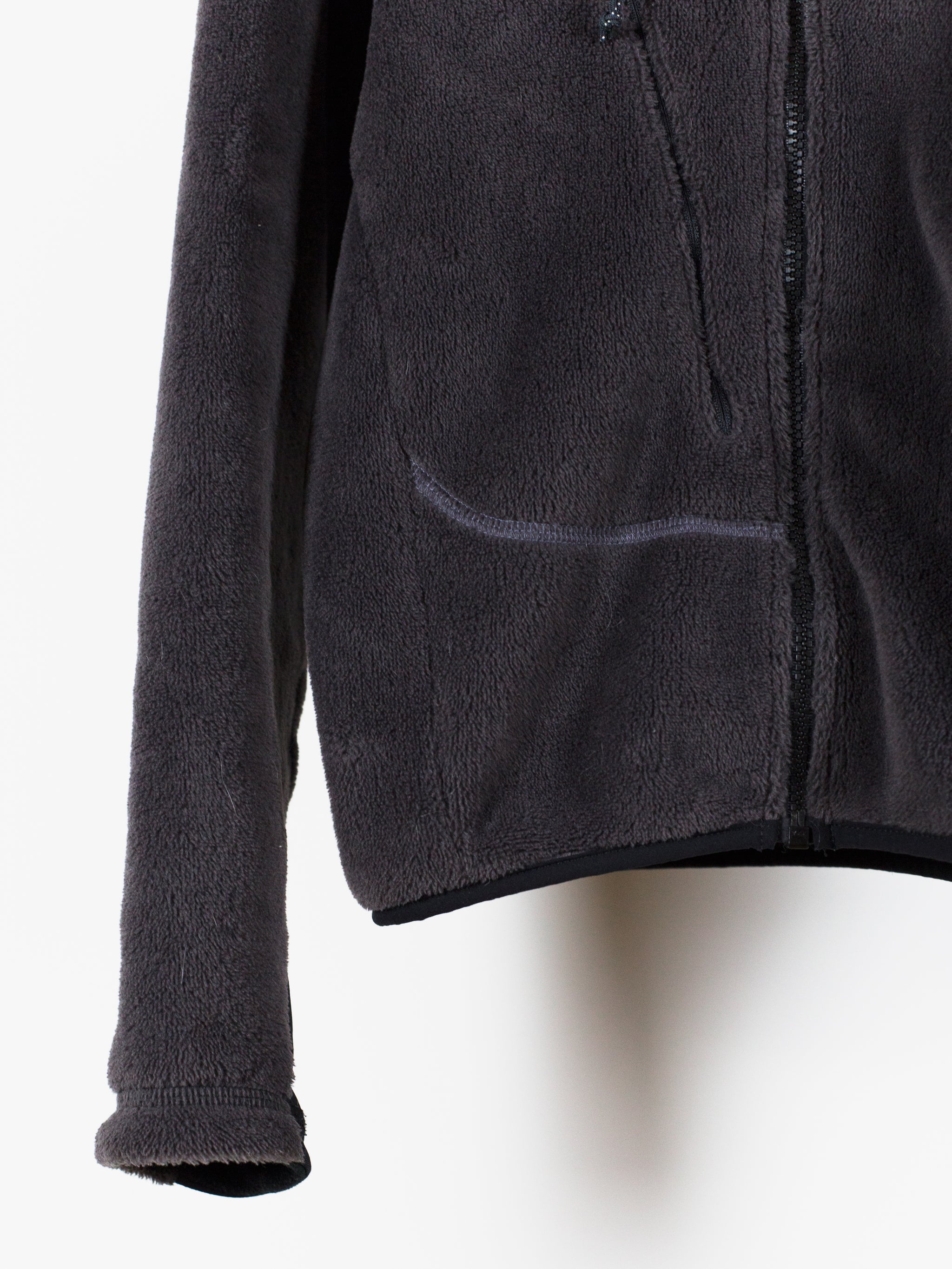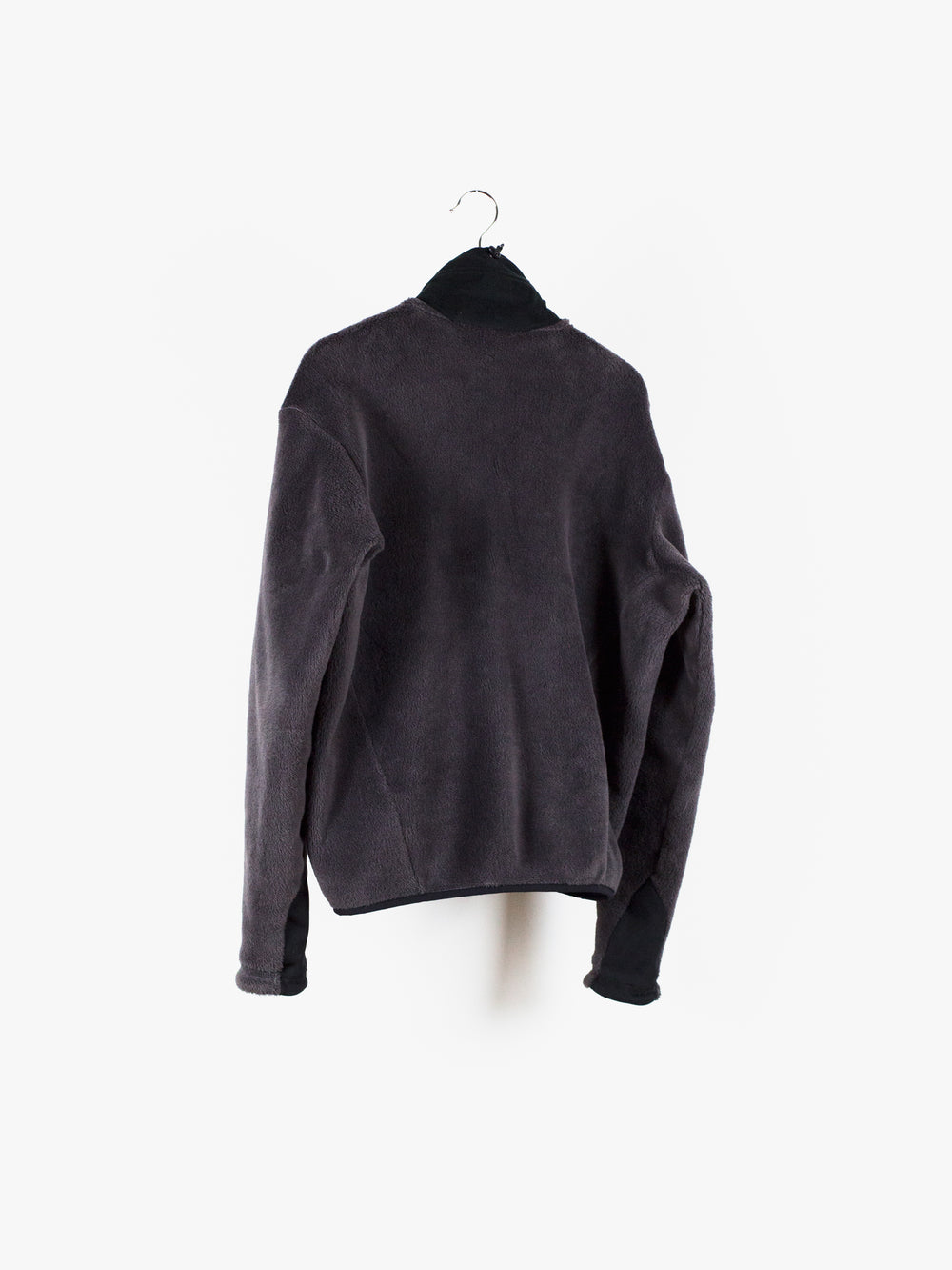 Vintage Made in Canada one-pocket fleece from Arc'teryx. Expert fabrication with fully overlocked or coverstitched seams along with elegant curved panelling. Highly air permeable Polartec fleece provides excellent loft/warmth under a shell yet vents heat nearly immediately to prevent overheating. Enormous asymmetrical Napoleon pocket is cut with a durable mesh interior. Neck and cuffs are cut with contrast softshell material for durability and reduced bulk/ergonomic comfort in mind. Finished with plain elastic band sewn at waist for an intensely minimal visual. Finished with gusseted underarms, CF zip, drawcord neck tightener, laminated faux-suede chinguard, and silver embroidered logo at wearer's left chest.