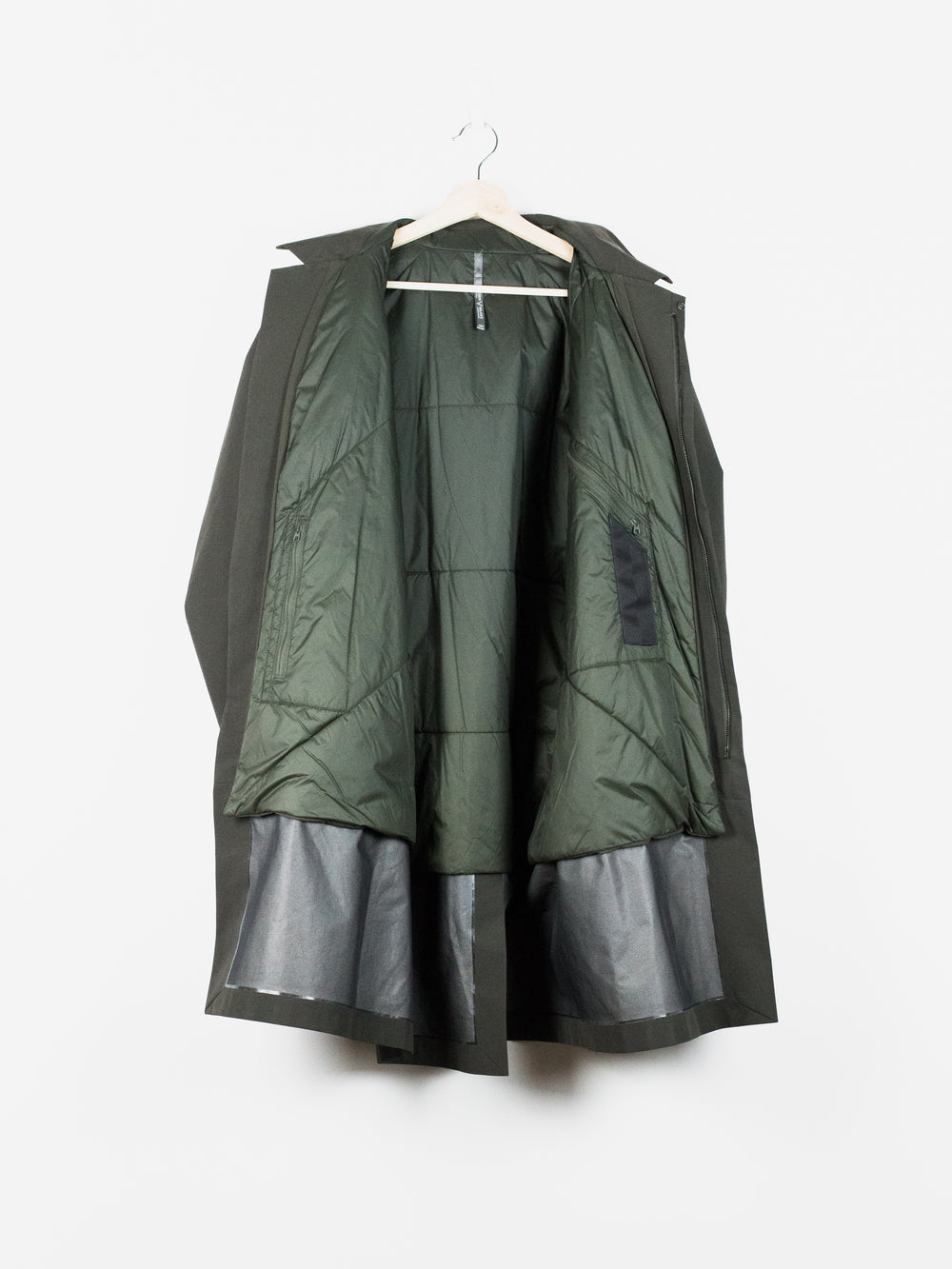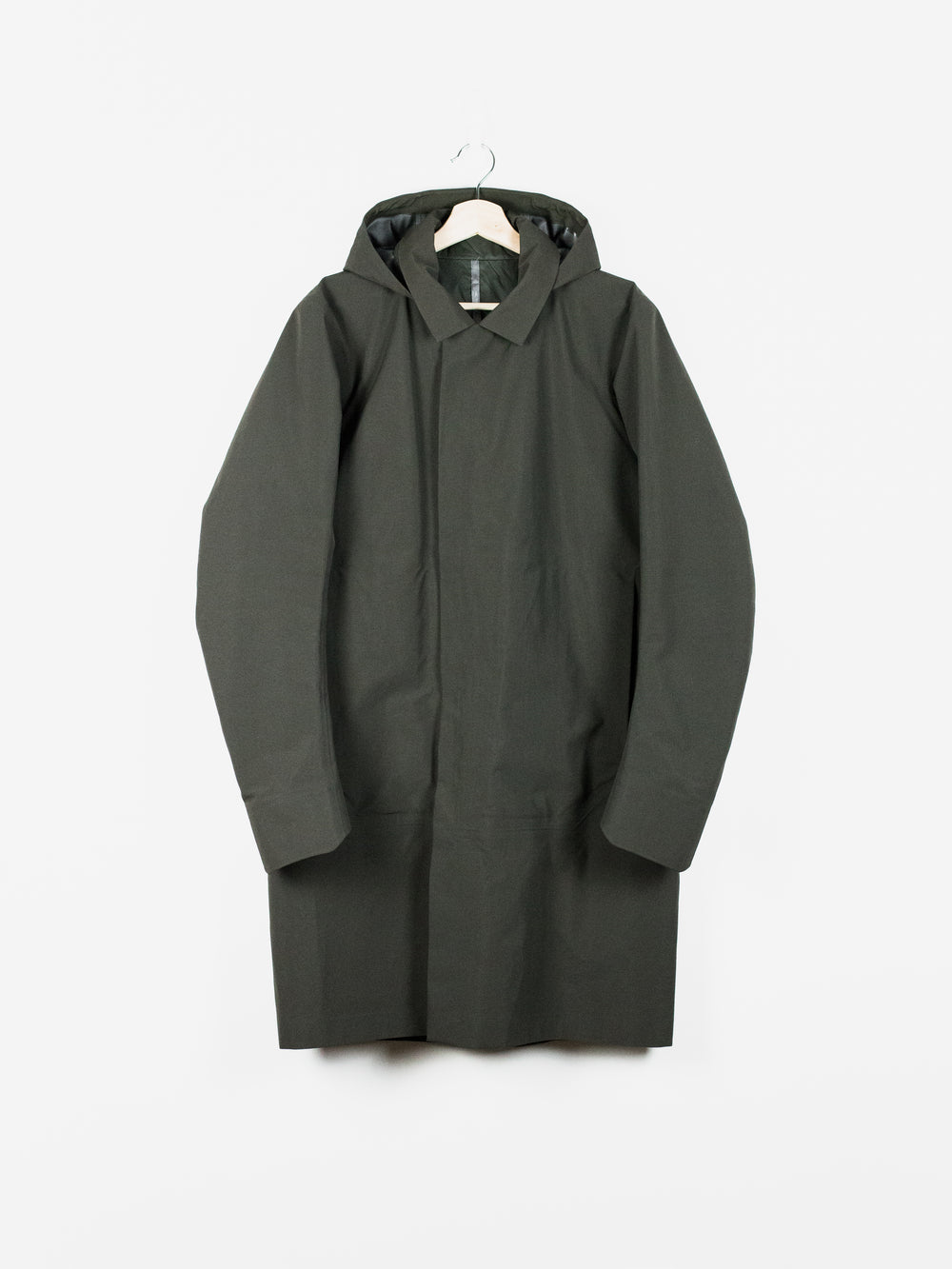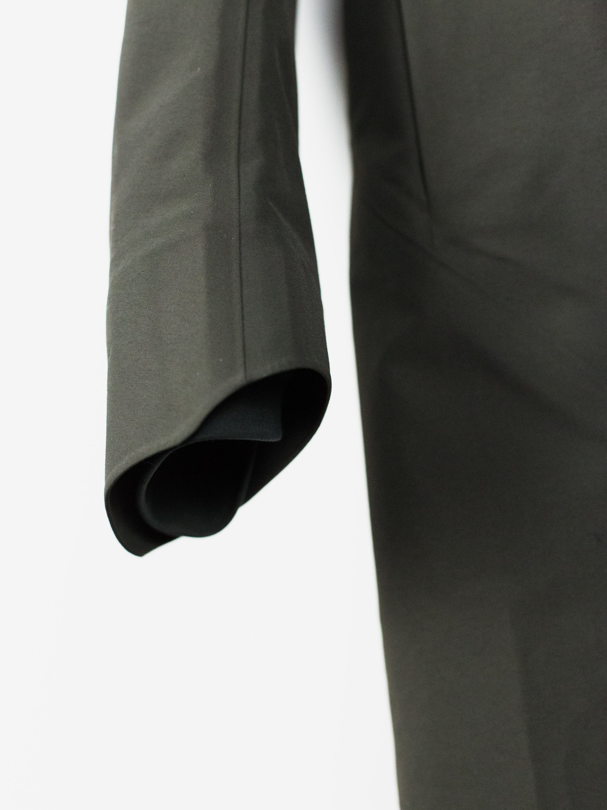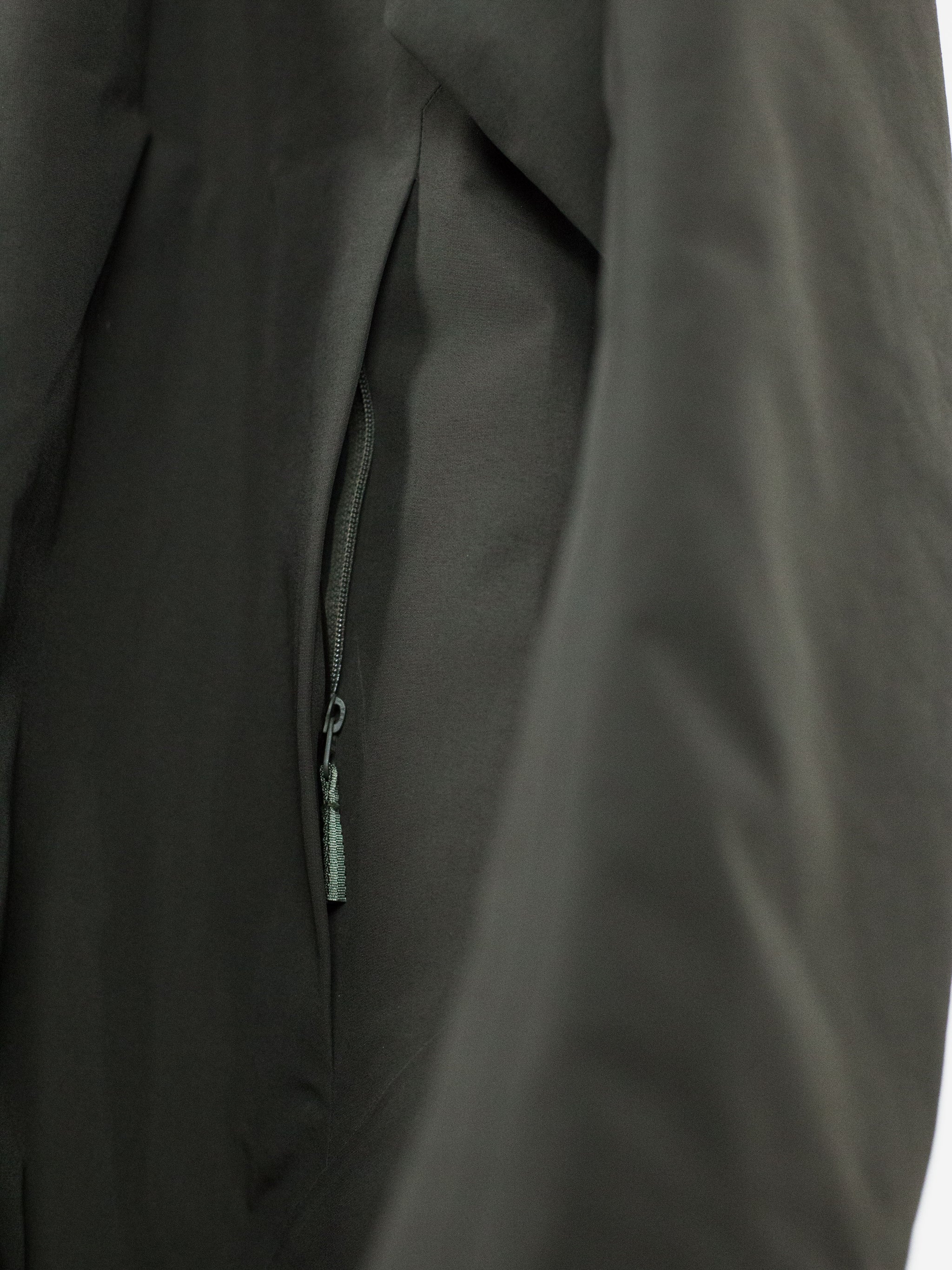 A mix of classical menswear shapes and cutting edge technical detailing, the Galvanic IS iterates on the archetypical men's mac coat. With its hidden zip front and side entry waist pockets hidden behind folded gore-tex, this coat presents as extremely minimal. But, upon closer inspection, the complexity of this piece is revealed in how it's been able to pack its performance into a shape that feels both familiar and freeing. The outer gore-tex face is sewn together with micro seam-allowances that minimize their visual appearance and allow them to lay flatter than they would sewn traditionally while the pattern pieces are anatomically fitted to the body to facilitated unrestricted movement--this is seen in the curved construction of the sleeve and geometrically gusseted underarms. Shaped laminated cuffs with an underlying softshell wrist gasket cut a sharp profile at the wrist and provide extra weather protection while allowing full dexterity. These features imbue the Galvanic IS with an impression that appears almost architectural in its sharpness and angularity. The Galvanis IS features variable insulation with 80 gsm coreloft in the body and lighter 60 gsm coreloft in the arms to reduce bulk. It is finished with matte black two-way zip front closure with offset zero-snap at neck, snap-in detachable hood, two spacious interior zip-close stash pockets, interior pen-pocket.