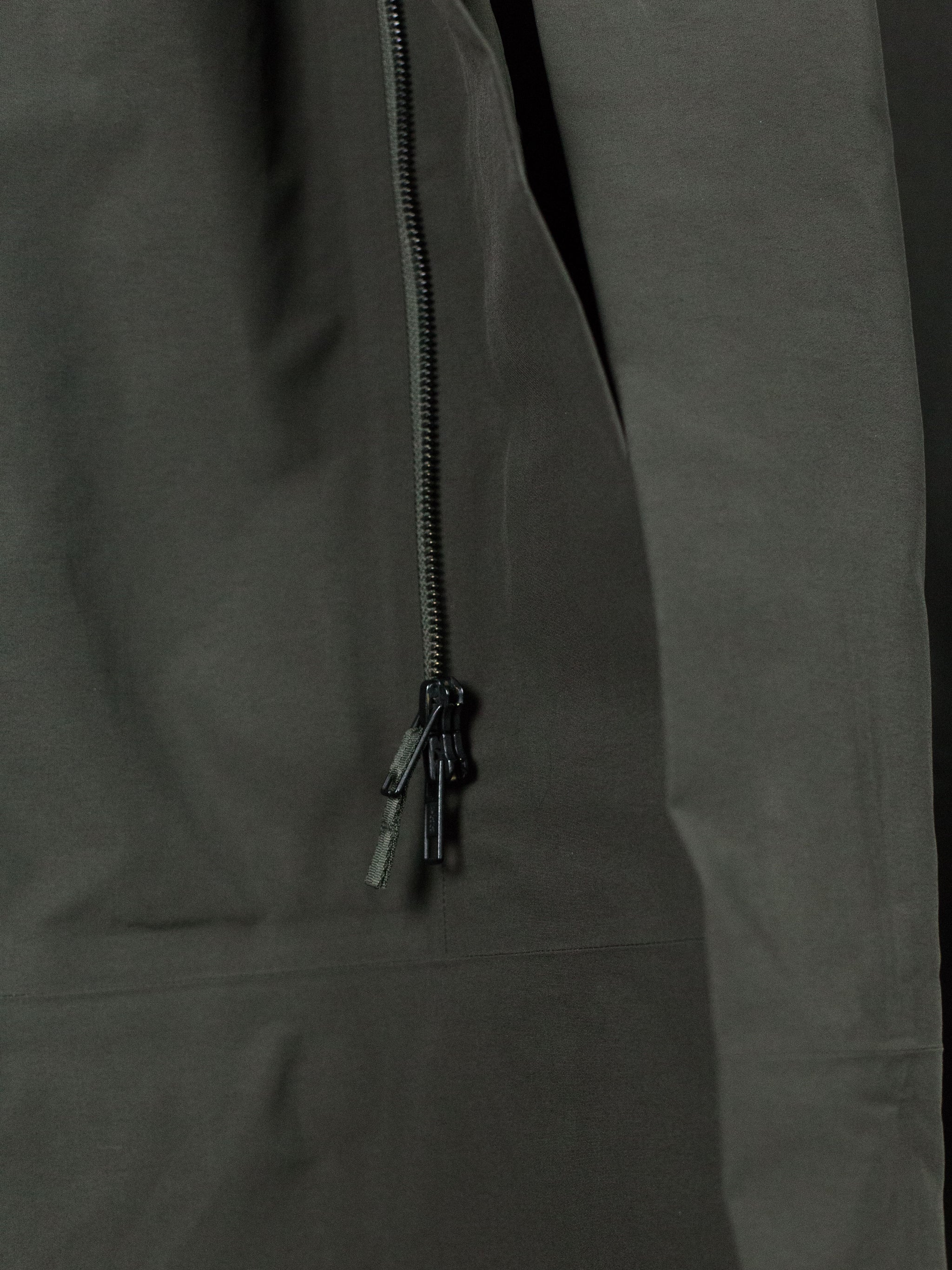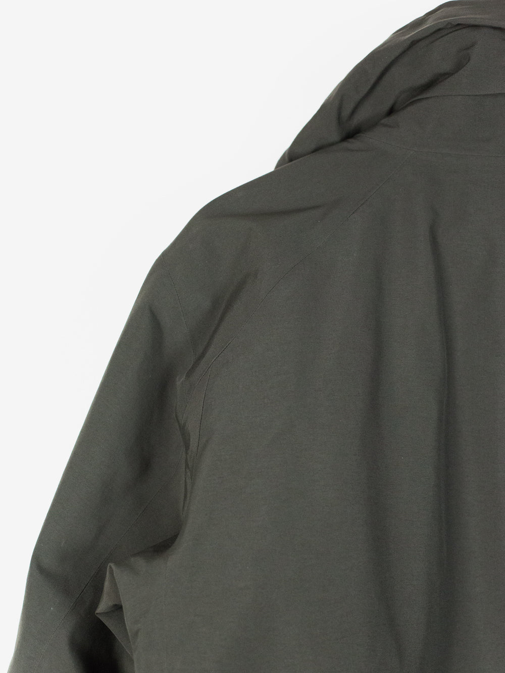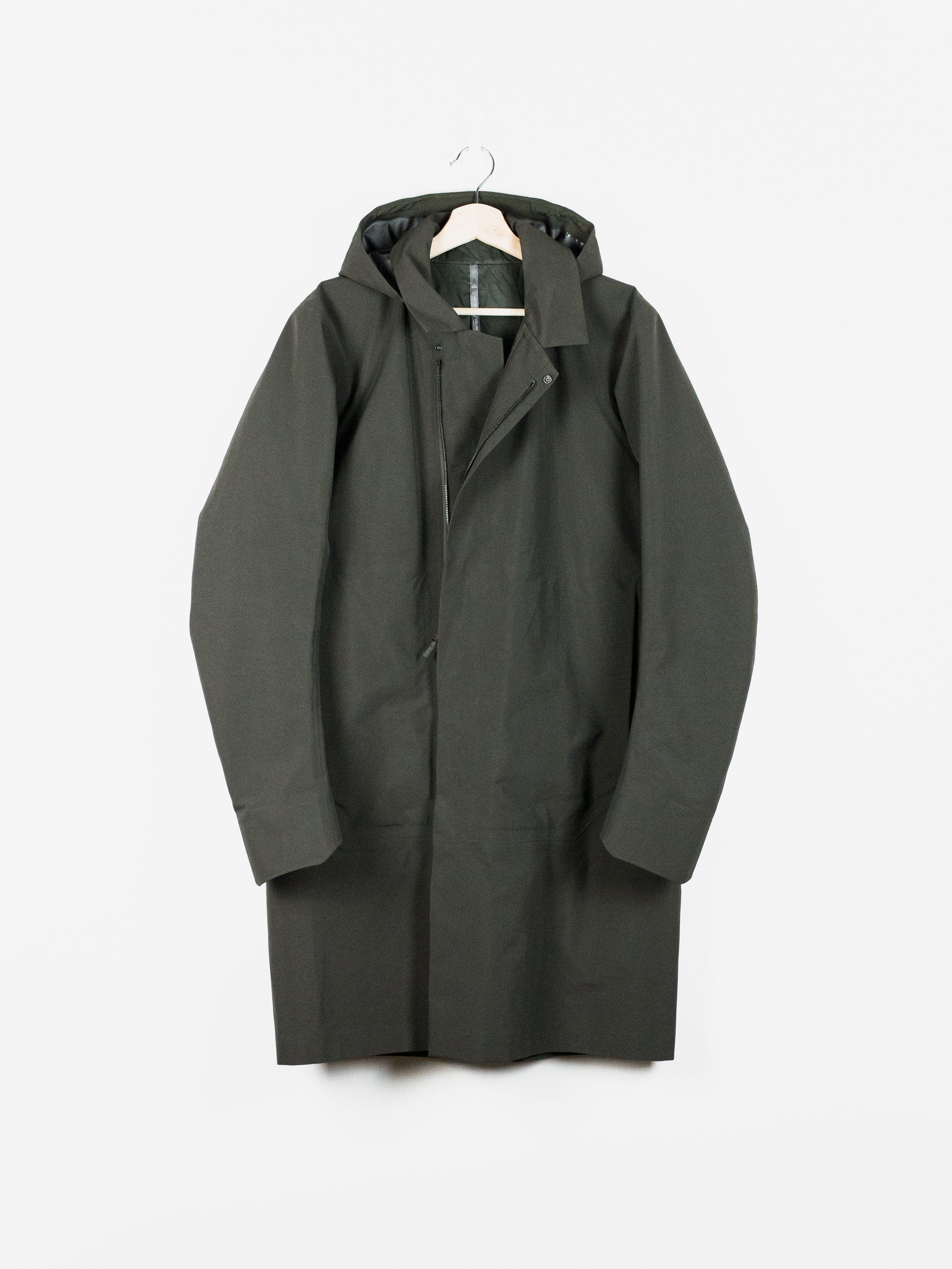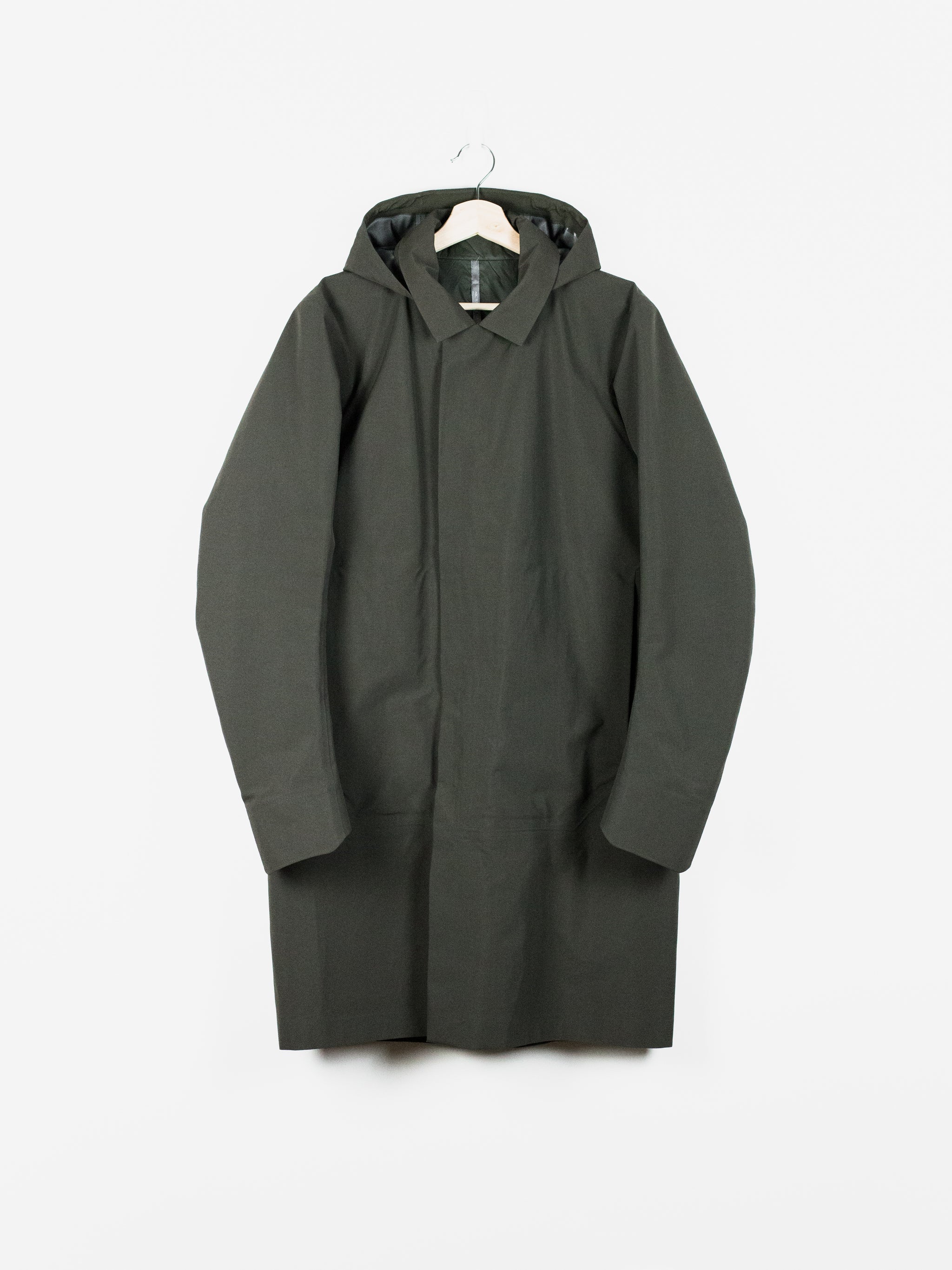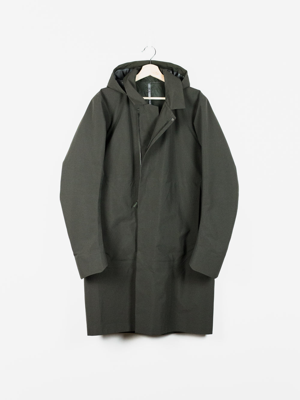 A mix of classical menswear shapes and cutting edge technical detailing, the Galvanic IS iterates on the archetypical men's mac coat. With its hidden zip front and side entry waist pockets hidden behind folded gore-tex, this coat presents as extremely minimal. But, upon closer inspection, the complexity of this piece is revealed in how it's been able to pack its performance into a shape that feels both familiar and freeing. The outer gore-tex face is sewn together with micro seam-allowances that minimize their visual appearance and allow them to lay flatter than they would sewn traditionally while the pattern pieces are anatomically fitted to the body to facilitated unrestricted movement--this is seen in the curved construction of the sleeve and geometrically gusseted underarms. Shaped laminated cuffs with an underlying softshell wrist gasket cut a sharp profile at the wrist and provide extra weather protection while allowing full dexterity. These features imbue the Galvanic IS with an impression that appears almost architectural in its sharpness and angularity. The Galvanis IS features variable insulation with 80 gsm coreloft in the body and lighter 60 gsm coreloft in the arms to reduce bulk. It is finished with matte black two-way zip front closure with offset zero-snap at neck, snap-in detachable hood, two spacious interior zip-close stash pockets, interior pen-pocket.