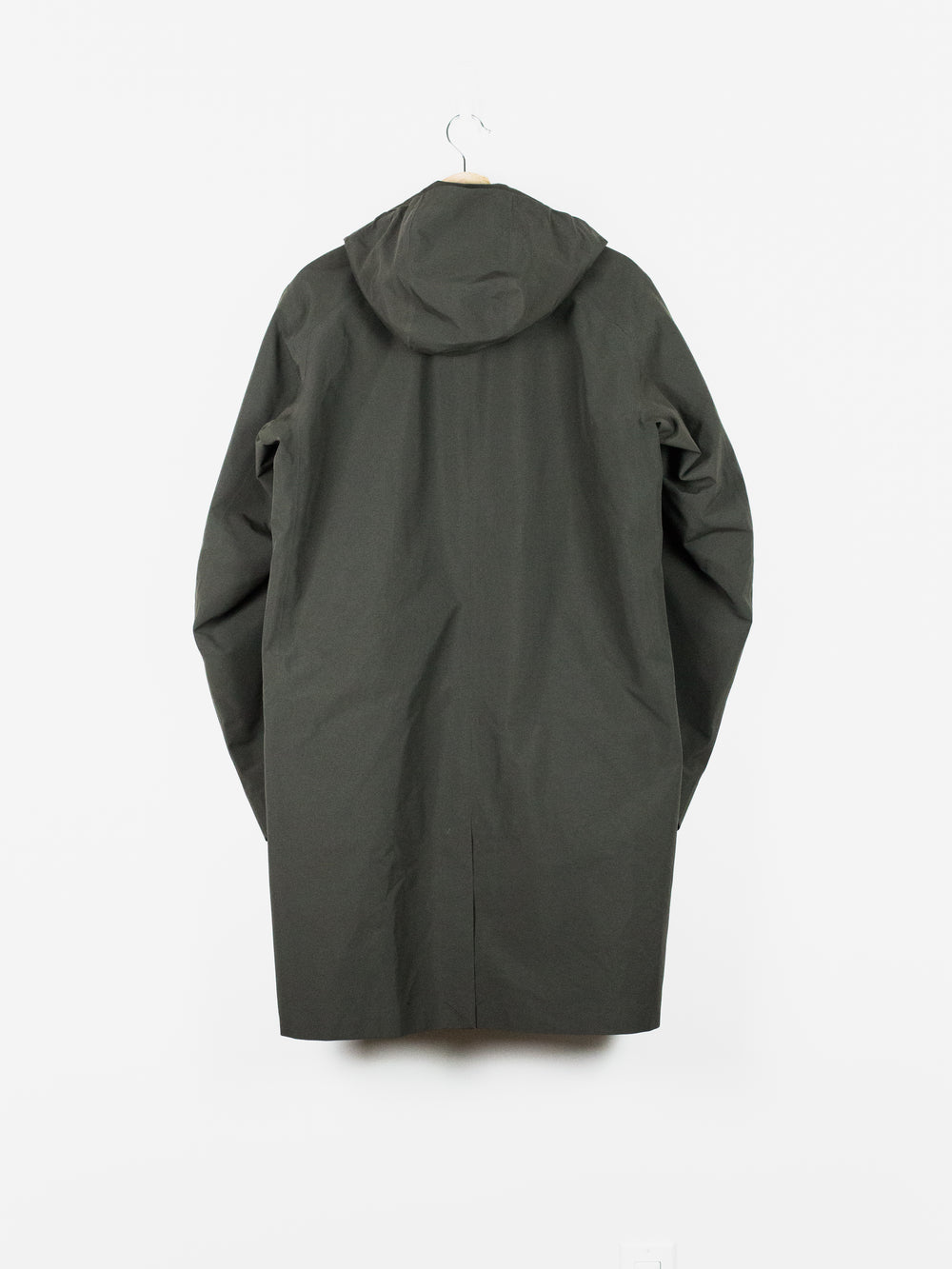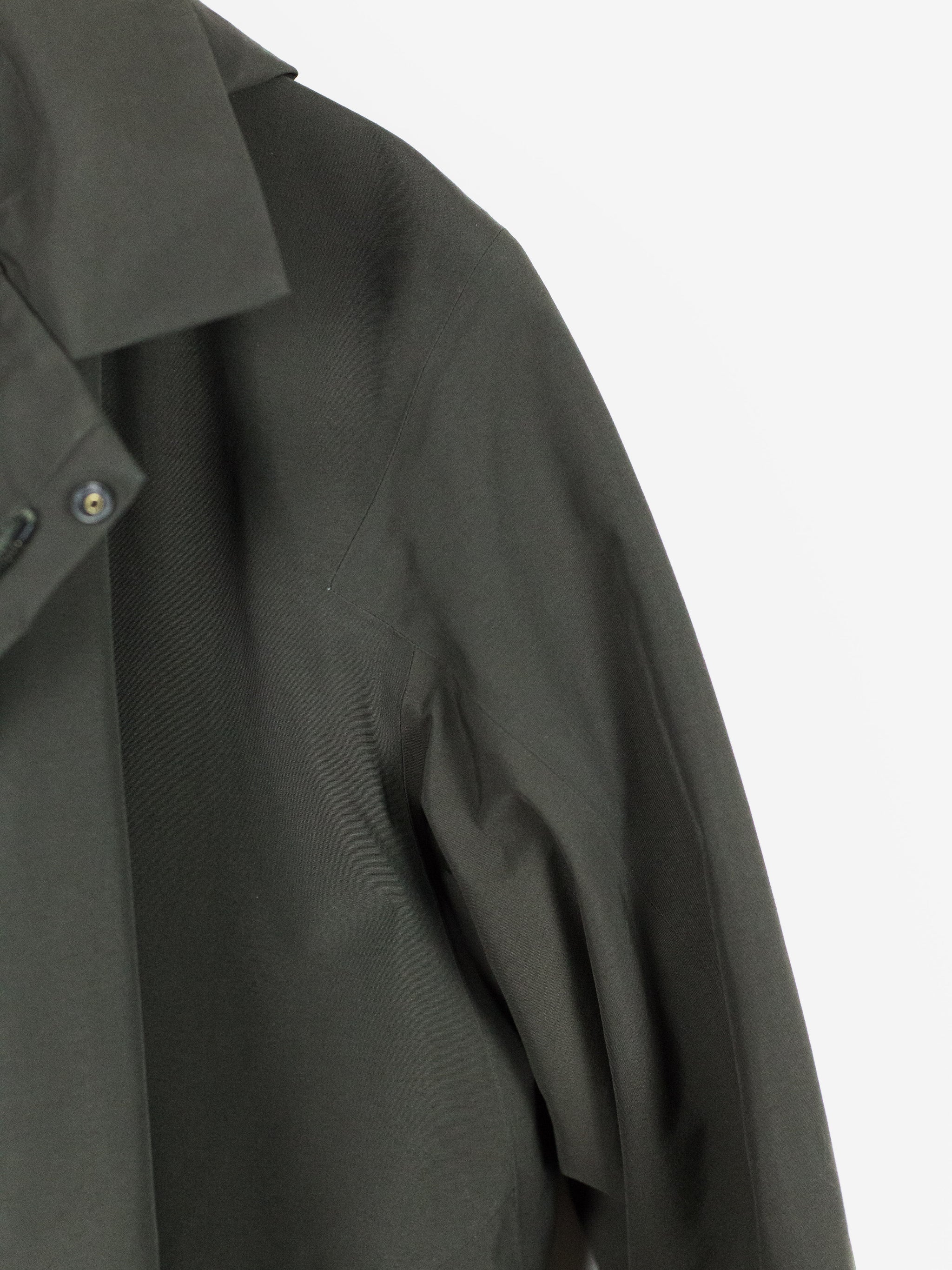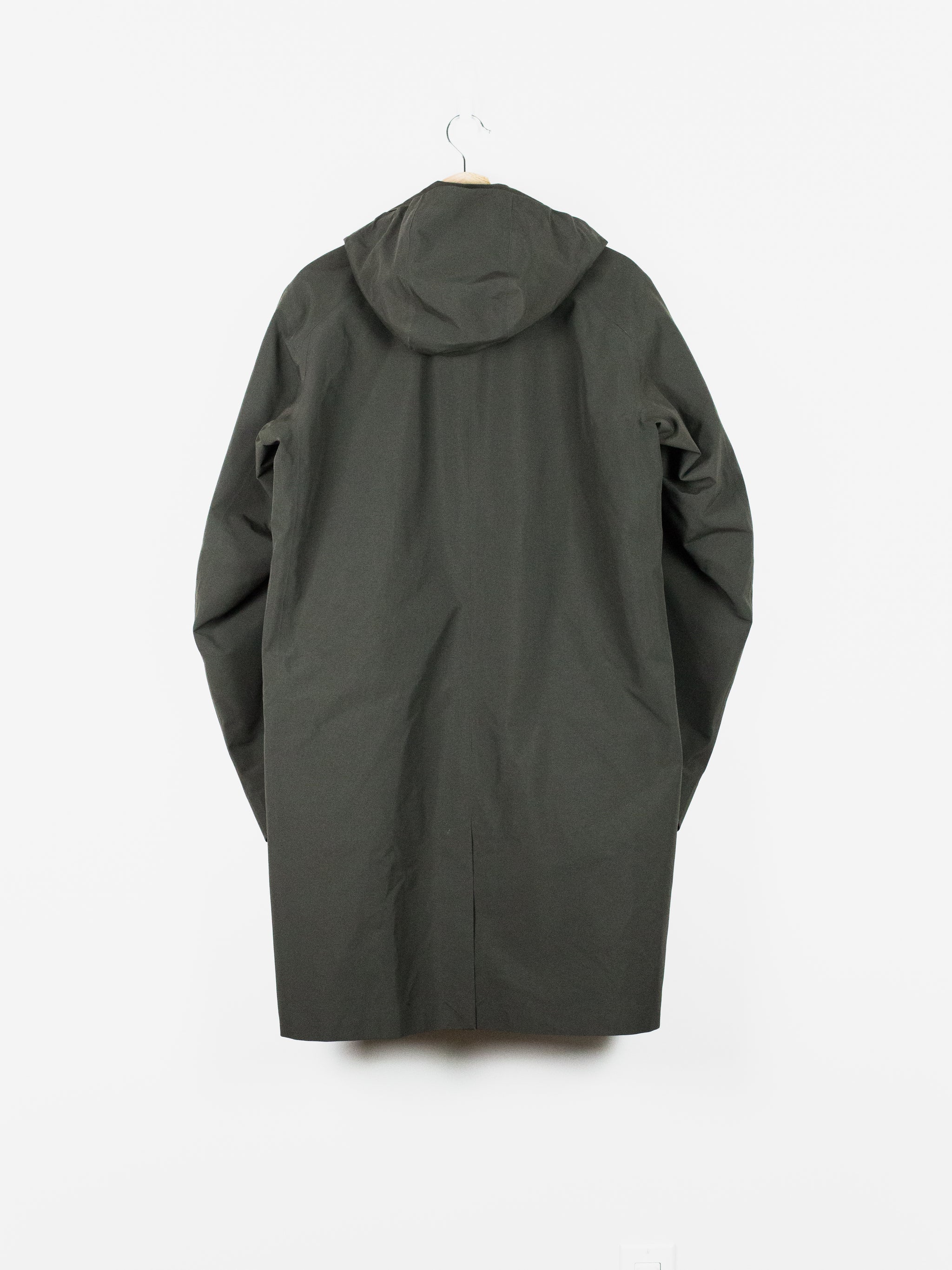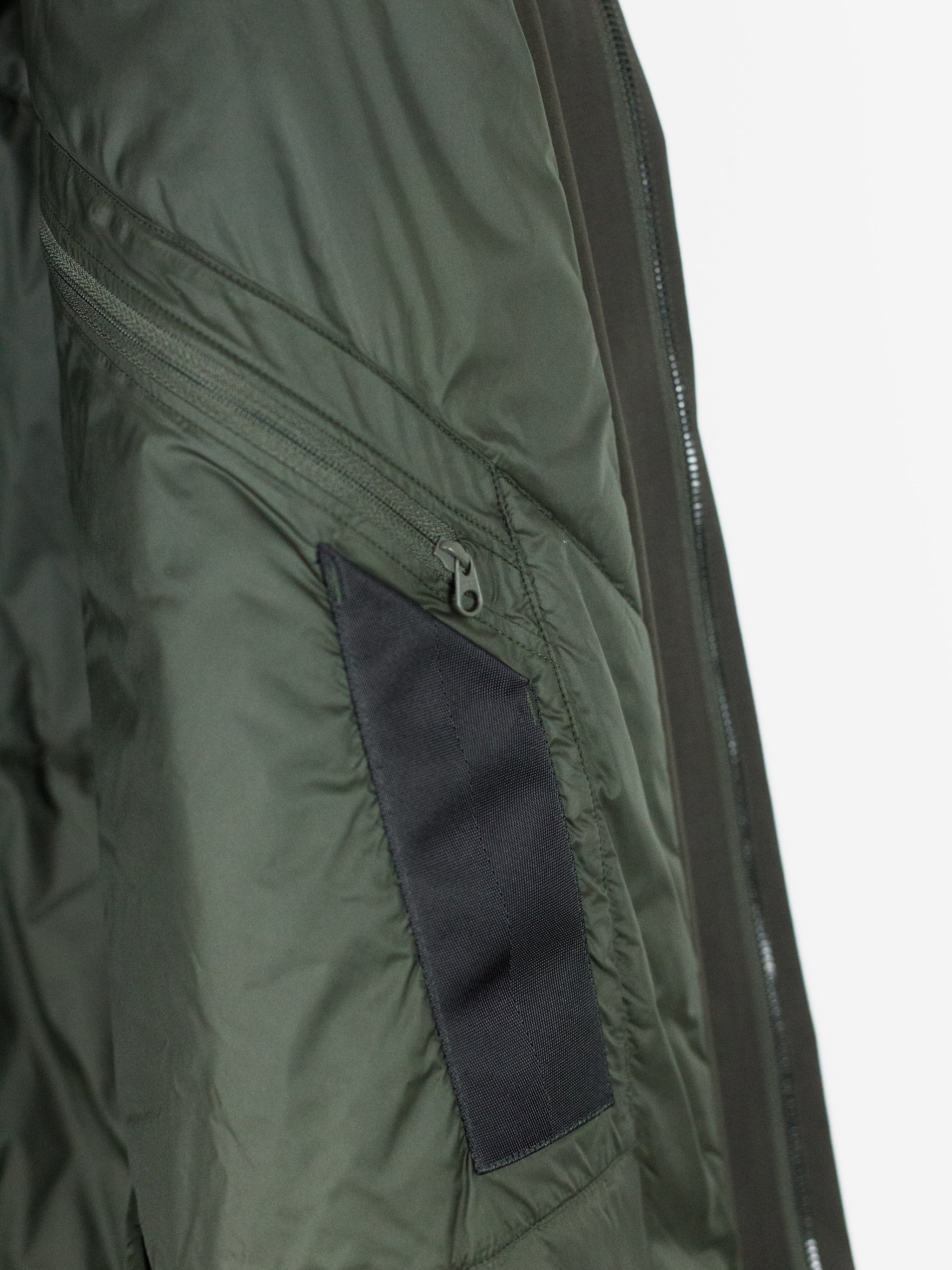 A mix of classical menswear shapes and cutting edge technical detailing, the Galvanic IS iterates on the archetypical men's mac coat. With its hidden zip front and side entry waist pockets hidden behind folded gore-tex, this coat presents as extremely minimal. But, upon closer inspection, the complexity of this piece is revealed in how it's been able to pack its performance into a shape that feels both familiar and freeing. The outer gore-tex face is sewn together with micro seam-allowances that minimize their visual appearance and allow them to lay flatter than they would sewn traditionally while the pattern pieces are anatomically fitted to the body to facilitated unrestricted movement--this is seen in the curved construction of the sleeve and geometrically gusseted underarms. Shaped laminated cuffs with an underlying softshell wrist gasket cut a sharp profile at the wrist and provide extra weather protection while allowing full dexterity. These features imbue the Galvanic IS with an impression that appears almost architectural in its sharpness and angularity. The Galvanis IS features variable insulation with 80 gsm coreloft in the body and lighter 60 gsm coreloft in the arms to reduce bulk. It is finished with matte black two-way zip front closure with offset zero-snap at neck, snap-in detachable hood, two spacious interior zip-close stash pockets, interior pen-pocket.