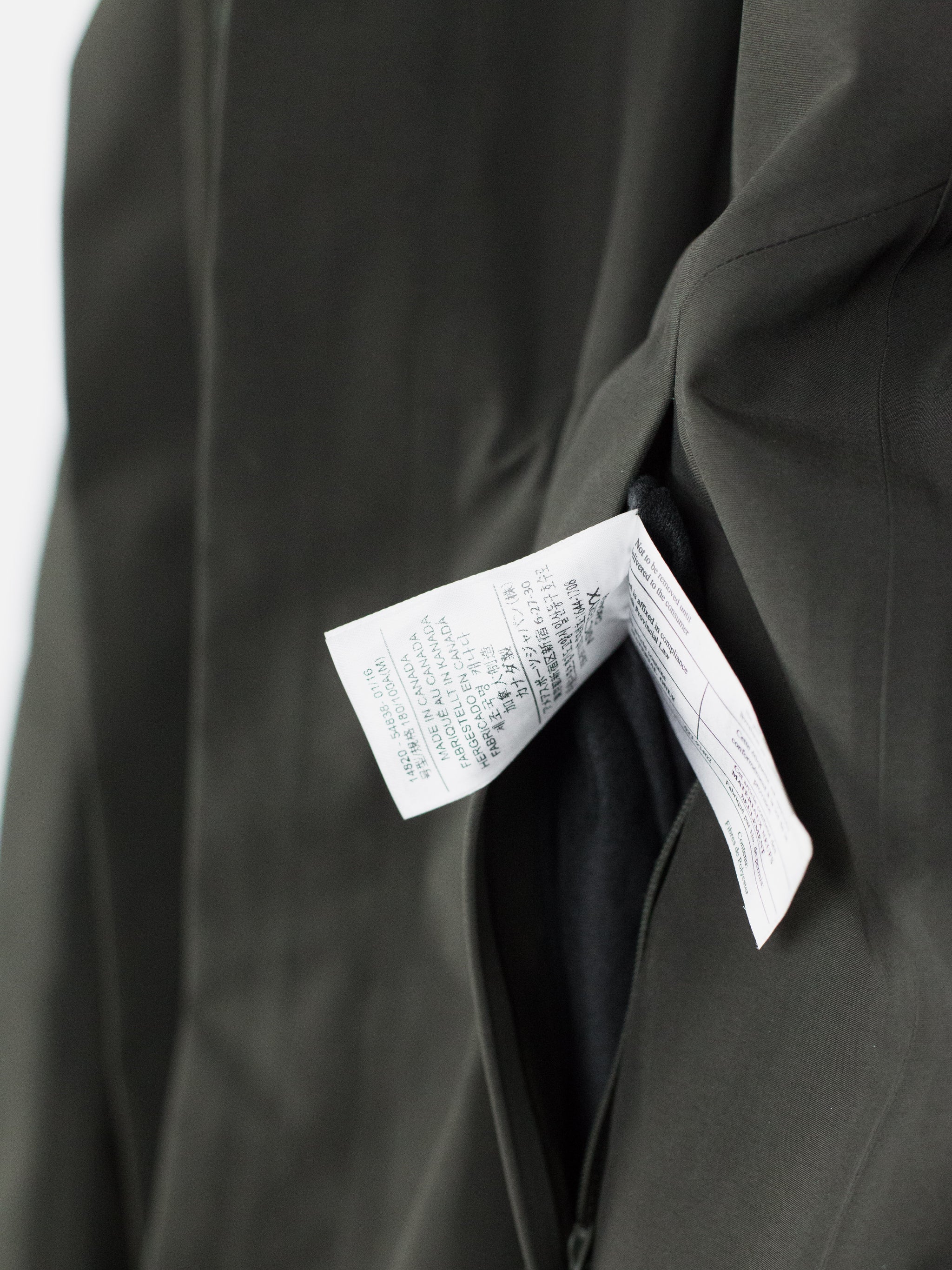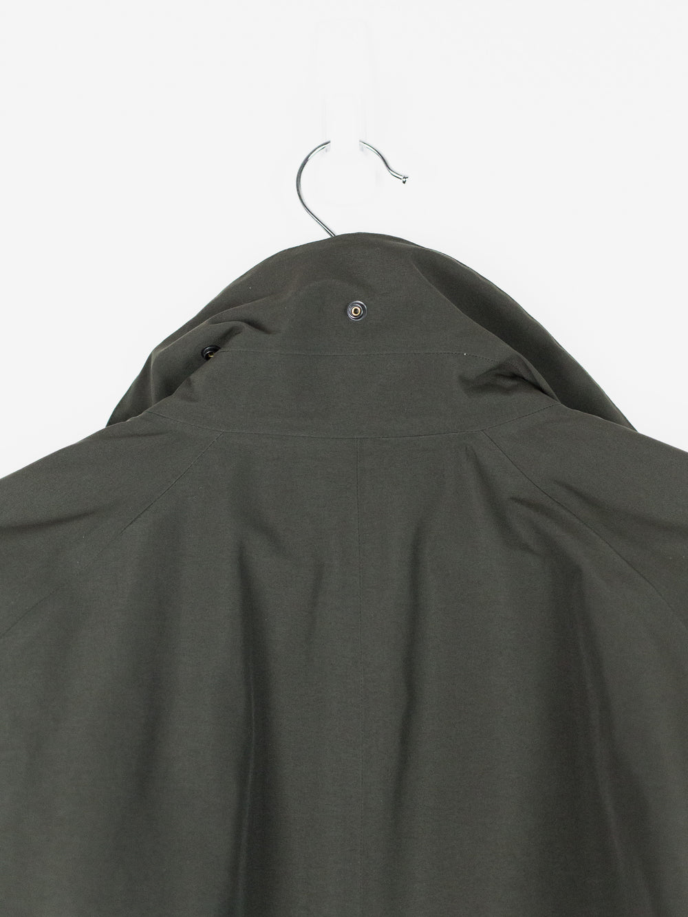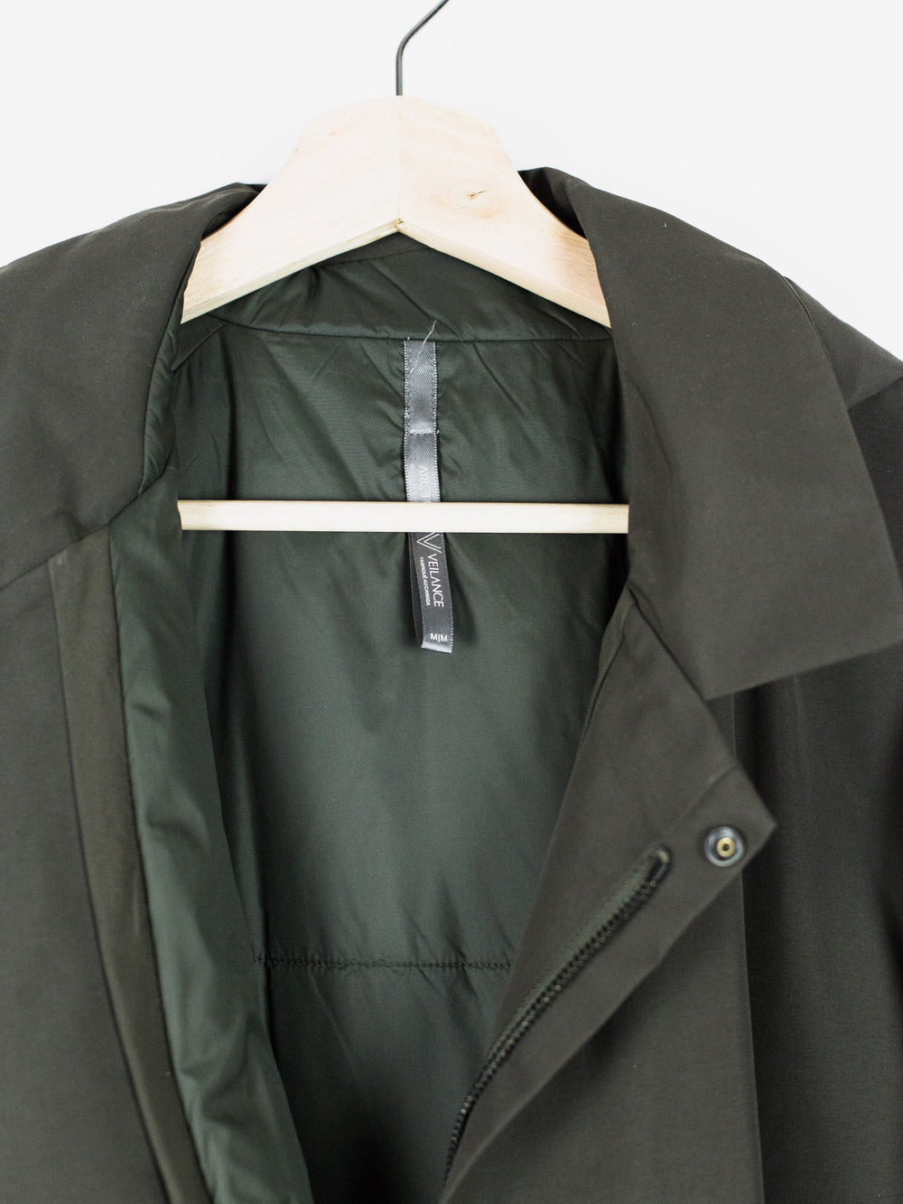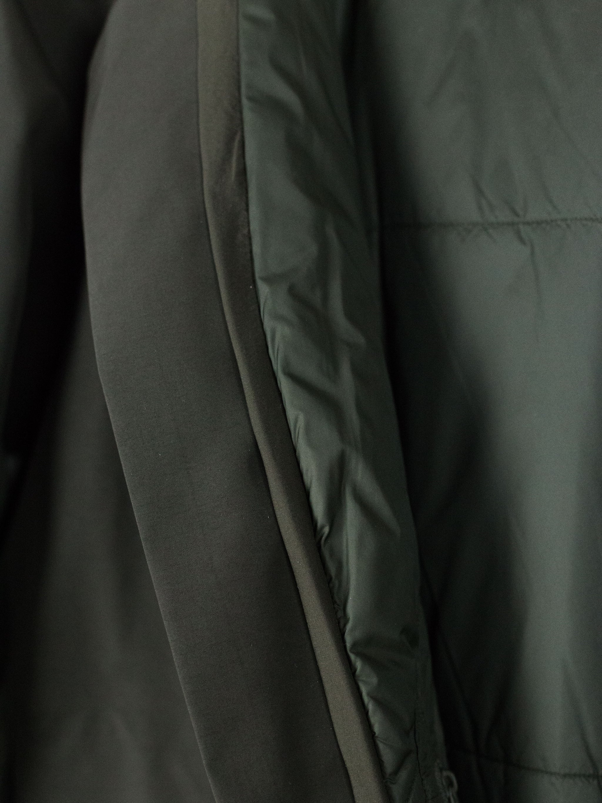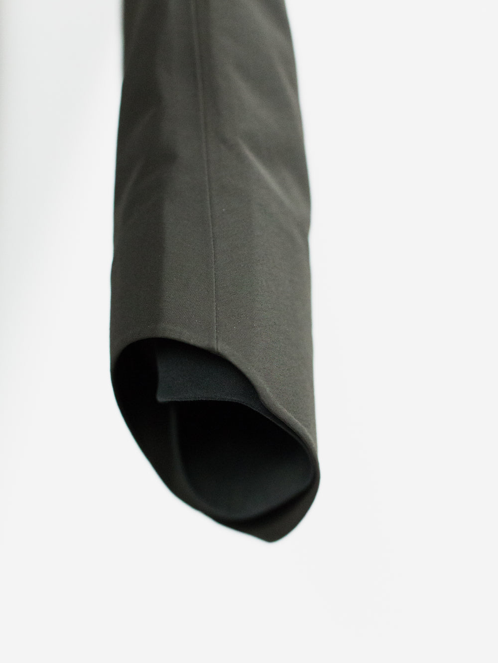 A mix of classical menswear shapes and cutting edge technical detailing, the Galvanic IS iterates on the archetypical men's mac coat. With its hidden zip front and side entry waist pockets hidden behind folded gore-tex, this coat presents as extremely minimal. But, upon closer inspection, the complexity of this piece is revealed in how it's been able to pack its performance into a shape that feels both familiar and freeing. The outer gore-tex face is sewn together with micro seam-allowances that minimize their visual appearance and allow them to lay flatter than they would sewn traditionally while the pattern pieces are anatomically fitted to the body to facilitated unrestricted movement--this is seen in the curved construction of the sleeve and geometrically gusseted underarms. Shaped laminated cuffs with an underlying softshell wrist gasket cut a sharp profile at the wrist and provide extra weather protection while allowing full dexterity. These features imbue the Galvanic IS with an impression that appears almost architectural in its sharpness and angularity. The Galvanis IS features variable insulation with 80 gsm coreloft in the body and lighter 60 gsm coreloft in the arms to reduce bulk. It is finished with matte black two-way zip front closure with offset zero-snap at neck, snap-in detachable hood, two spacious interior zip-close stash pockets, interior pen-pocket.