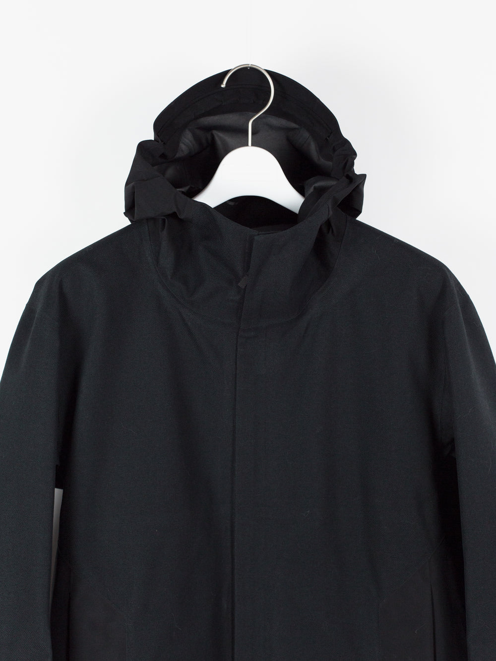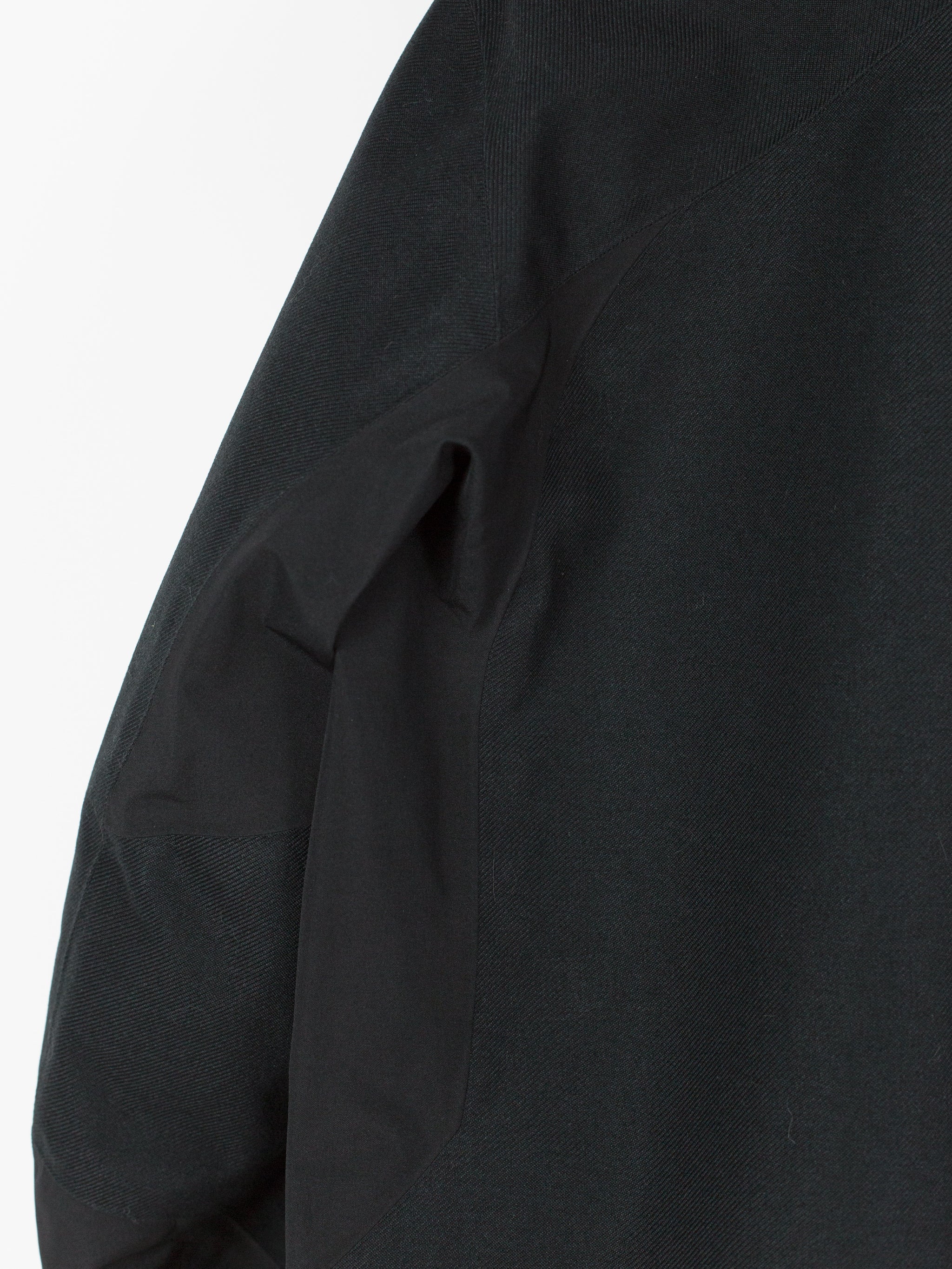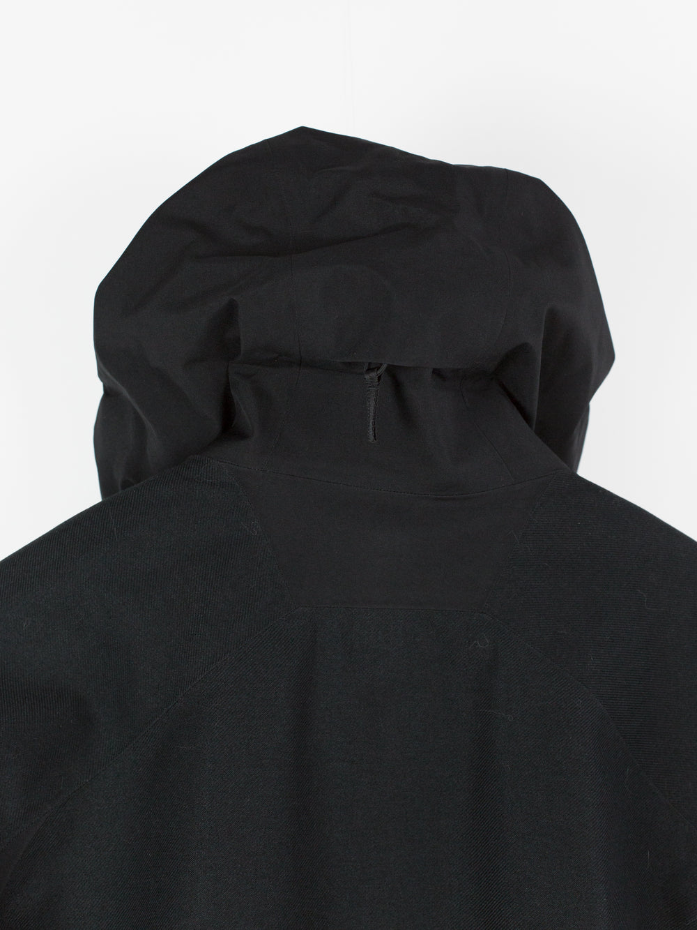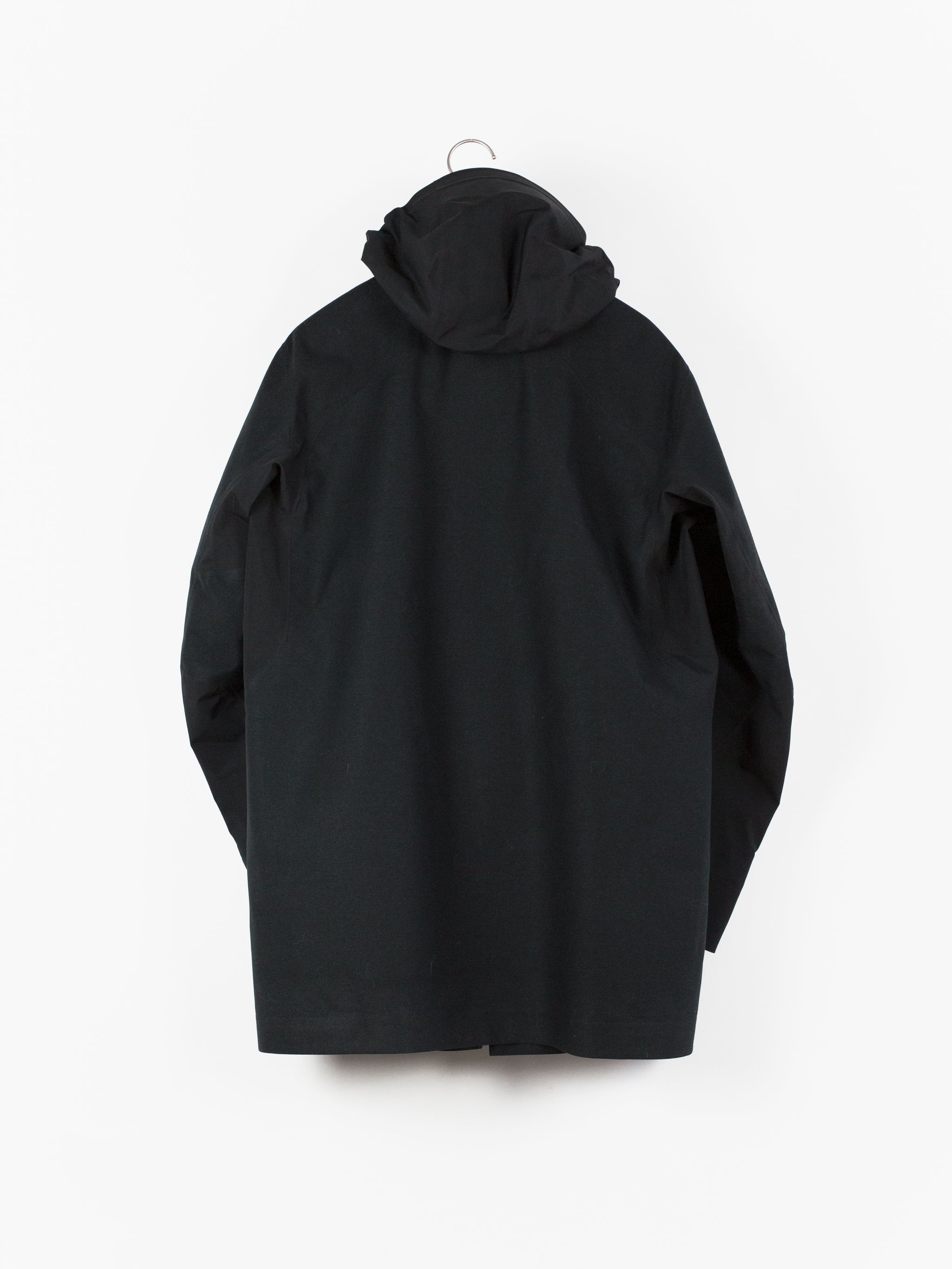 3L Gore-tex coat from Veilance's AW19 collection which features composition panelling of 80d nylon and their new twill weave face fabric, a nylon/polyester blend that retains all the expected technical properties of gore-tex but has the soft hand and natural look of a wool twill. This is the fabric's first appearance in the main collection (aside from the Special Makeup Monitor Down coats) and also the first appearance of the Navier AR silhouette. It is a slightly cropped coat with a sleek, slim fit through body and sleeves and an extremely minimalist finishing. The 3-point-adjust storm hood which combines collar and hood streamlines the silhouette, the hem is cut straight and plain, the matte black center front zip is covered by a low profile placket, and the zippered side entry pockets are set on a foldback gusset, hiding the hardware and pushing the bulk inwards for reduced visual signature when viewed from the front. All of these stripped back elements and the subtle contrast in materiality puts the emphasis on the patternmaking, the transition between plainweave nylon and tech twill polyester highlighting the curved sleeves, the shaped shoulders and back, and underarm gusseting. Finished with two interior zipped pockets and softshell gasket cuff set within gore-tex cuff.