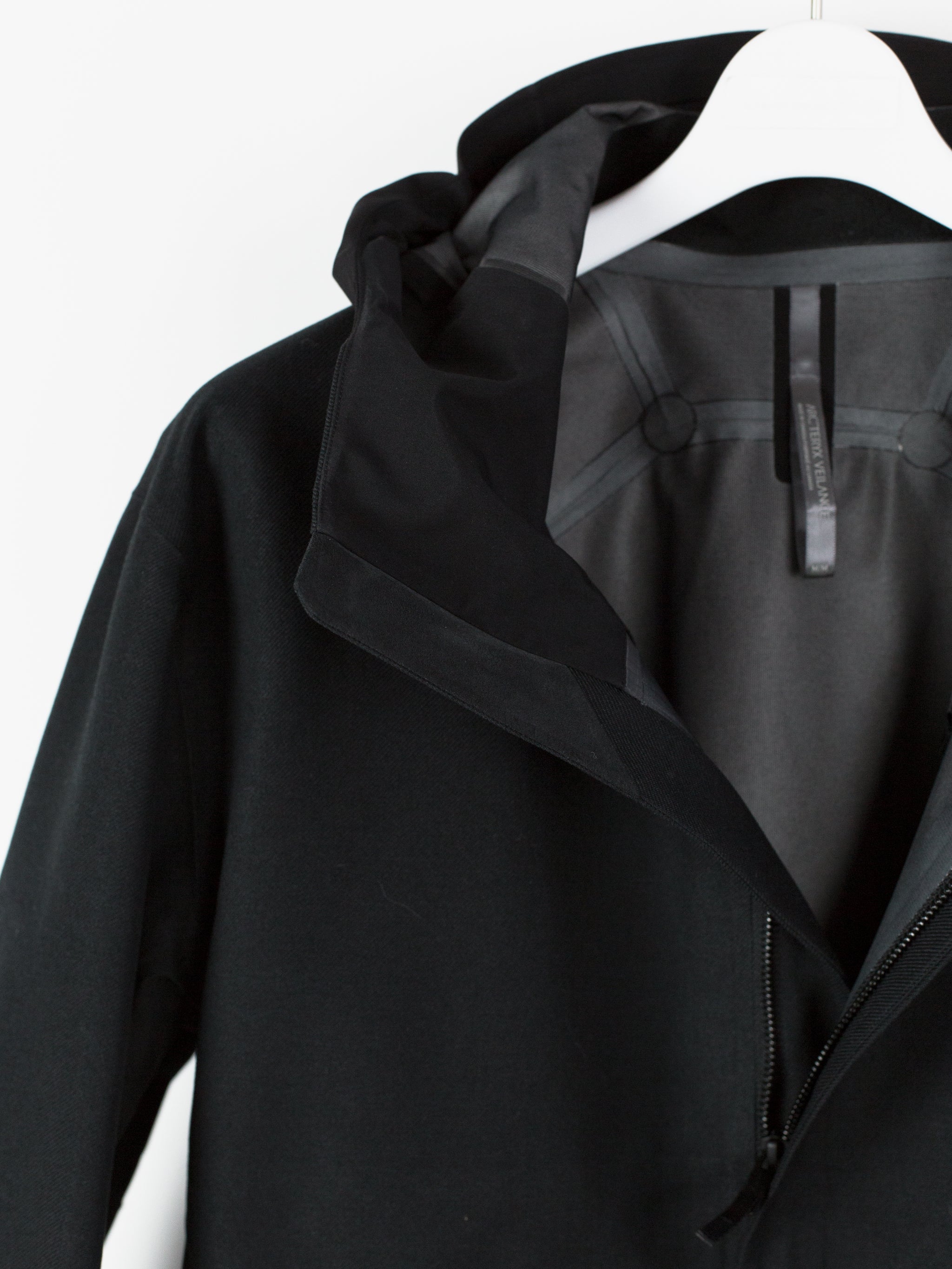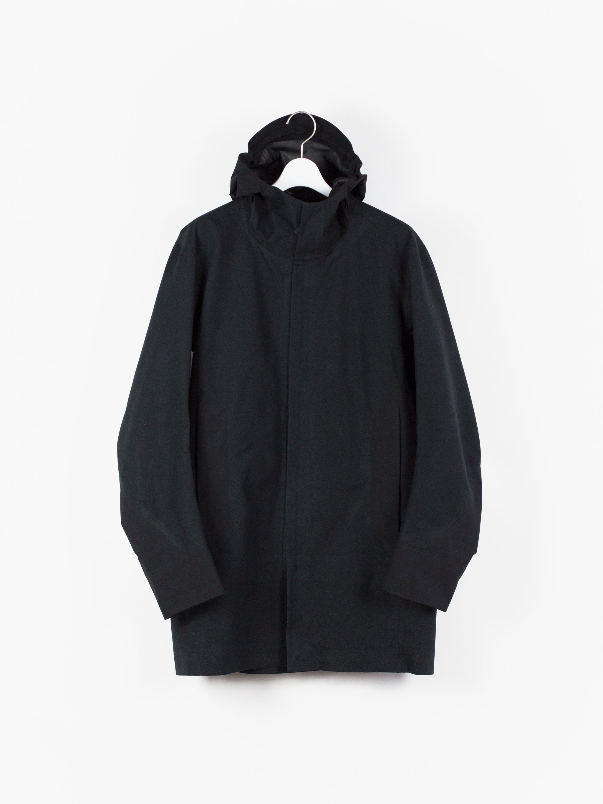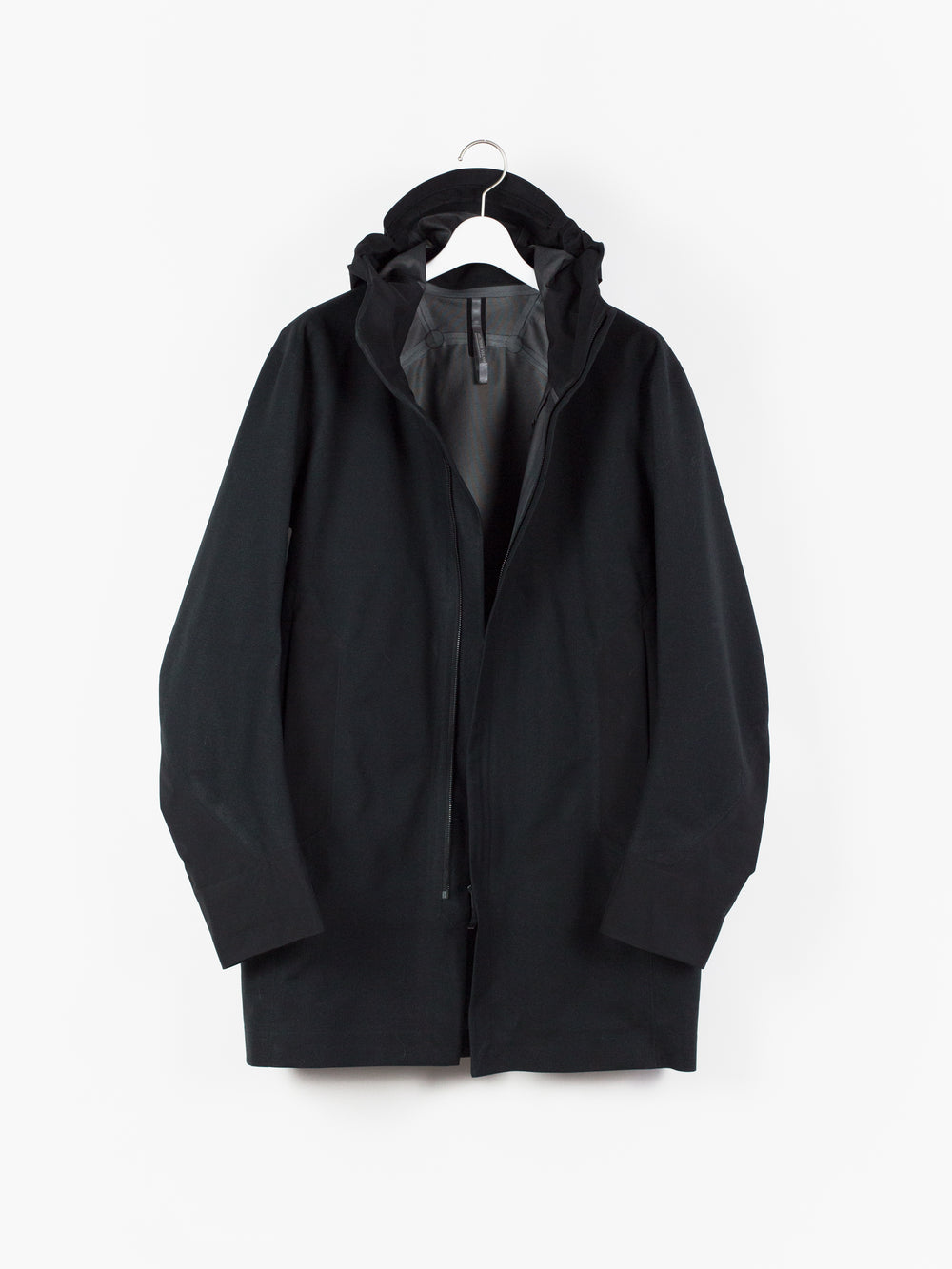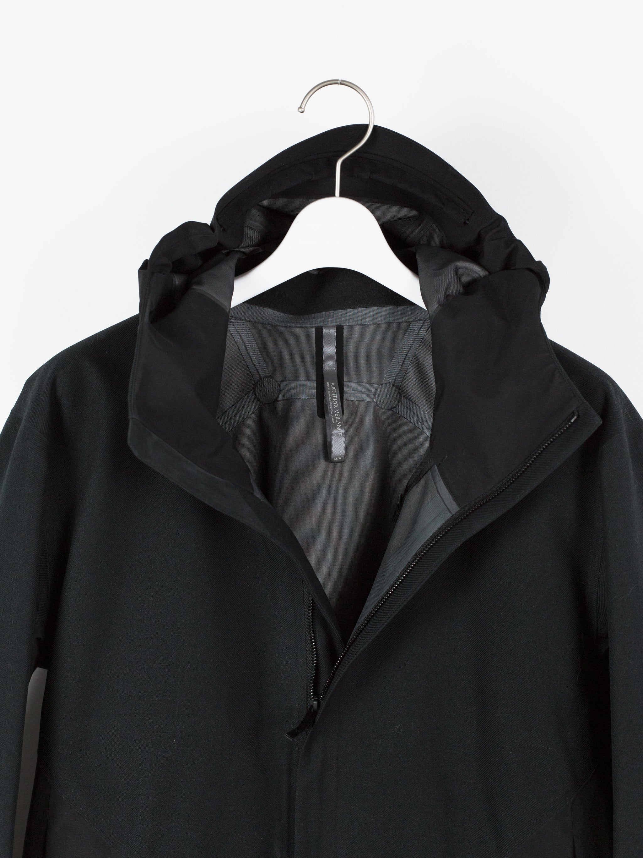 3L Gore-tex coat from Veilance's AW19 collection which features composition panelling of 80d nylon and their new twill weave face fabric, a nylon/polyester blend that retains all the expected technical properties of gore-tex but has the soft hand and natural look of a wool twill. This is the fabric's first appearance in the main collection (aside from the Special Makeup Monitor Down coats) and also the first appearance of the Navier AR silhouette. It is a slightly cropped coat with a sleek, slim fit through body and sleeves and an extremely minimalist finishing. The 3-point-adjust storm hood which combines collar and hood streamlines the silhouette, the hem is cut straight and plain, the matte black center front zip is covered by a low profile placket, and the zippered side entry pockets are set on a foldback gusset, hiding the hardware and pushing the bulk inwards for reduced visual signature when viewed from the front. All of these stripped back elements and the subtle contrast in materiality puts the emphasis on the patternmaking, the transition between plainweave nylon and tech twill polyester highlighting the curved sleeves, the shaped shoulders and back, and underarm gusseting. Finished with two interior zipped pockets and softshell gasket cuff set within gore-tex cuff.
