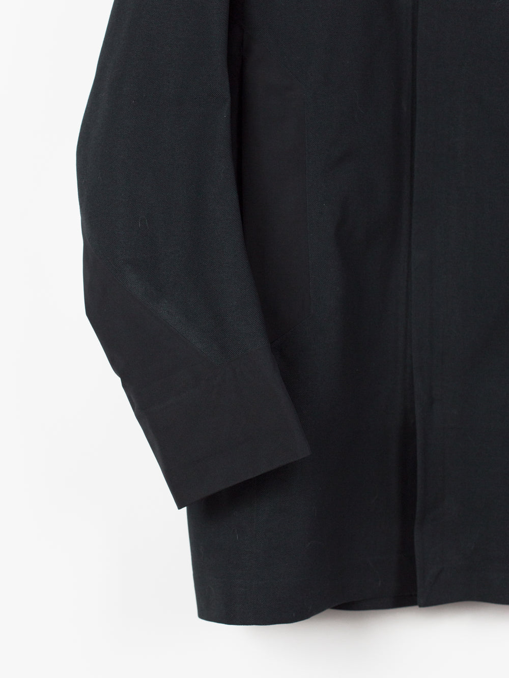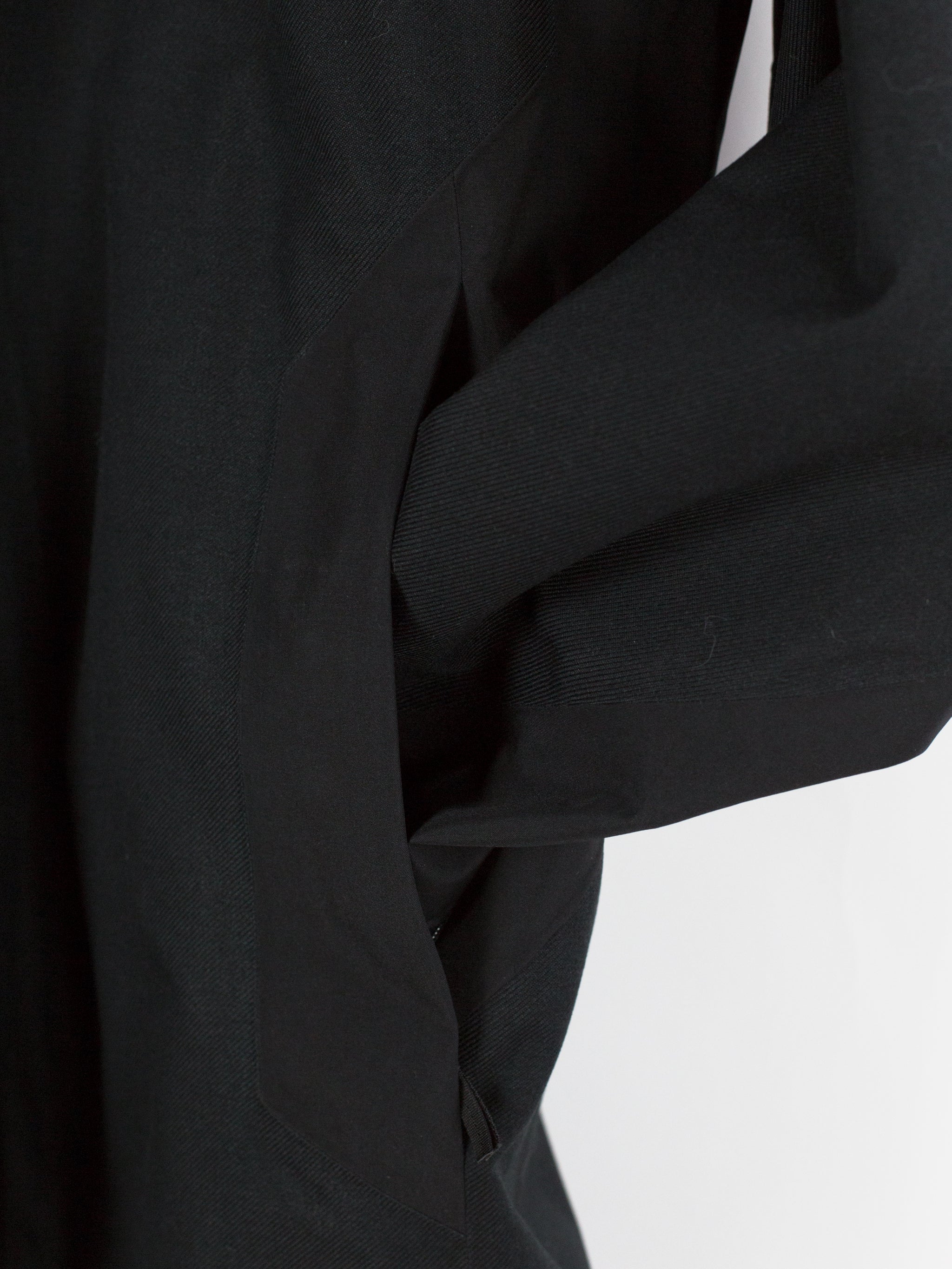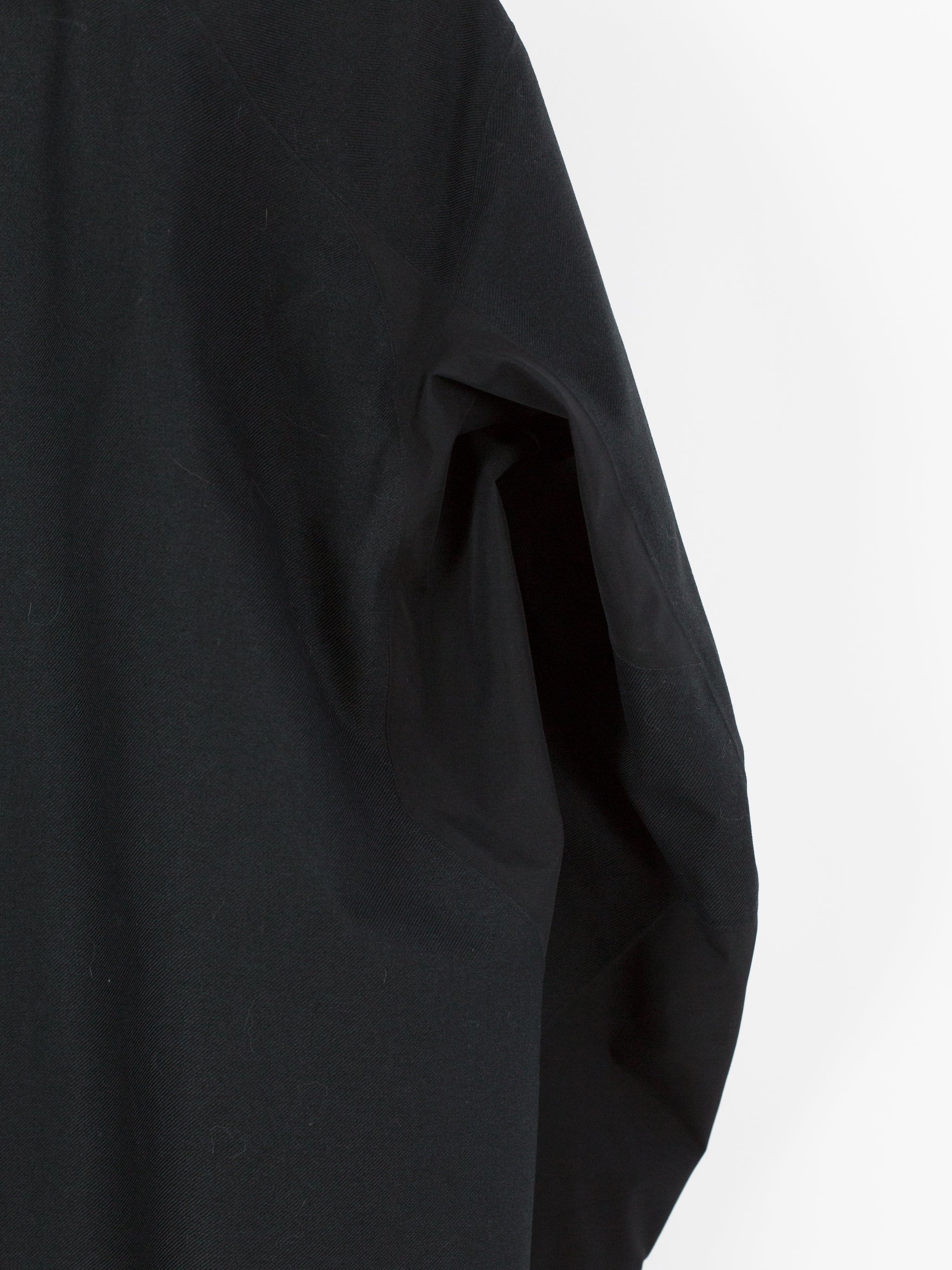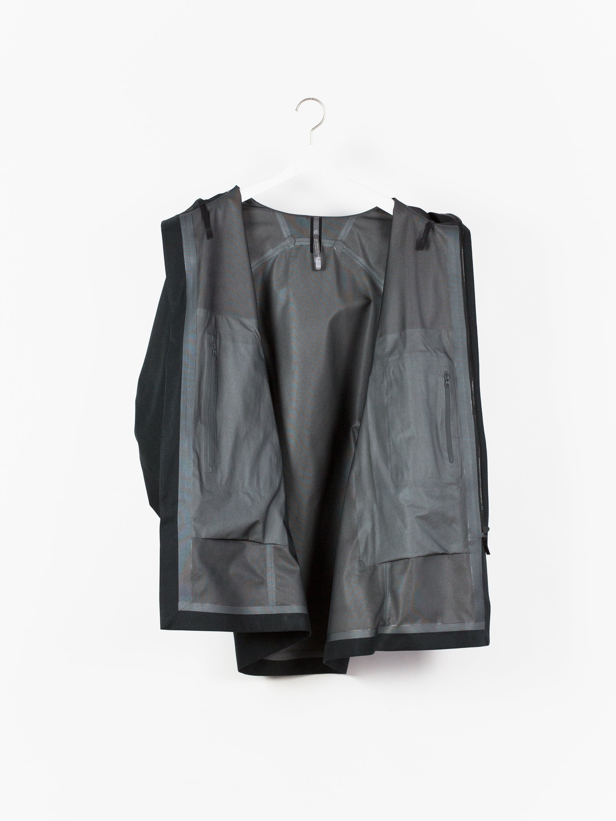 3L Gore-tex coat from Veilance's AW19 collection which features composition panelling of 80d nylon and their new twill weave face fabric, a nylon/polyester blend that retains all the expected technical properties of gore-tex but has the soft hand and natural look of a wool twill. This is the fabric's first appearance in the main collection (aside from the Special Makeup Monitor Down coats) and also the first appearance of the Navier AR silhouette. It is a slightly cropped coat with a sleek, slim fit through body and sleeves and an extremely minimalist finishing. The 3-point-adjust storm hood which combines collar and hood streamlines the silhouette, the hem is cut straight and plain, the matte black center front zip is covered by a low profile placket, and the zippered side entry pockets are set on a foldback gusset, hiding the hardware and pushing the bulk inwards for reduced visual signature when viewed from the front. All of these stripped back elements and the subtle contrast in materiality puts the emphasis on the patternmaking, the transition between plainweave nylon and tech twill polyester highlighting the curved sleeves, the shaped shoulders and back, and underarm gusseting. Finished with two interior zipped pockets and softshell gasket cuff set within gore-tex cuff.