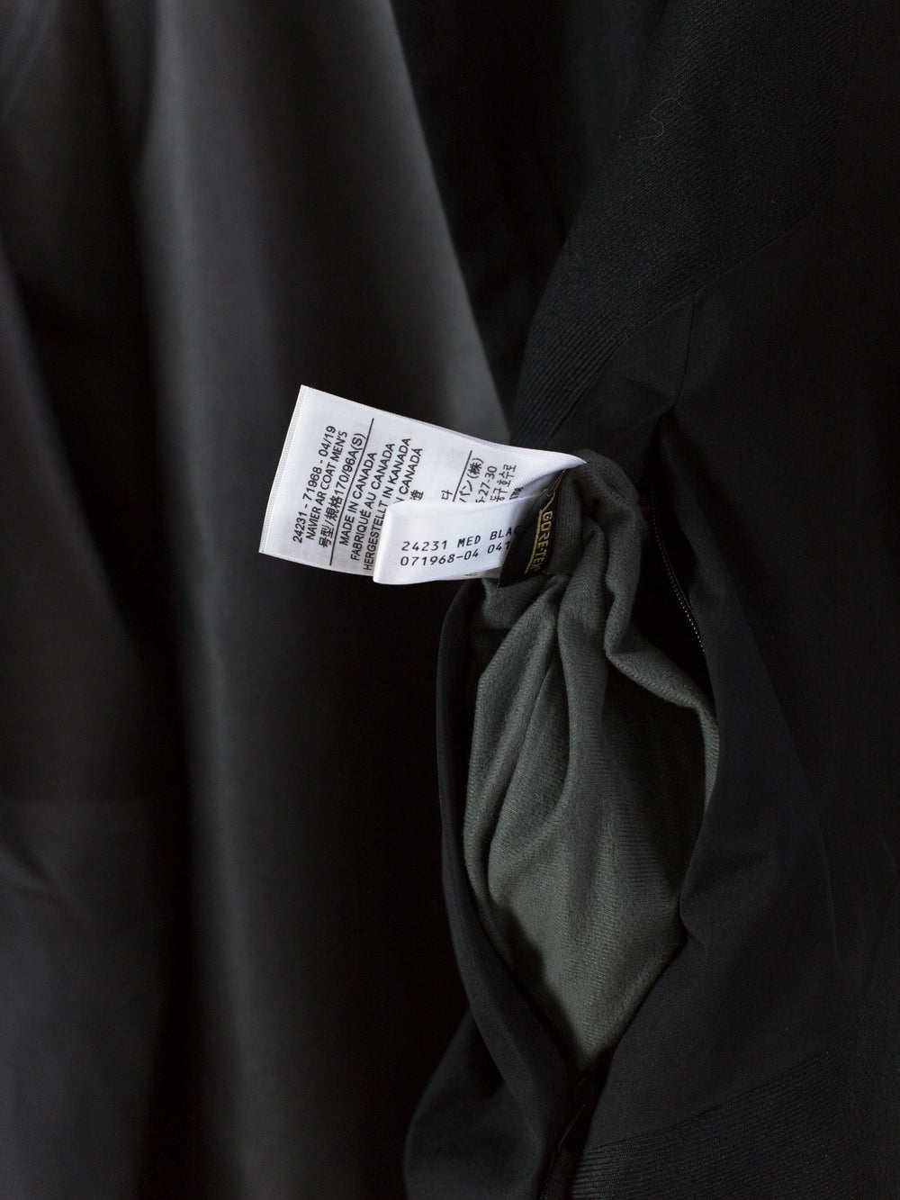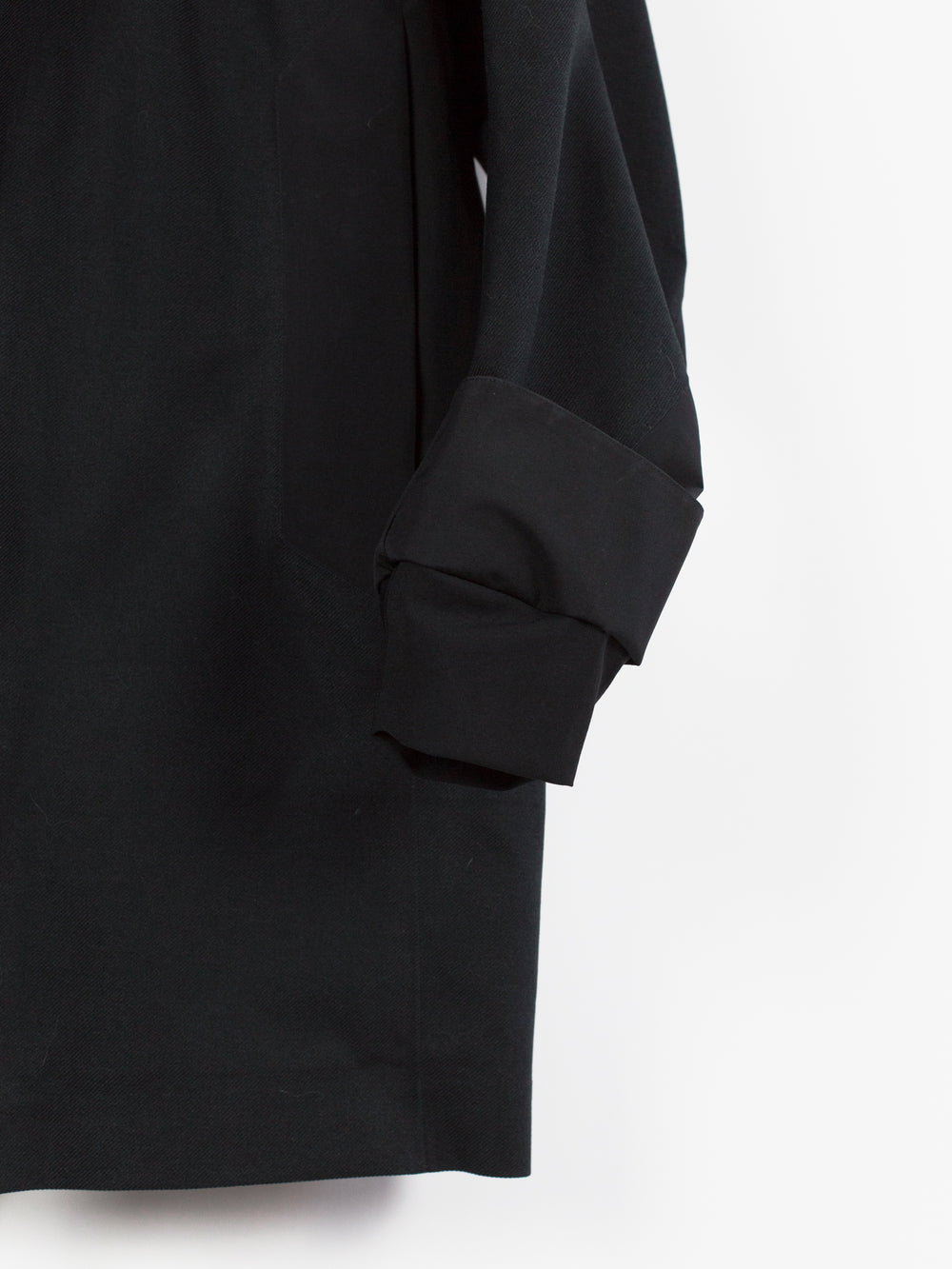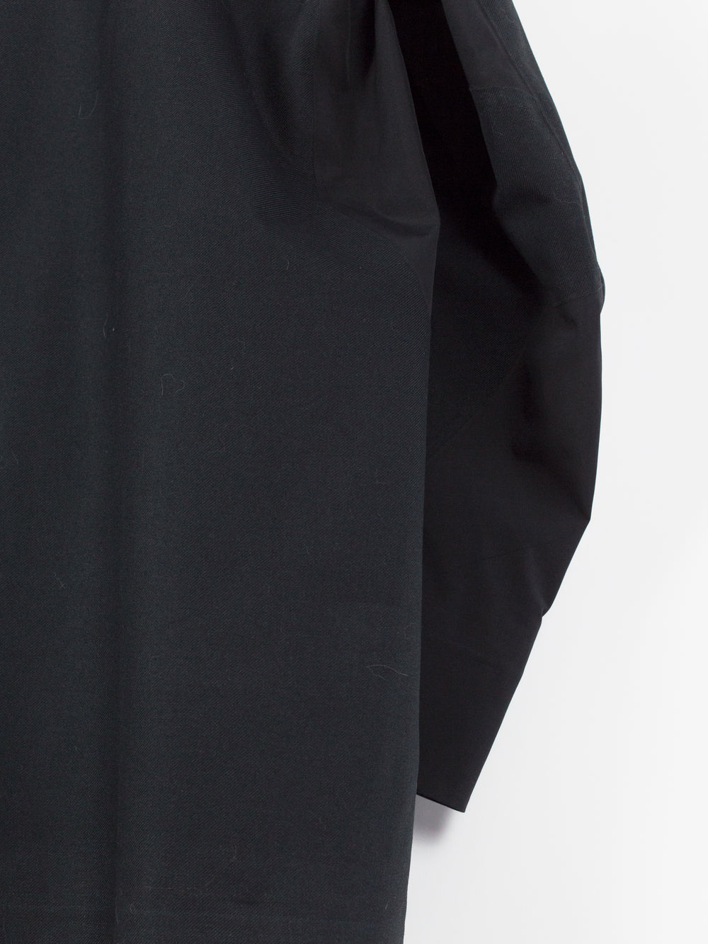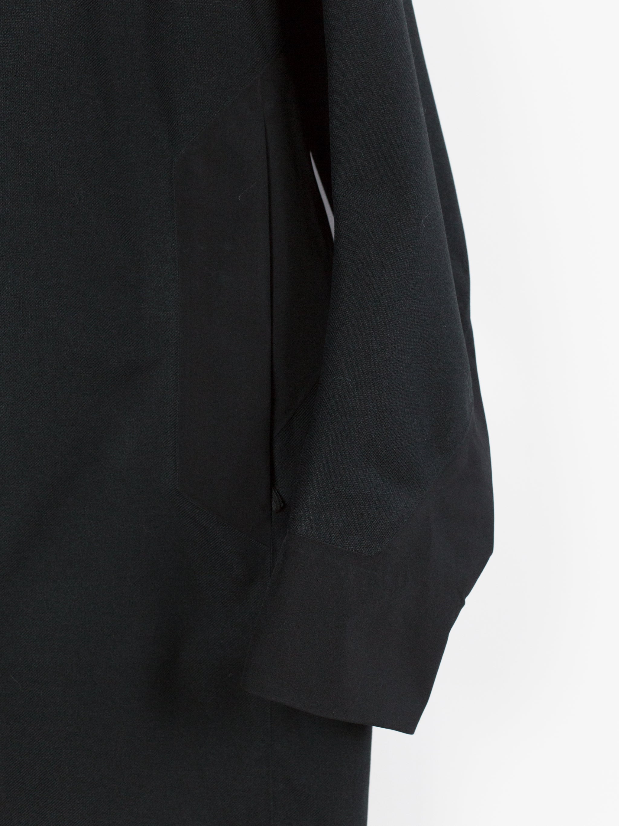 3L Gore-tex coat from Veilance's AW19 collection which features composition panelling of 80d nylon and their new twill weave face fabric, a nylon/polyester blend that retains all the expected technical properties of gore-tex but has the soft hand and natural look of a wool twill. This is the fabric's first appearance in the main collection (aside from the Special Makeup Monitor Down coats) and also the first appearance of the Navier AR silhouette. It is a slightly cropped coat with a sleek, slim fit through body and sleeves and an extremely minimalist finishing. The 3-point-adjust storm hood which combines collar and hood streamlines the silhouette, the hem is cut straight and plain, the matte black center front zip is covered by a low profile placket, and the zippered side entry pockets are set on a foldback gusset, hiding the hardware and pushing the bulk inwards for reduced visual signature when viewed from the front. All of these stripped back elements and the subtle contrast in materiality puts the emphasis on the patternmaking, the transition between plainweave nylon and tech twill polyester highlighting the curved sleeves, the shaped shoulders and back, and underarm gusseting. Finished with two interior zipped pockets and softshell gasket cuff set within gore-tex cuff.