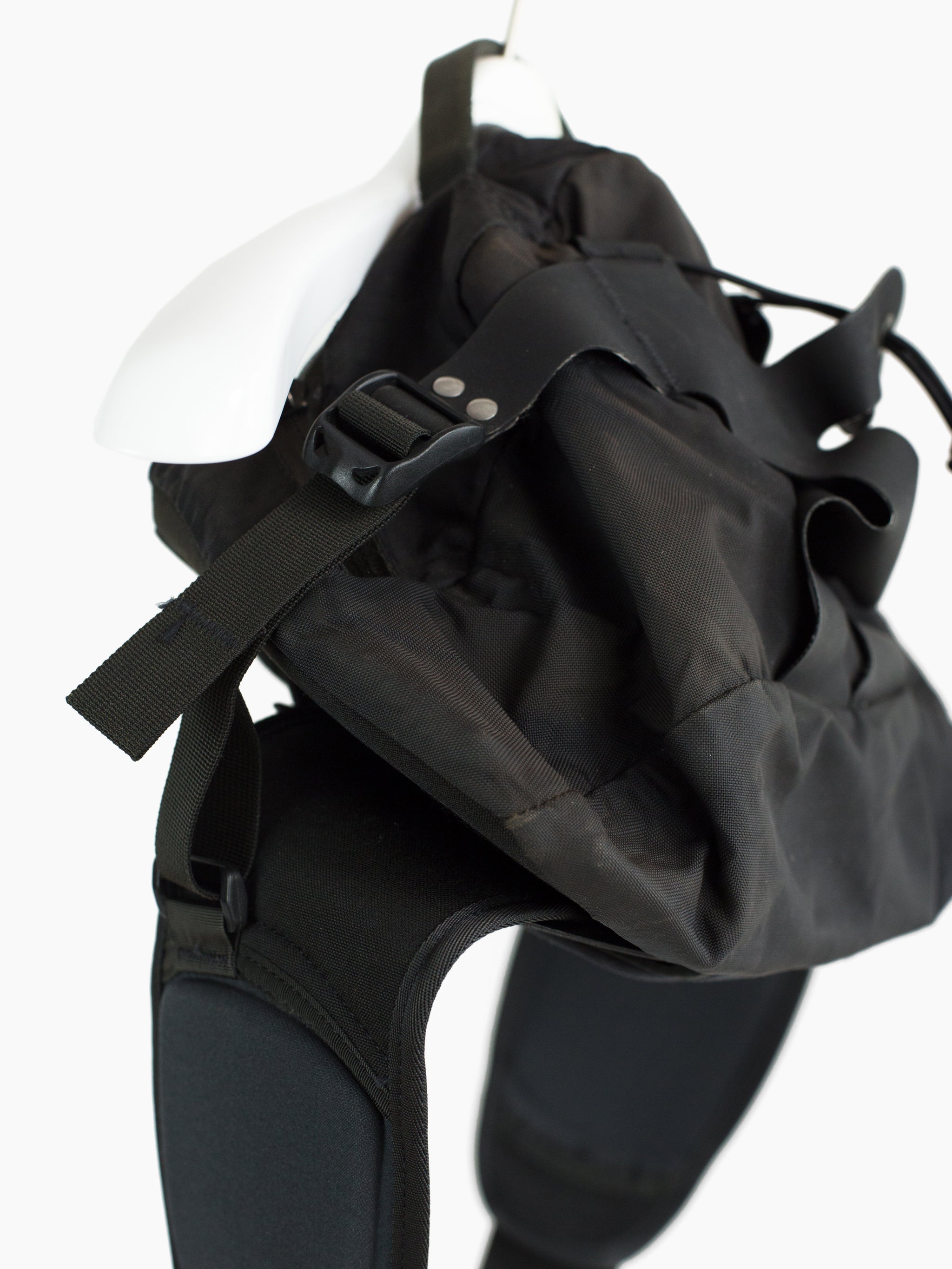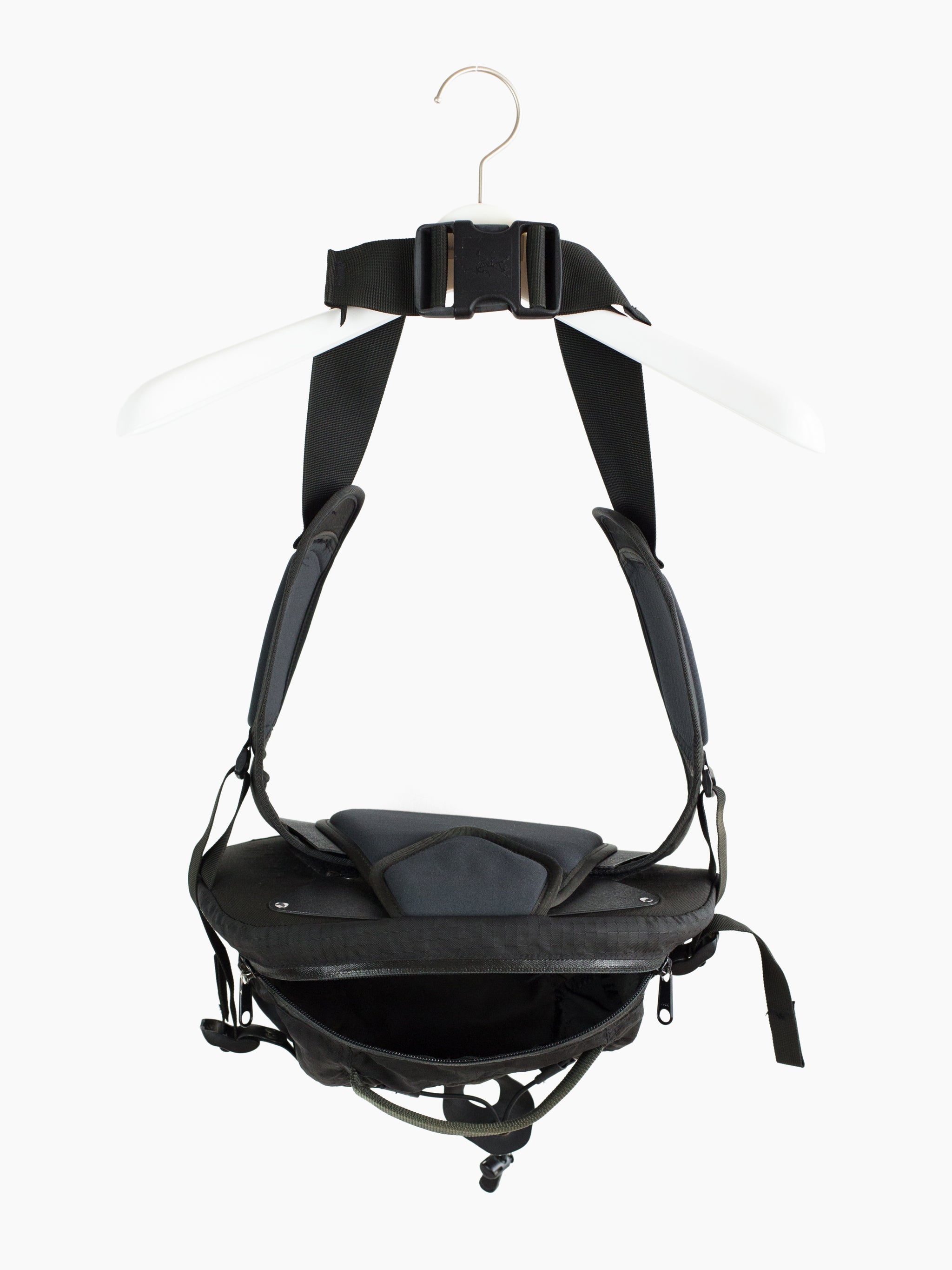Hip bag from outdoor specialists Arc'teryx. This Q5 Lumbar pack features a cavernous main pocket with interior zippered stash pocket as well as a shockcord-laced open air cage on the outside for carrying water bottles, wet items, etc. Soft, plush padding at the back and sides makes for a comfortable carry experience either across the body or at the hips. Arc'teryx Logo has been dyed tonal black for a more covert atmosphere, which also allows the beautifully sun-faded patina to take center stage.
