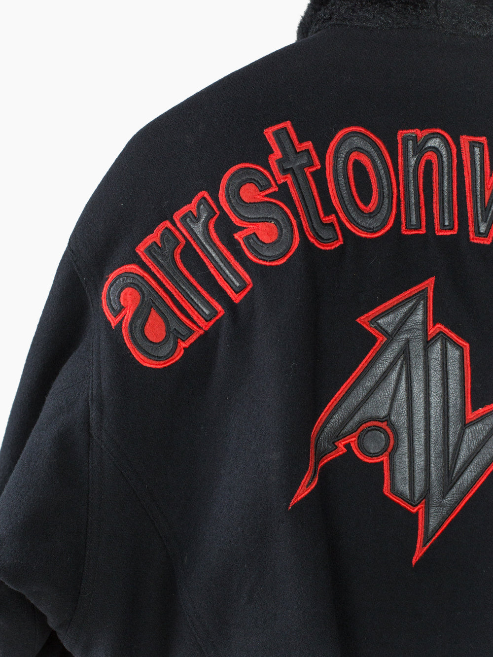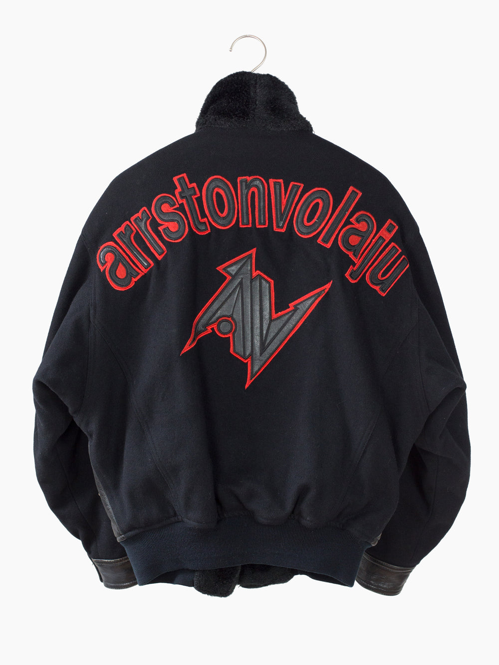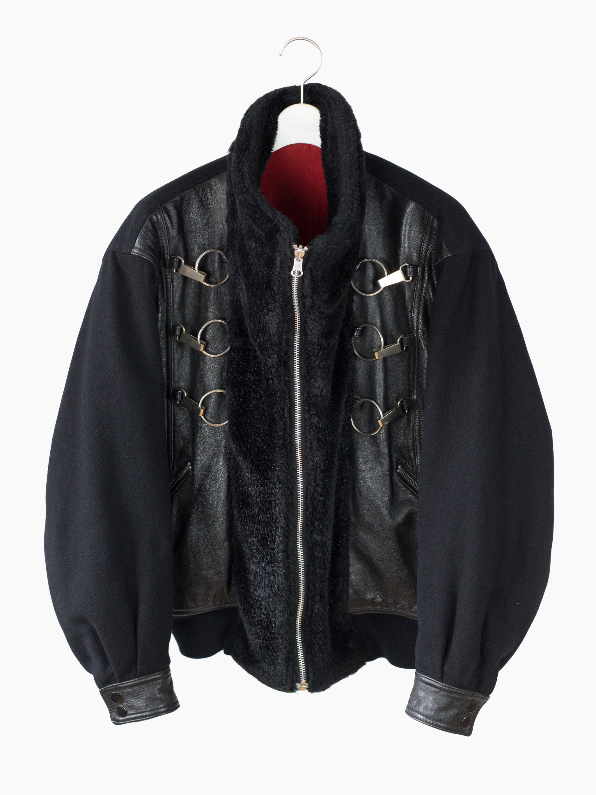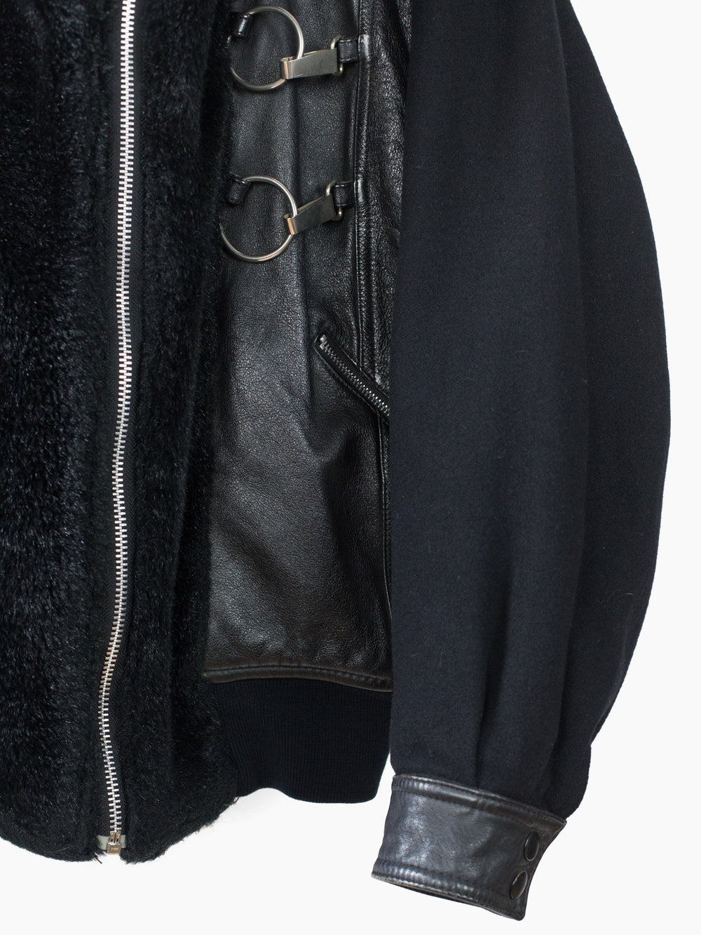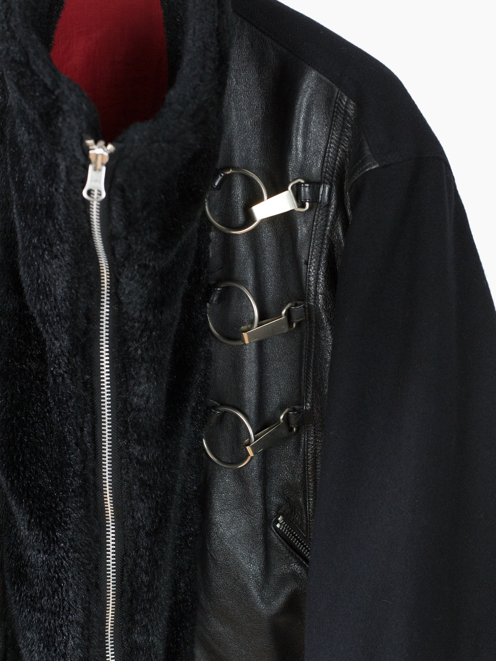 Mixed Material varsity/bomber hybrid from 80s Arrston Volaju, featuring contrast faux fur/wool melton/leather materials throughout all in black. Front chest is accented with metal rings and clasps as decorative elements, forming an abstract skeletal design that the wearer can play around with, attaching charms, keys, scarves, or other trinkets. The back features bold two-tone leather patch 'Arrston Volaju' insignia alongside razor sharp 'AV' monogram in the center.