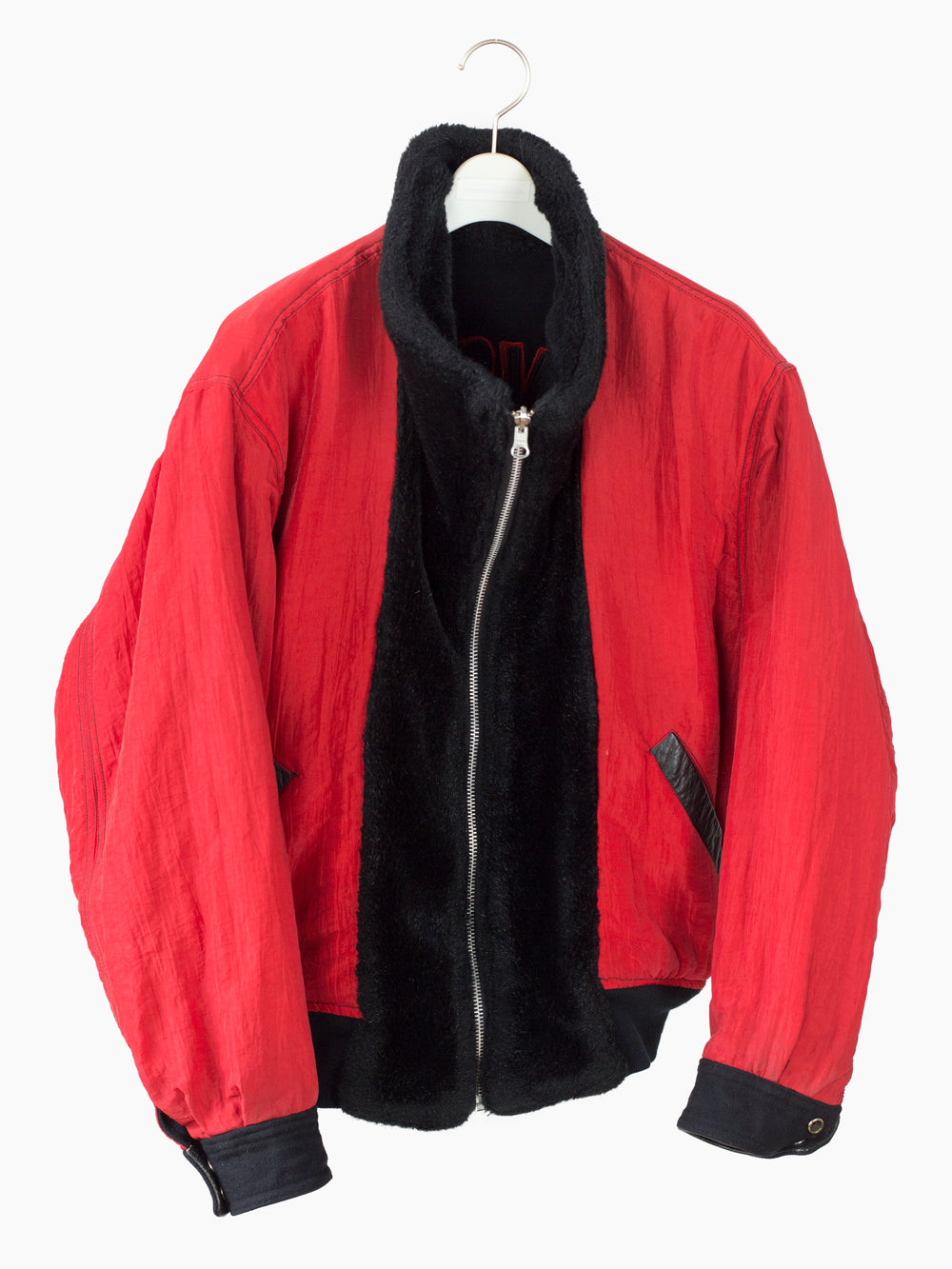 The whole garment is fully reversible, revealing a red crinkle nylon interior with its own leather-trimmed welt waist pockets.