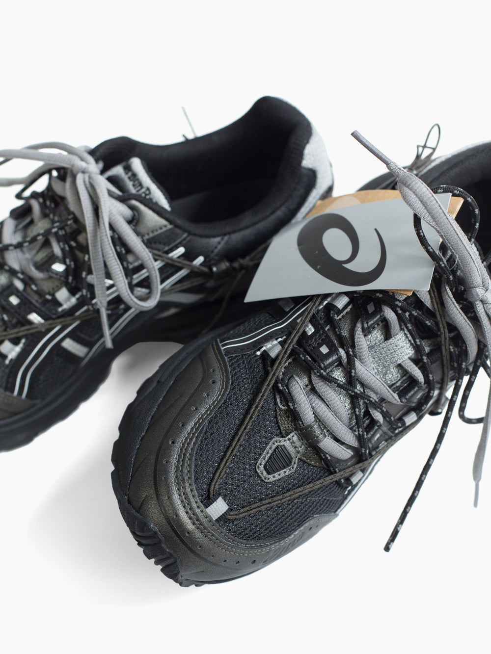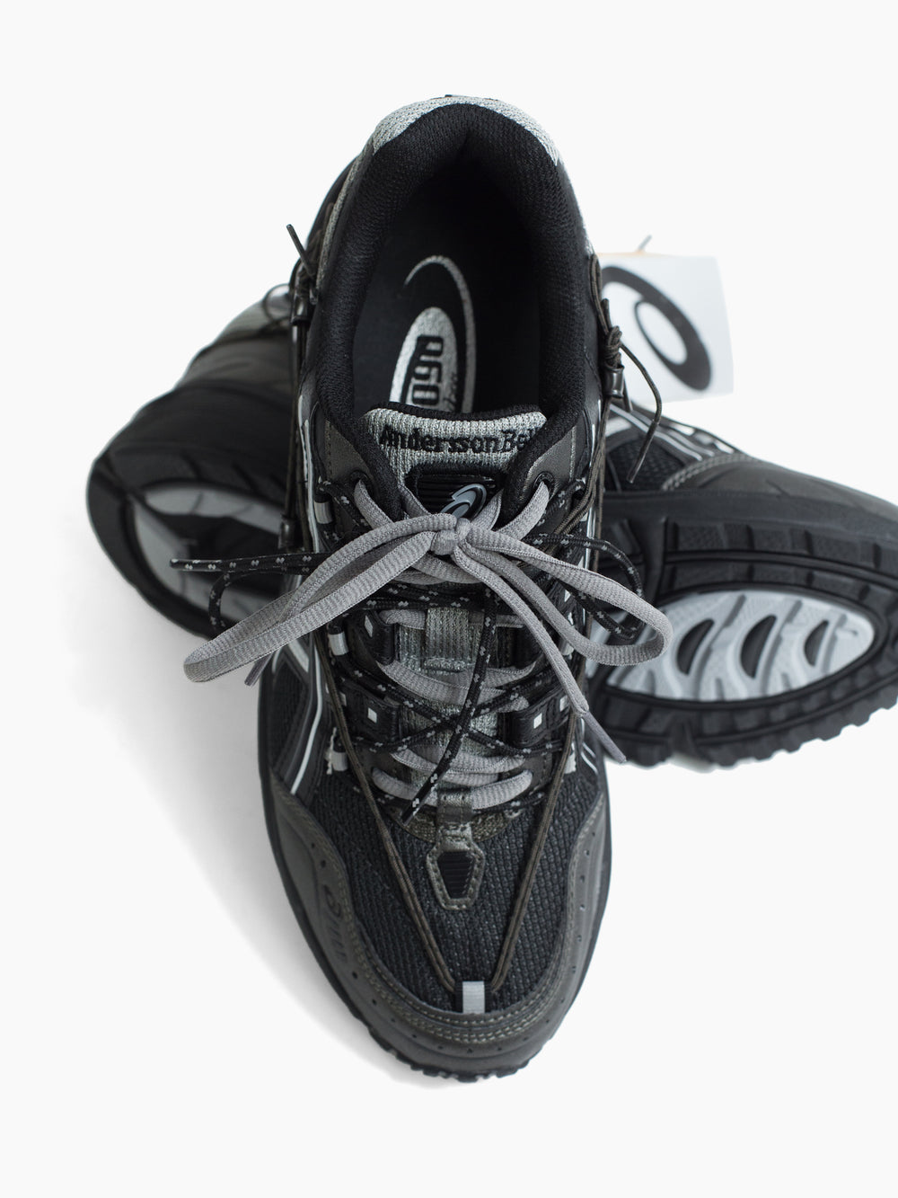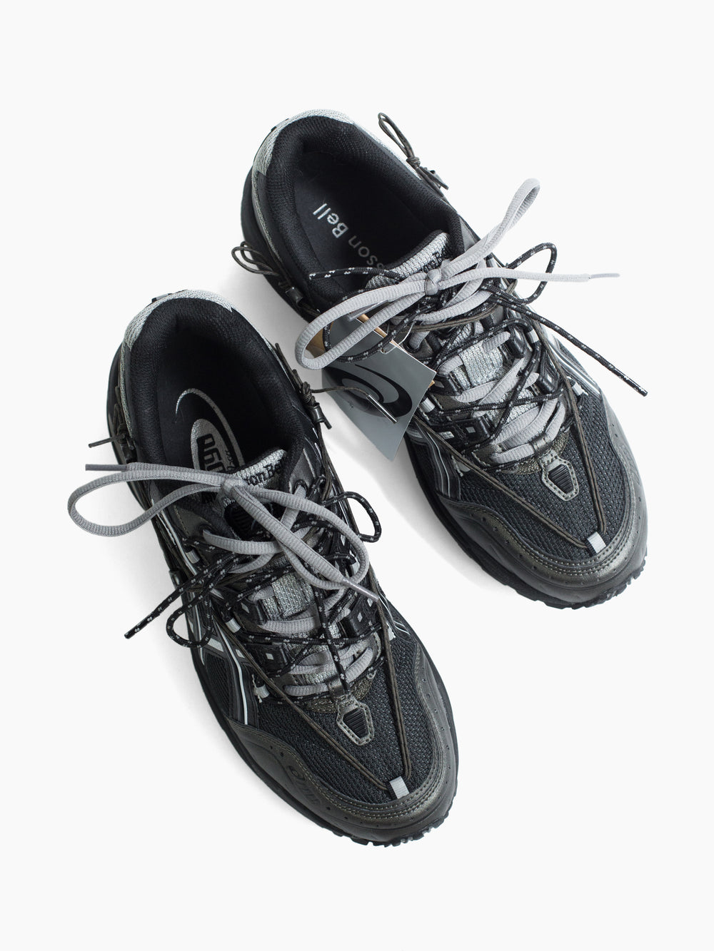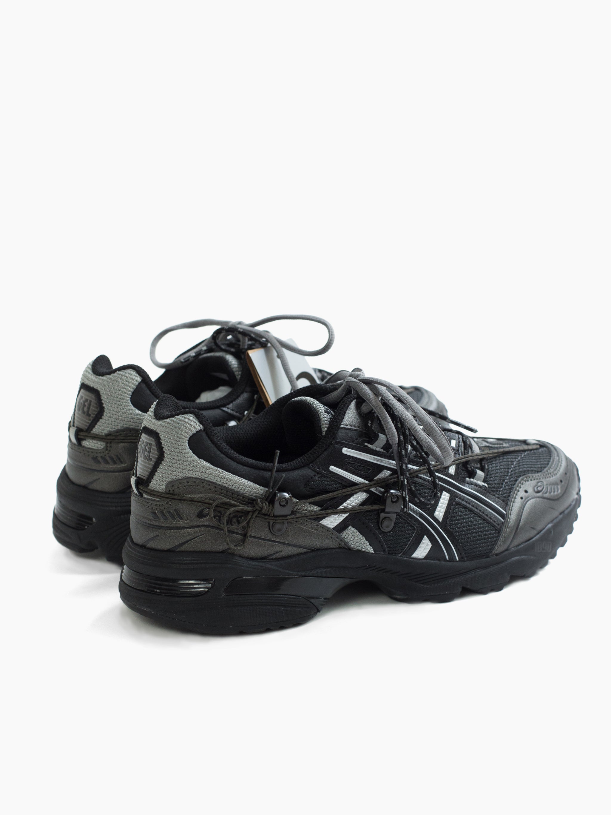 Noisy, layered collaboration version of the Gel-1090. Andersson Bell layers a web of wire over the entire shoe, doubling the lacing panel and creating an incredibly rich mix of textures and lines. Tones of grey and black are punctuated with light grey accents creating tons of depth despite the color palette being muted. Invokes imagery of building scaffolding, lead rope climbing, etc.