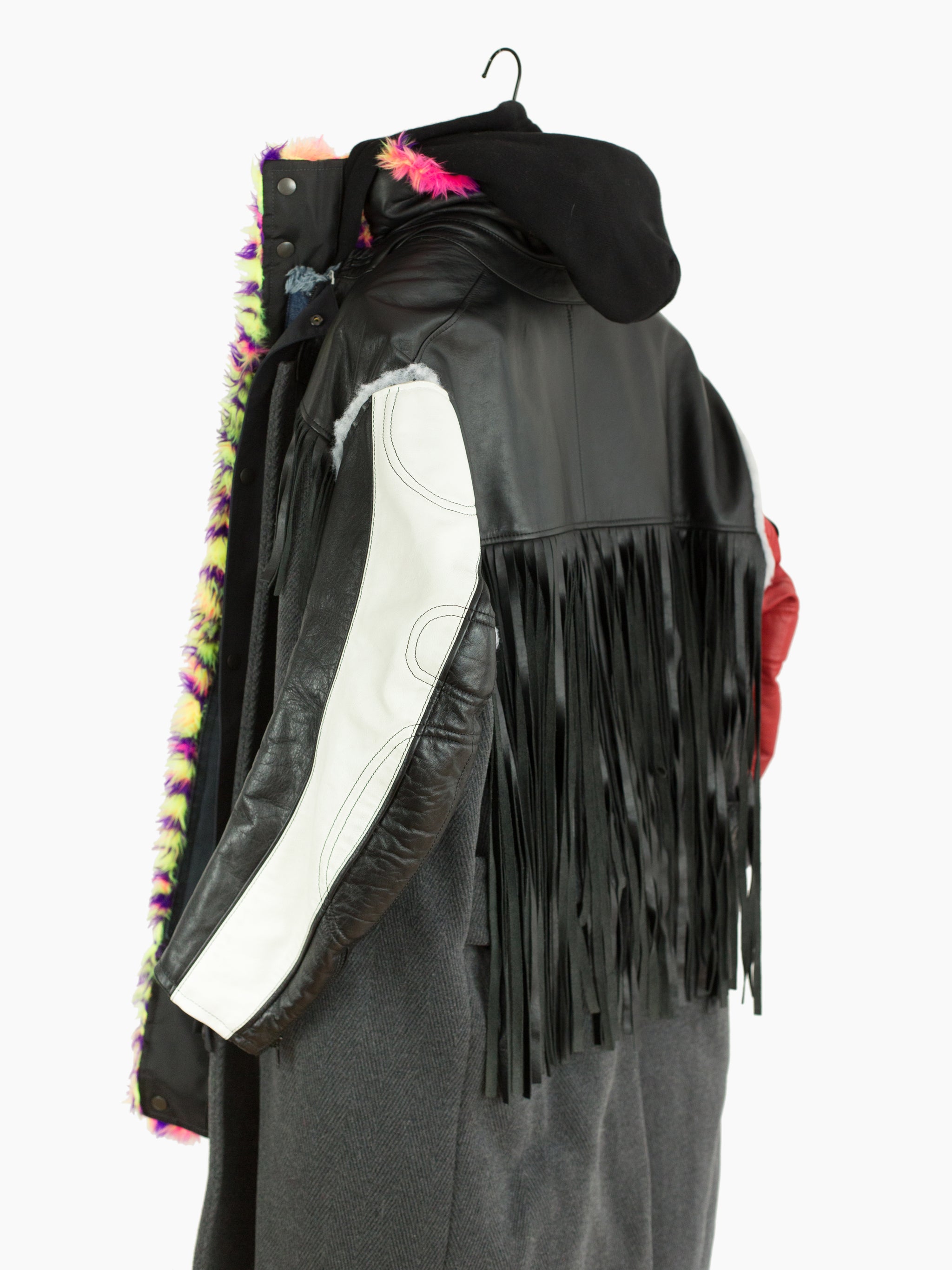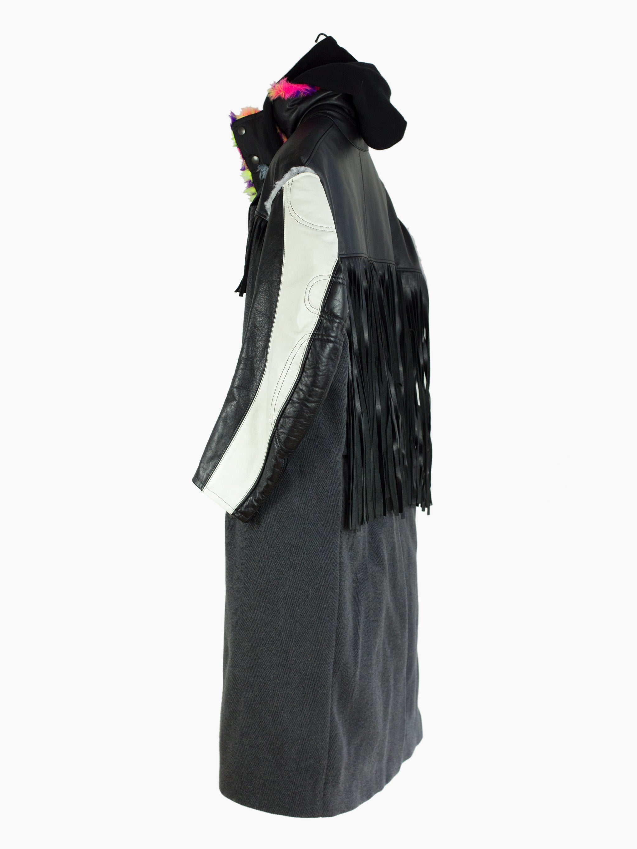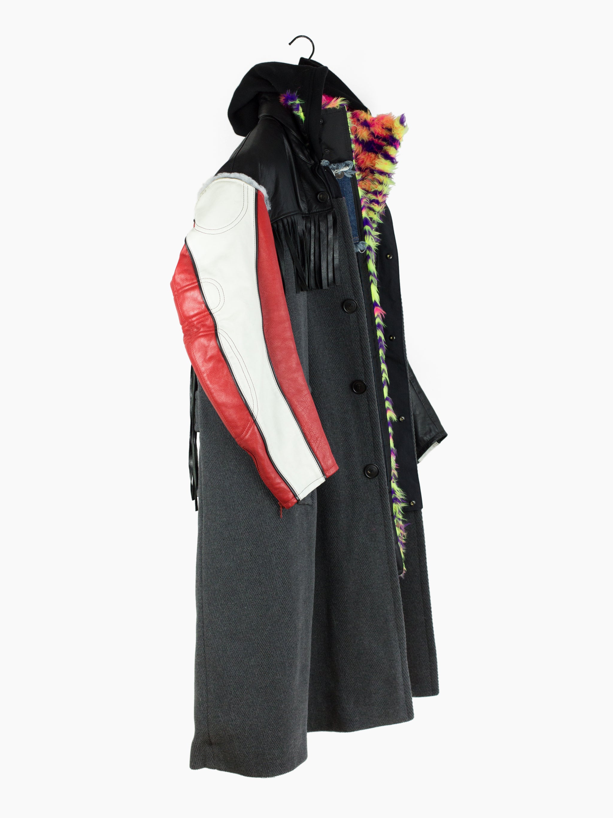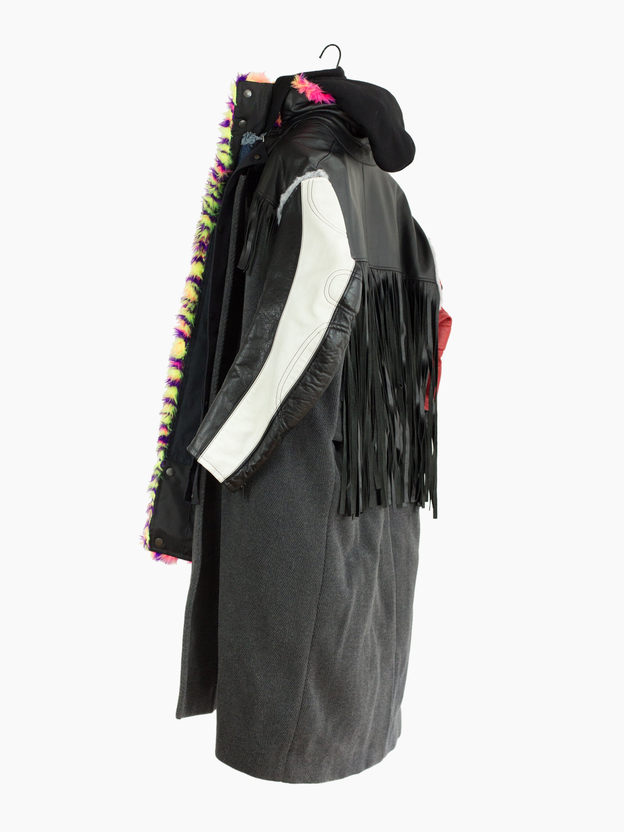 Compared to the 7-layer parkas, these layered long coats feature a more involved reconstructed look. The outer grafts multiple leather jackets onto a long wool overcoat with insulation left showing at the armholes, while on one of the middle layers the front yoke of a denim jacket is spliced onto a nylon parka body. The body is double lined, with both rainbow tiger stripe faux fur and oversized diamond quilted lining. A sweatshirt hood is sewn as if it’s sandwiched between collars, pushing it forward and giving it a funnel-like effect. Each layered jacket front has its own closure, including zippers, snaps, and buttons. The curved leather sleeves feature zippered cuffs.