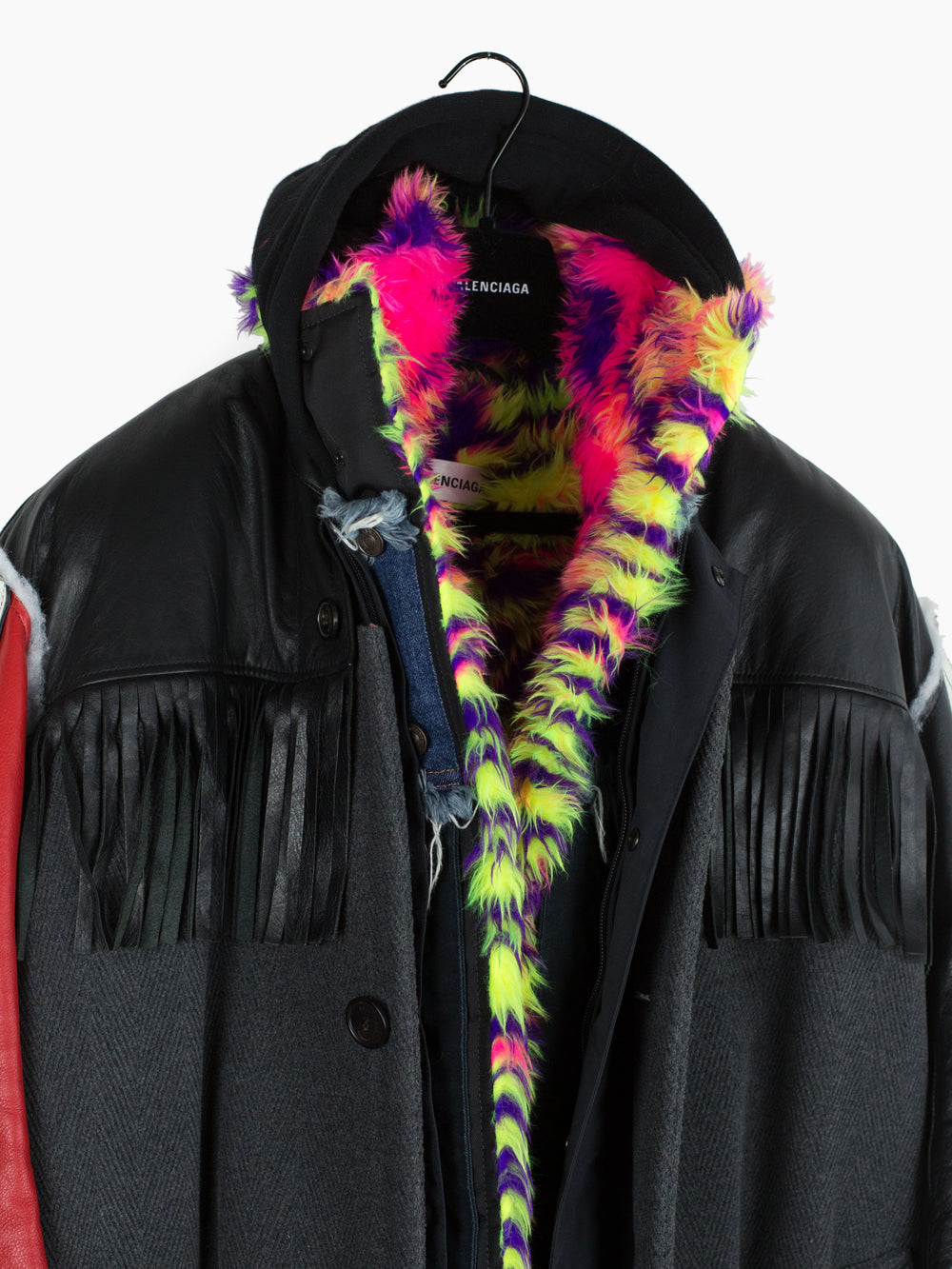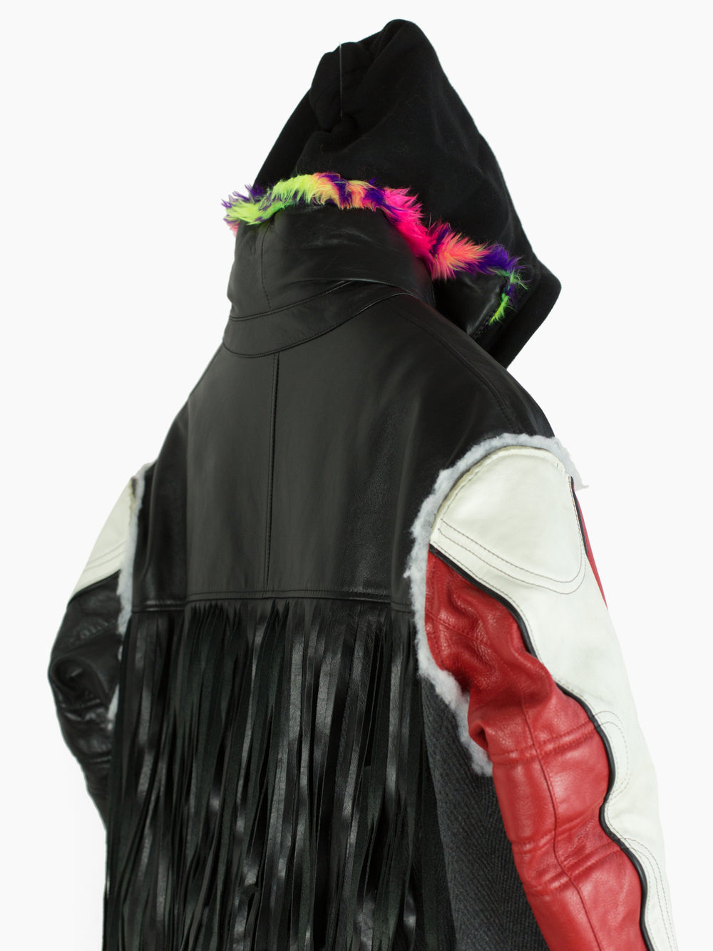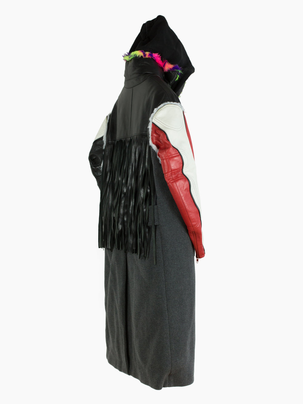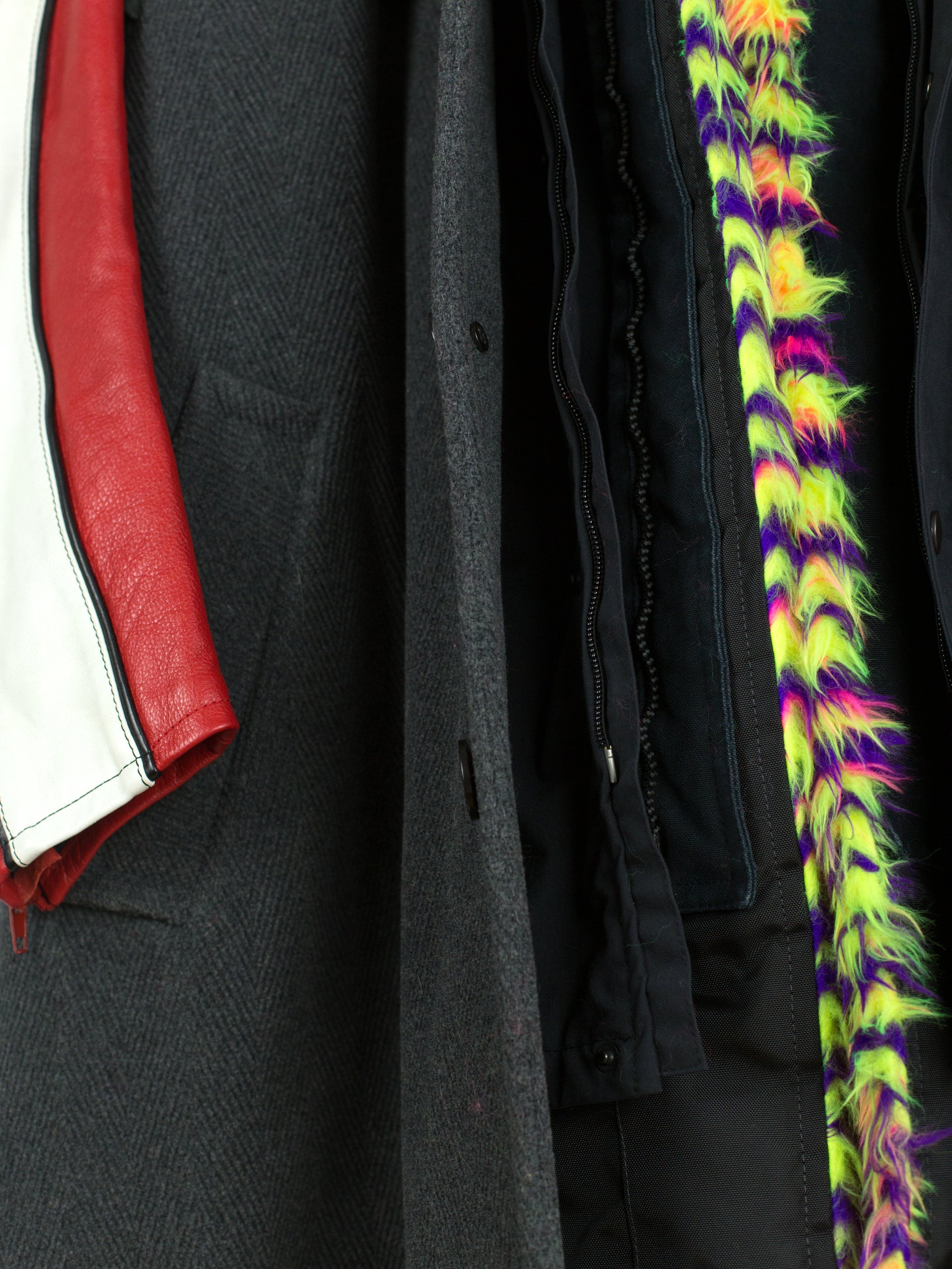 Compared to the 7-layer parkas, these layered long coats feature a more involved reconstructed look. The outer grafts multiple leather jackets onto a long wool overcoat with insulation left showing at the armholes, while on one of the middle layers the front yoke of a denim jacket is spliced onto a nylon parka body. The body is double lined, with both rainbow tiger stripe faux fur and oversized diamond quilted lining. A sweatshirt hood is sewn as if it’s sandwiched between collars, pushing it forward and giving it a funnel-like effect. Each layered jacket front has its own closure, including zippers, snaps, and buttons. The curved leather sleeves feature zippered cuffs.