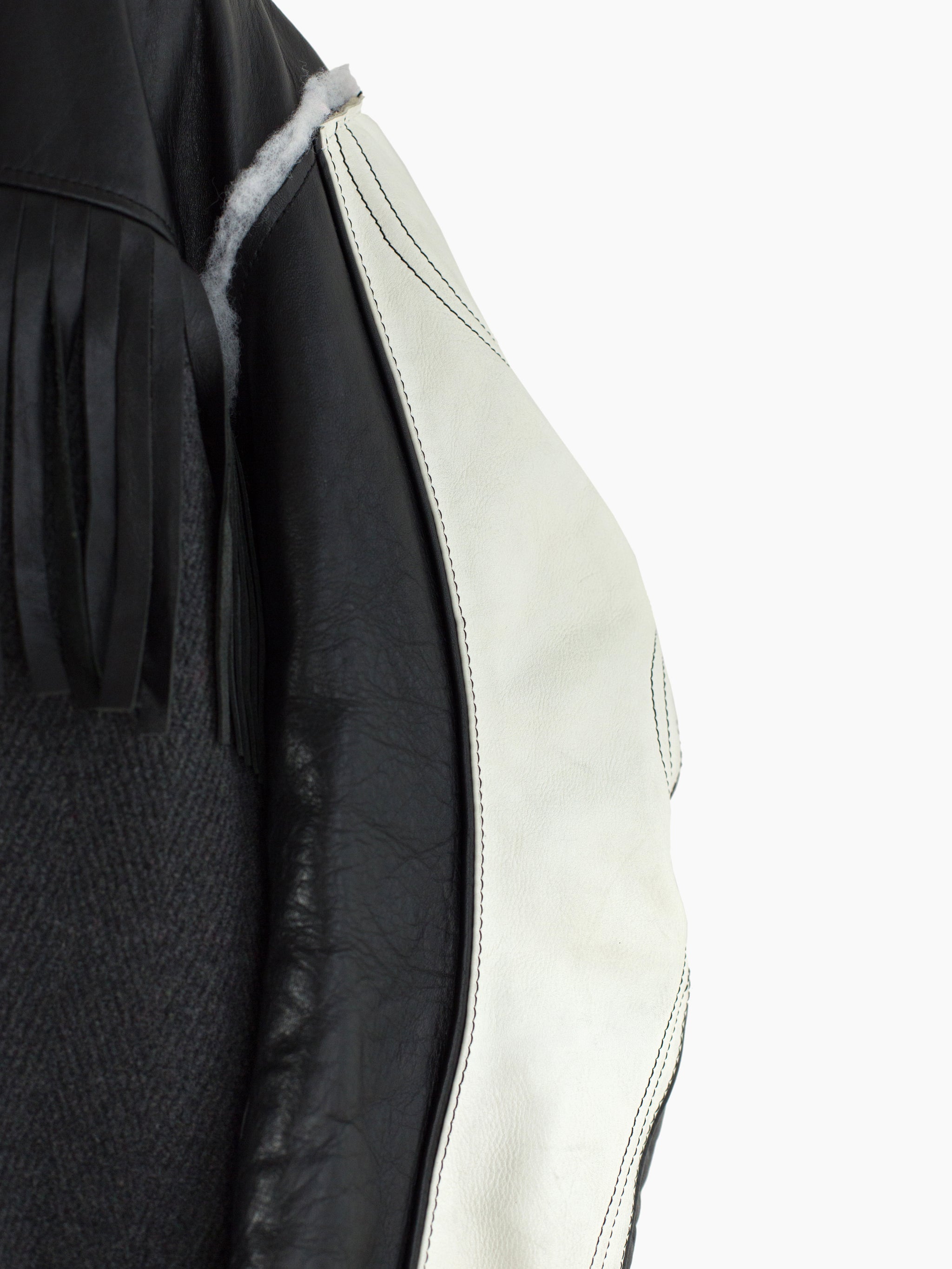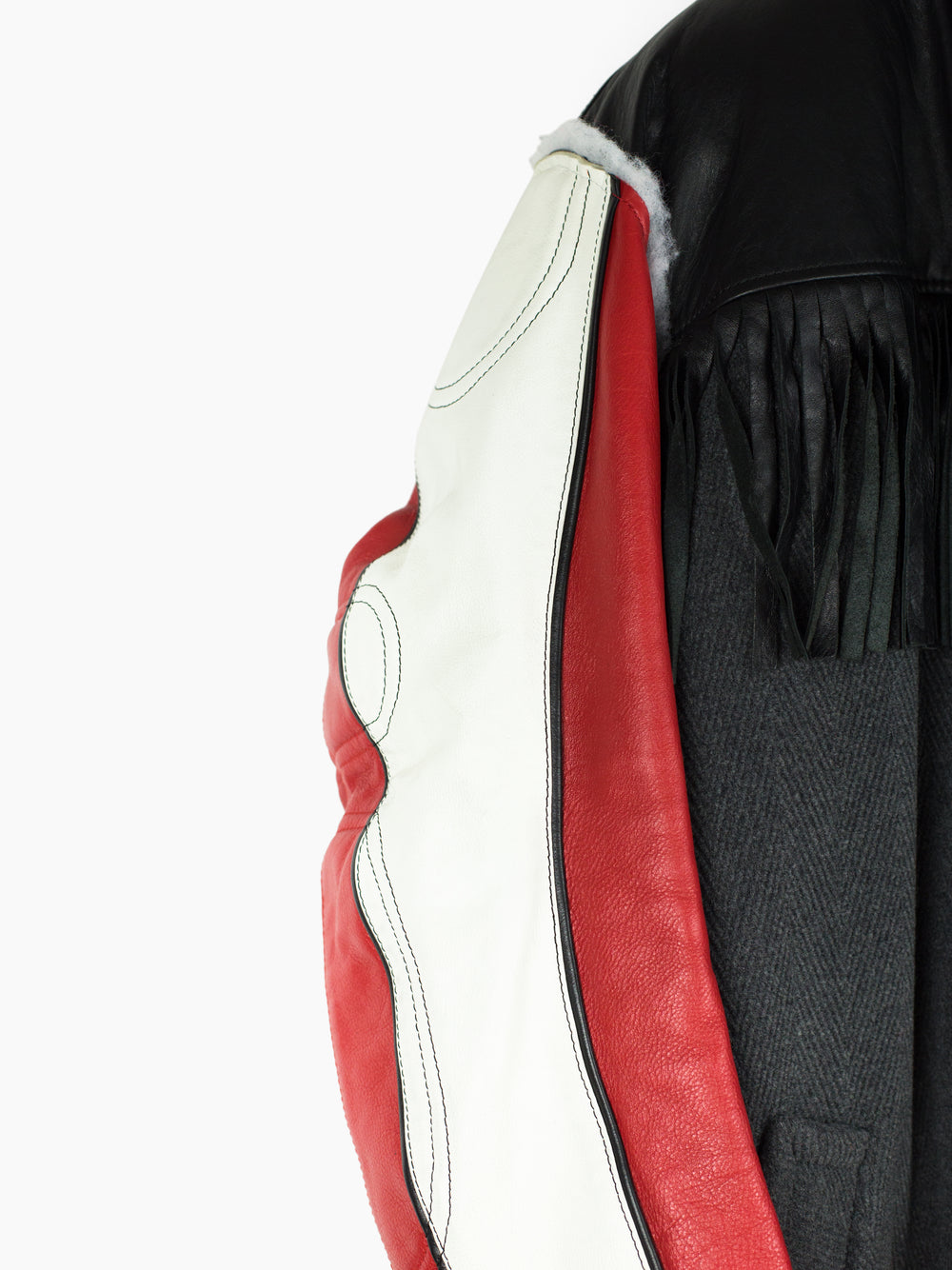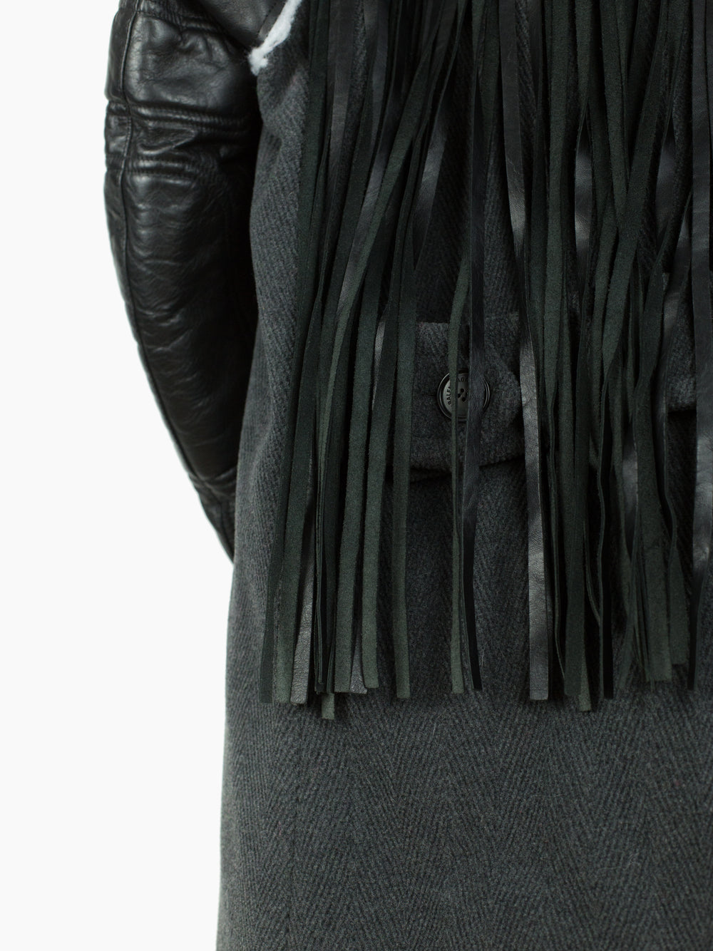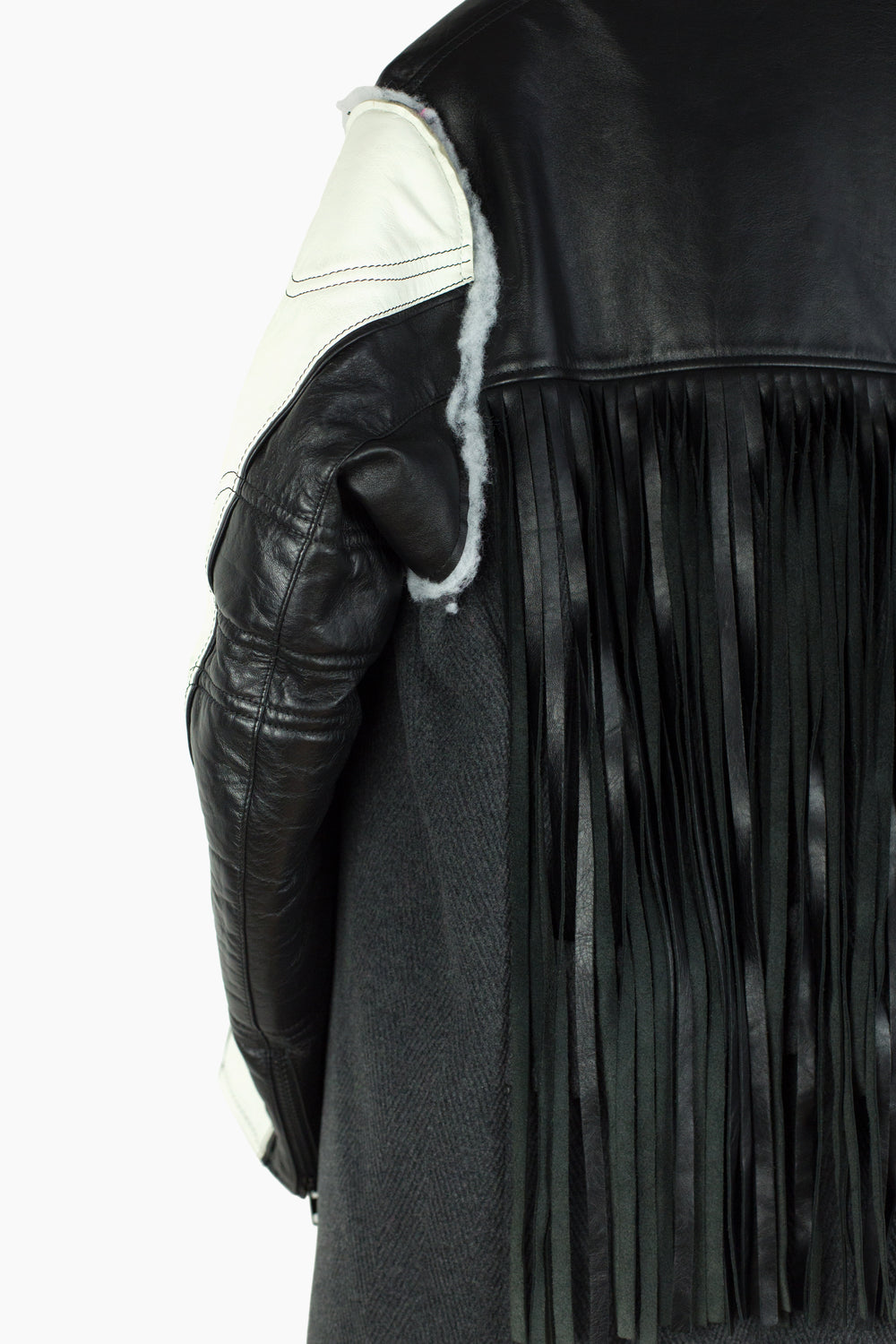 Compared to the 7-layer parkas, these layered long coats feature a more involved reconstructed look. The outer grafts multiple leather jackets onto a long wool overcoat with insulation left showing at the armholes, while on one of the middle layers the front yoke of a denim jacket is spliced onto a nylon parka body. The body is double lined, with both rainbow tiger stripe faux fur and oversized diamond quilted lining. A sweatshirt hood is sewn as if it’s sandwiched between collars, pushing it forward and giving it a funnel-like effect. Each layered jacket front has its own closure, including zippers, snaps, and buttons. The curved leather sleeves feature zippered cuffs.